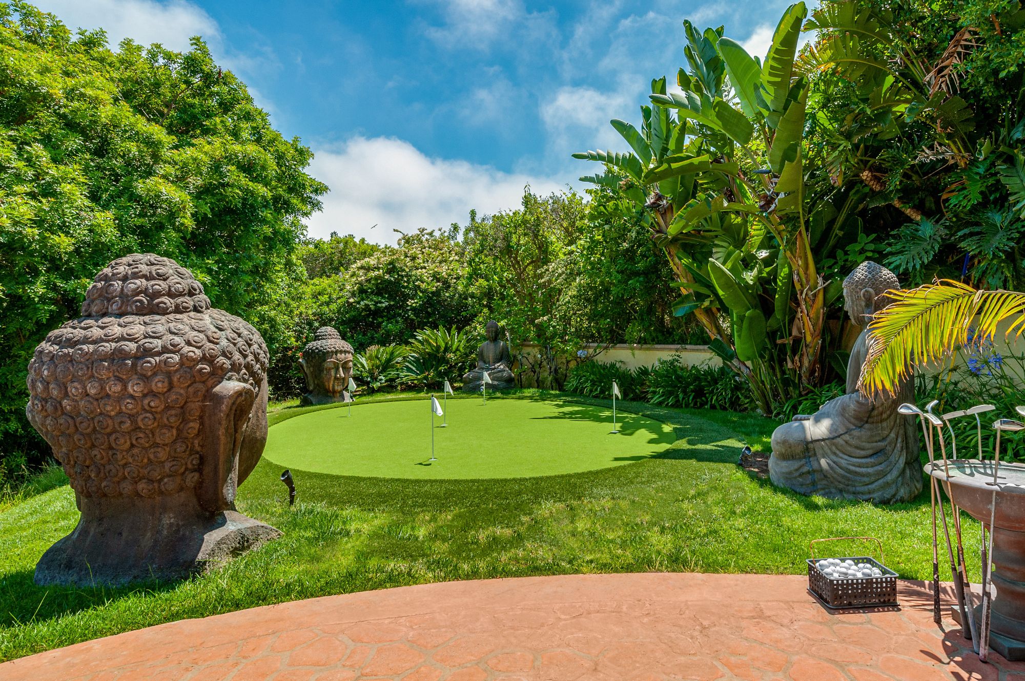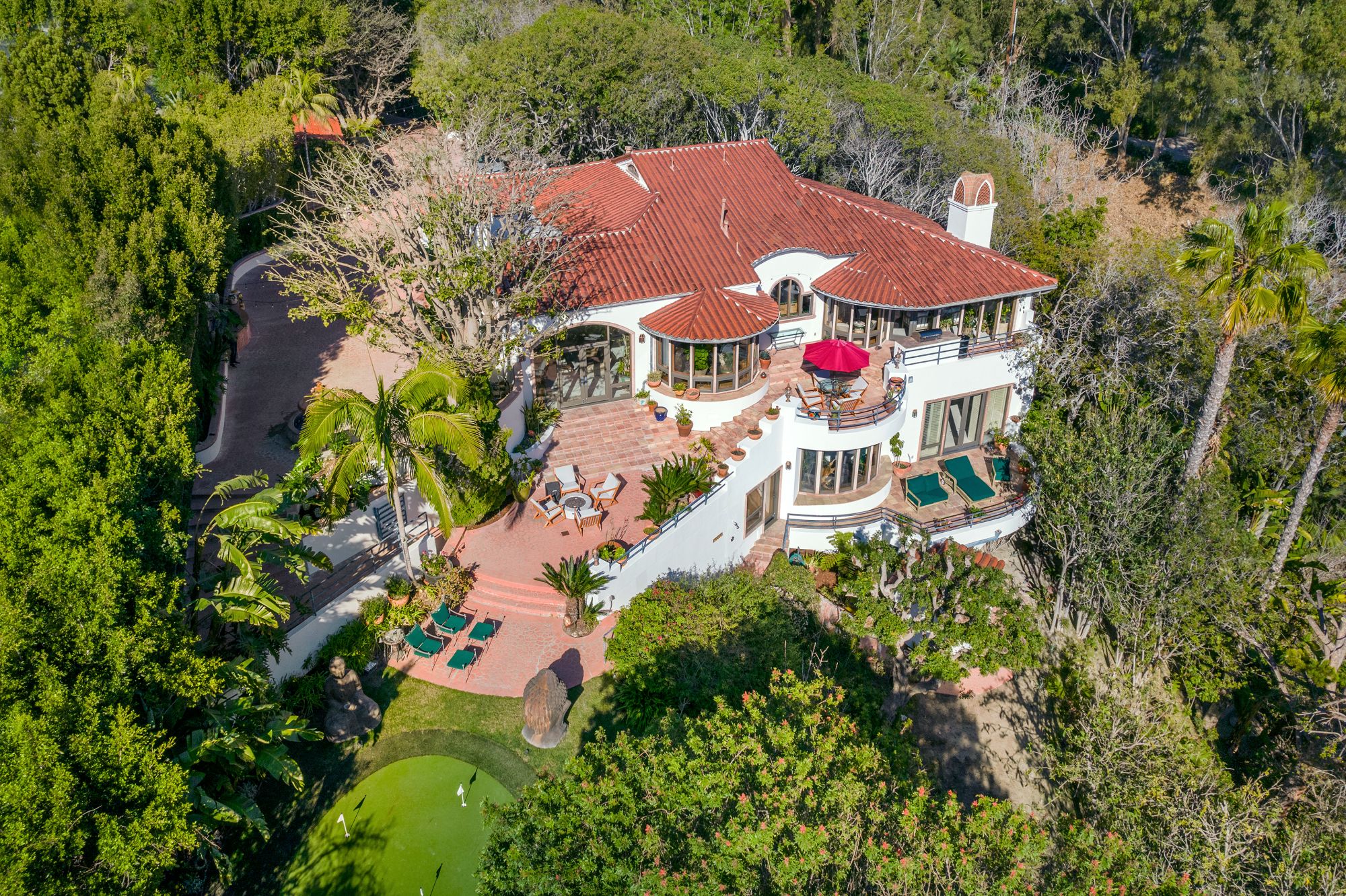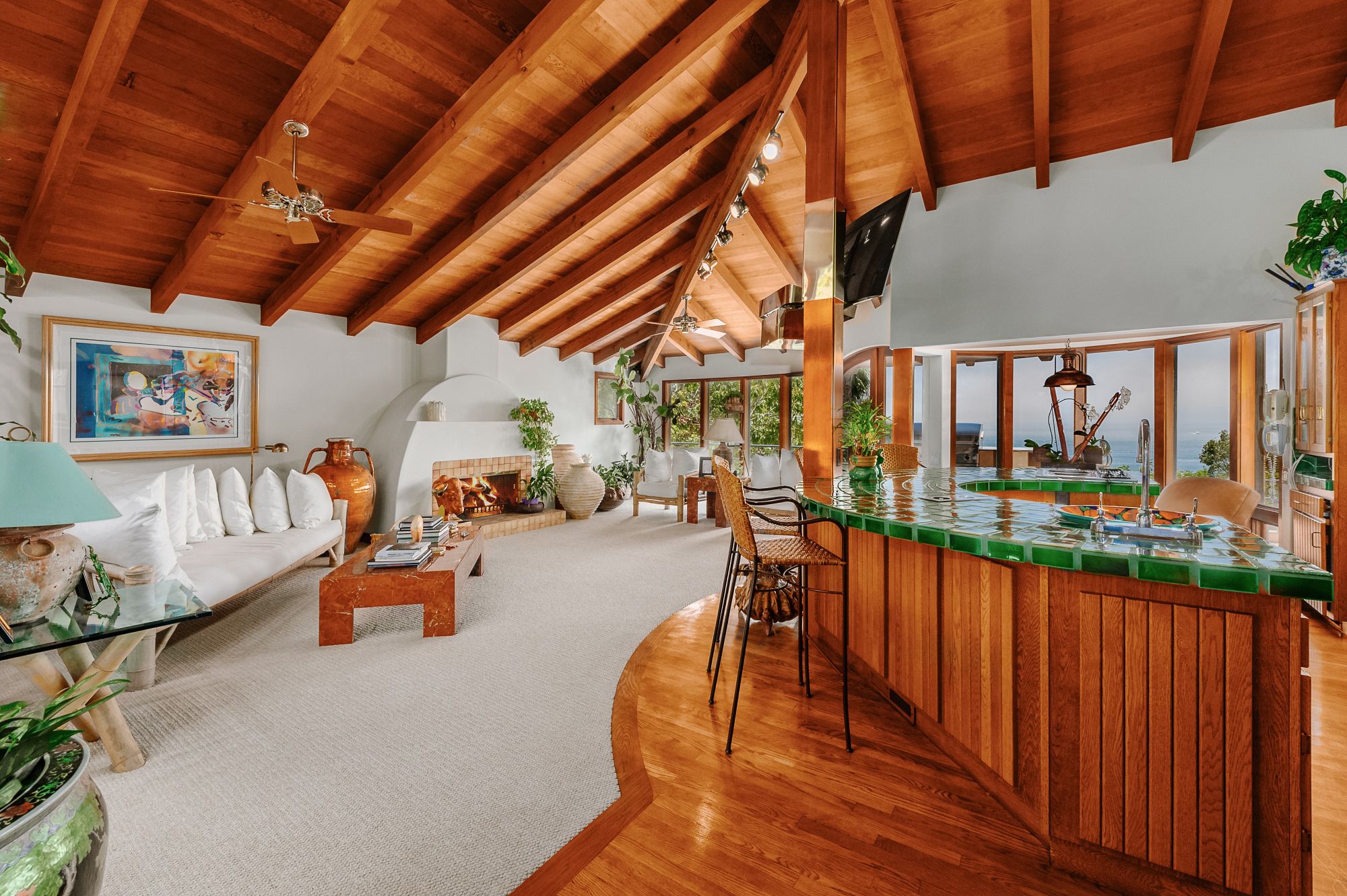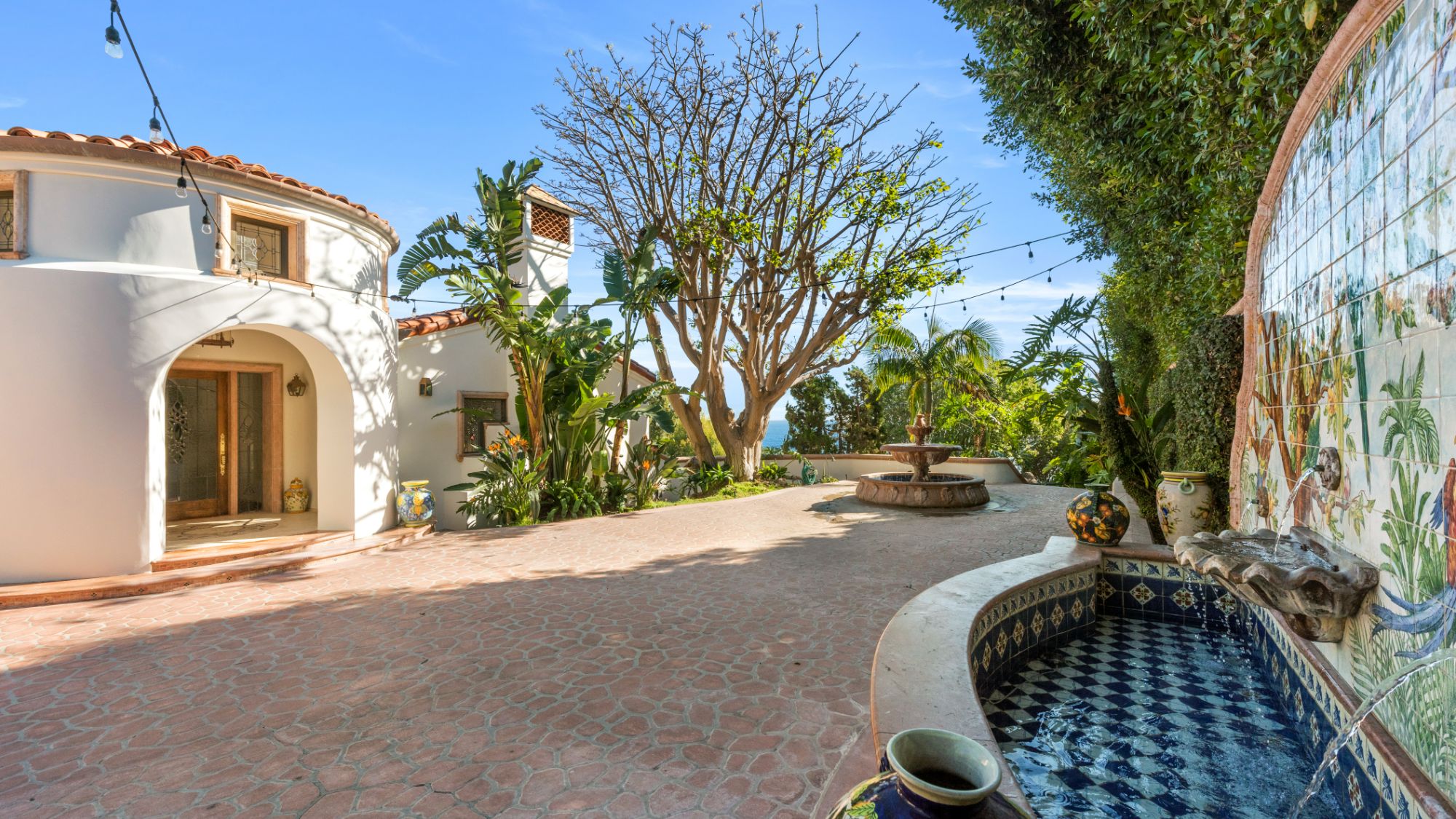Paradise Cove on the beach. Breathtaking gated ocean-view estate with tropical gardens, fountain courtyard, high wood-beamed ceilings, arched doorways and windows, and hardwood floors. Chandelier dining room has bar and bay of windows with ocean views. Formal living room with fireplace and leaded glass doors to patio, which continues to another patio and putting green watched over by four huge Buddha's'. Gourmet island kitchen with tile countertops, high-end appliances, butler's pantry, breakfast bar, and seating area with ocean-view windows. Spacious carpeted family room with fireplace opens to deck with barbecue island and dining patio. Hallway lined with bookshelves leads to library/office and full bath. Downstairs are three bedrooms, laundry room, and generous storage. Owner's retreat has fireplace, desk, large custom closets, and lux bathroom, plus French doors to deck, mirrored and carpeted gym, sauna, and cold-soak tub. Large motor court and garage parking for two cars. Live and entertain in true Malibu style. This sale includes 2 APN's 27910 PCH (4460-032-018) and 27856 PCH (4460-032-008).