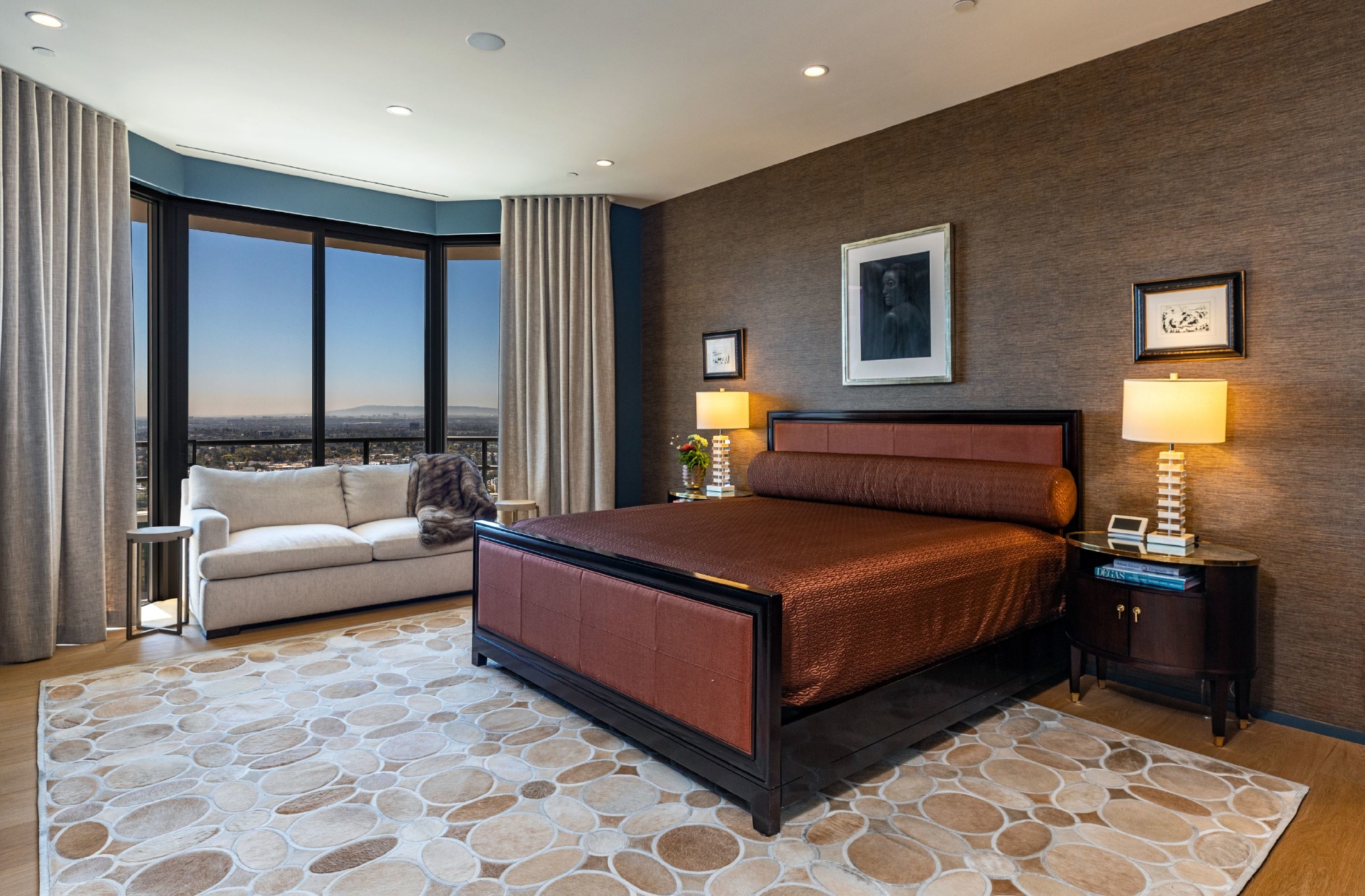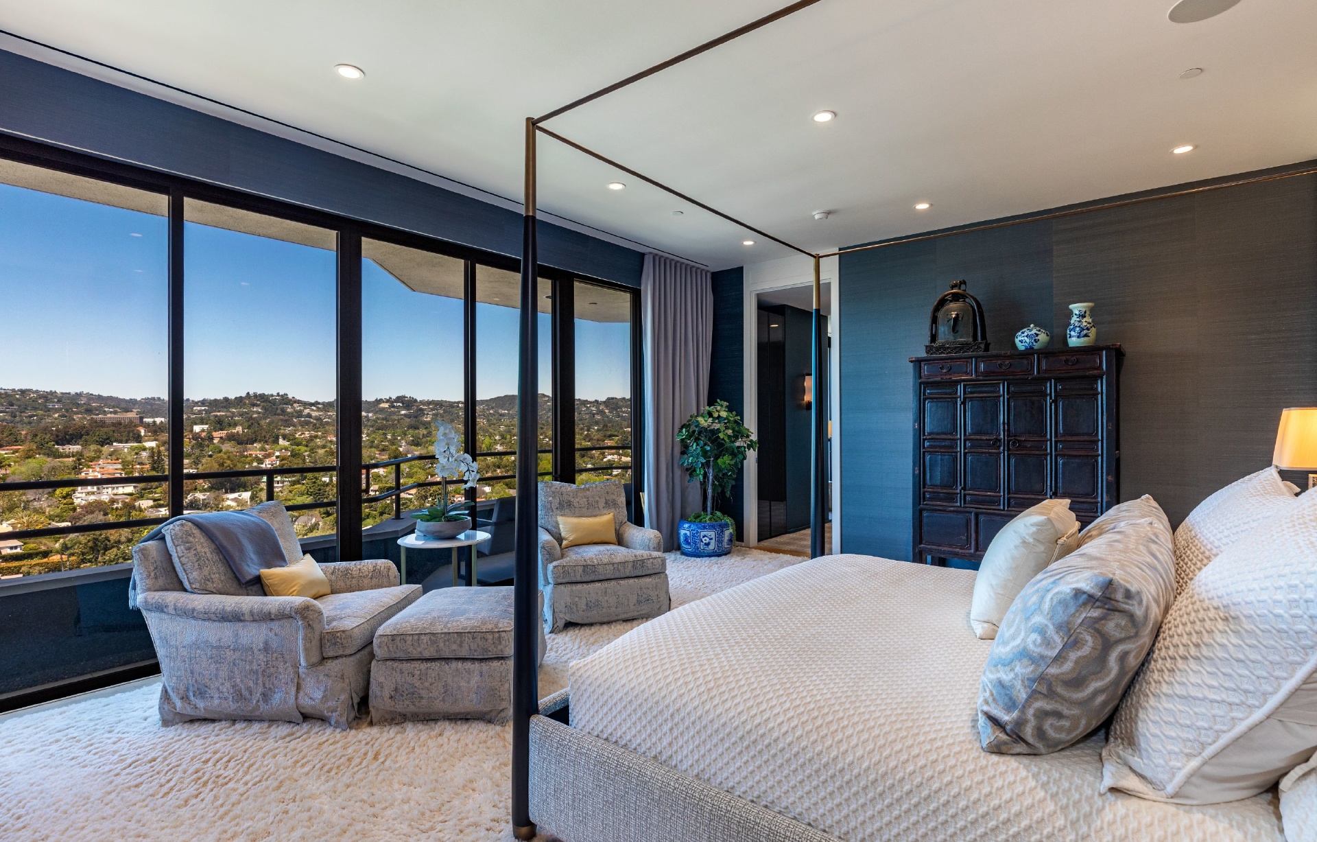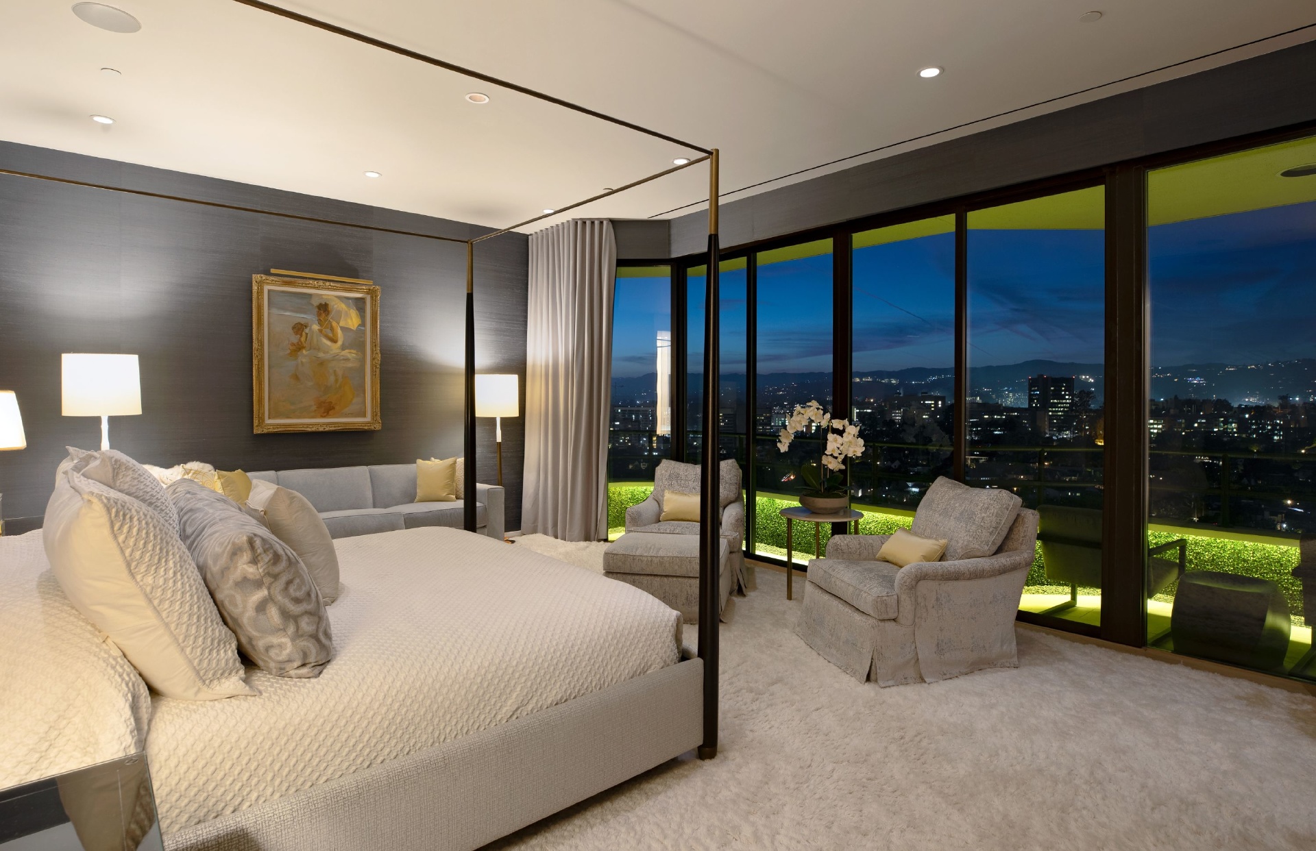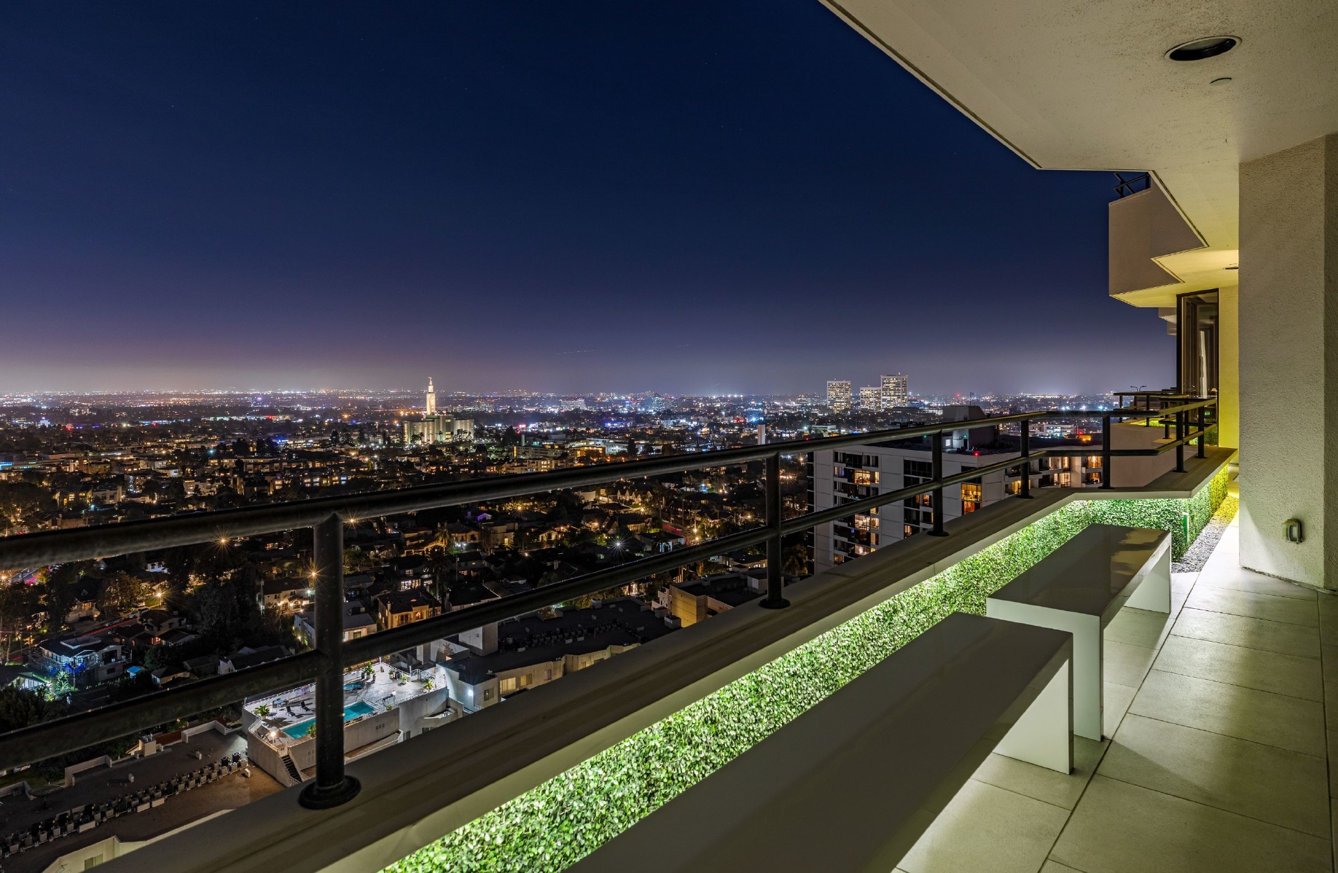 This gracious 5-bed, 7-bath sanctuary offers breathtaking views of the city from the snow-capped mountains in the east to regattas on the ocean and Catalina Island. PH 19 has been constructed as a "safe house' for utmost privacy and security. World class finishes were utilized throughout including custom Italian closets, Stark Carpets, old growth Bavarian wood floors and Lalique faucets. An entertainer's dream with a private elevator, 3,000 bottle wine cellar, oversized living room and formal dining room, both with fireplaces providing a sophisticated and inviting atmosphere. Balconies and terraces surround the entire penthouse offering perfect indoor/outdoor living. This modern architectural building is further enhanced by a north/south tennis court, swimming pool, fitness center overlooking the pool terrace, private trainer facility, his and hers spas, airy spacious banquet room with catering kitchen, an intimate library/card room, valet parking and many additional amenities and assets.