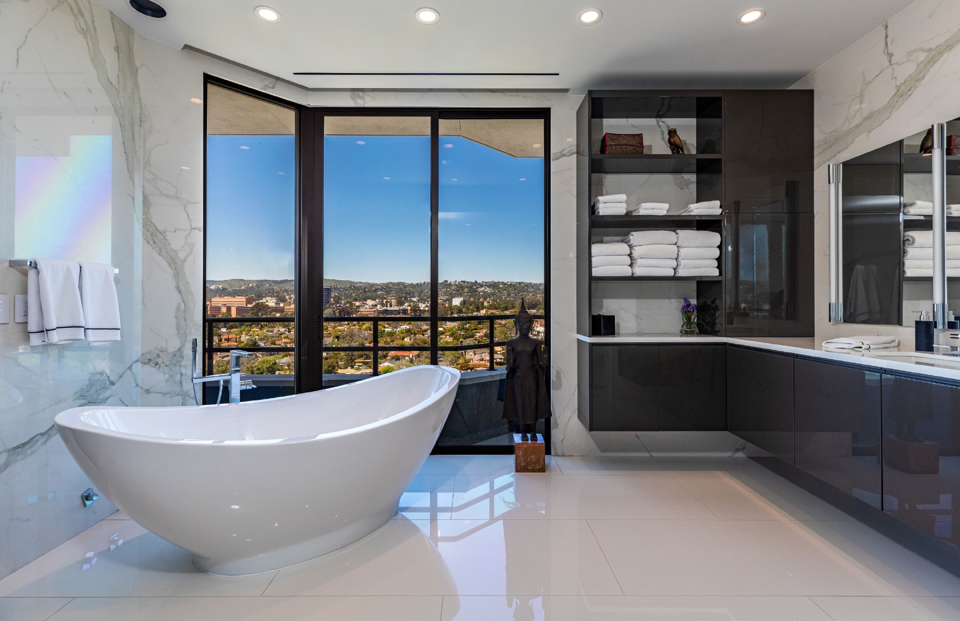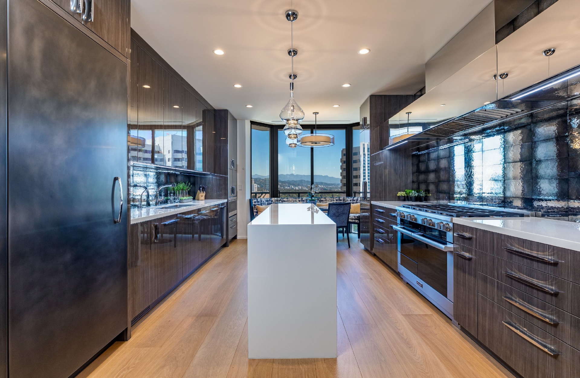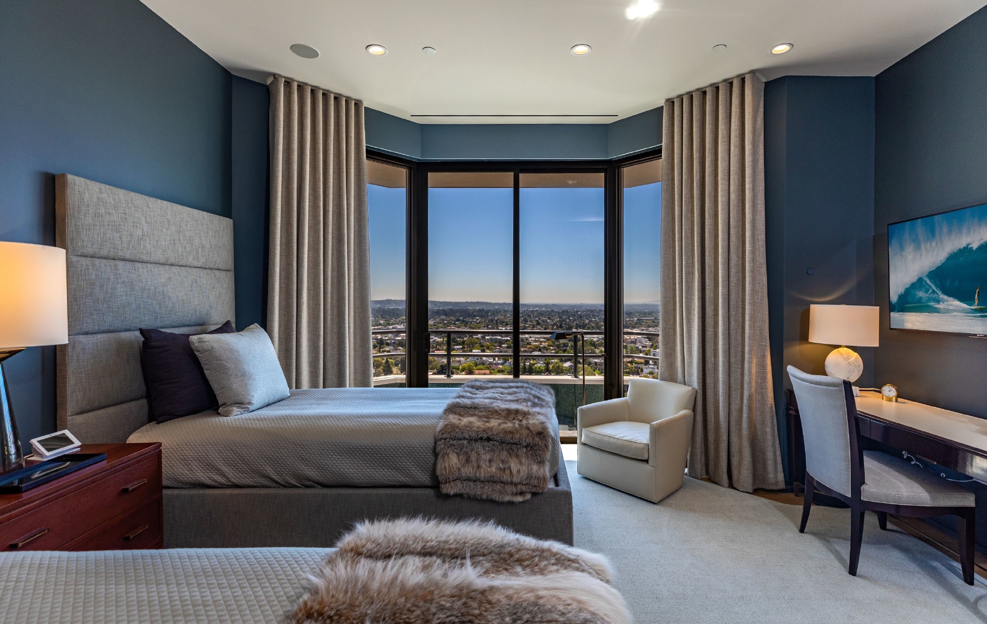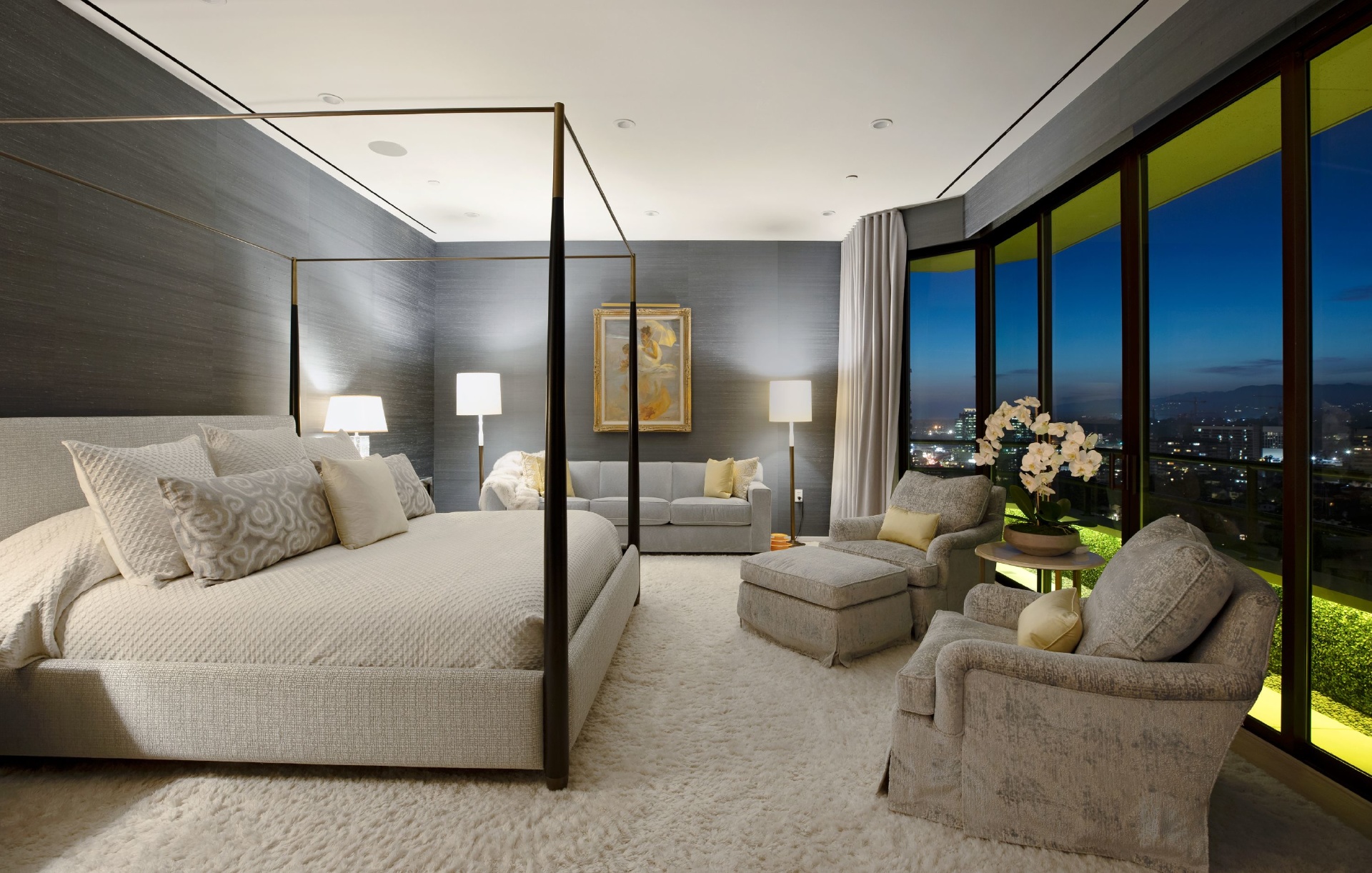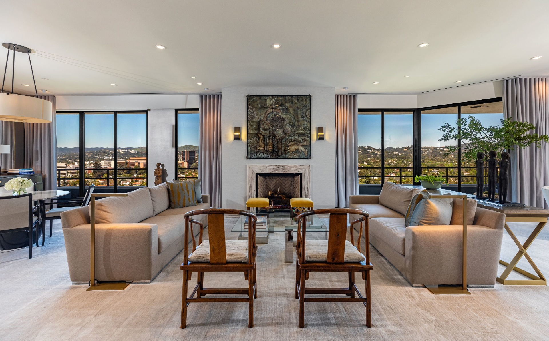 This gracious 5-bed, 7-bath sanctuary offers breathtaking views of the city from the snow-capped mountains in the east to regattas on the ocean and Catalina Island. PH 19 has been constructed as a "safe house' for utmost privacy and security. World class finishes were utilized throughout including custom Italian closets, Stark Carpets, old growth Bavarian wood floors and Lalique faucets. An entertainer's dream with a private elevator, 3,000 bottle wine cellar, oversized living room and formal dining room, both with fireplaces providing a sophisticated and inviting atmosphere. Balconies and terraces surround the entire penthouse offering perfect indoor/outdoor living. This modern architectural building is further enhanced by a north/south tennis court, swimming pool, fitness center overlooking the pool terrace, private trainer facility, his and hers spas, airy spacious banquet room with catering kitchen, an intimate library/card room, valet parking and many additional amenities and assets.