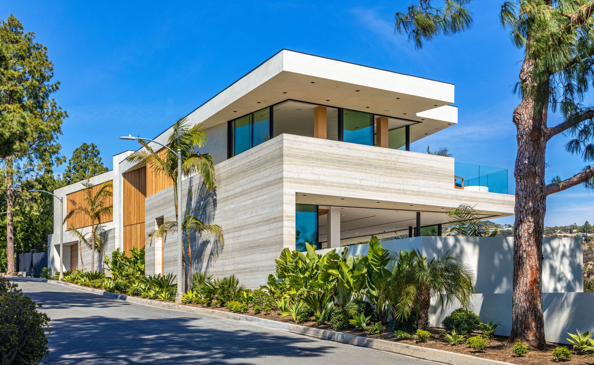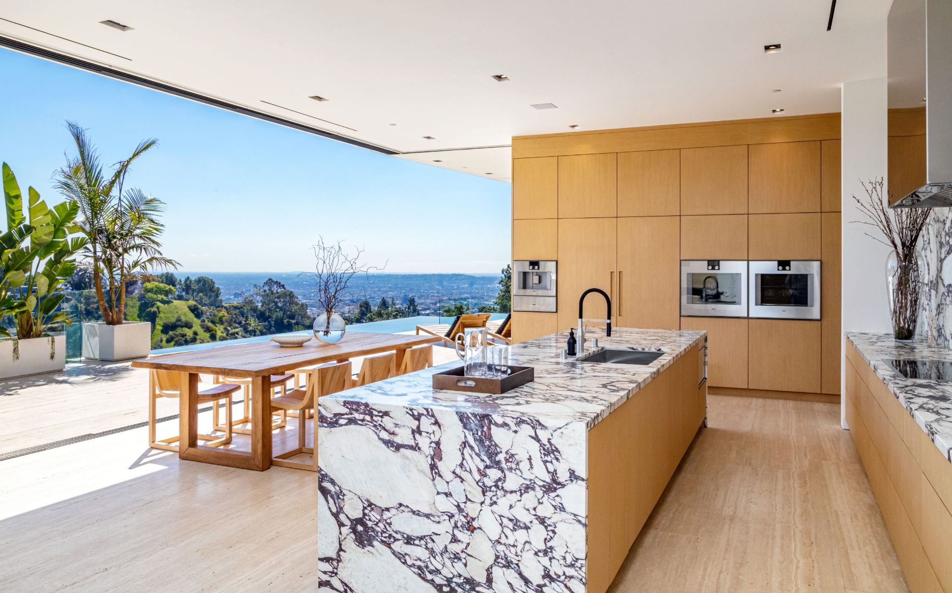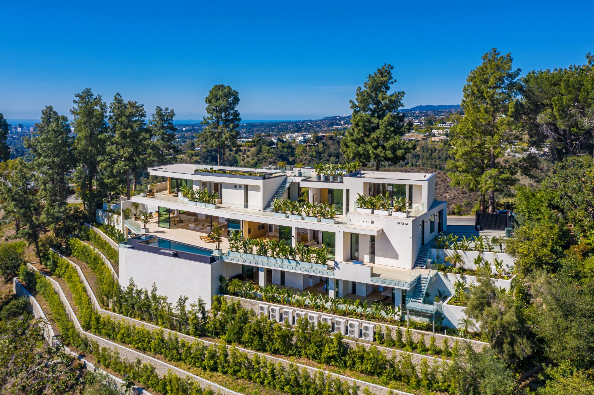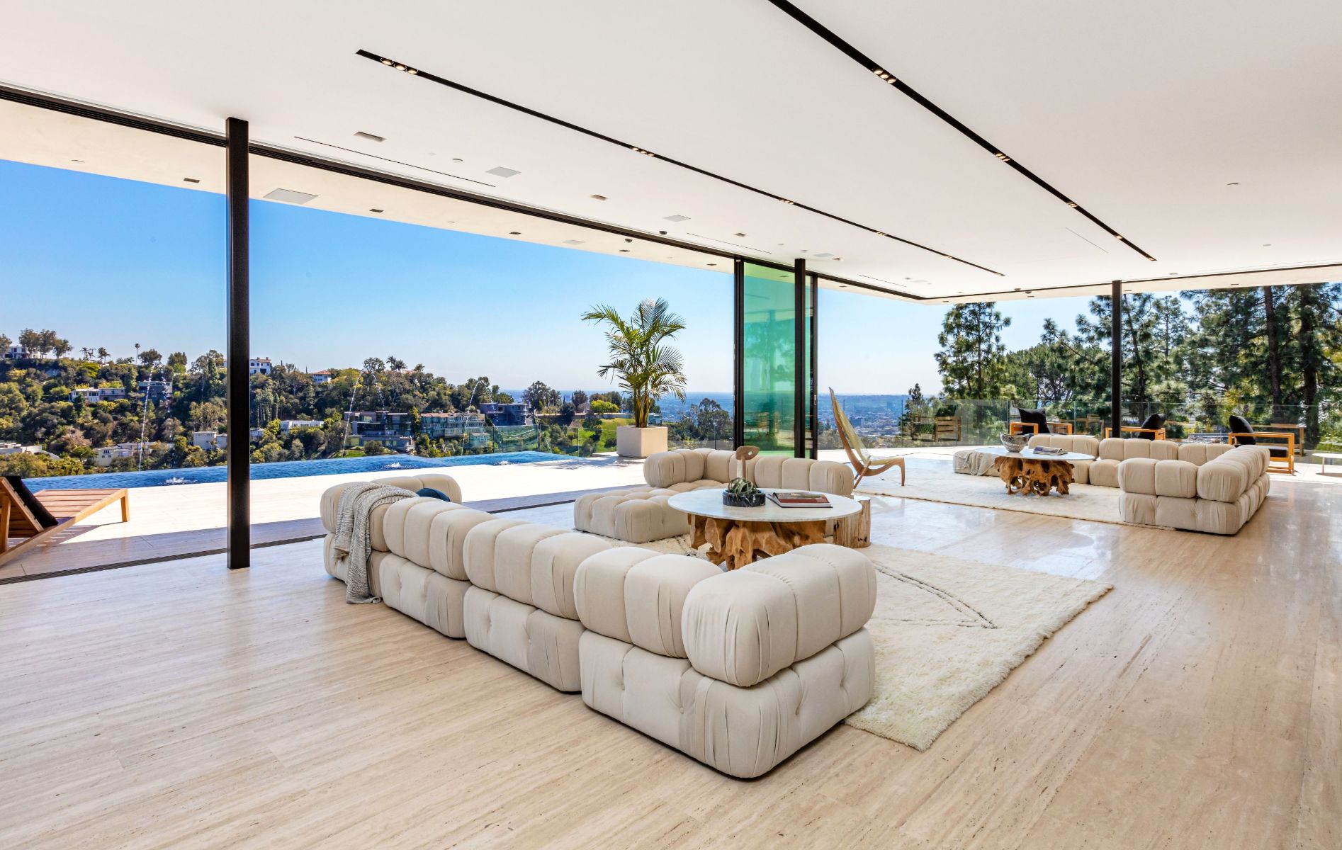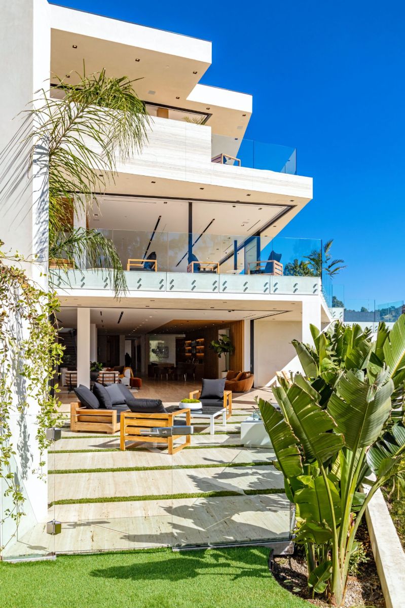 Design icon Richard Landry & Merkoh Development joined forces to create this organic modern masterpiece. Located on a picturesque acre, this showpiece is immersed with spectacular 360° city, ocean & canyon views within the heart of Beverly Hills. Its stunning matchbook travertine exterior and Italian teakwood smart door sets the tone for an elegant mix of serenity-evoking aesthetics and cutting-edge automated lifestyle. Interiors feature world-class Italian Classico unfilled travertine, teakwood, white oak louvers & floorings throughout. Beautiful open floor plan with soaring motorized sliding doors soaks up the sunlight and the explosive views. Tri-level entertainment oasis with 2 exquisite bars & kitchens, formal & alfresco dining options, a movie theater, sauna/steam, gym & wine rooms. Gourmet Kitchen features servo cabinetry & calacatta viola countertop bar. Multiple decks, perfect for entertaining on any scale boast BBQ kitchen, rooftop jacuzzi, rooftop yoga space, infinity pool/spa that overlooks LA skyline along with a poolside TV that emerges at the touch of a button. Primary suite features a private deck and partners’ bathroom with a calacatta viola shower and hand-crafted solid marble tub. Experience this trophy estate that leaves no desires unsatisfied and spares no expense.