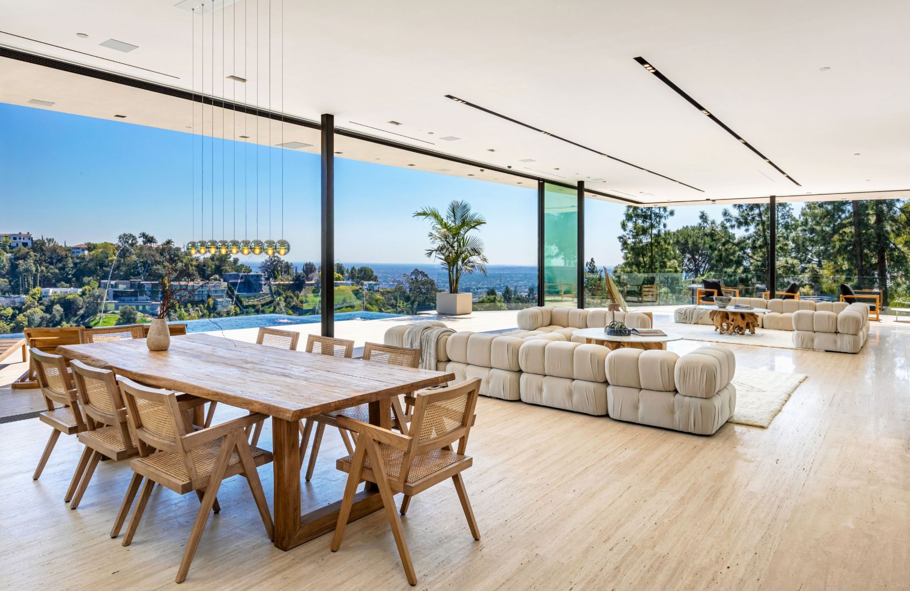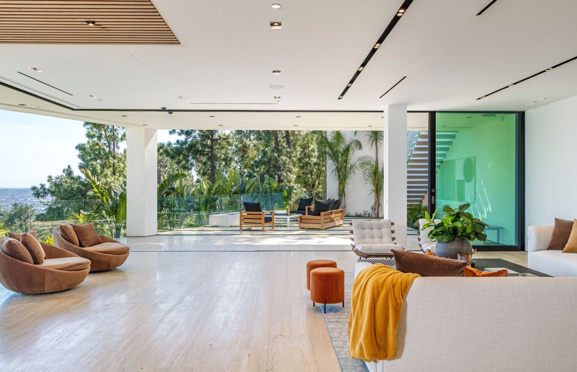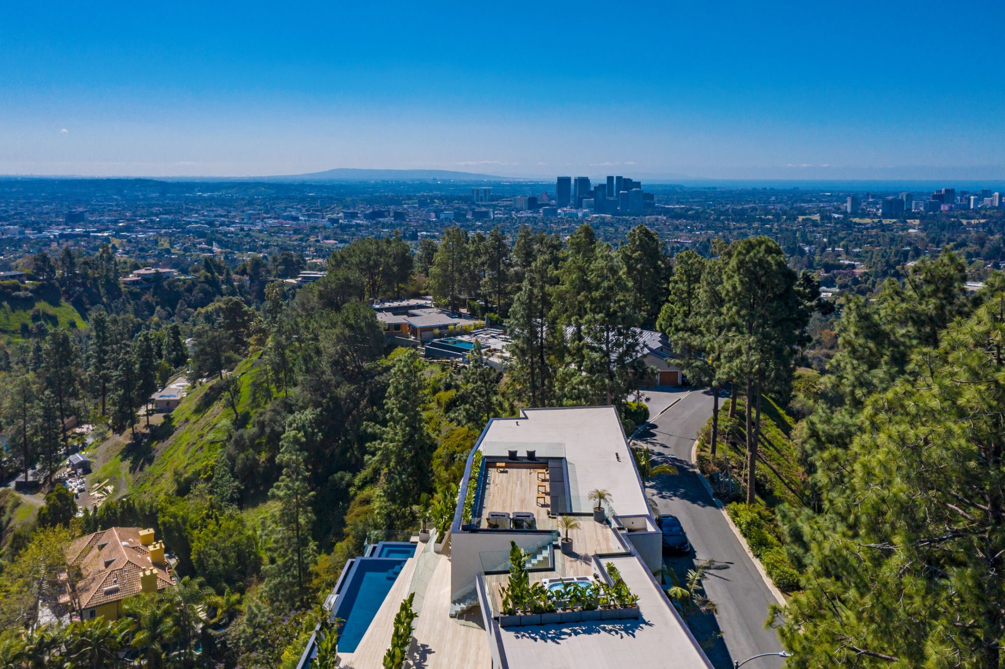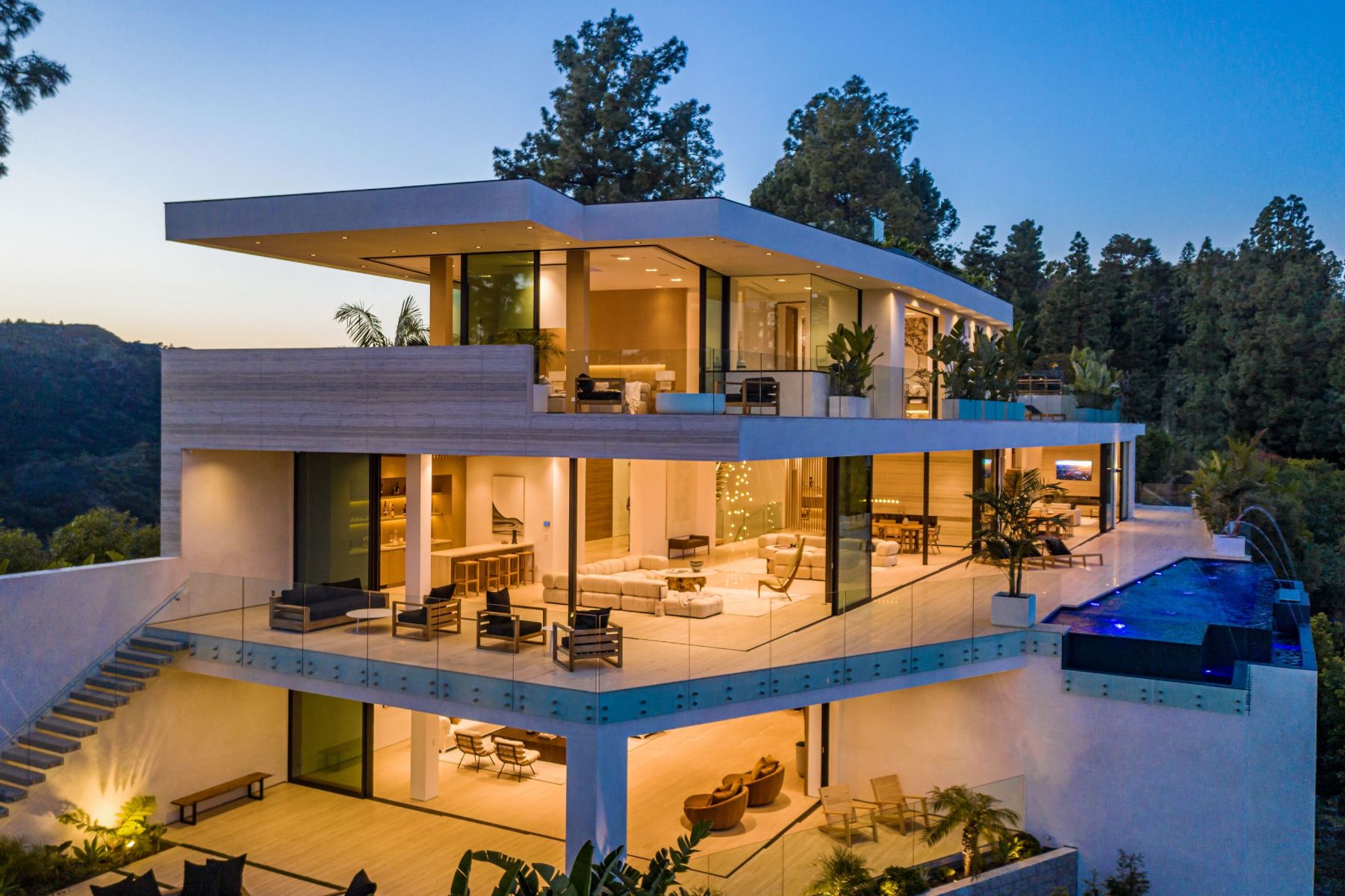 Design icon Richard Landry & Merkoh Development joined forces to create this organic modern masterpiece. Located on a picturesque acre, this showpiece is immersed with spectacular 360° city, ocean & canyon views within the heart of Beverly Hills. Its stunning matchbook travertine exterior and Italian teakwood smart door sets the tone for an elegant mix of serenity-evoking aesthetics and cutting-edge automated lifestyle. Interiors feature world-class Italian Classico unfilled travertine, teakwood, white oak louvers & floorings throughout. Beautiful open floor plan with soaring motorized sliding doors soaks up the sunlight and the explosive views. Tri-level entertainment oasis with 2 exquisite bars & kitchens, formal & alfresco dining options, a movie theater, sauna/steam, gym & wine rooms. Gourmet Kitchen features servo cabinetry & calacatta viola countertop bar. Multiple decks, perfect for entertaining on any scale boast BBQ kitchen, rooftop jacuzzi, rooftop yoga space, infinity pool/spa that overlooks LA skyline along with a poolside TV that emerges at the touch of a button. Primary suite features a private deck and partners’ bathroom with a calacatta viola shower and hand-crafted solid marble tub. Experience this trophy estate that leaves no desires unsatisfied and spares no expense.