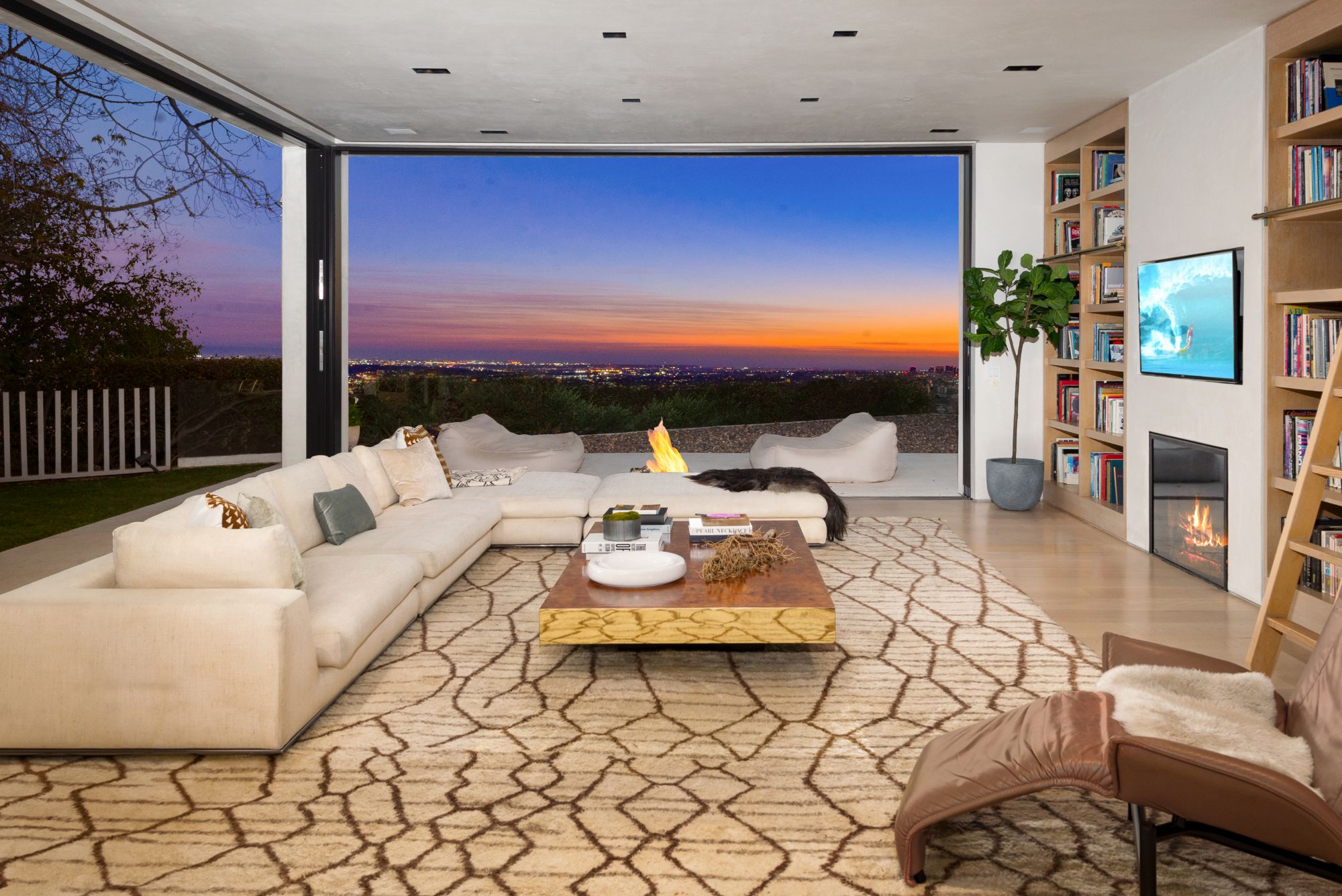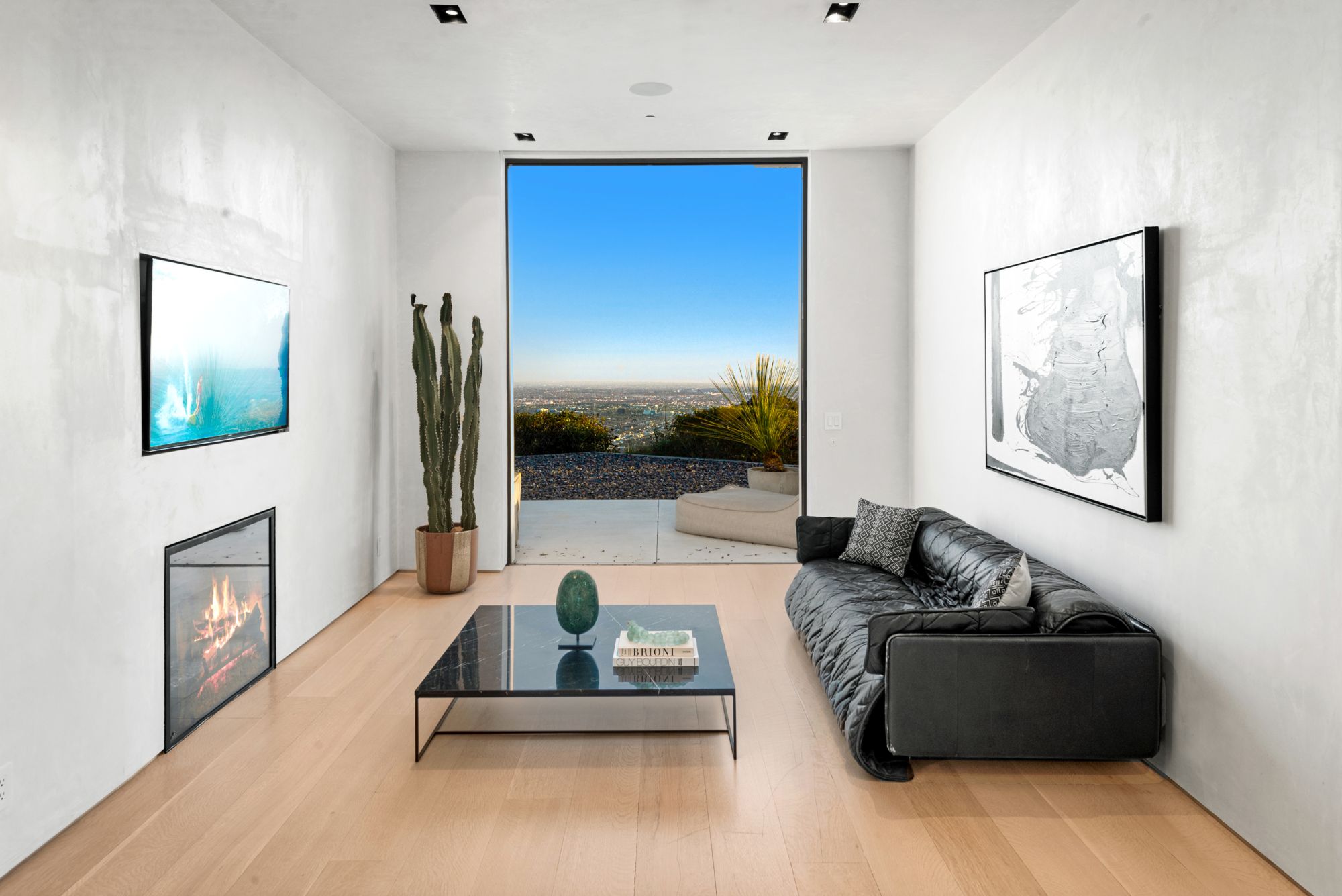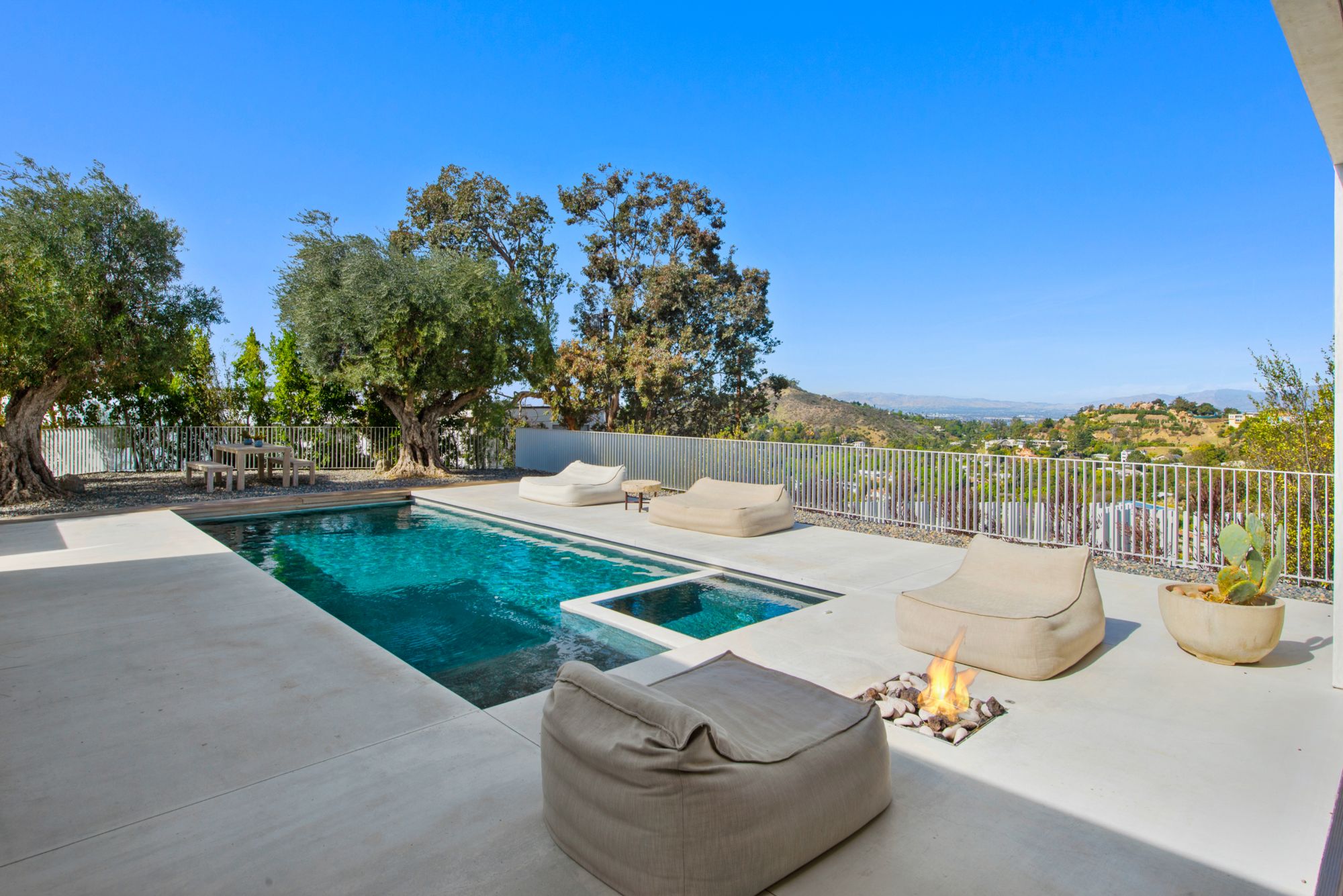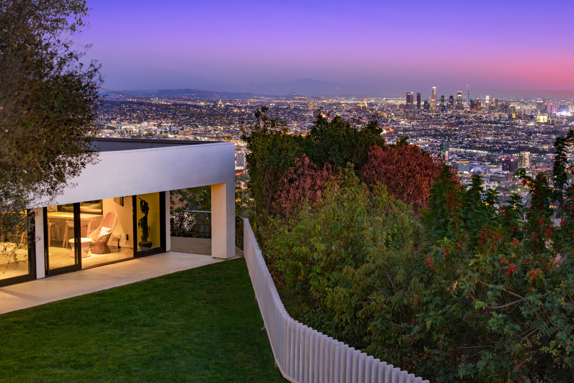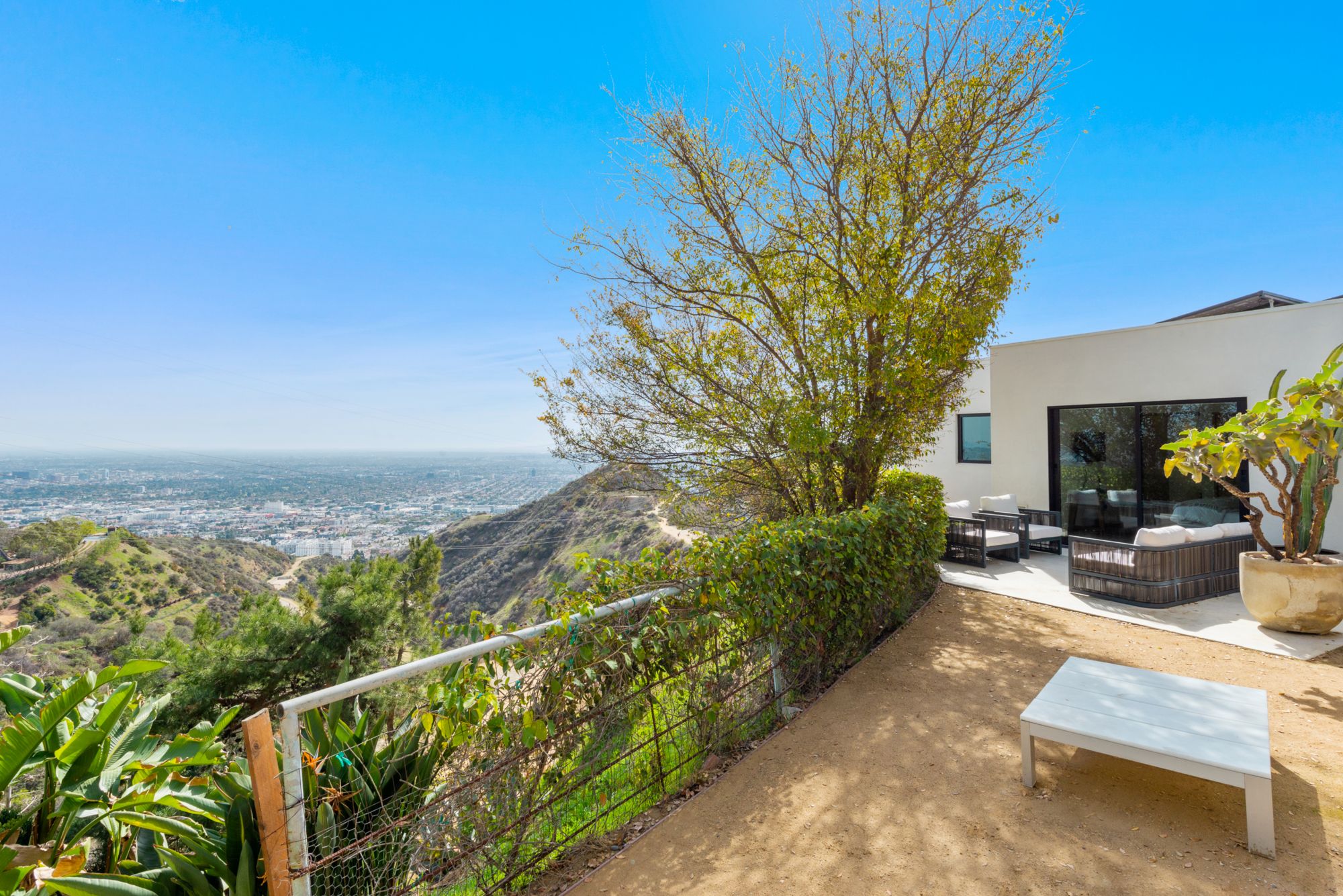 Incredible gated compound set on a rare and extraordinary flat ridge top overlooking the entire LA Basin from East of Downtown to the Ocean. 3 years to create this unique and uncommon environment with spectacular scale, design, high-quality finishes and attention to detail. Large open spaces flooded with natural light and entire walls of pocket doors. High ceilings throughout with expansive gallery. Formal living room with bookcases, fireplace, and incredible views. Gourmet kitchen/family room opens to pool and outdoor kitchen. Separate Media room, Master suite with sitting room, double closets/dressing room and gorgeous marble bath. 5 additional bedrooms ensuite all open to wraparound view terraces. Across the expansive lawn is a 4 room guest house/studio with 2 baths and desert garden along with private and direct access to miles of hiking trails. A rare opportunity to acquire this one of a kind property.