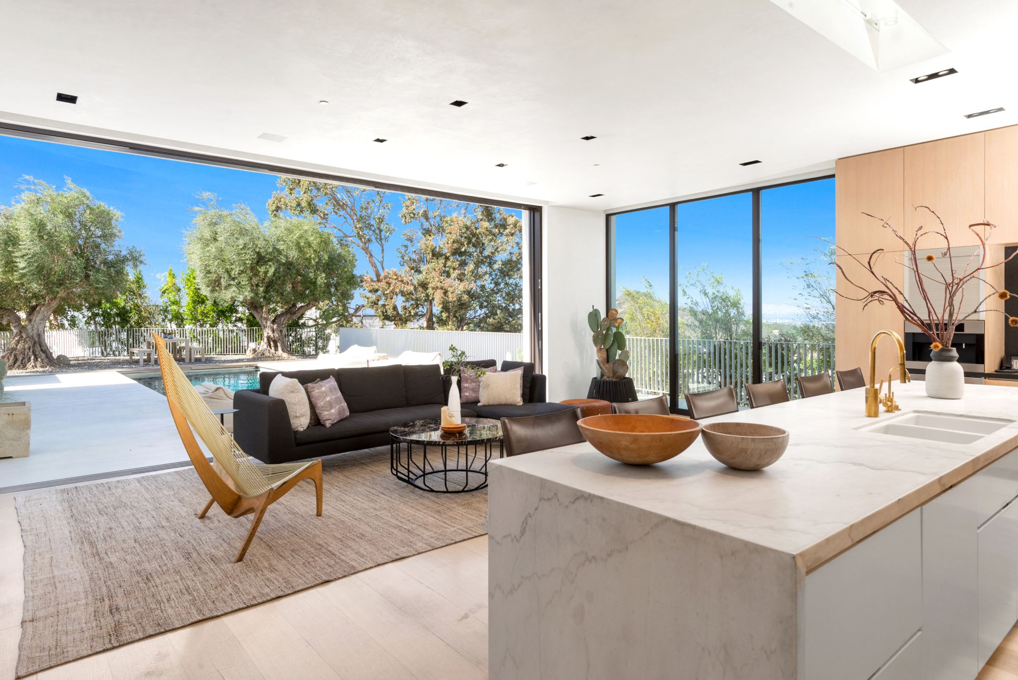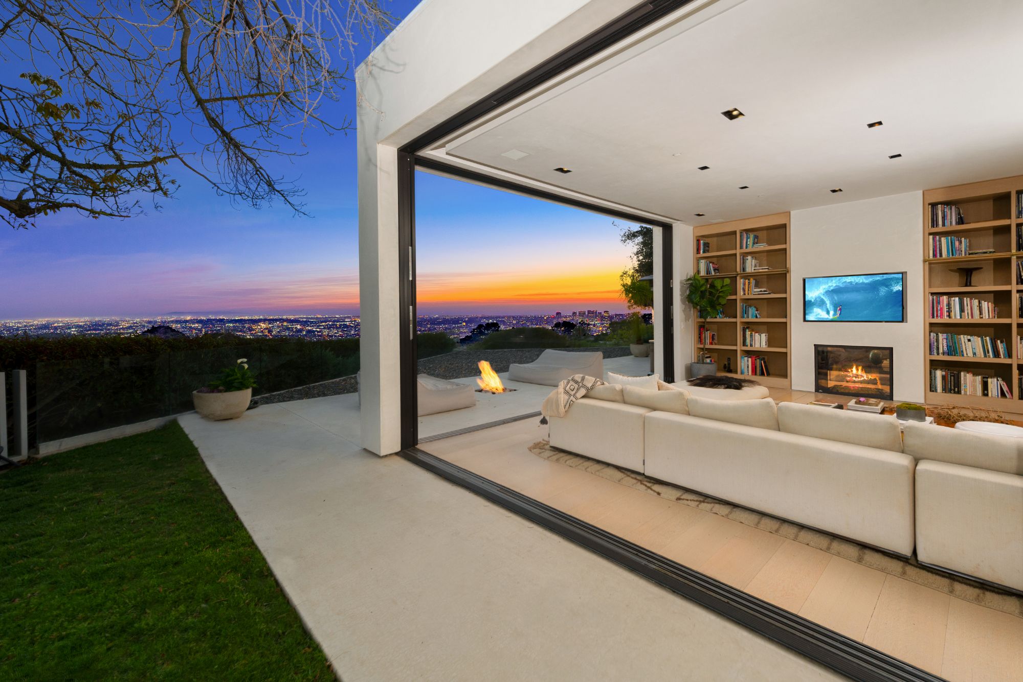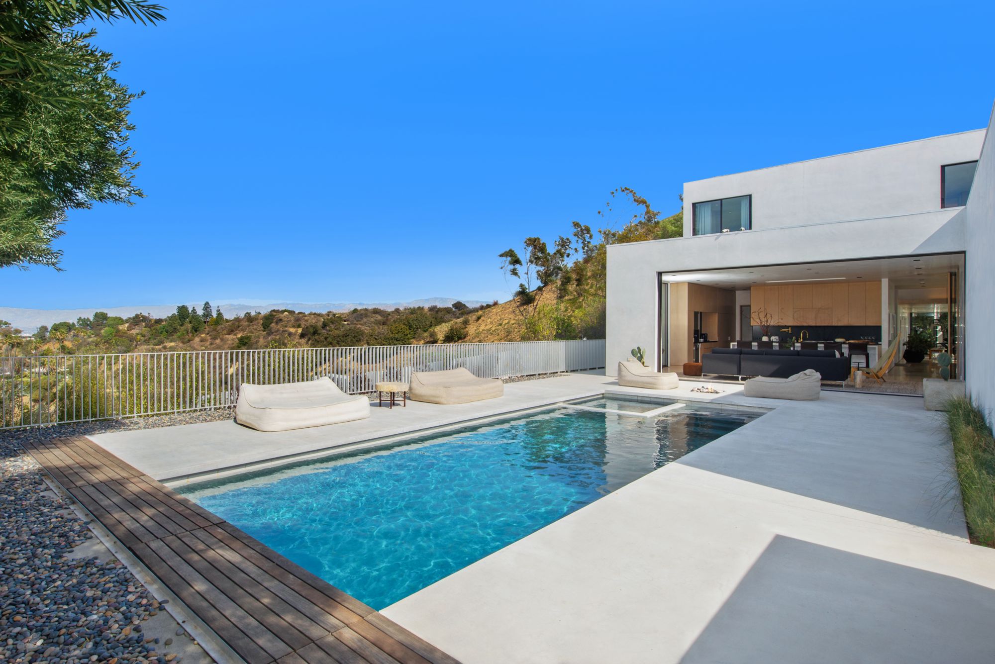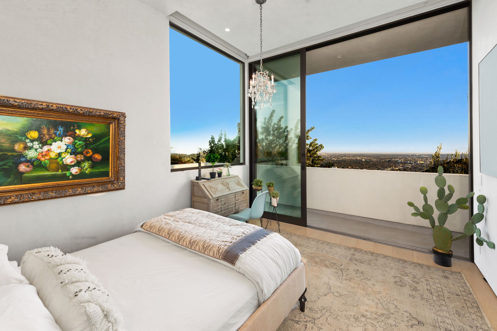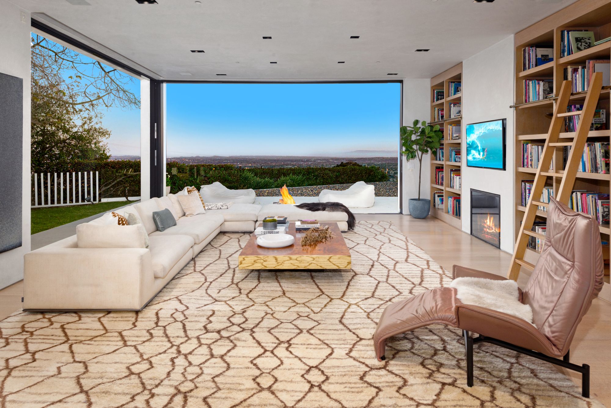 Incredible gated compound set on a rare and extraordinary flat ridge top overlooking the entire LA Basin from East of Downtown to the Ocean. 3 years to create this unique and uncommon environment with spectacular scale, design, high-quality finishes and attention to detail. Large open spaces flooded with natural light and entire walls of pocket doors. High ceilings throughout with expansive gallery. Formal living room with bookcases, fireplace, and incredible views. Gourmet kitchen/family room opens to pool and outdoor kitchen. Separate Media room, Master suite with sitting room, double closets/dressing room and gorgeous marble bath. 5 additional bedrooms ensuite all open to wraparound view terraces. Across the expansive lawn is a 4 room guest house/studio with 2 baths and desert garden along with private and direct access to miles of hiking trails. A rare opportunity to acquire this one of a kind property.