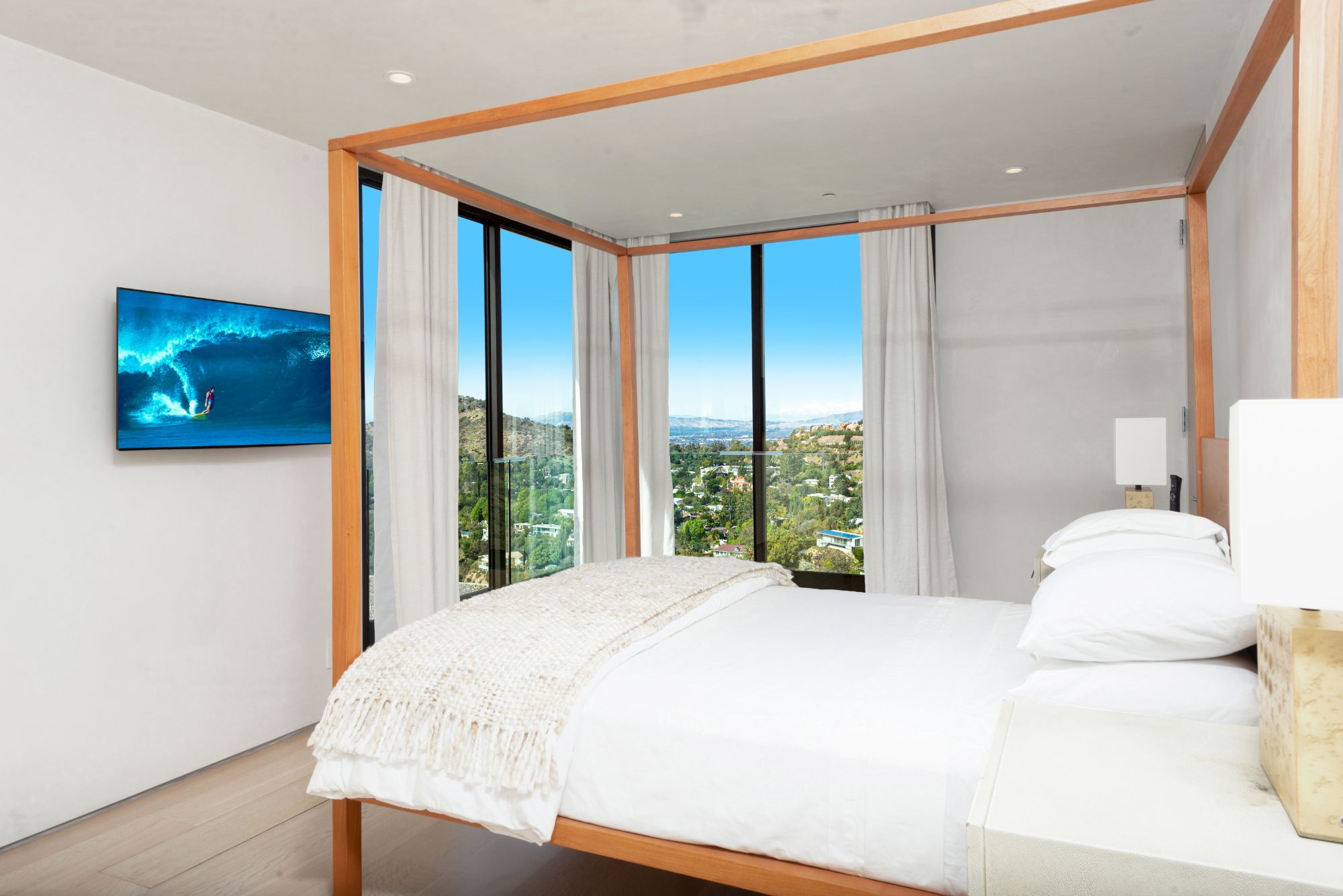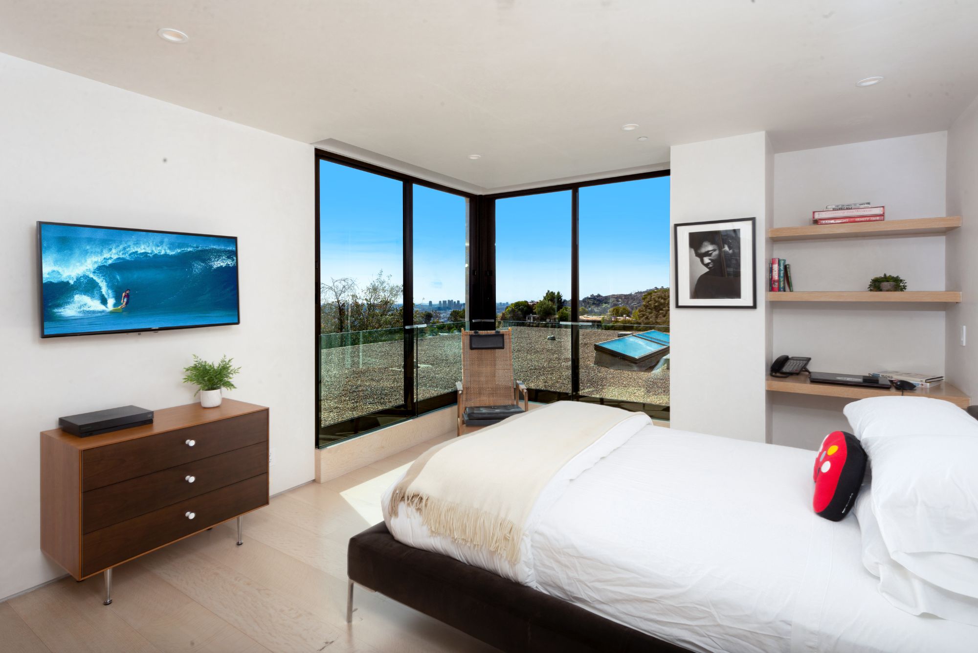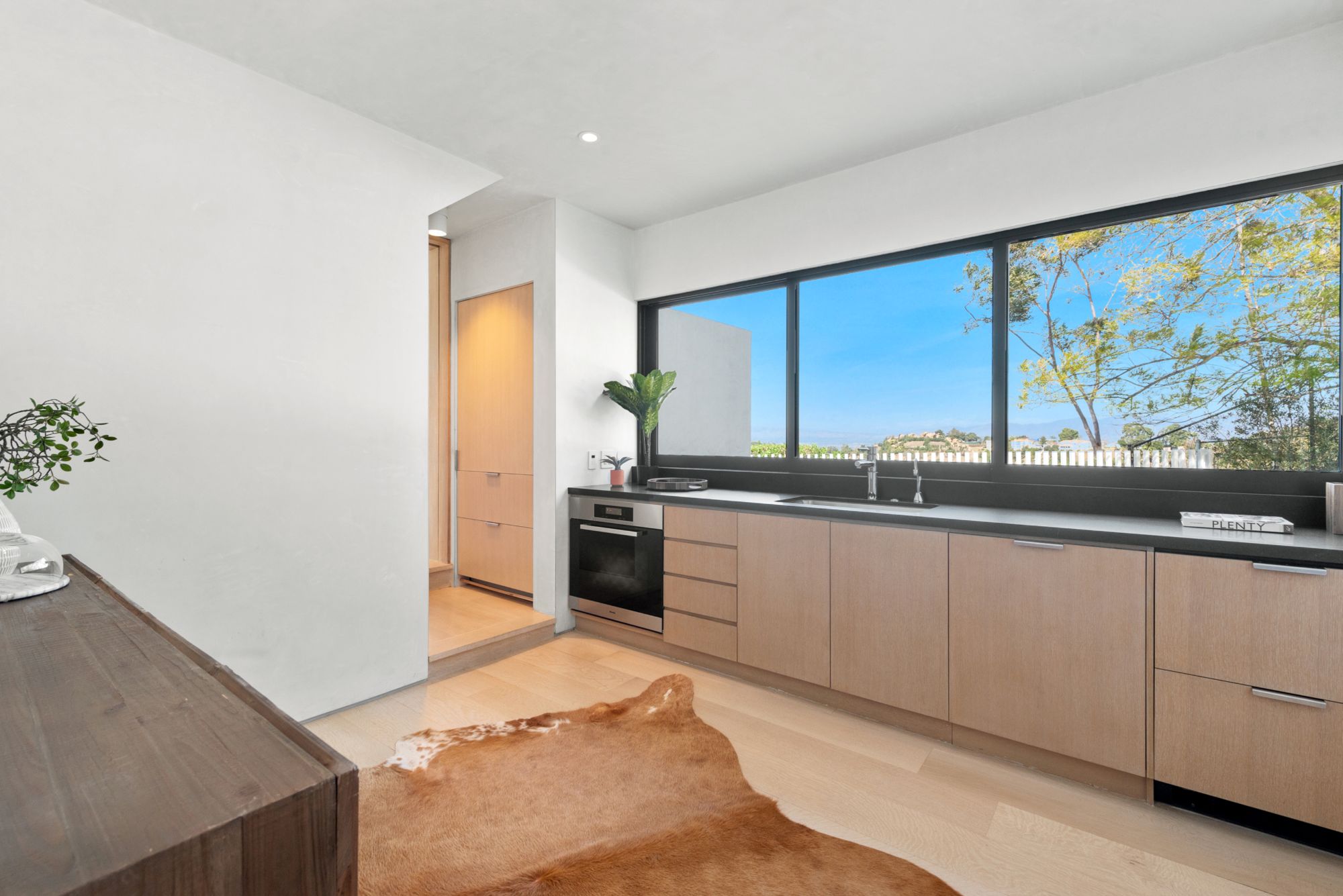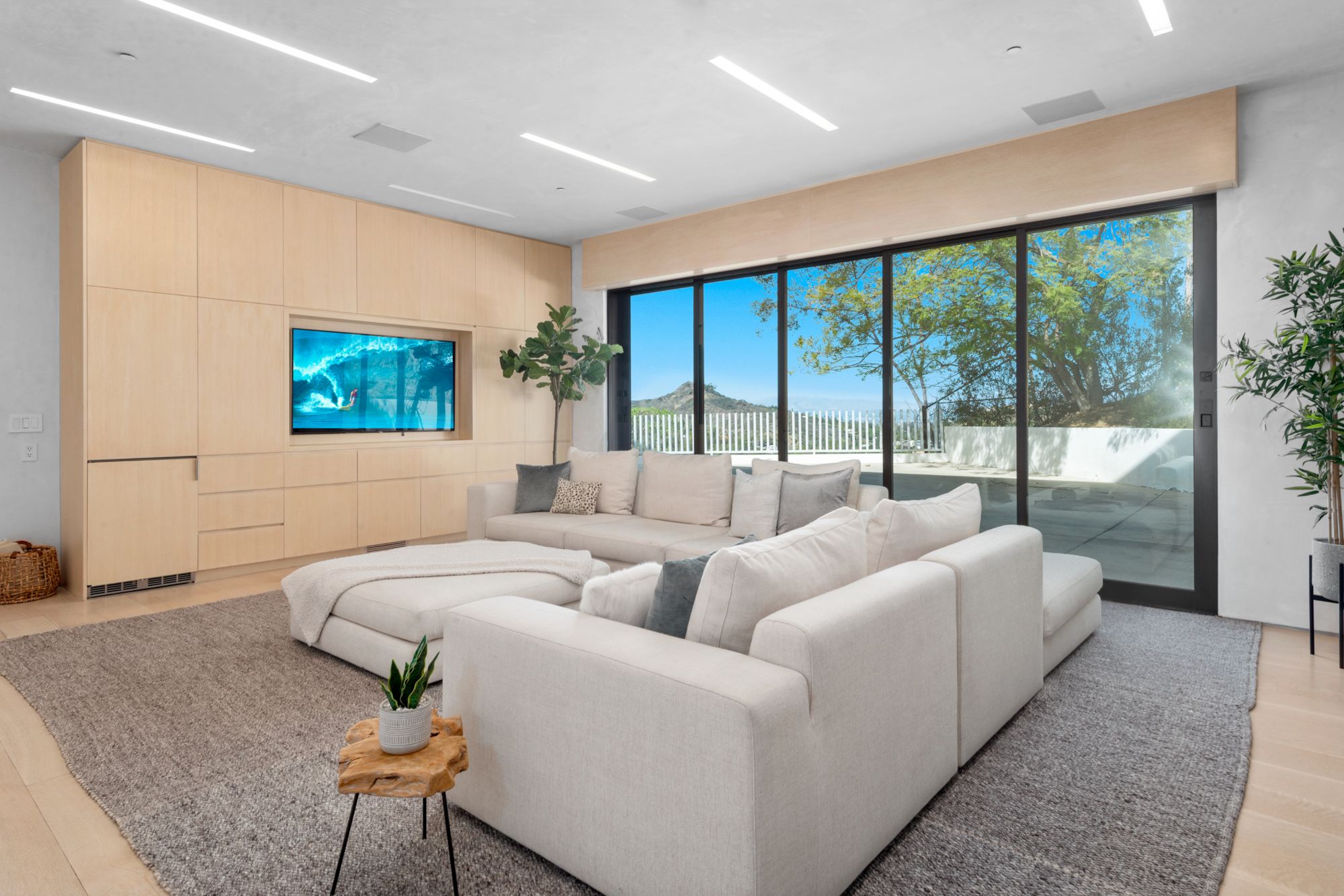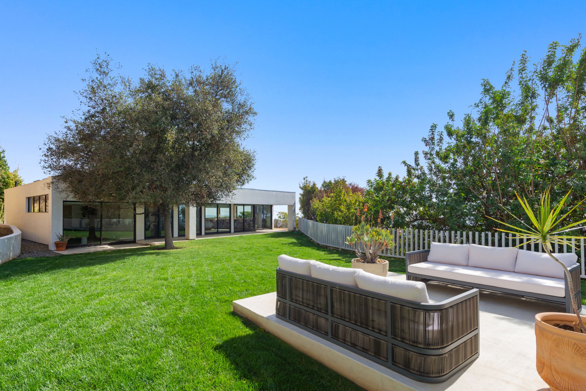 Incredible gated compound set on a rare and extraordinary flat ridge top overlooking the entire LA Basin from East of Downtown to the Ocean. 3 years to create this unique and uncommon environment with spectacular scale, design, high-quality finishes and attention to detail. Large open spaces flooded with natural light and entire walls of pocket doors. High ceilings throughout with expansive gallery. Formal living room with bookcases, fireplace, and incredible views. Gourmet kitchen/family room opens to pool and outdoor kitchen. Separate Media room, Master suite with sitting room, double closets/dressing room and gorgeous marble bath. 5 additional bedrooms ensuite all open to wraparound view terraces. Across the expansive lawn is a 4 room guest house/studio with 2 baths and desert garden along with private and direct access to miles of hiking trails. A rare opportunity to acquire this one of a kind property.
