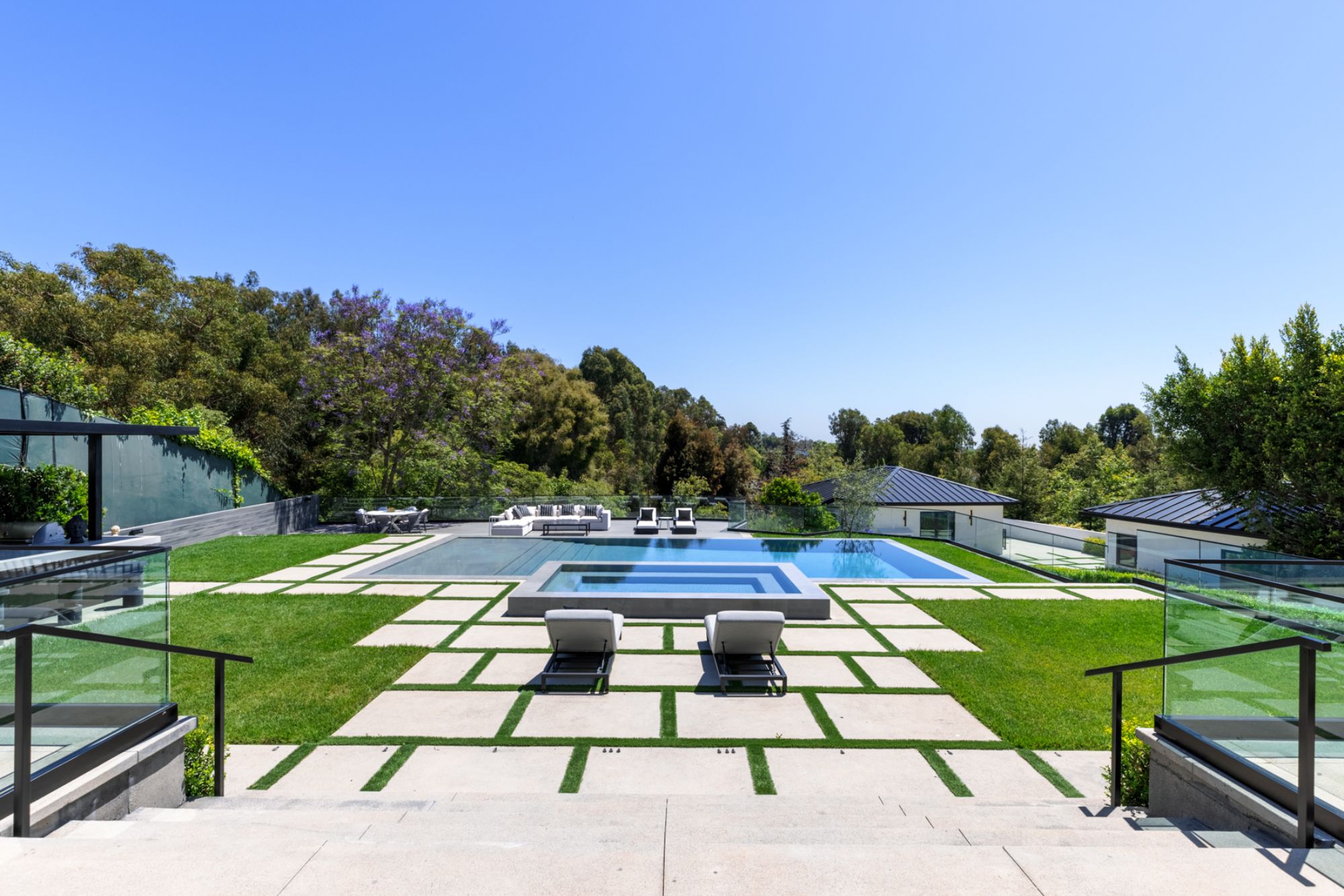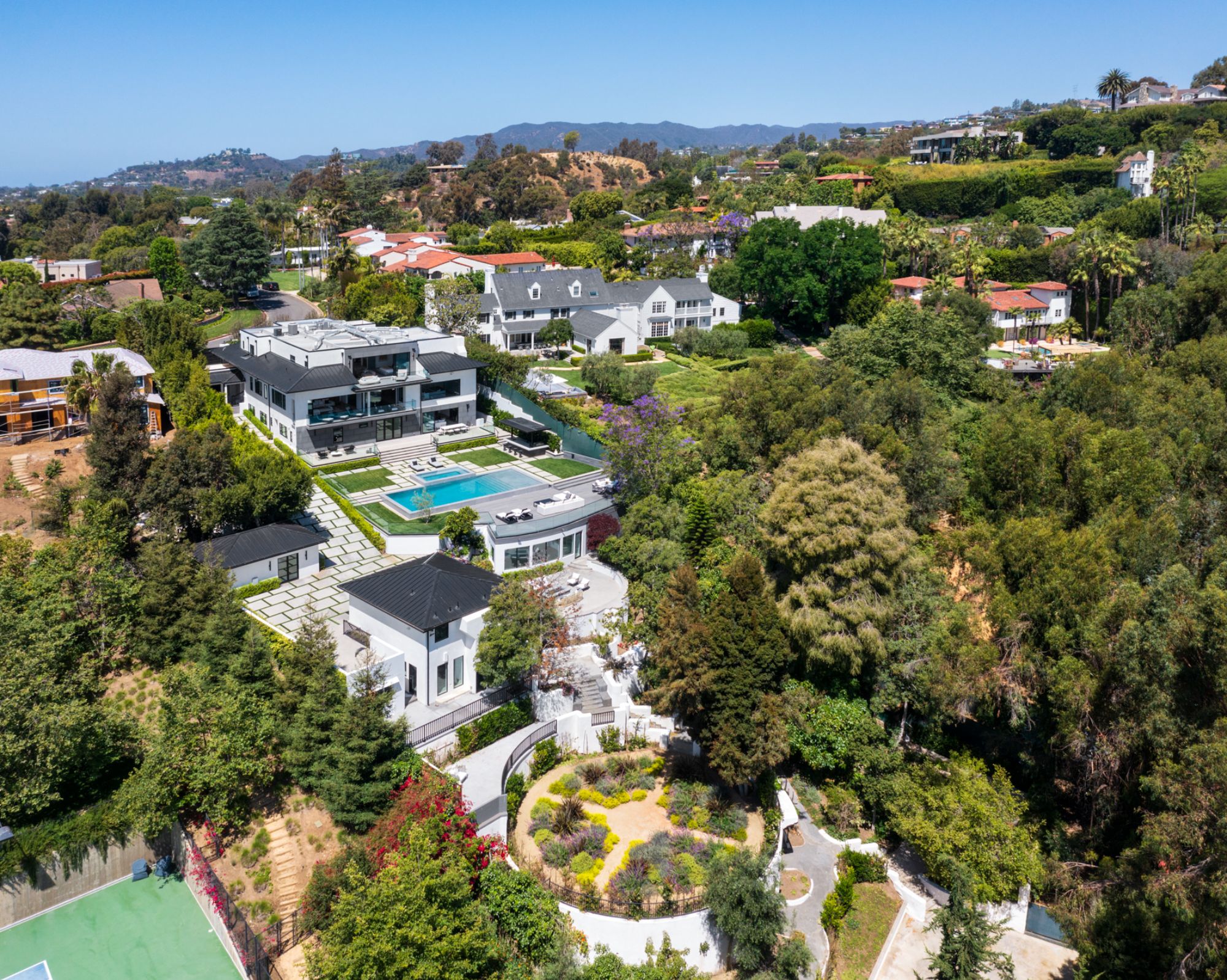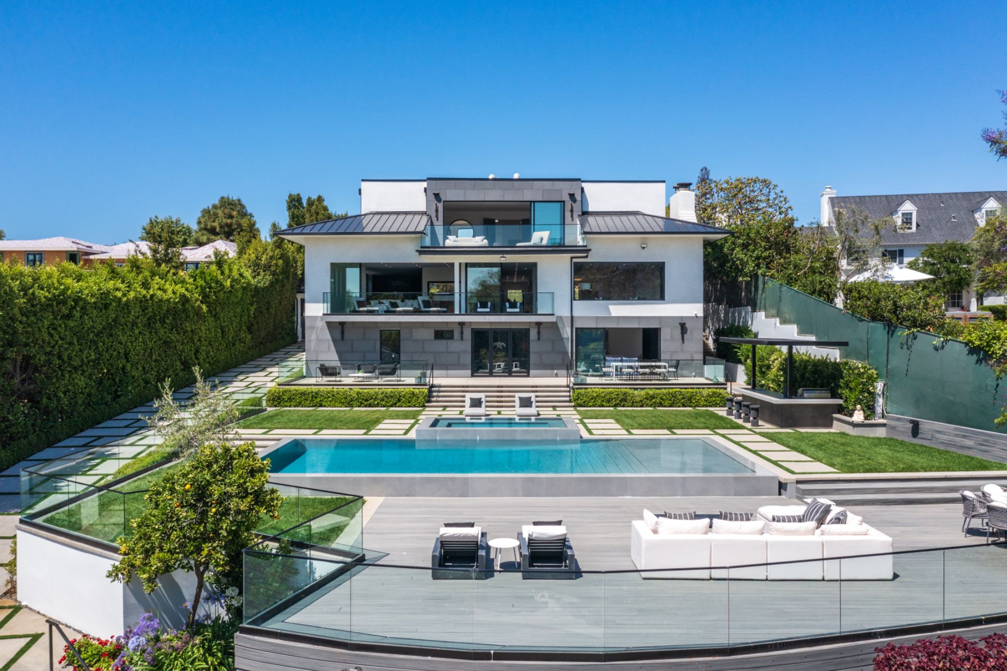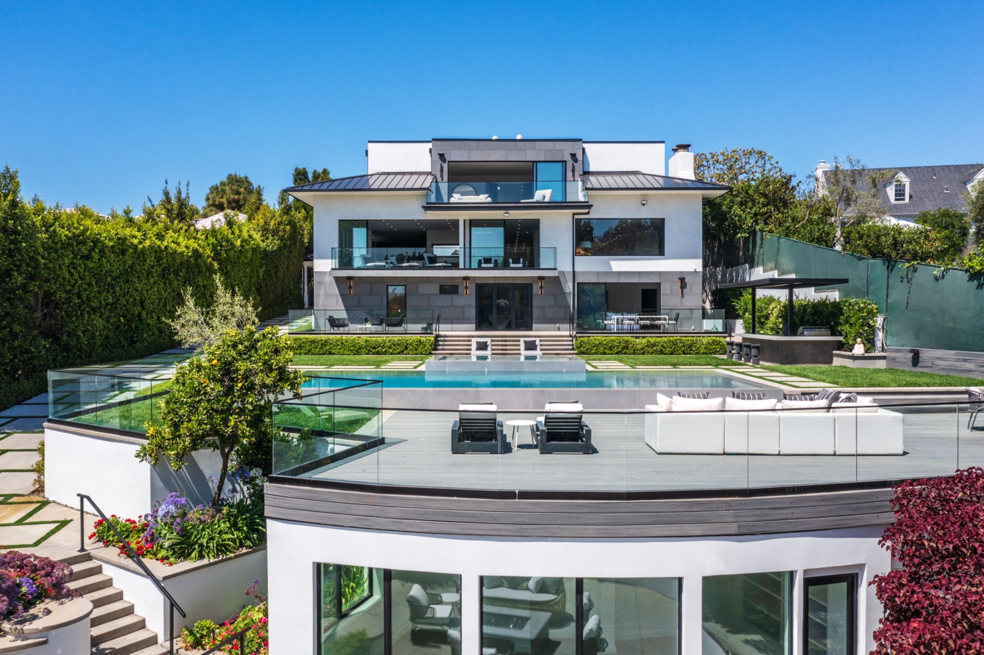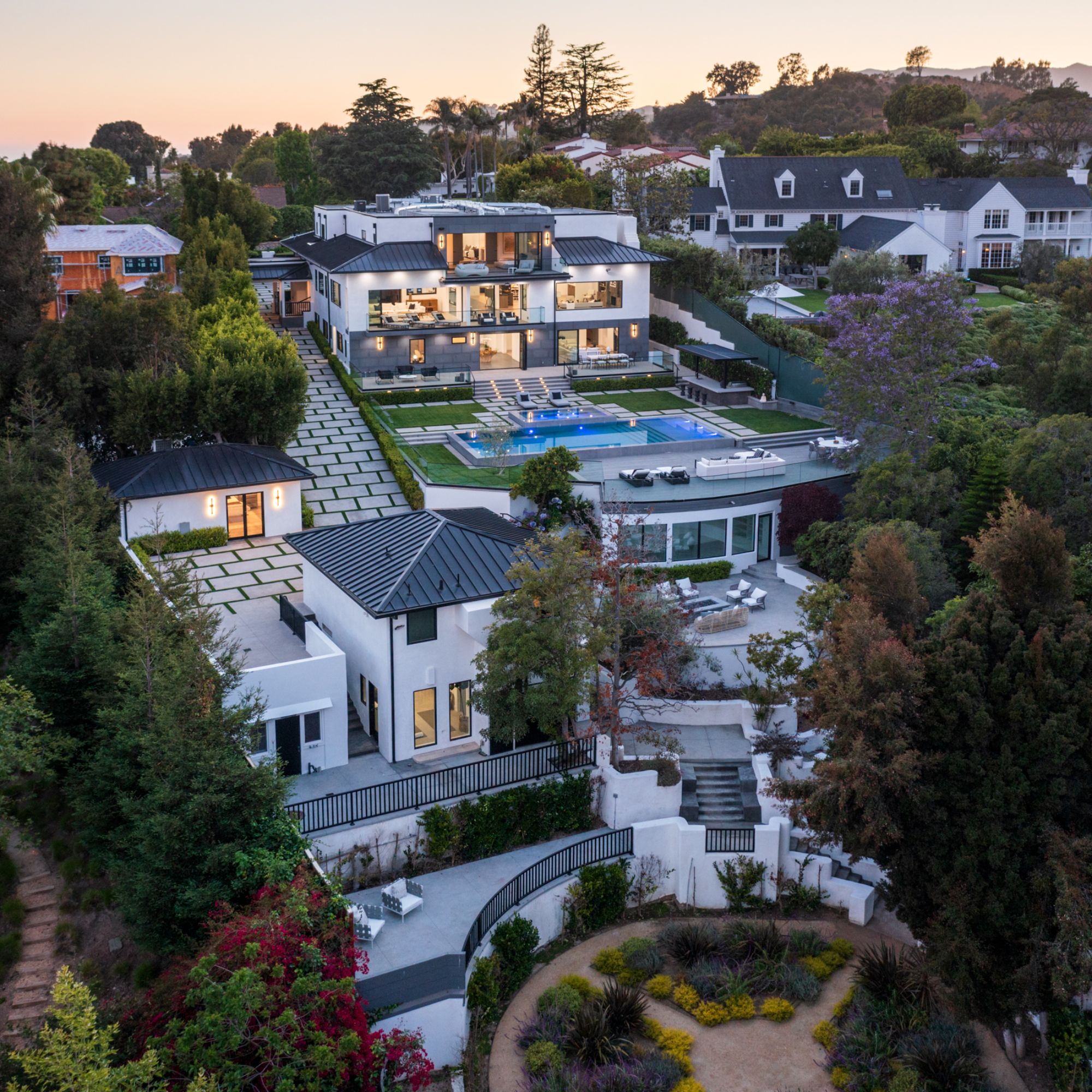 This beautifully updated residence is a luxurious lifestyle compound with multi-level outdoor entertaining spaces sprawling on a gorgeous, forested acre in Brentwood behind the complete privacy of the gates. Comprised of 5 structures, this exceptional retreat is set in a lush and verdant scenery where every inch reflects remarkable craftsmanship, and every step reveals a sensational amenity. Open, sun-filled living spaces encompass 8 bedrooms, 15 bathrooms, multiple living rooms, patio lounges beyond glass doors, formal dining room with a wine wall, theater, and office. Chef's kitchen with rift white oak cabinets, Wolf appliances and an exquisite, tiered stone waterfall island. Expansive outdoor entertaining oasis encompasses a magnificent front court, a vast, a well-landscaped terrace with a wet bar, spectacular infinity pool & spa and a firepit lounge and a garden amidst soaring trees. A long, private driveway leads to additional amenities: a guest house, gym, game room, and an artist studio. Tranquility permeates the 3rd floor resting quarters that feature a pajama lounge, and a lavish primary suite with explosive views, marble filled partners bathrooms with a soaking tub, a fireplace, and a private balcony. This is truly a one-of-a-kind estate at the highest echelon of elegance, design, and entertainment possibilities.