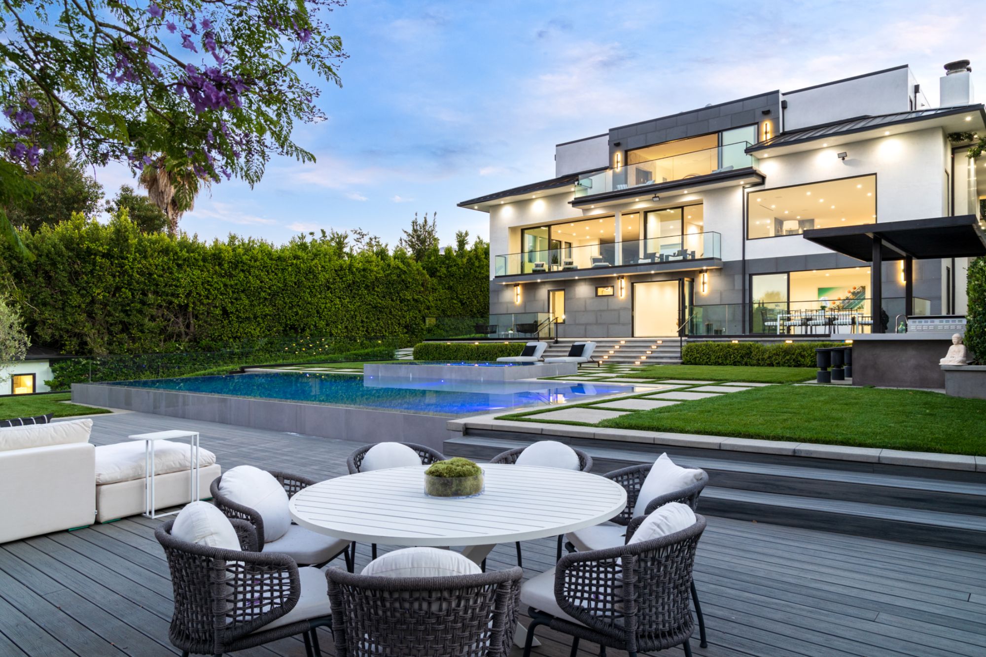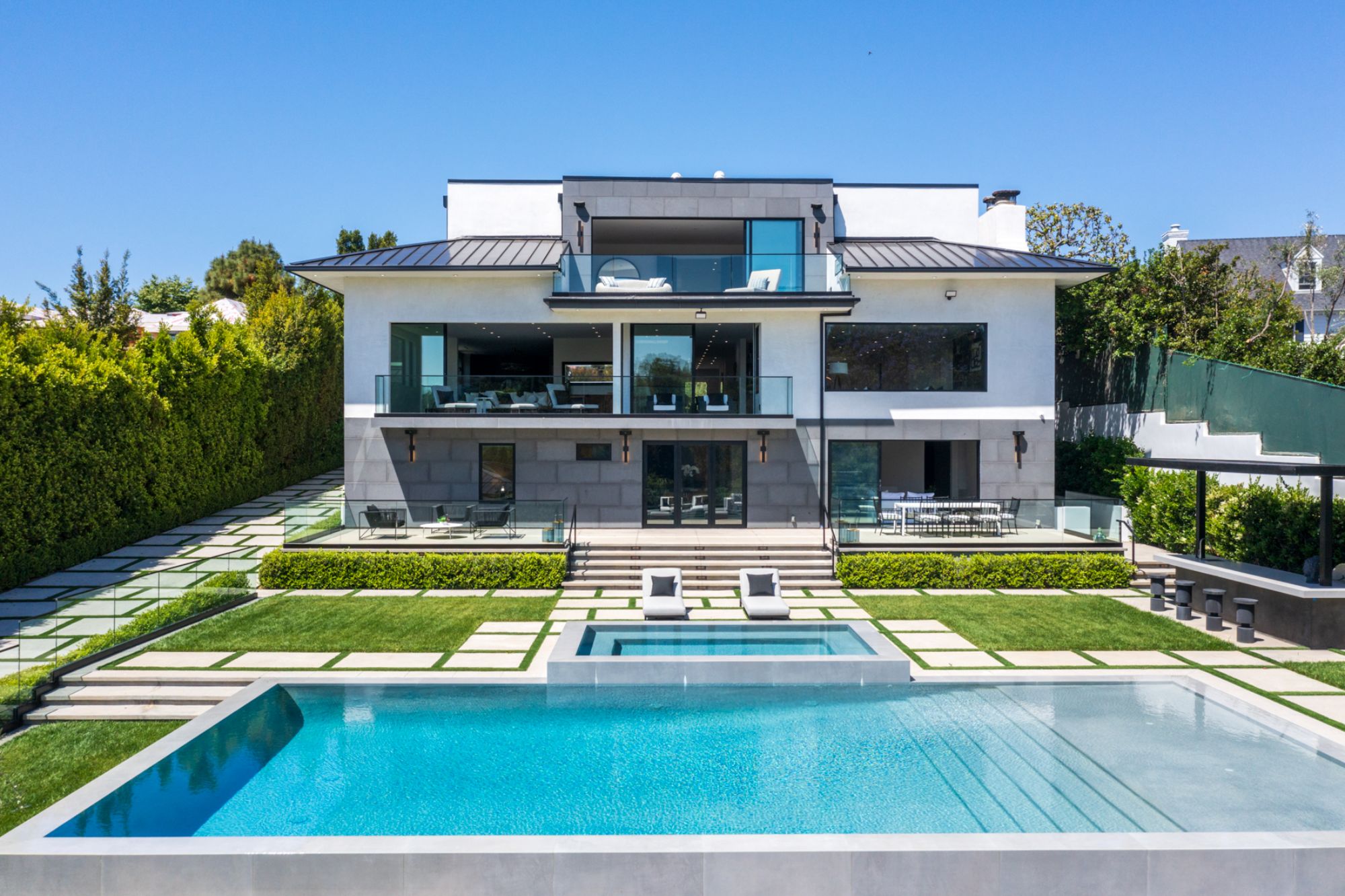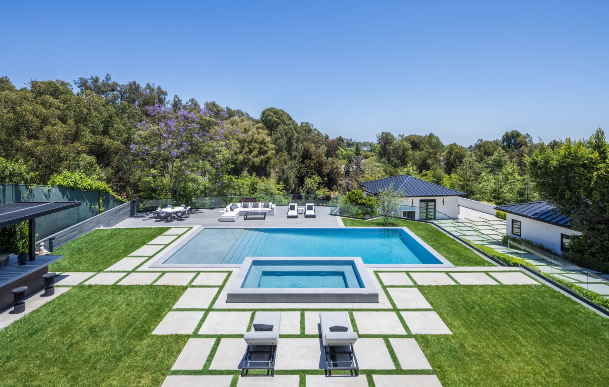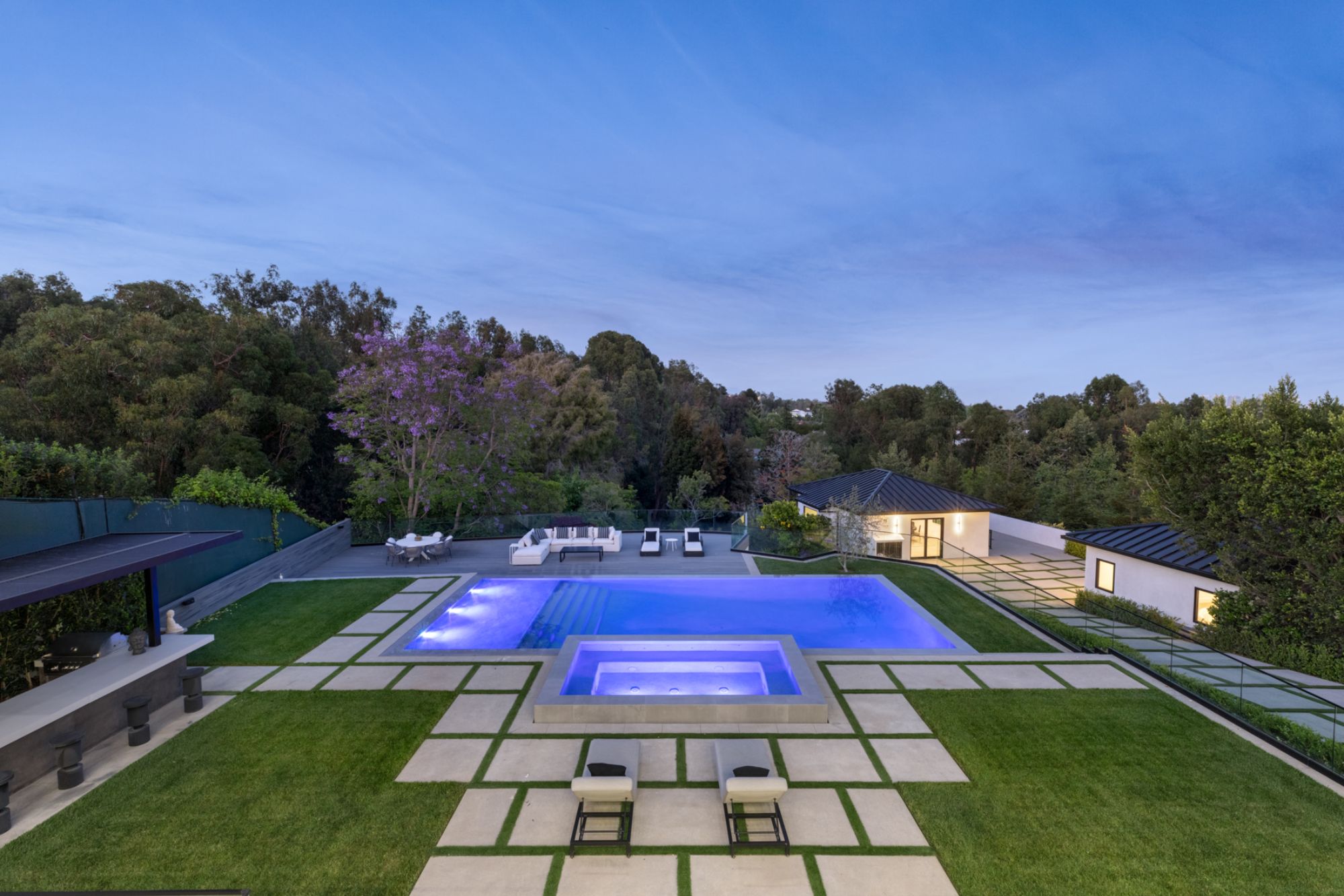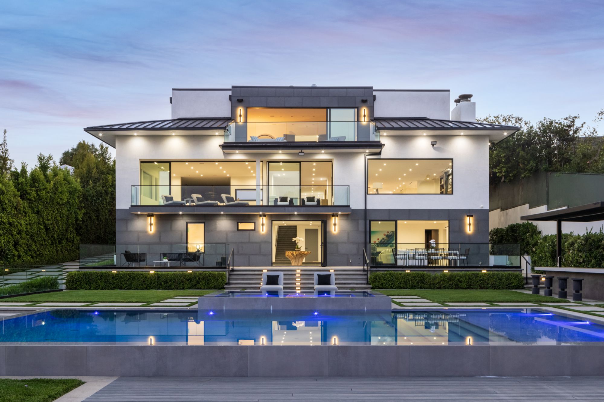 This beautifully updated residence is a luxurious lifestyle compound with multi-level outdoor entertaining spaces sprawling on a gorgeous, forested acre in Brentwood behind the complete privacy of the gates. Comprised of 5 structures, this exceptional retreat is set in a lush and verdant scenery where every inch reflects remarkable craftsmanship, and every step reveals a sensational amenity. Open, sun-filled living spaces encompass 8 bedrooms, 15 bathrooms, multiple living rooms, patio lounges beyond glass doors, formal dining room with a wine wall, theater, and office. Chef's kitchen with rift white oak cabinets, Wolf appliances and an exquisite, tiered stone waterfall island. Expansive outdoor entertaining oasis encompasses a magnificent front court, a vast, a well-landscaped terrace with a wet bar, spectacular infinity pool & spa and a firepit lounge and a garden amidst soaring trees. A long, private driveway leads to additional amenities: a guest house, gym, game room, and an artist studio. Tranquility permeates the 3rd floor resting quarters that feature a pajama lounge, and a lavish primary suite with explosive views, marble filled partners bathrooms with a soaking tub, a fireplace, and a private balcony. This is truly a one-of-a-kind estate at the highest echelon of elegance, design, and entertainment possibilities.