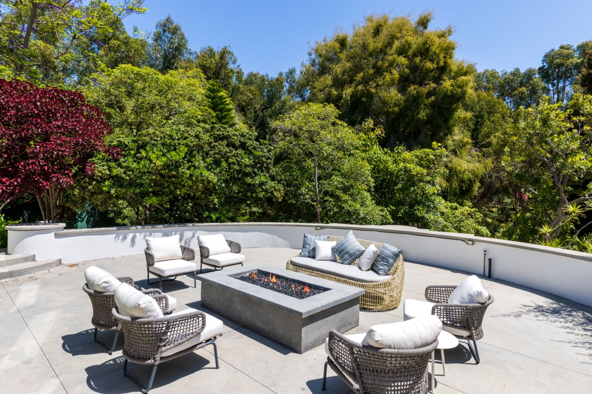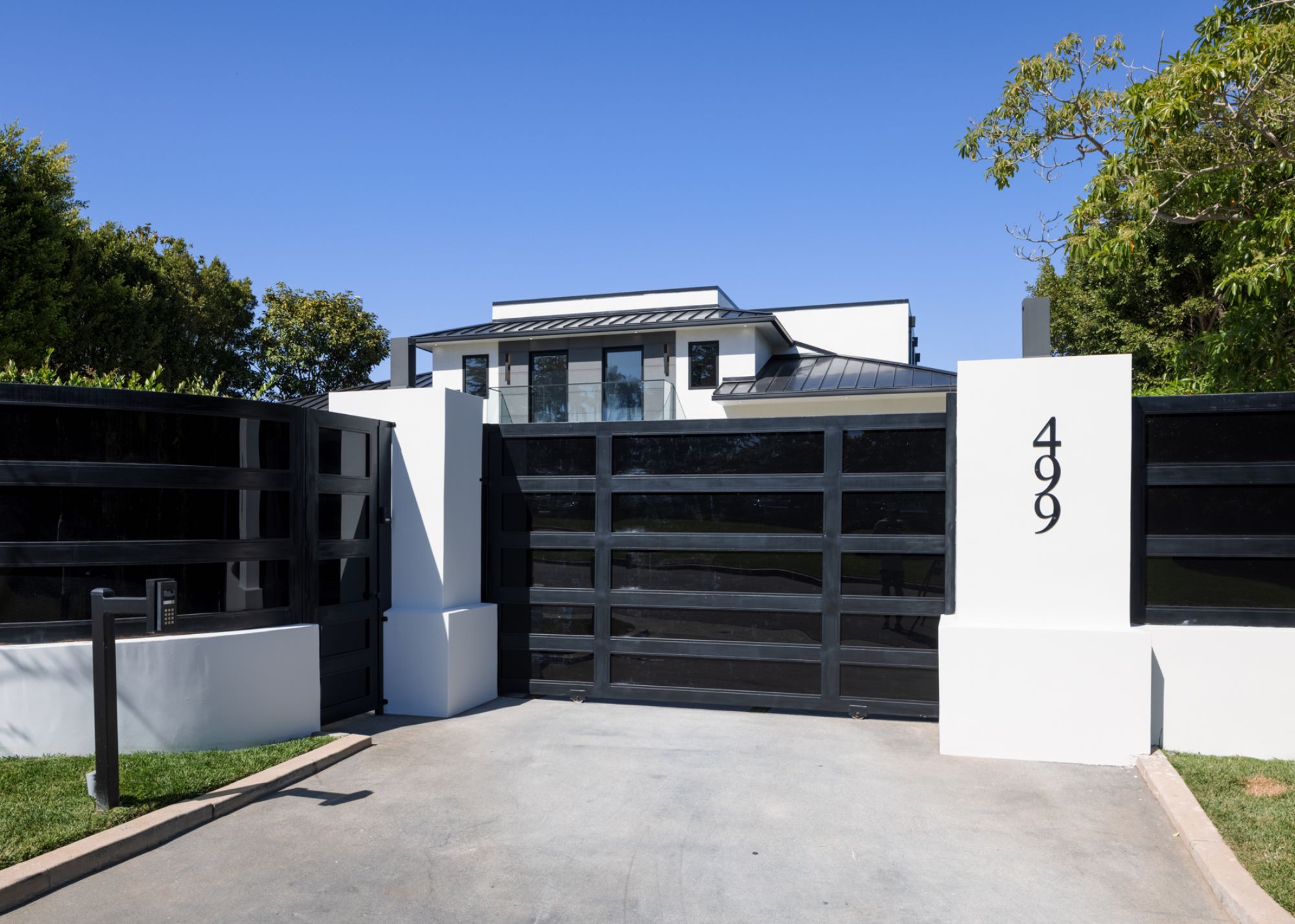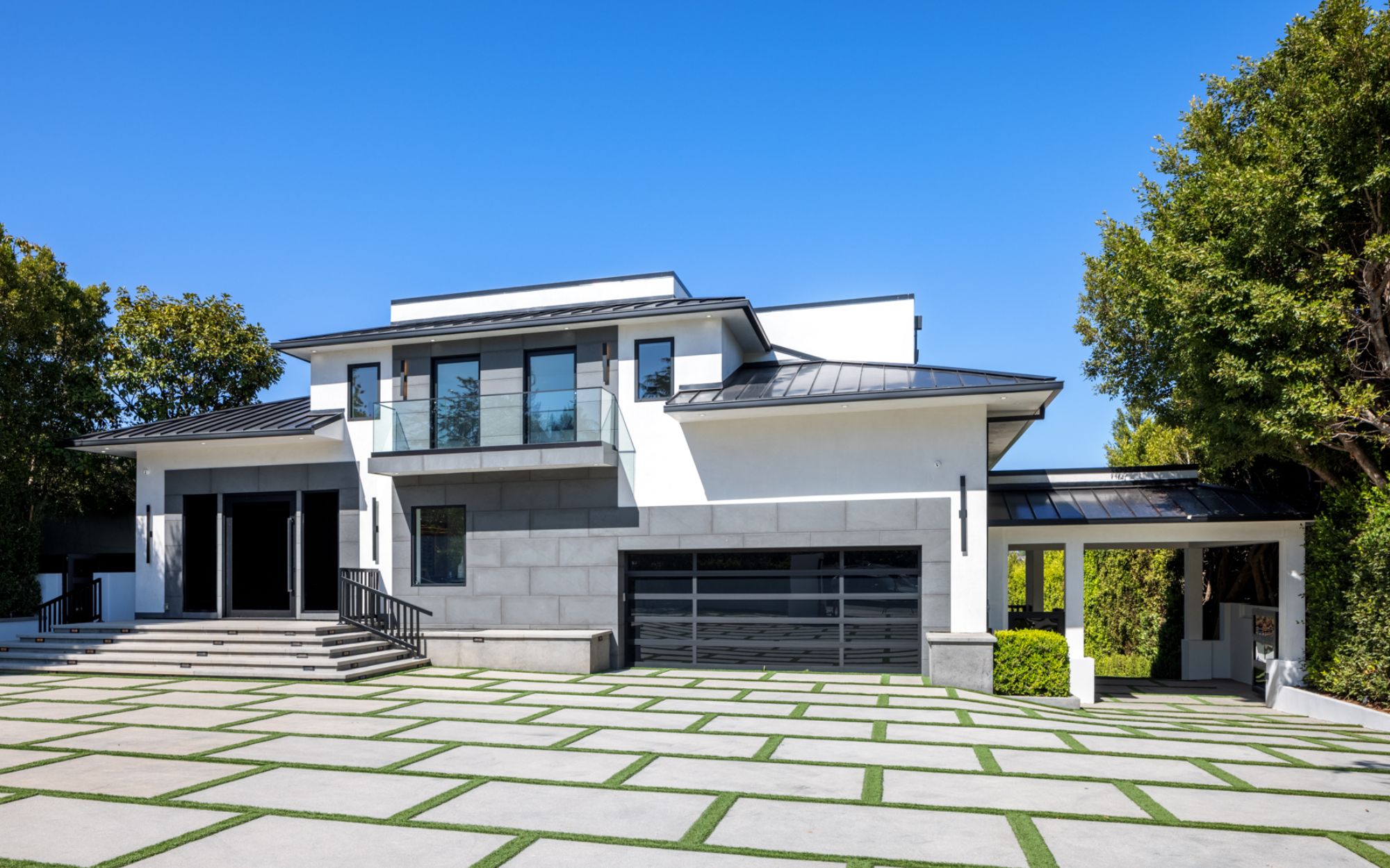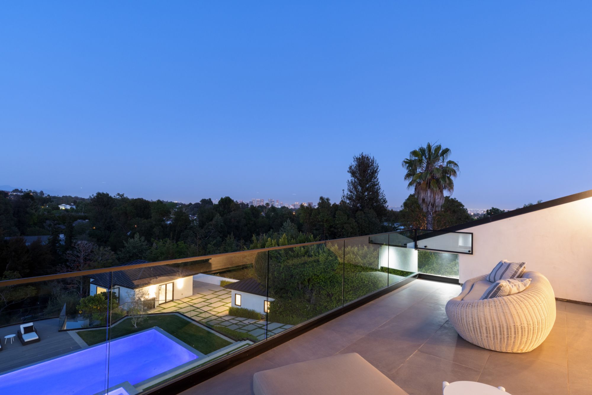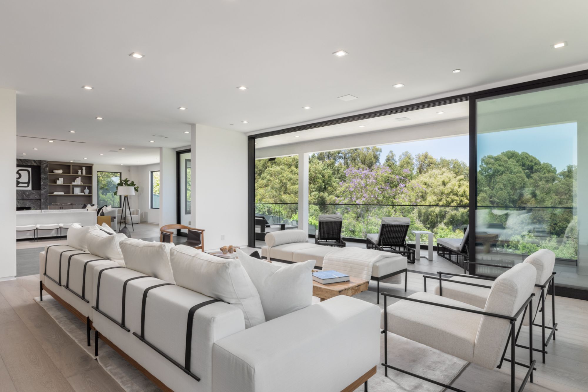 This beautifully updated residence is a luxurious lifestyle compound with multi-level outdoor entertaining spaces sprawling on a gorgeous, forested acre in Brentwood behind the complete privacy of the gates. Comprised of 5 structures, this exceptional retreat is set in a lush and verdant scenery where every inch reflects remarkable craftsmanship, and every step reveals a sensational amenity. Open, sun-filled living spaces encompass 8 bedrooms, 15 bathrooms, multiple living rooms, patio lounges beyond glass doors, formal dining room with a wine wall, theater, and office. Chef's kitchen with rift white oak cabinets, Wolf appliances and an exquisite, tiered stone waterfall island. Expansive outdoor entertaining oasis encompasses a magnificent front court, a vast, a well-landscaped terrace with a wet bar, spectacular infinity pool & spa and a firepit lounge and a garden amidst soaring trees. A long, private driveway leads to additional amenities: a guest house, gym, game room, and an artist studio. Tranquility permeates the 3rd floor resting quarters that feature a pajama lounge, and a lavish primary suite with explosive views, marble filled partners bathrooms with a soaking tub, a fireplace, and a private balcony. This is truly a one-of-a-kind estate at the highest echelon of elegance, design, and entertainment possibilities.