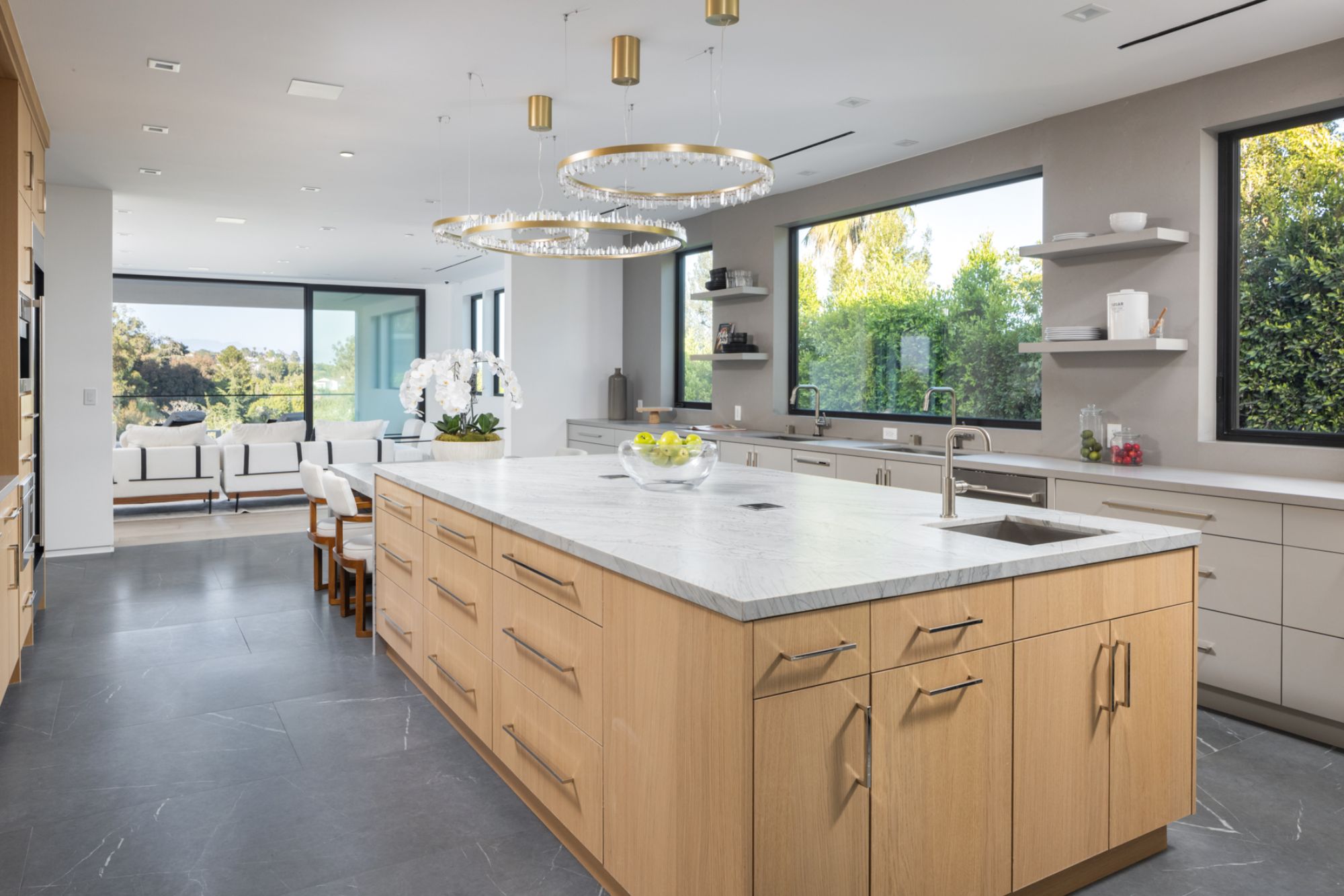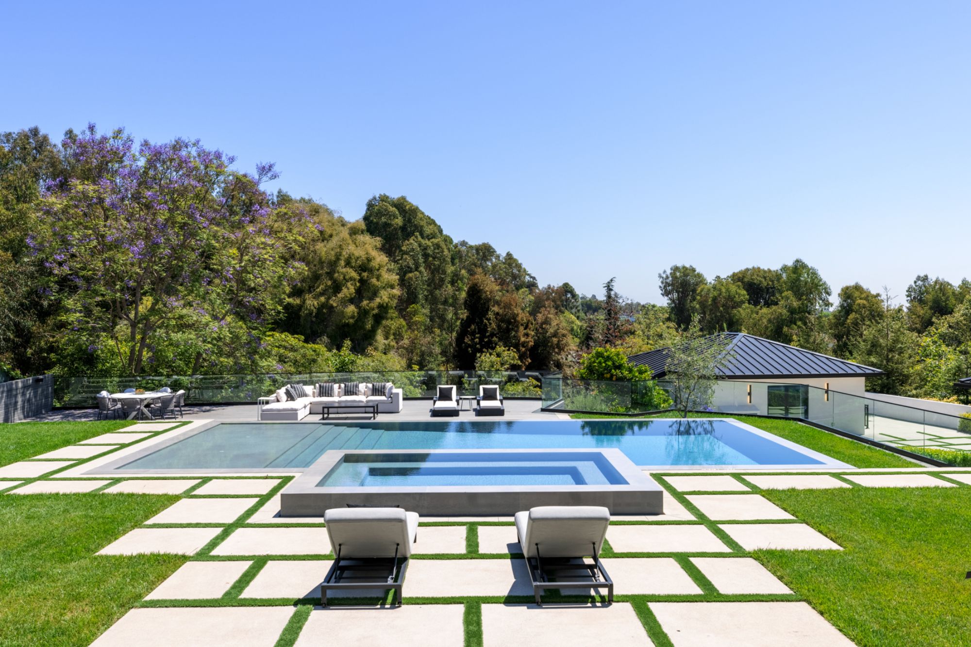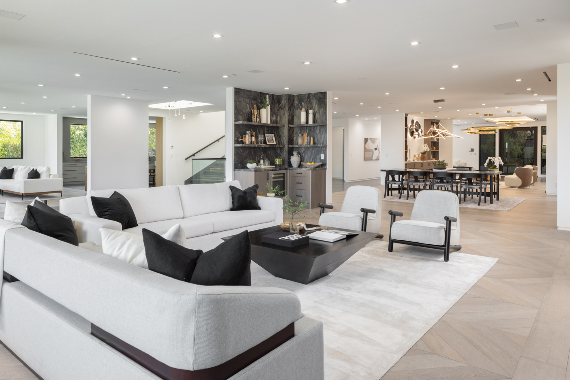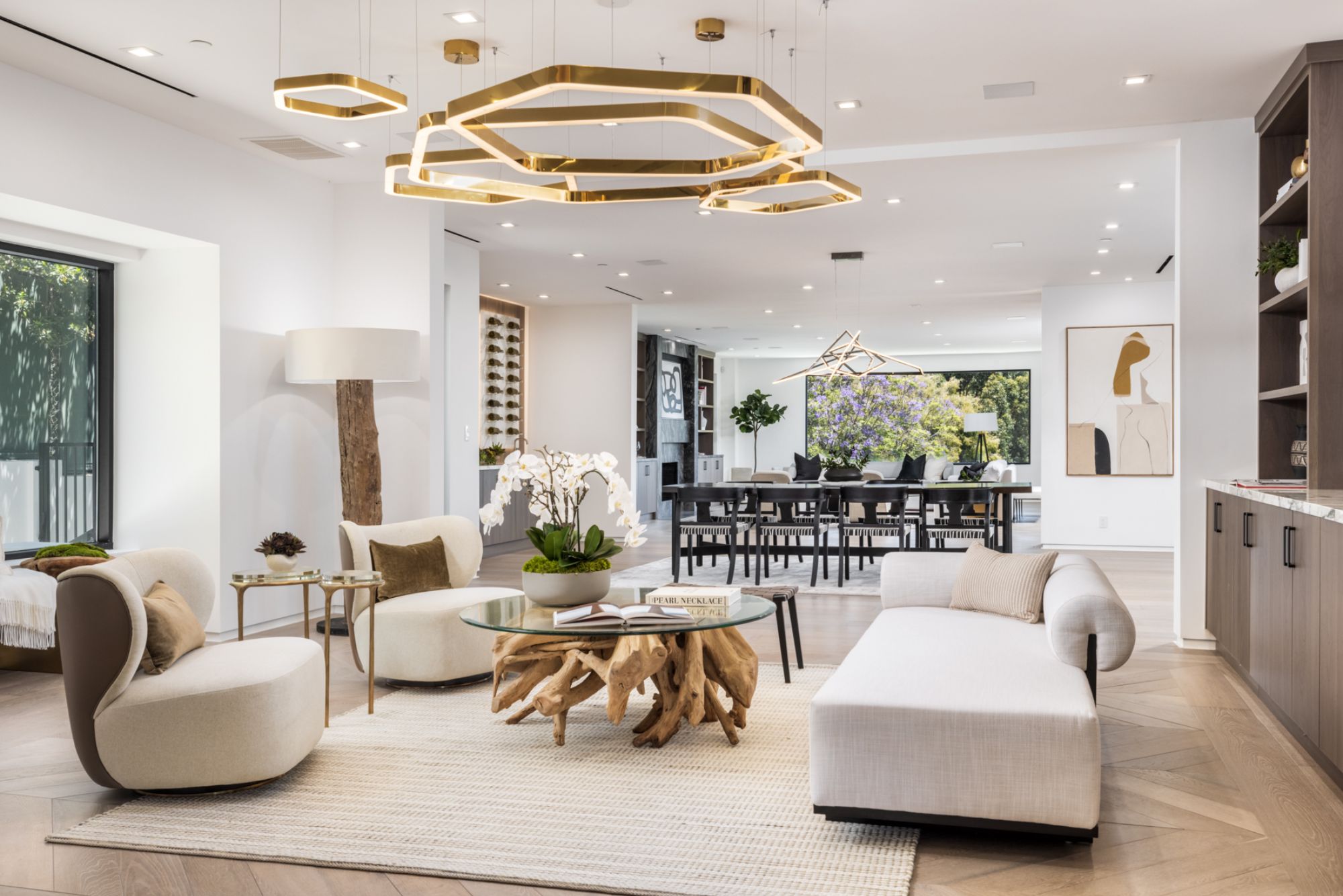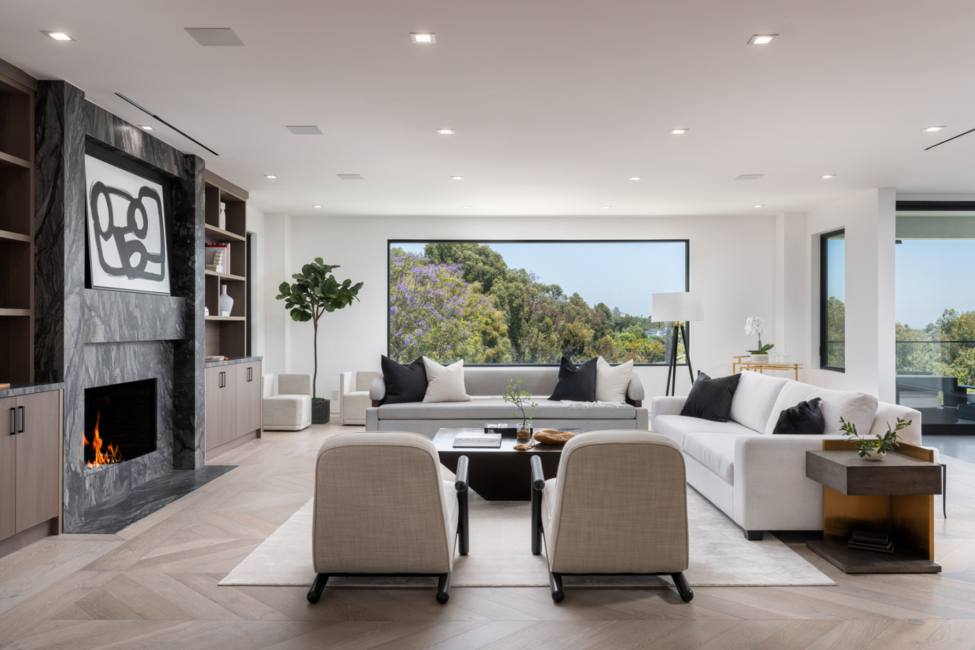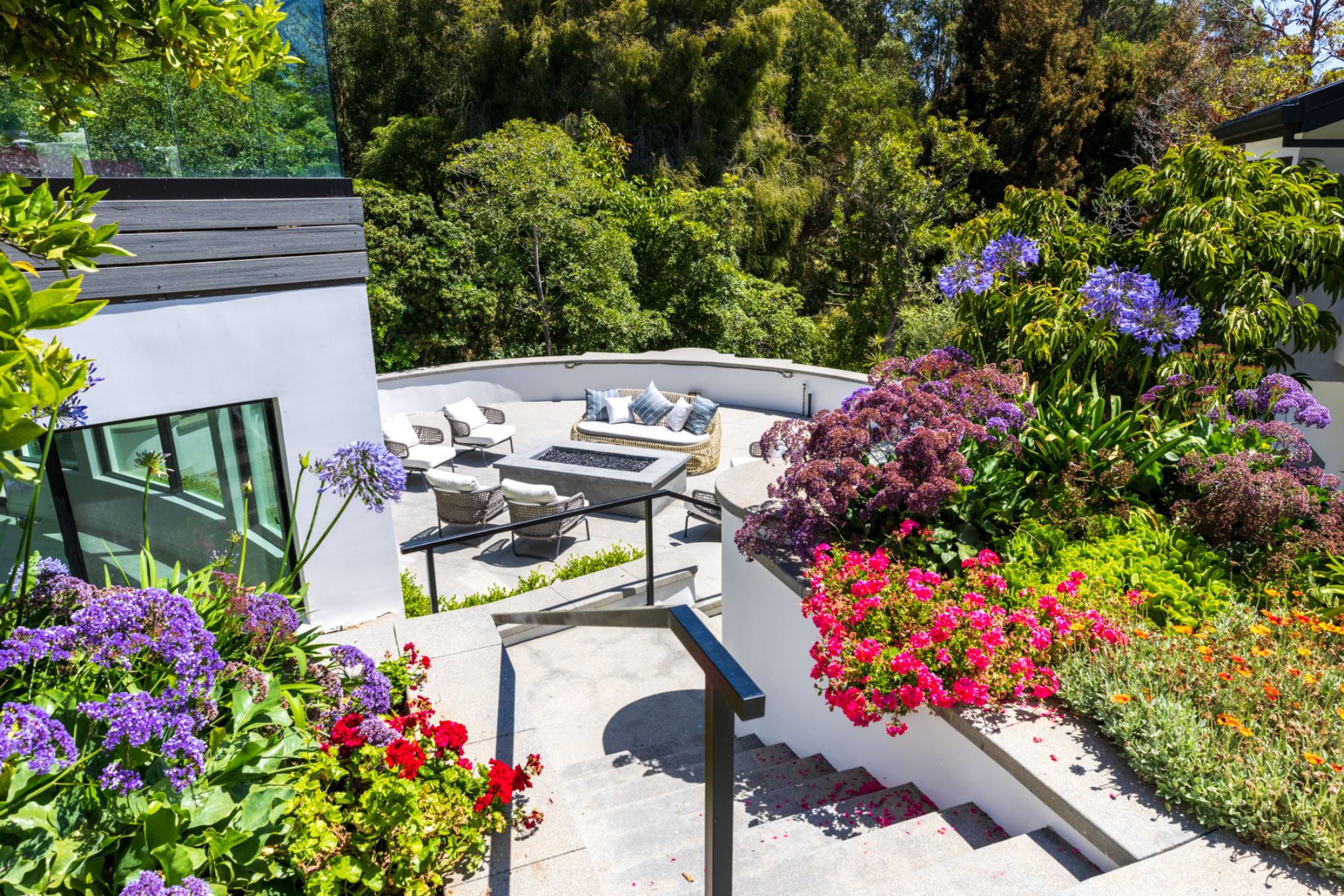 This beautifully updated residence is a luxurious lifestyle compound with multi-level outdoor entertaining spaces sprawling on a gorgeous, forested acre in Brentwood behind the complete privacy of the gates. Comprised of 5 structures, this exceptional retreat is set in a lush and verdant scenery where every inch reflects remarkable craftsmanship, and every step reveals a sensational amenity. Open, sun-filled living spaces encompass 8 bedrooms, 15 bathrooms, multiple living rooms, patio lounges beyond glass doors, formal dining room with a wine wall, theater, and office. Chef's kitchen with rift white oak cabinets, Wolf appliances and an exquisite, tiered stone waterfall island. Expansive outdoor entertaining oasis encompasses a magnificent front court, a vast, a well-landscaped terrace with a wet bar, spectacular infinity pool & spa and a firepit lounge and a garden amidst soaring trees. A long, private driveway leads to additional amenities: a guest house, gym, game room, and an artist studio. Tranquility permeates the 3rd floor resting quarters that feature a pajama lounge, and a lavish primary suite with explosive views, marble filled partners bathrooms with a soaking tub, a fireplace, and a private balcony. This is truly a one-of-a-kind estate at the highest echelon of elegance, design, and entertainment possibilities.