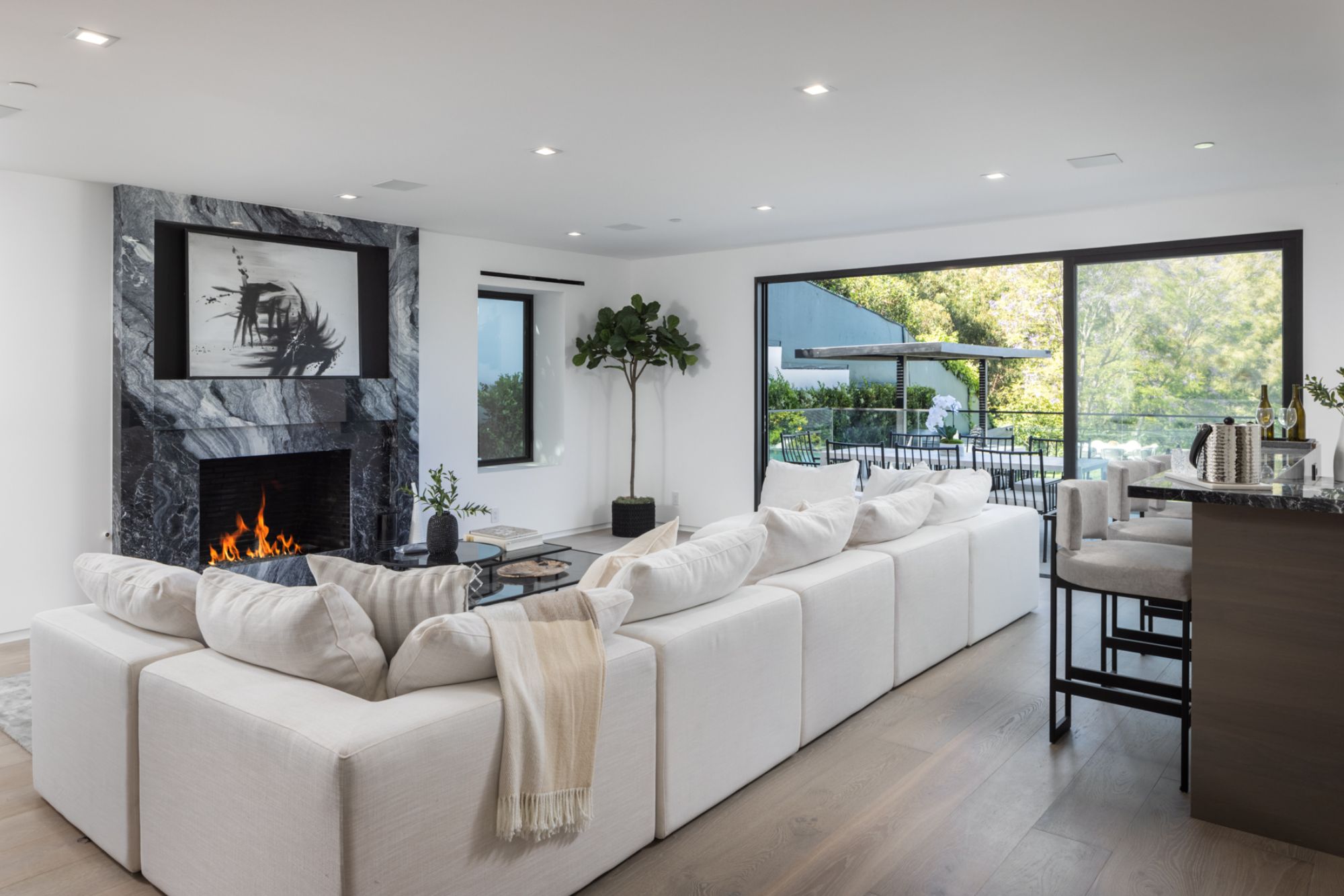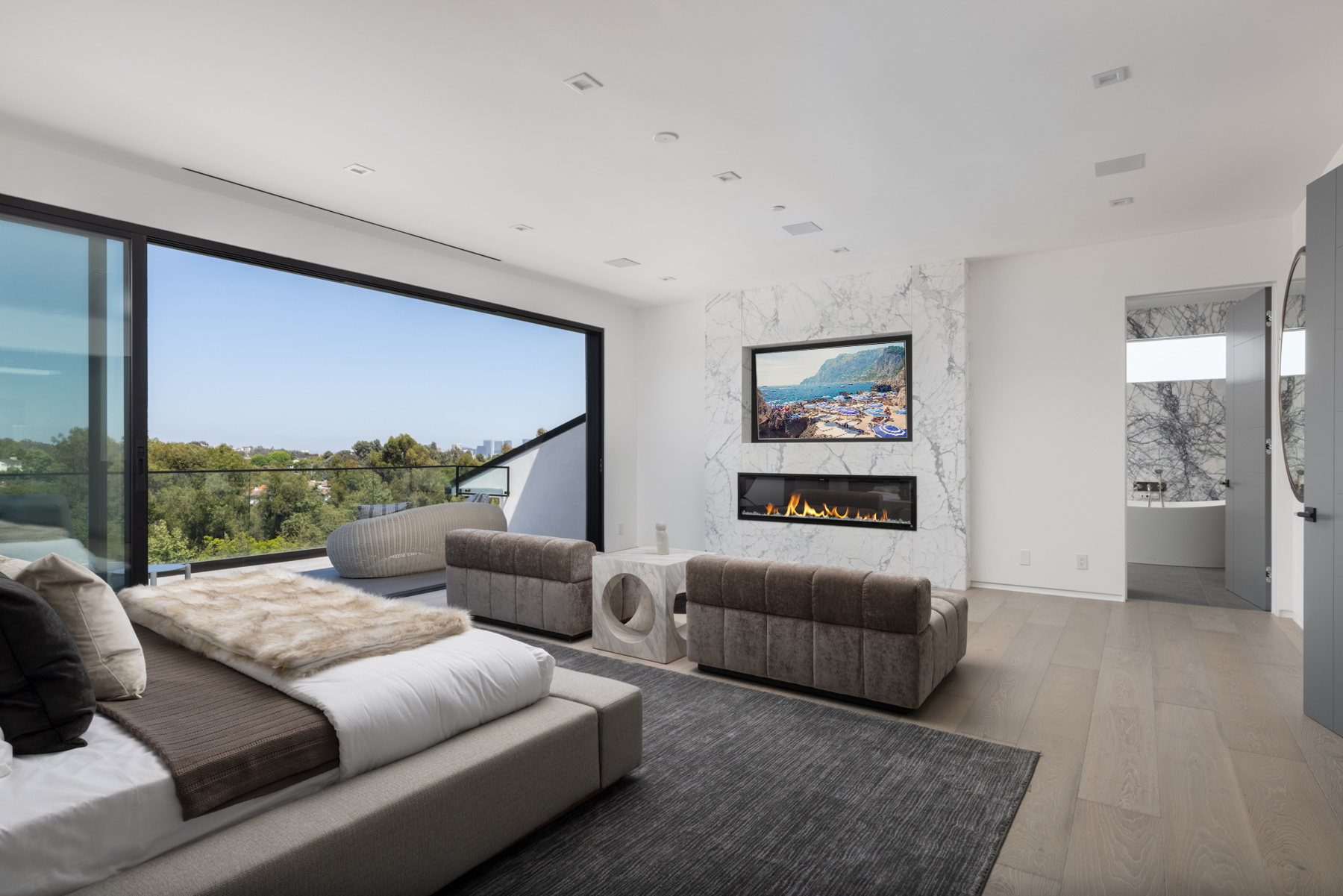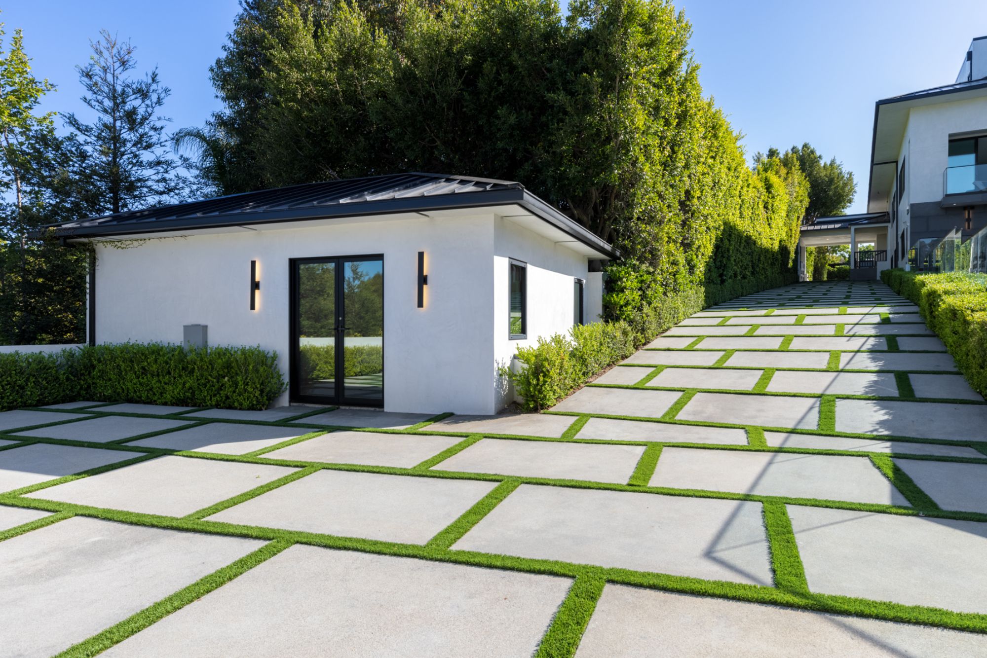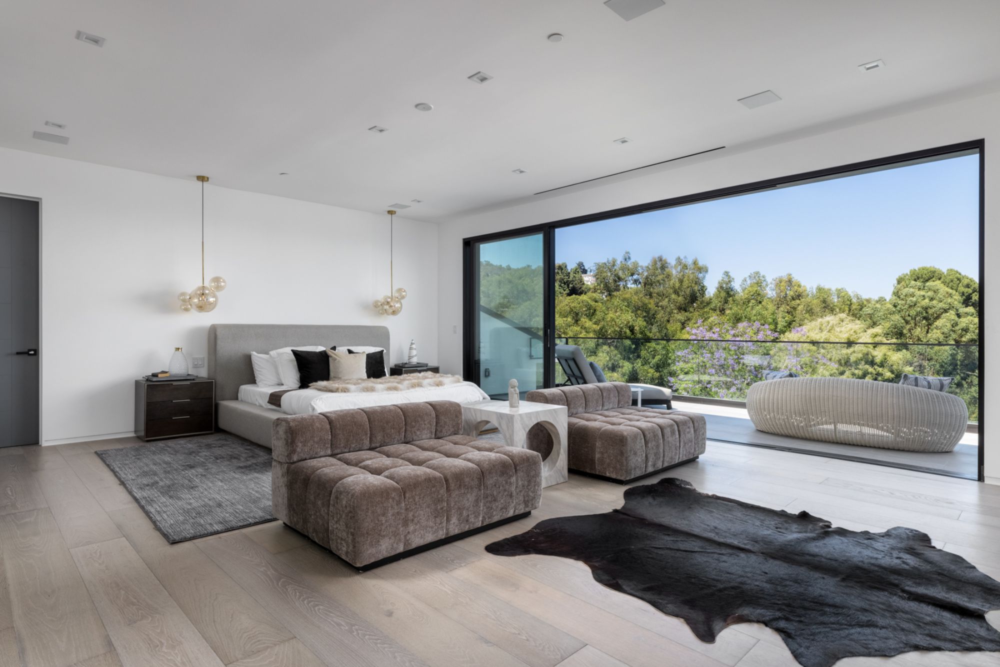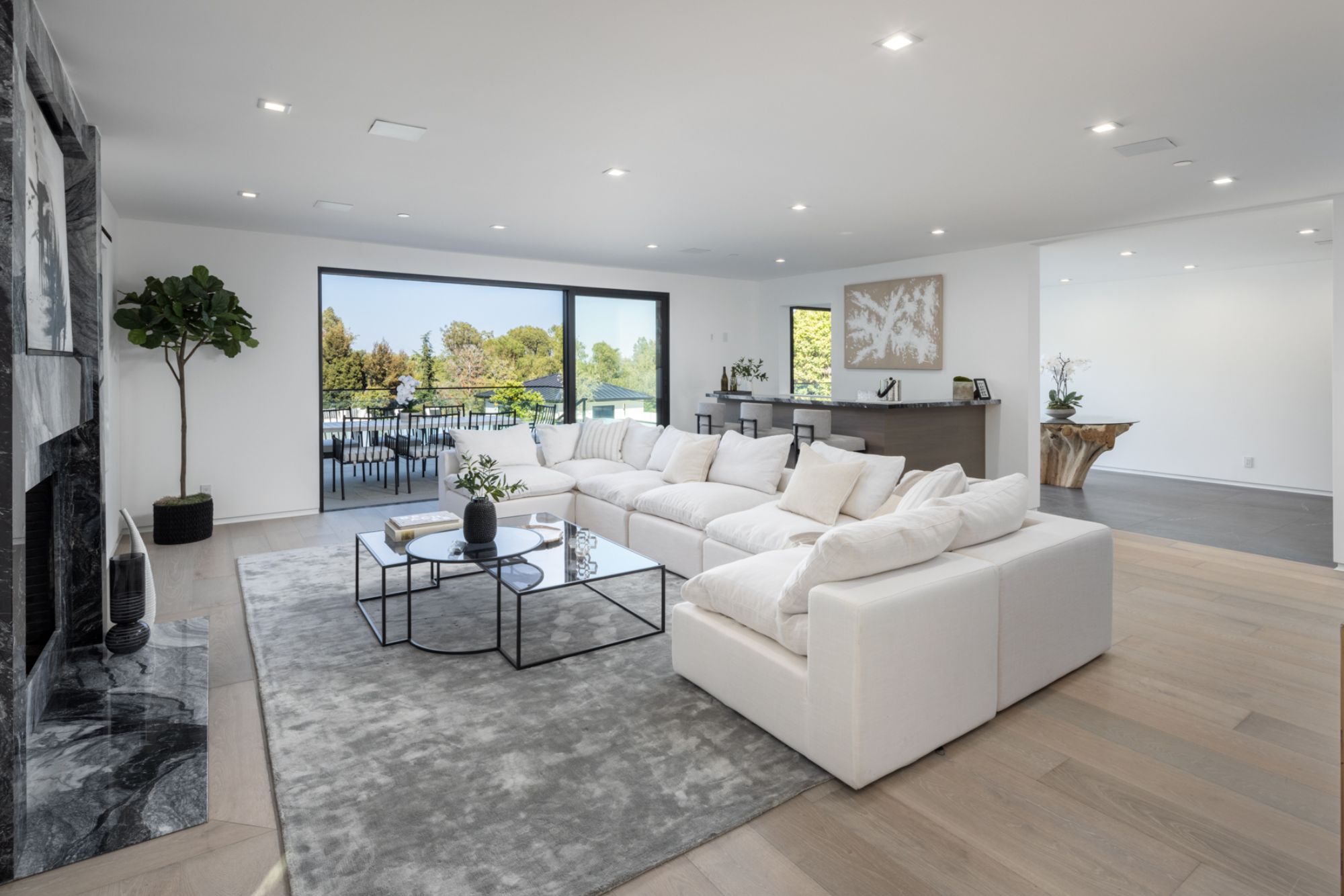 This beautifully updated residence is a luxurious lifestyle compound with multi-level outdoor entertaining spaces sprawling on a gorgeous, forested acre in Brentwood behind the complete privacy of the gates. Comprised of 5 structures, this exceptional retreat is set in a lush and verdant scenery where every inch reflects remarkable craftsmanship, and every step reveals a sensational amenity. Open, sun-filled living spaces encompass 8 bedrooms, 15 bathrooms, multiple living rooms, patio lounges beyond glass doors, formal dining room with a wine wall, theater, and office. Chef's kitchen with rift white oak cabinets, Wolf appliances and an exquisite, tiered stone waterfall island. Expansive outdoor entertaining oasis encompasses a magnificent front court, a vast, a well-landscaped terrace with a wet bar, spectacular infinity pool & spa and a firepit lounge and a garden amidst soaring trees. A long, private driveway leads to additional amenities: a guest house, gym, game room, and an artist studio. Tranquility permeates the 3rd floor resting quarters that feature a pajama lounge, and a lavish primary suite with explosive views, marble filled partners bathrooms with a soaking tub, a fireplace, and a private balcony. This is truly a one-of-a-kind estate at the highest echelon of elegance, design, and entertainment possibilities.