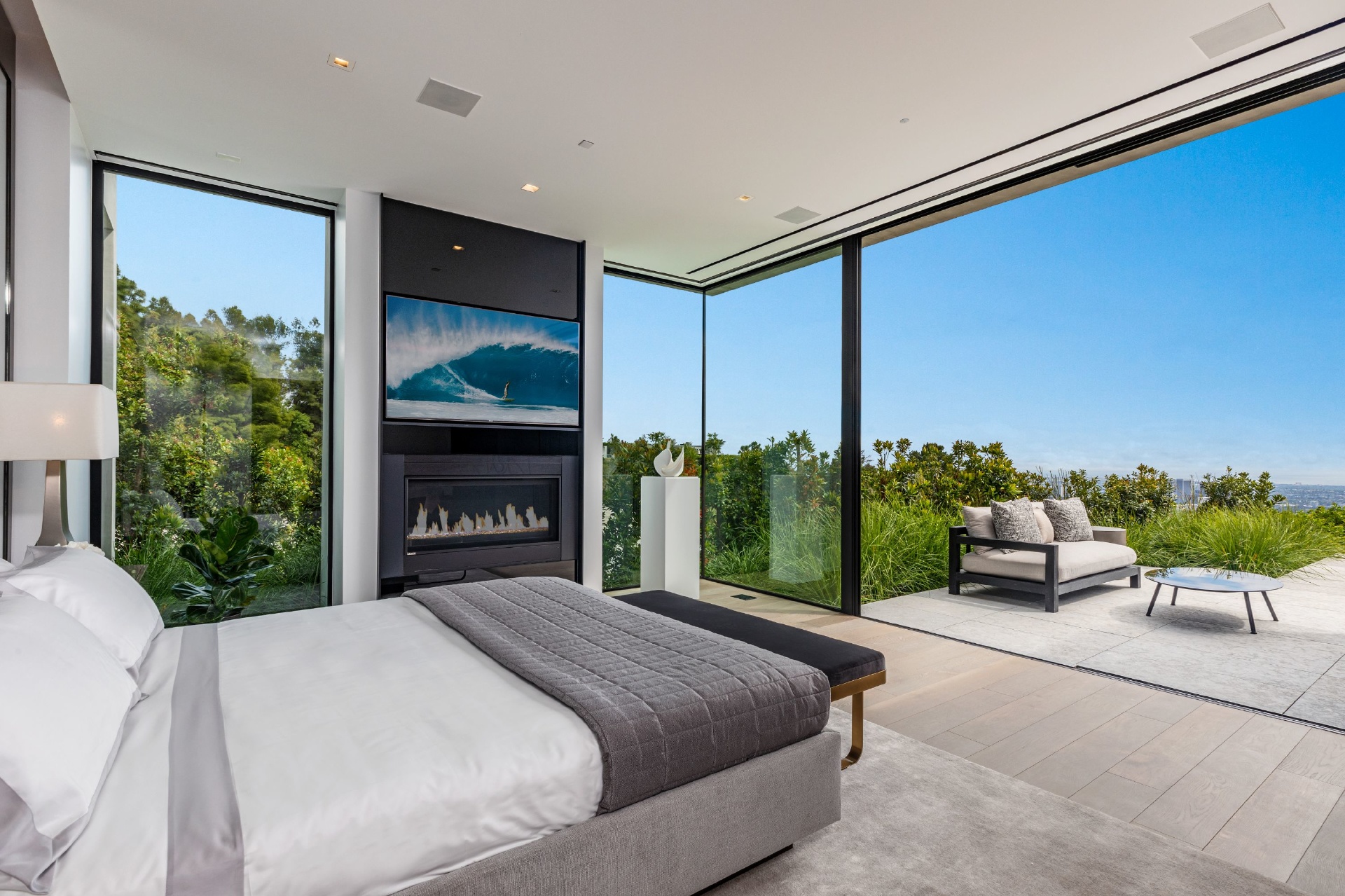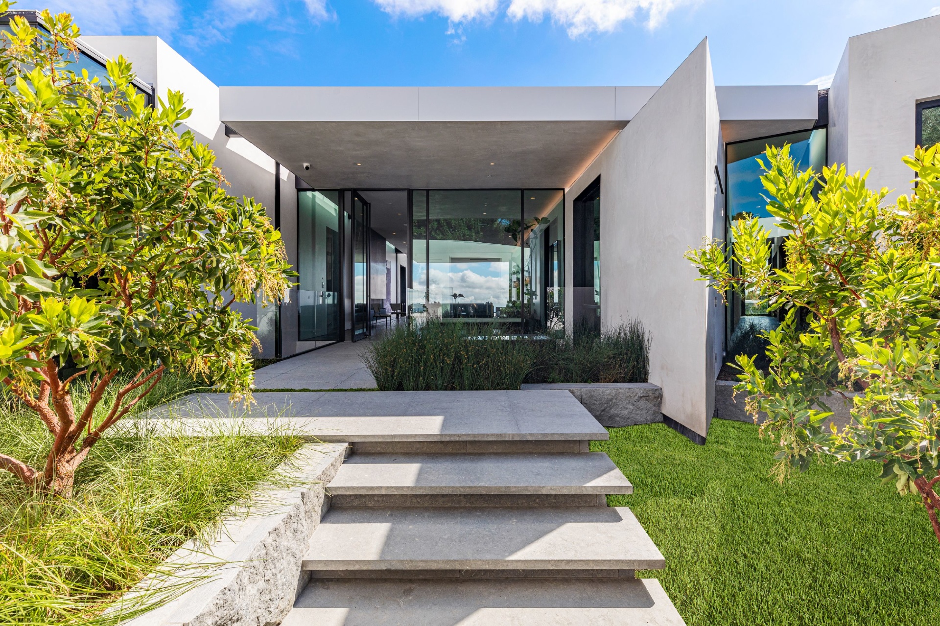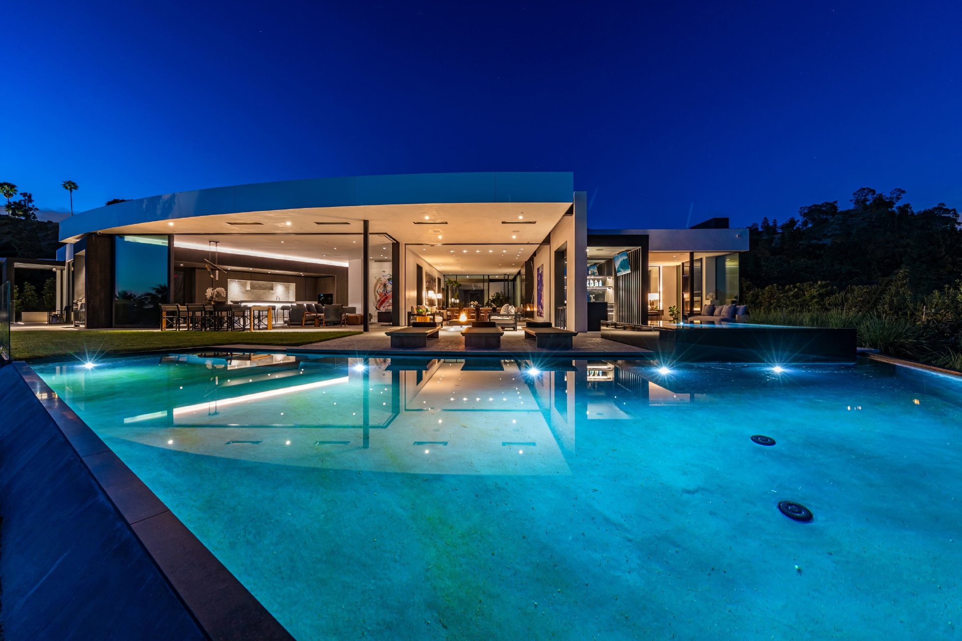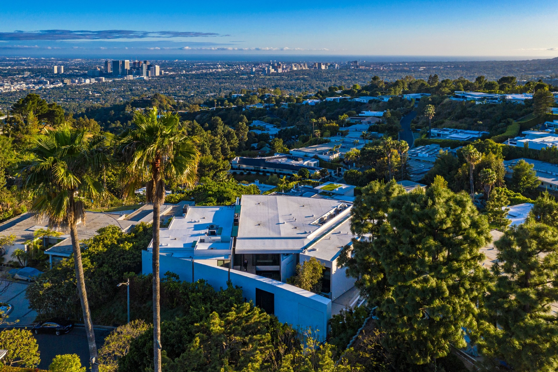 Famed for its significant architectural homes, prestigious Trousdale Estates now houses the first ever, expertly crafted spec residence by renowned architect Mark Rios, FAIA. Rios paid homage to the Mid-Century master, Hal Levitt, by recreating his signature large-scale entrance door with protected courtyard and his masterful craft of blurring interior/exterior boundaries. Enter past the lush courtyard and into this glass-walled modern masterpiece. A dramatic two-story entry with cascading water feature spills into the exterior reflecting pool below. This theatricality composed, 6 bedroom, 11 bathroom, 12,456sf home offers lavish living, elegant proportions, sophisticated finishes and a luxurious palate of rare and exotic stone, wood, marble and glass. Beyond the oversized, automatic pocket glass doors, the unrivaled interiors are only further complimented by the unobstructed panoramic city to ocean views, impeccable exterior rear landscaping (by Mark Rios & RCH Studios) and architecturally designed pool/spa. Interiors masterfully styled by Dusenbury Design, include a sleek, yet inviting open living and dining room with a showcase Sahar Noir floating marble fireplace and full-length skylight. The adjoining family room with chef’s kitchen transforms into a graciously blurred indoor-outdoor living space extending to the terrace and pool deck. The epicurean kitchen boasts top-of-the-line Miele appliances, Italian cabinetry, breakfast area and a butler’s kitchen/pantry. The sumptuous 1,600sf master wing pampers every indulgence with private courtyard views, grand marble dual bathrooms with separate closets/dressing areas, an office and a view terrace. 3 additional generous bedroom suites complete the level. Floating stairs descend into the lower level entertainment lounge featuring a swanky marble clad bar with adjoining outfitted screening room and an 825-bottle wine cellar. Additional amenities include: an elevator, gym, beauty salon, massage room, steam shower, staff quarters, subterranean 2100sf garage, Savant Smart Home automation system, outdoor kitchen, bar and dining/lounge areas. This Beverly Hills masterpiece is the ultimate aspiration for a discerning, sophisticate who values sensational architecture, a well-appointed location and covetable views.