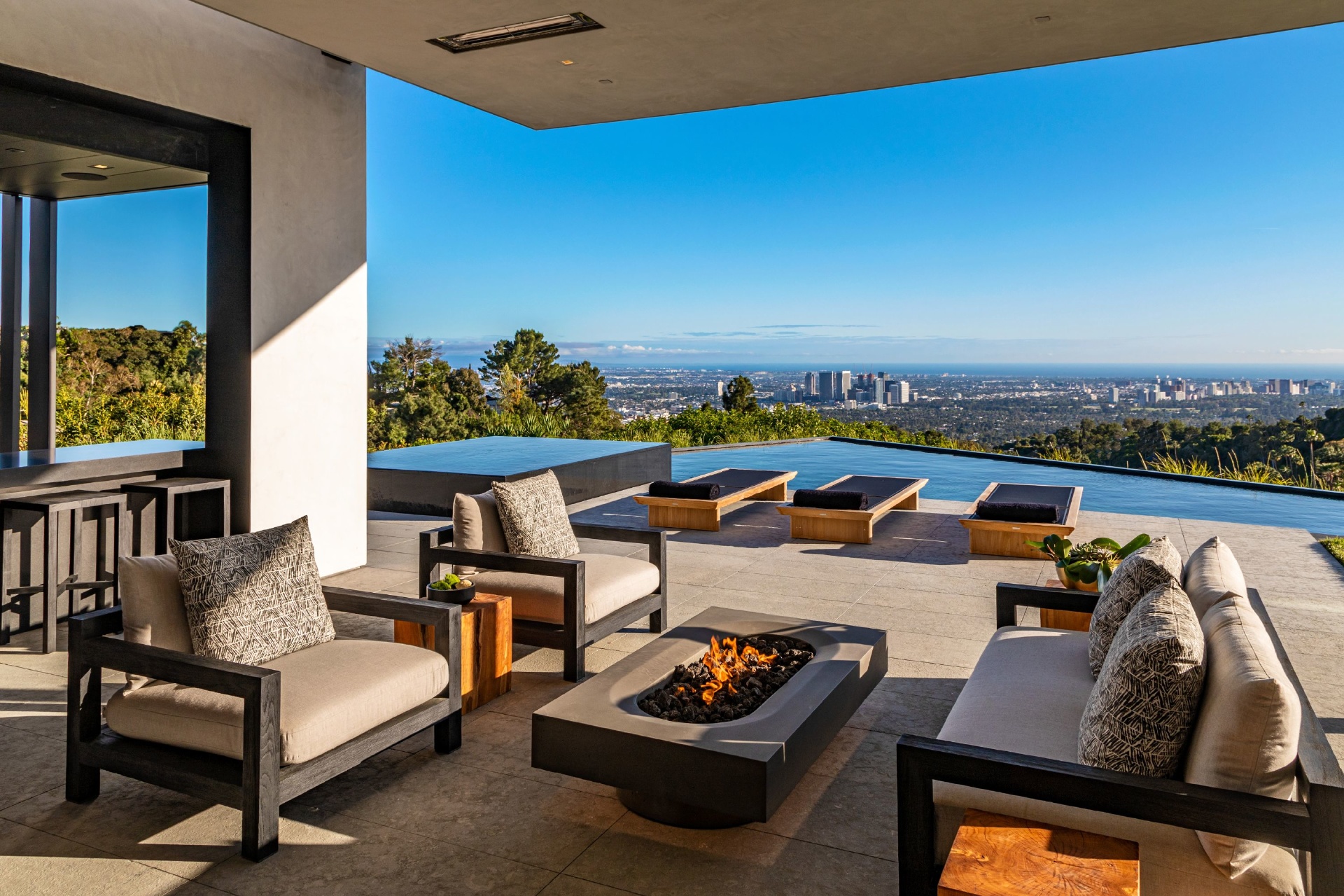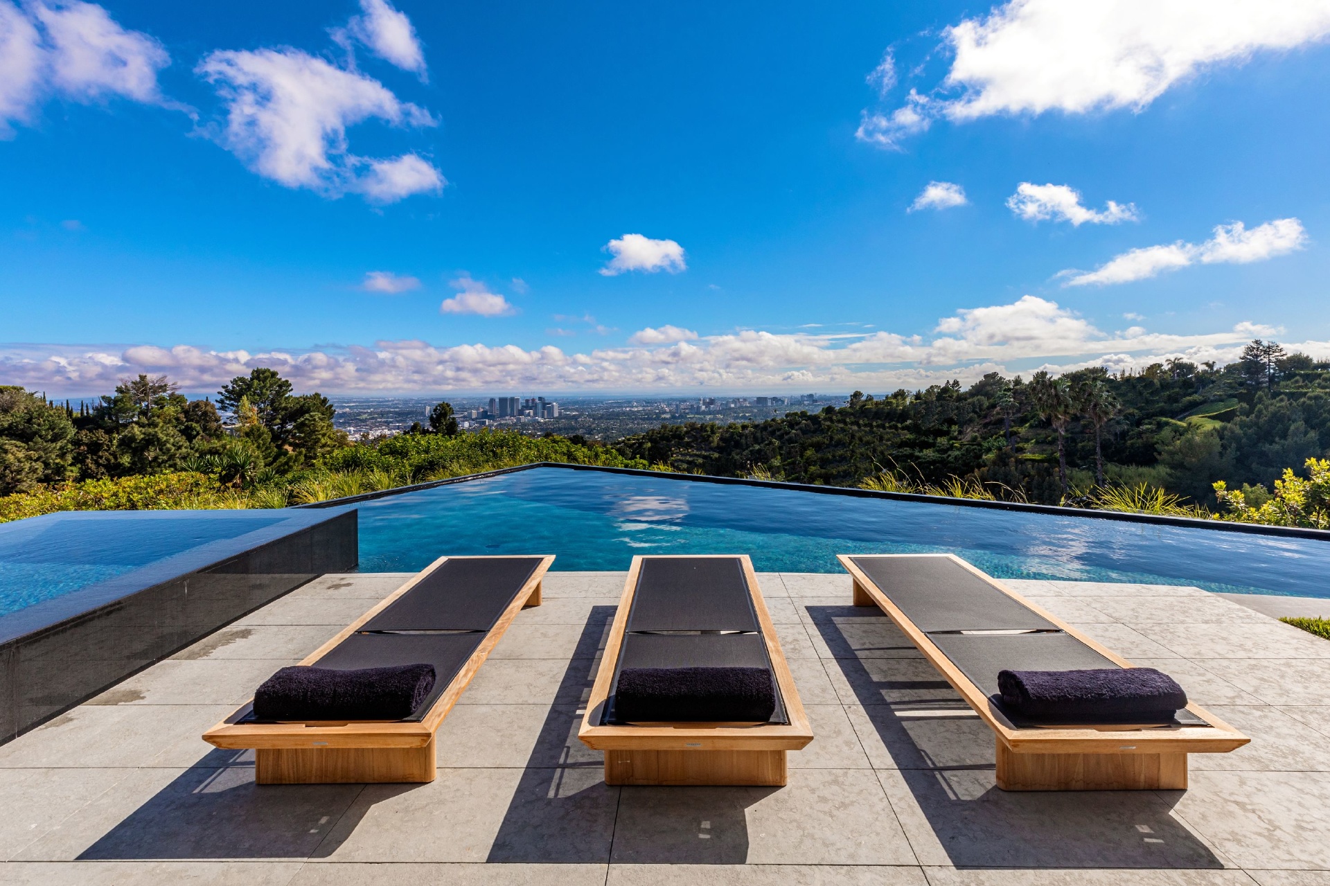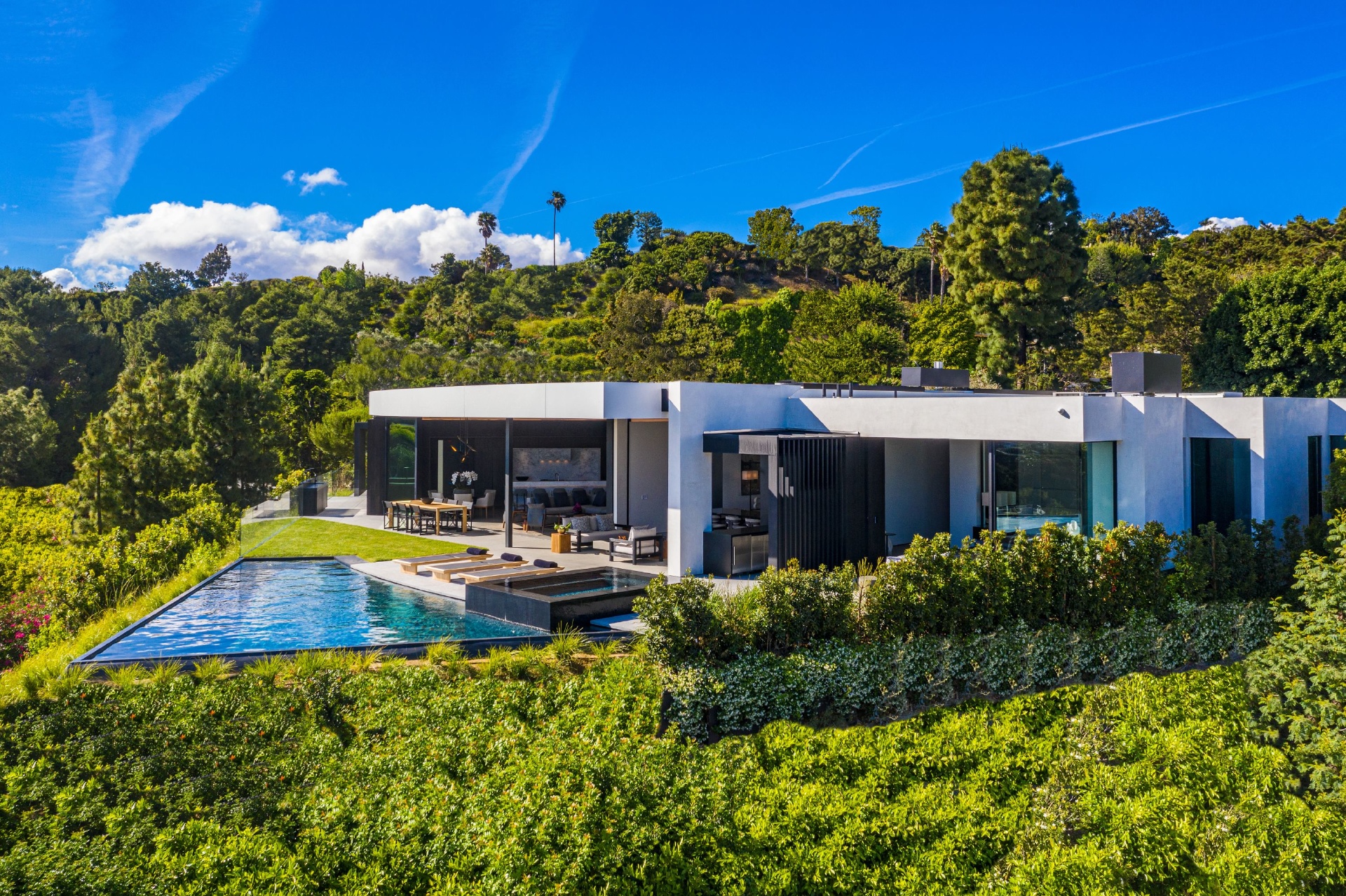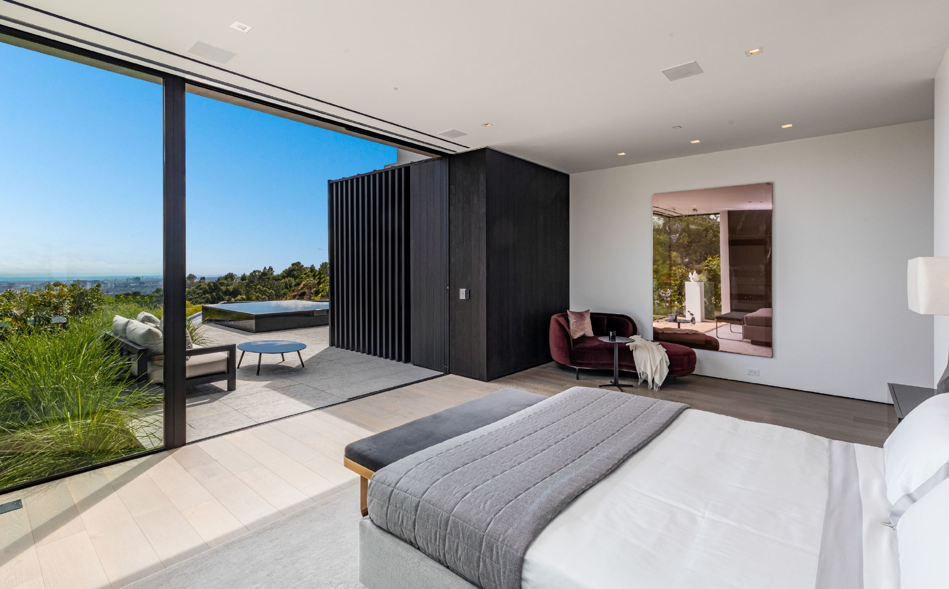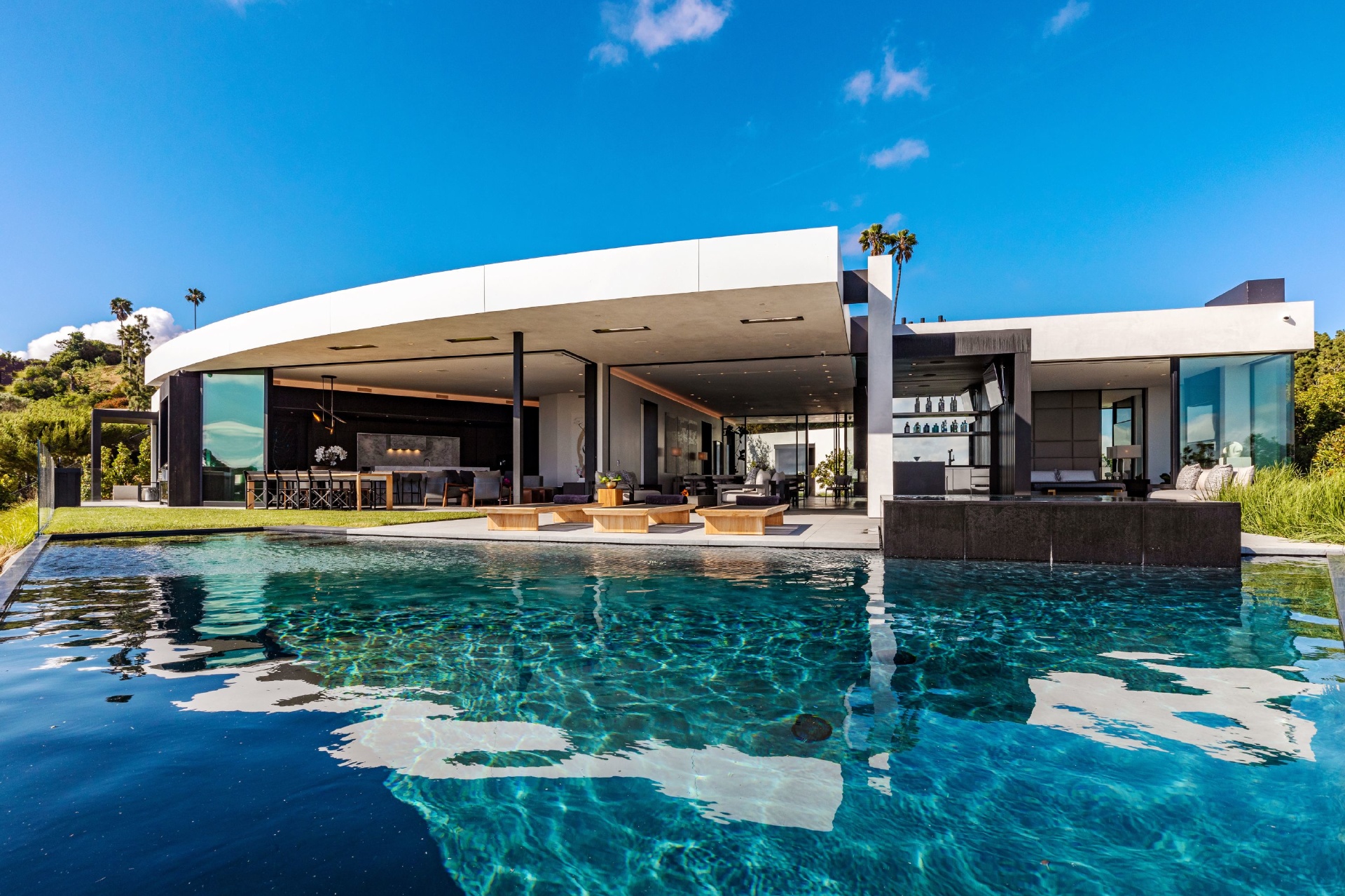 Famed for its significant architectural homes, prestigious Trousdale Estates now houses the first ever, expertly crafted spec residence by renowned architect Mark Rios, FAIA. Rios paid homage to the Mid-Century master, Hal Levitt, by recreating his signature large-scale entrance door with protected courtyard and his masterful craft of blurring interior/exterior boundaries. Enter past the lush courtyard and into this glass-walled modern masterpiece. A dramatic two-story entry with cascading water feature spills into the exterior reflecting pool below. This theatricality composed, 6 bedroom, 11 bathroom, 12,456sf home offers lavish living, elegant proportions, sophisticated finishes and a luxurious palate of rare and exotic stone, wood, marble and glass. Beyond the oversized, automatic pocket glass doors, the unrivaled interiors are only further complimented by the unobstructed panoramic city to ocean views, impeccable exterior rear landscaping (by Mark Rios & RCH Studios) and architecturally designed pool/spa. Interiors masterfully styled by Dusenbury Design, include a sleek, yet inviting open living and dining room with a showcase Sahar Noir floating marble fireplace and full-length skylight. The adjoining family room with chef’s kitchen transforms into a graciously blurred indoor-outdoor living space extending to the terrace and pool deck. The epicurean kitchen boasts top-of-the-line Miele appliances, Italian cabinetry, breakfast area and a butler’s kitchen/pantry. The sumptuous 1,600sf master wing pampers every indulgence with private courtyard views, grand marble dual bathrooms with separate closets/dressing areas, an office and a view terrace. 3 additional generous bedroom suites complete the level. Floating stairs descend into the lower level entertainment lounge featuring a swanky marble clad bar with adjoining outfitted screening room and an 825-bottle wine cellar. Additional amenities include: an elevator, gym, beauty salon, massage room, steam shower, staff quarters, subterranean 2100sf garage, Savant Smart Home automation system, outdoor kitchen, bar and dining/lounge areas. This Beverly Hills masterpiece is the ultimate aspiration for a discerning, sophisticate who values sensational architecture, a well-appointed location and covetable views.