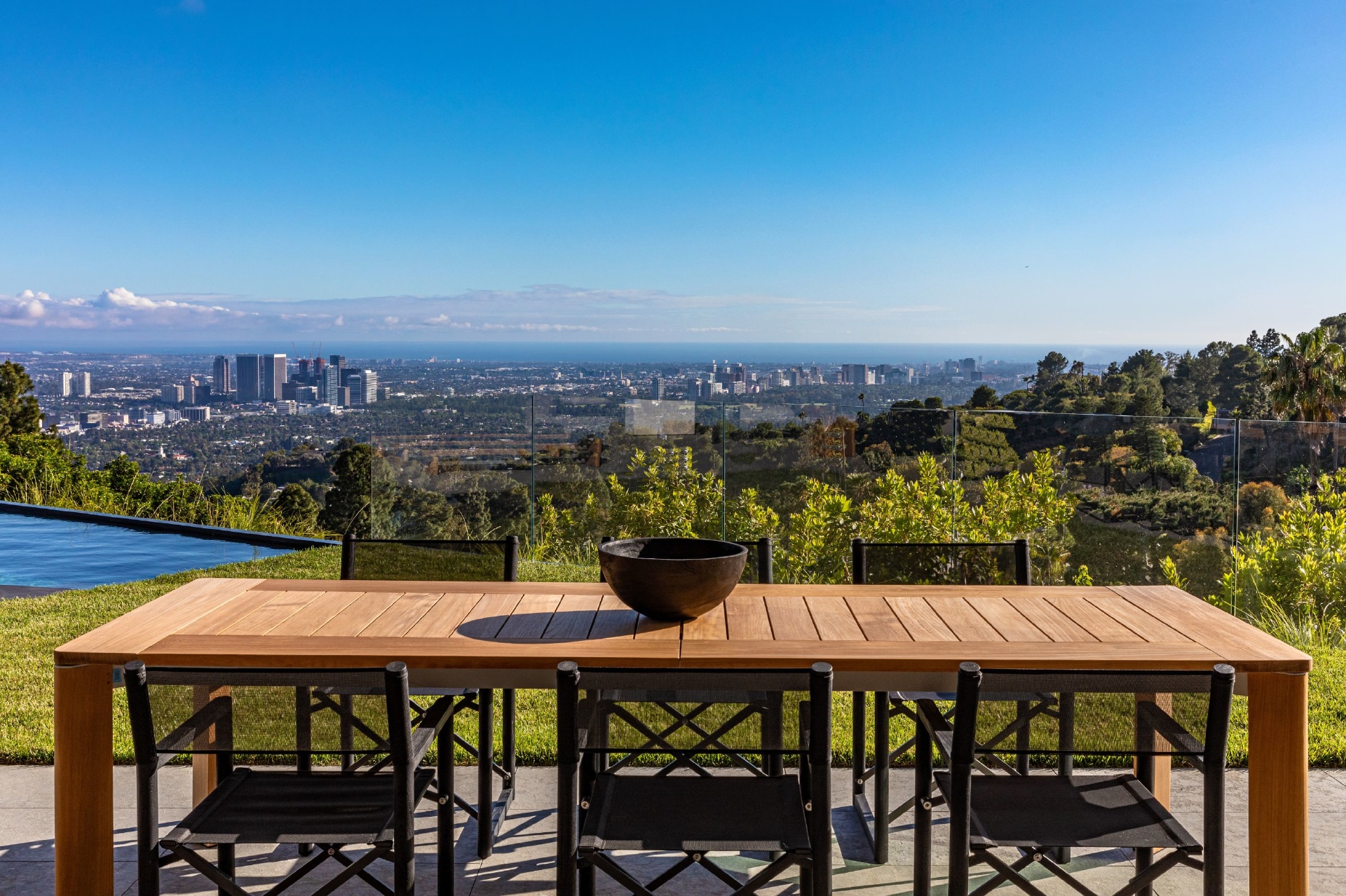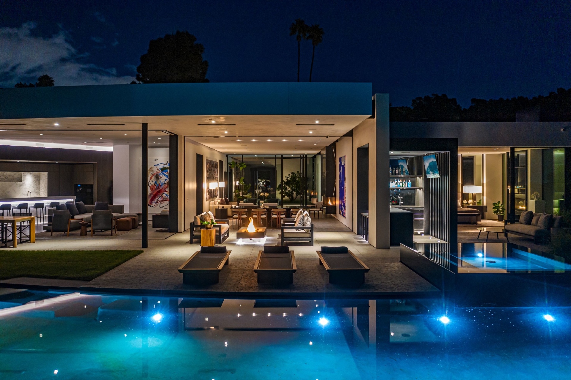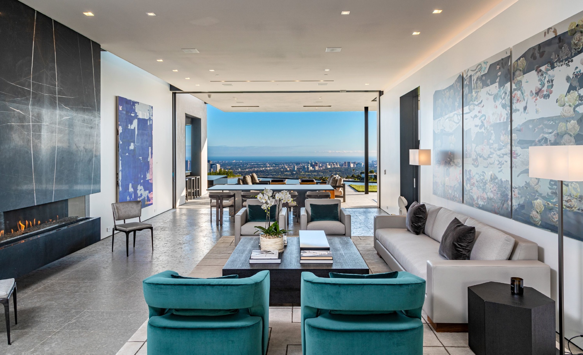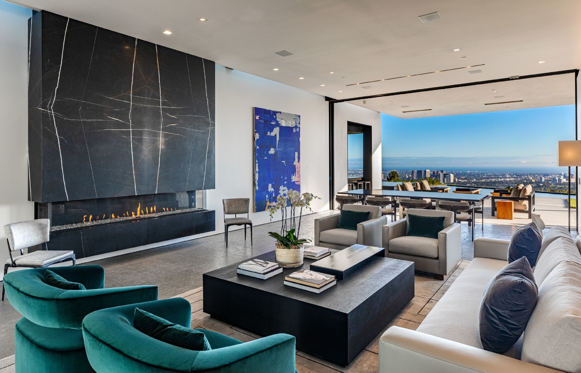Famed for its significant architectural homes, prestigious Trousdale Estates now houses the first ever, expertly crafted spec residence by renowned architect Mark Rios, FAIA. Rios paid homage to the Mid-Century master, Hal Levitt, by recreating his signature large-scale entrance door with protected courtyard and his masterful craft of blurring interior/exterior boundaries. Enter past the lush courtyard and into this glass-walled modern masterpiece. A dramatic two-story entry with cascading water feature spills into the exterior reflecting pool below. This theatricality composed, 6 bedroom, 11 bathroom, 12,456sf home offers lavish living, elegant proportions, sophisticated finishes and a luxurious palate of rare and exotic stone, wood, marble and glass. Beyond the oversized, automatic pocket glass doors, the unrivaled interiors are only further complimented by the unobstructed panoramic city to ocean views, impeccable exterior rear landscaping (by Mark Rios & RCH Studios) and architecturally designed pool/spa. Interiors masterfully styled by Dusenbury Design, include a sleek, yet inviting open living and dining room with a showcase Sahar Noir floating marble fireplace and full-length skylight. The adjoining family room with chef’s kitchen transforms into a graciously blurred indoor-outdoor living space extending to the terrace and pool deck. The epicurean kitchen boasts top-of-the-line Miele appliances, Italian cabinetry, breakfast area and a butler’s kitchen/pantry. The sumptuous 1,600sf master wing pampers every indulgence with private courtyard views, grand marble dual bathrooms with separate closets/dressing areas, an office and a view terrace. 3 additional generous bedroom suites complete the level. Floating stairs descend into the lower level entertainment lounge featuring a swanky marble clad bar with adjoining outfitted screening room and an 825-bottle wine cellar. Additional amenities include: an elevator, gym, beauty salon, massage room, steam shower, staff quarters, subterranean 2100sf garage, Savant Smart Home automation system, outdoor kitchen, bar and dining/lounge areas. This Beverly Hills masterpiece is the ultimate aspiration for a discerning, sophisticate who values sensational architecture, a well-appointed location and covetable views.