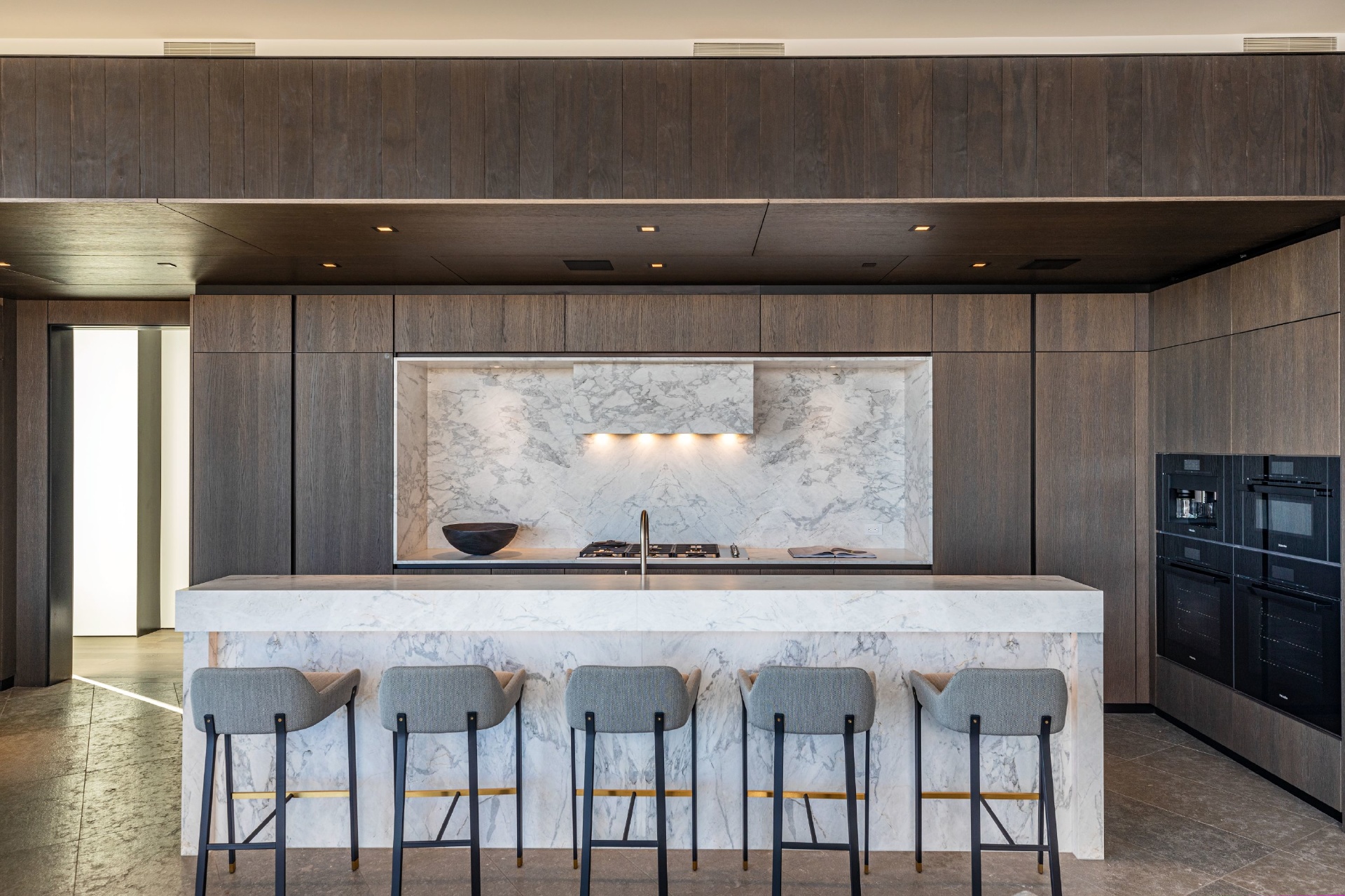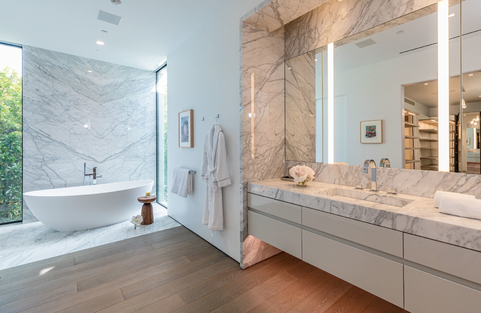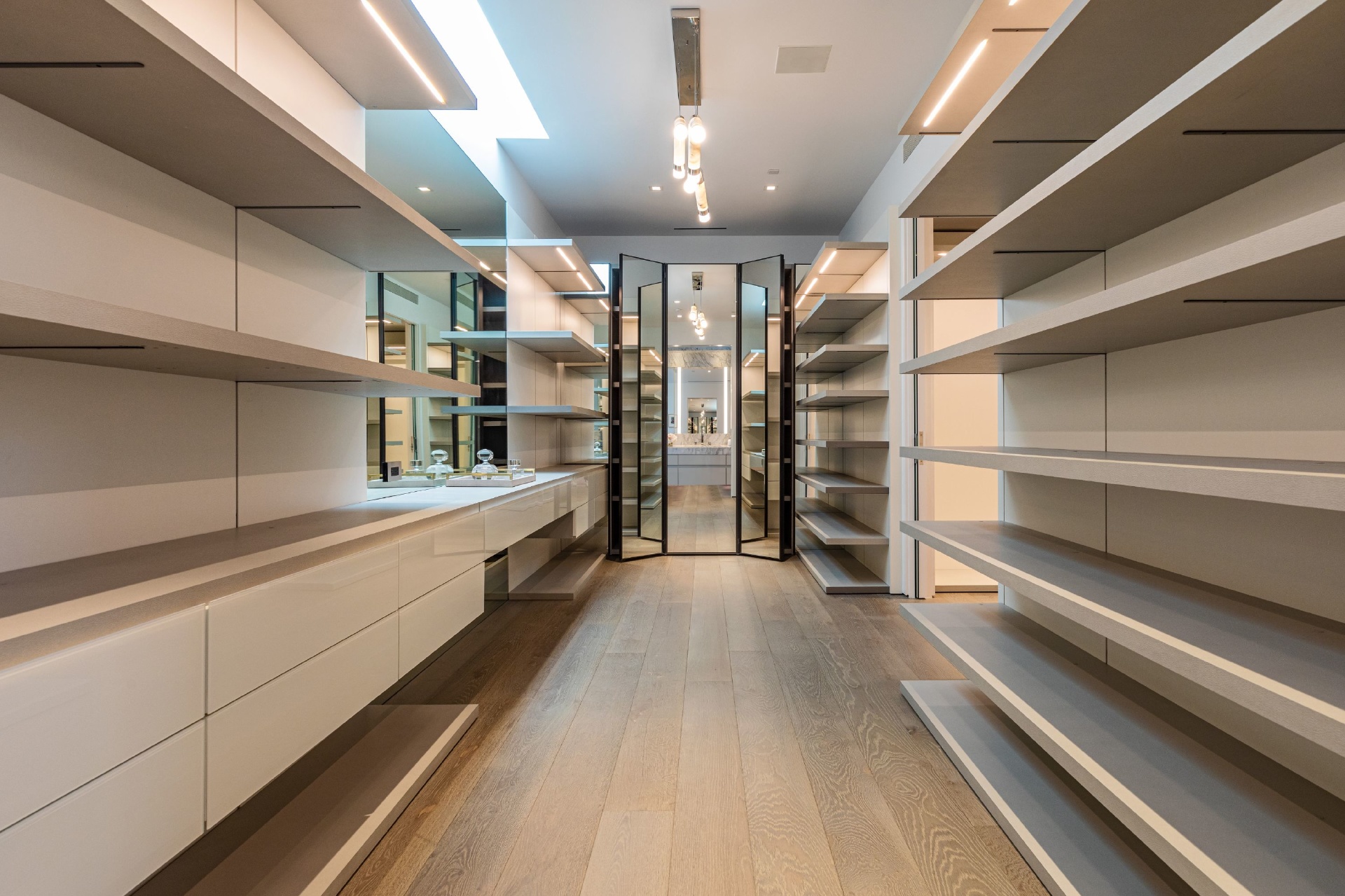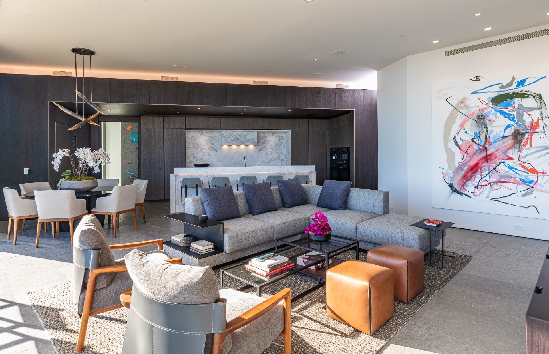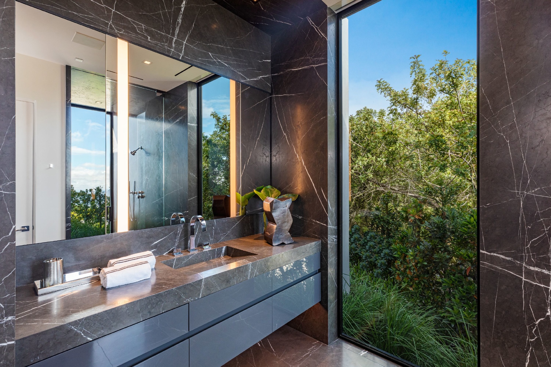 Famed for its significant architectural homes, prestigious Trousdale Estates now houses the first ever, expertly crafted spec residence by renowned architect Mark Rios, FAIA. Rios paid homage to the Mid-Century master, Hal Levitt, by recreating his signature large-scale entrance door with protected courtyard and his masterful craft of blurring interior/exterior boundaries. Enter past the lush courtyard and into this glass-walled modern masterpiece. A dramatic two-story entry with cascading water feature spills into the exterior reflecting pool below. This theatricality composed, 6 bedroom, 11 bathroom, 12,456sf home offers lavish living, elegant proportions, sophisticated finishes and a luxurious palate of rare and exotic stone, wood, marble and glass. Beyond the oversized, automatic pocket glass doors, the unrivaled interiors are only further complimented by the unobstructed panoramic city to ocean views, impeccable exterior rear landscaping (by Mark Rios & RCH Studios) and architecturally designed pool/spa. Interiors masterfully styled by Dusenbury Design, include a sleek, yet inviting open living and dining room with a showcase Sahar Noir floating marble fireplace and full-length skylight. The adjoining family room with chef’s kitchen transforms into a graciously blurred indoor-outdoor living space extending to the terrace and pool deck. The epicurean kitchen boasts top-of-the-line Miele appliances, Italian cabinetry, breakfast area and a butler’s kitchen/pantry. The sumptuous 1,600sf master wing pampers every indulgence with private courtyard views, grand marble dual bathrooms with separate closets/dressing areas, an office and a view terrace. 3 additional generous bedroom suites complete the level. Floating stairs descend into the lower level entertainment lounge featuring a swanky marble clad bar with adjoining outfitted screening room and an 825-bottle wine cellar. Additional amenities include: an elevator, gym, beauty salon, massage room, steam shower, staff quarters, subterranean 2100sf garage, Savant Smart Home automation system, outdoor kitchen, bar and dining/lounge areas. This Beverly Hills masterpiece is the ultimate aspiration for a discerning, sophisticate who values sensational architecture, a well-appointed location and covetable views.