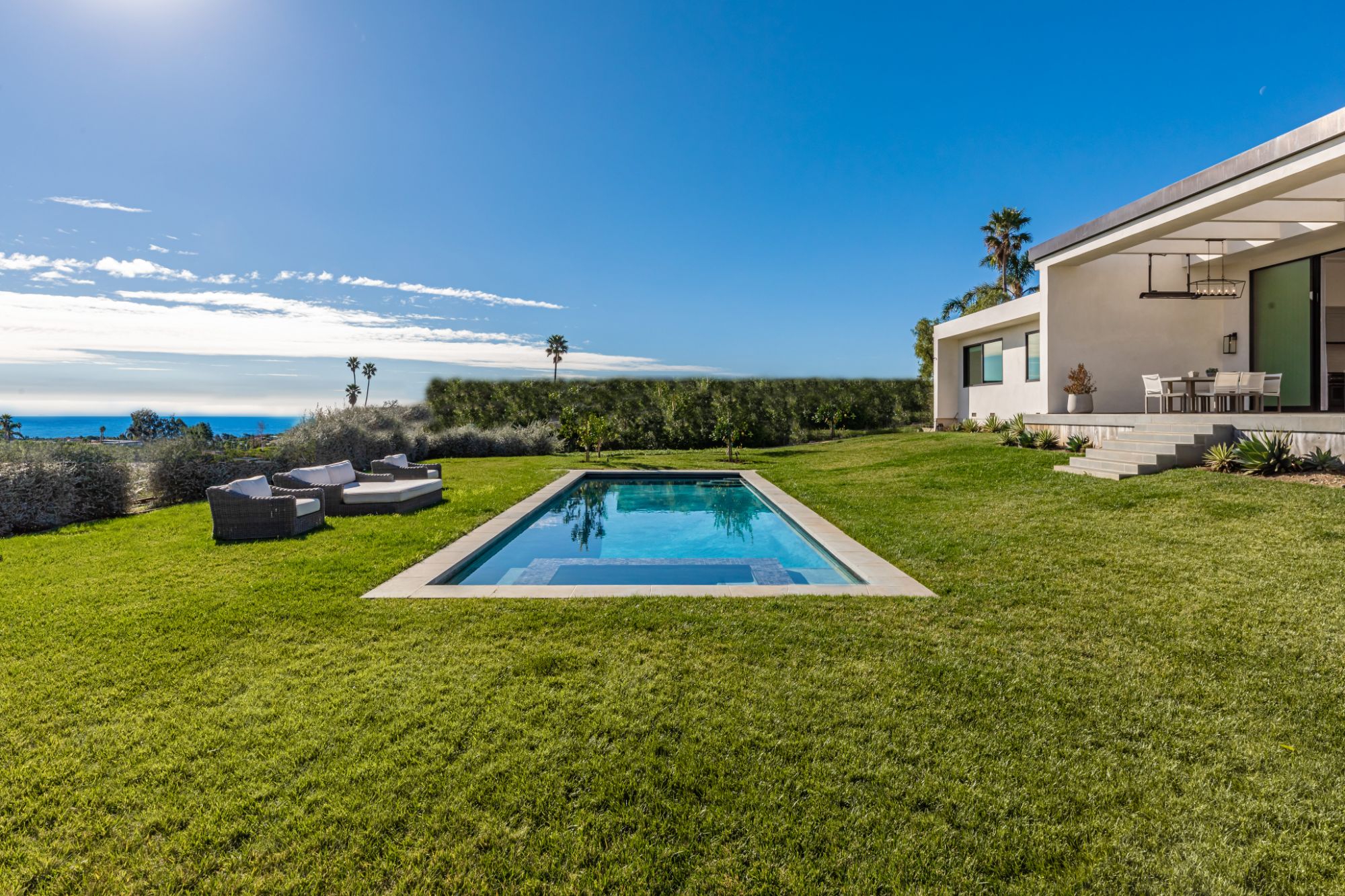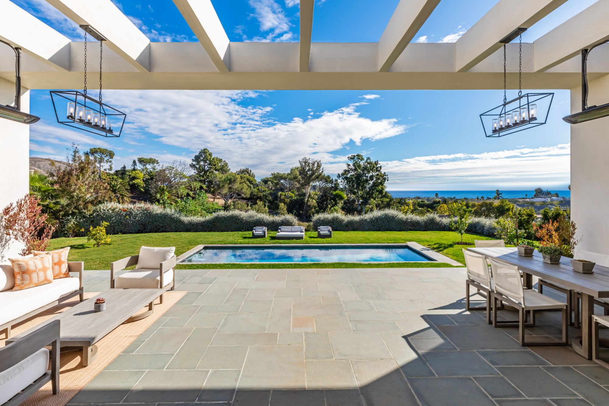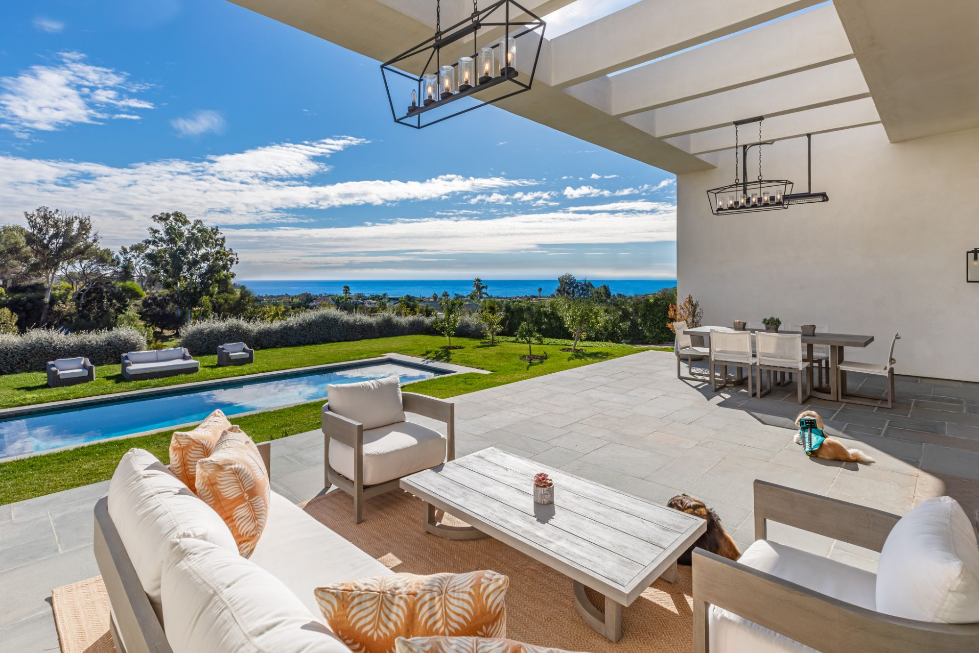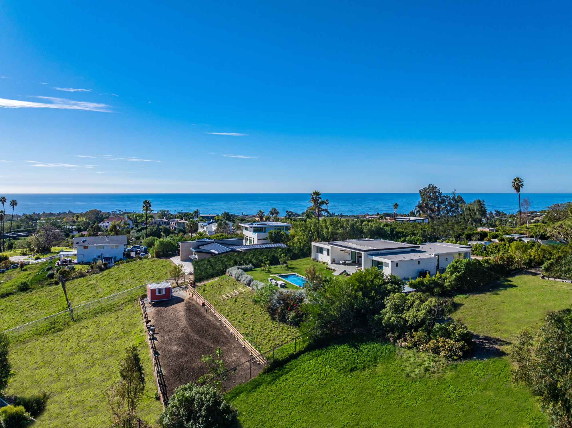 Just completed modern Malibu oasis on over an acre lot with an impeccable floor plan, lush grounds, huge grassy backyard, and views of mountains and the Pacific Ocean. Warm contemporary design with beautiful finishes throughout. This spacious home offers 5 BD, 5BA, and a game room. The living and dining rooms seamlessly blend with the kitchen and have gorgeous natural lighting from floor-to-ceiling sliding glass doors that open for indoor/outdoor living. The patio space has built-in heaters and is perfect for dining al fresco. Additional amenities include a mini ranch, citrus garden, swimming pool with spa, and outdoor space for a sport court. 2-car garage with large, gated driveway for additional parking. This exclusive enclave in prime Malibu Park offers the best hiking and horseback riding in the country. Live minutes from Big Dume State Park and beach and one of the best sandy beaches in all of Southern California, Zuma Beach. Enjoy shopping and dining at the nearby Point Dume Village. This is an incredible Malibu estate, where every day feels like you're on vacation.