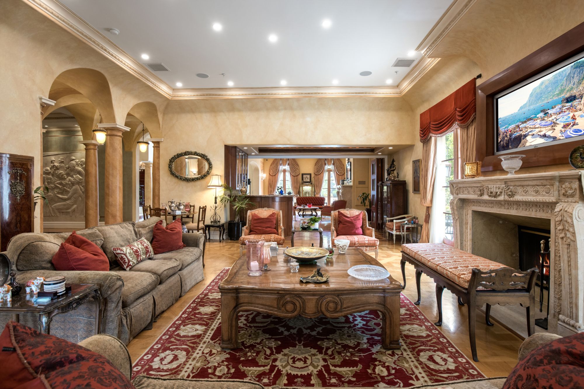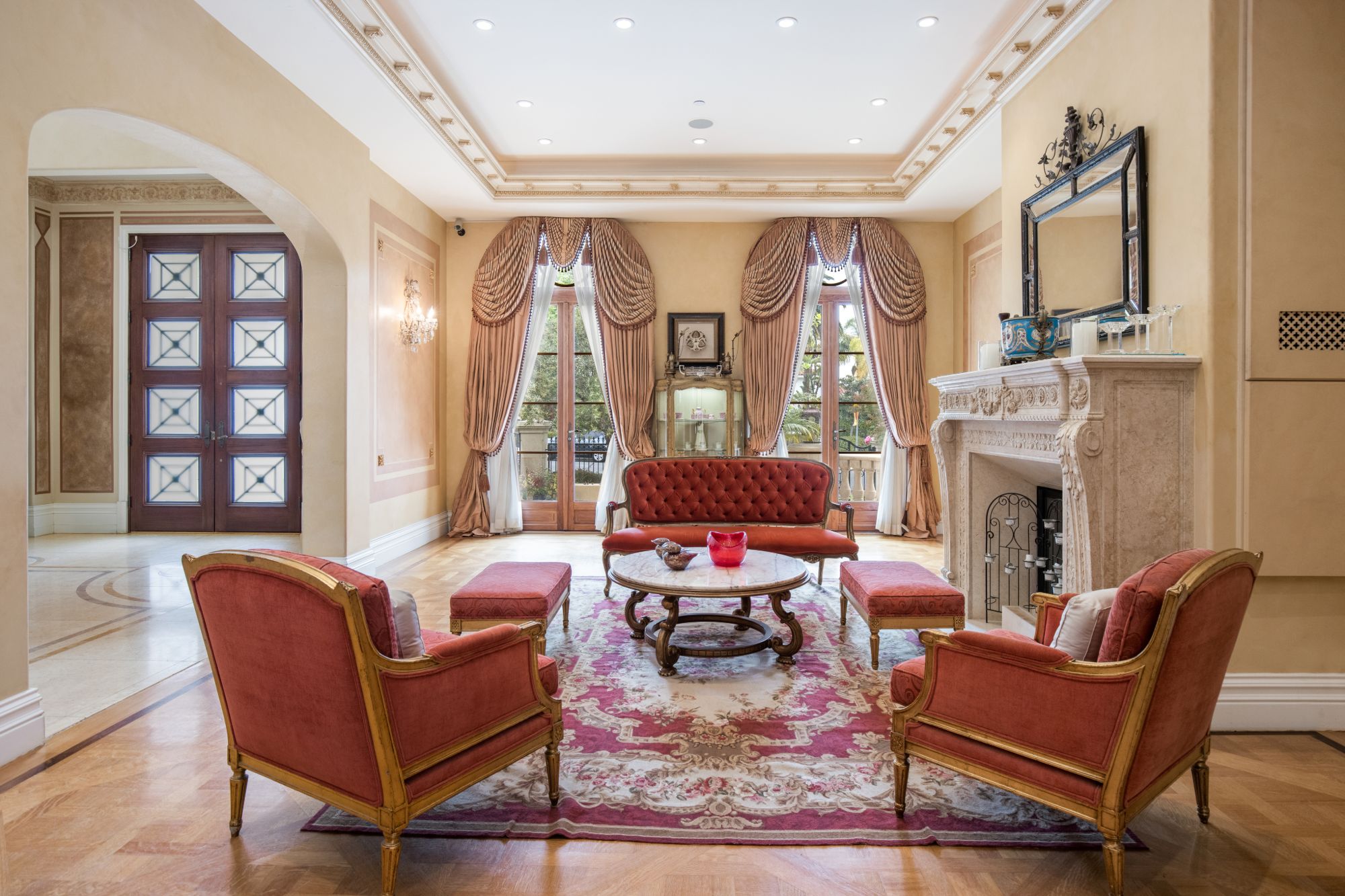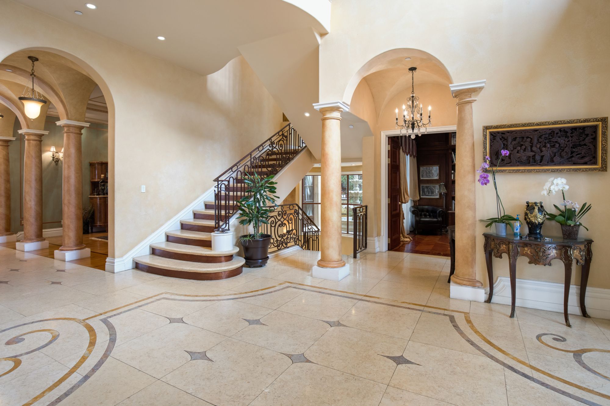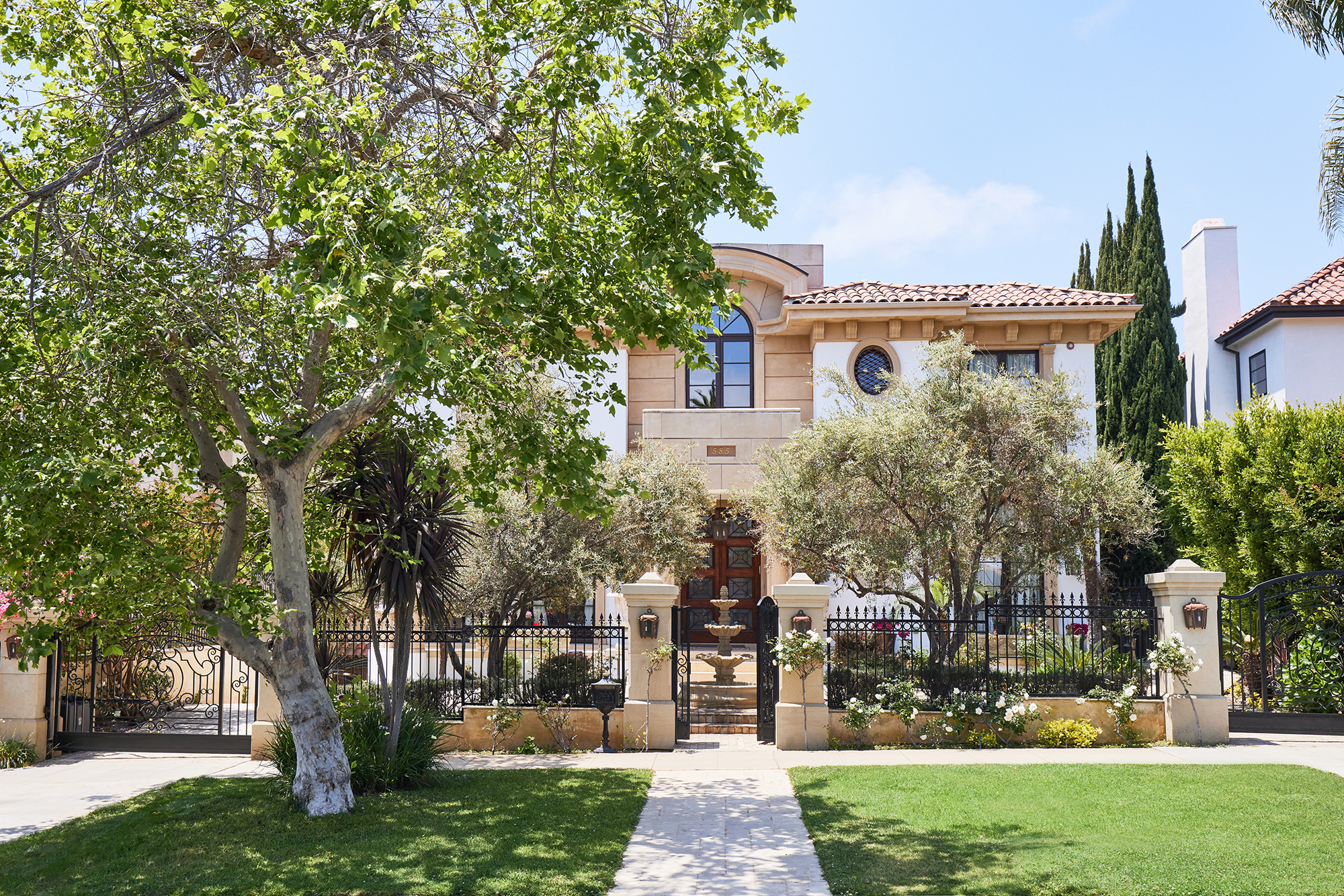 This majestic Mediterranean villa is an exemplary designer home with unparalleled elegance, grandeur, privacy, & craftsmanship in Brentwood’s most prominent neighborhood directly facing the Brentwood Country Club & minutes from the Brentwood Country Mart. Designed by famed French architect Robert Salice, this 10900-SF residence w/ luxurious entertainment features is set behind iron-wrought gates, & lush hedging. Entering a French Mahogany door, a stunning foyer sets the tone for its scale & extravagance w/ soaring coffered ceilings, gilded embellishments & grand archways; sensational double height sandstone murals hand-carved in China flank the living room entrance & adorn the formal dining room. Voluminous living & family rooms served by a lavish curved bar. An exquisite kitchen w/ Italian marble countertop adjoined by a breakfast room. Solid cherrywood doors throughout open onto outdoor entertaining areas featuring a veranda w/ a fire pit, vast lawn, gazebo, & heated saltwater pool w/ virtuoso tile-works. 2nd floor w/ golf course views features a lavish primary suite w/ a beautiful sitting room, balcony overlooking the pool, & partners’ bathrooms w/ steam showers & tub. A media/game room, wine cellar, library, & elevator complete its 5-star amenities. A one-of-a-kind showpiece that adds prestige to an exclusive community of the most discerning elite.