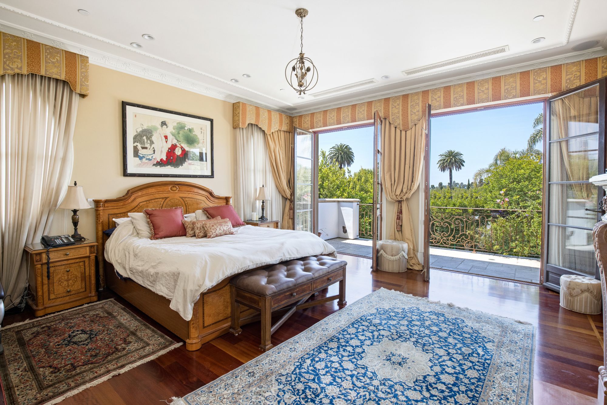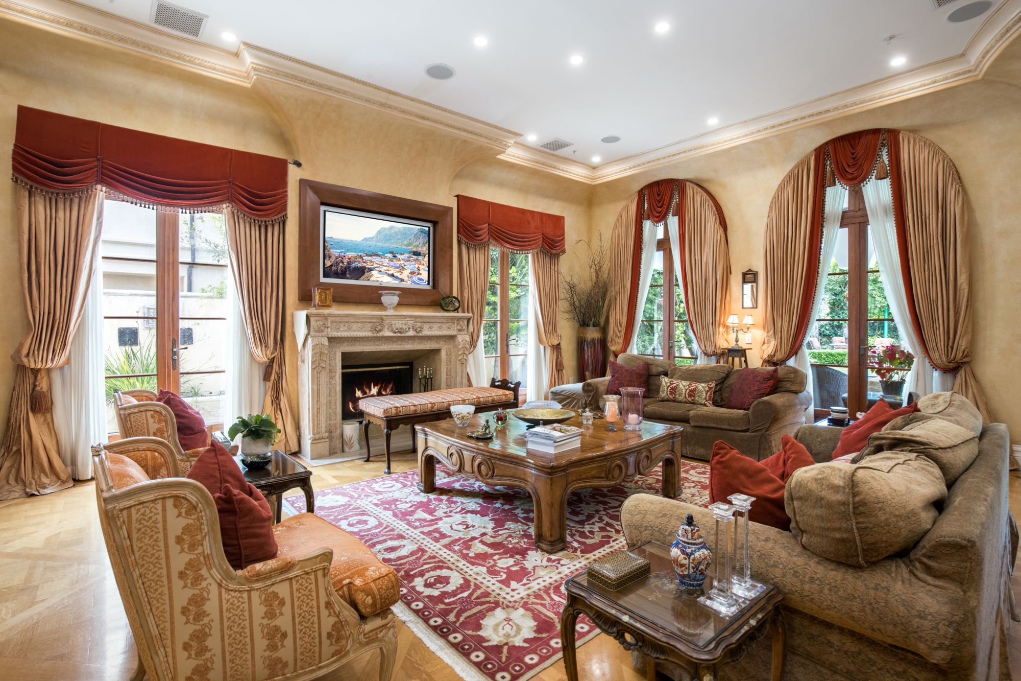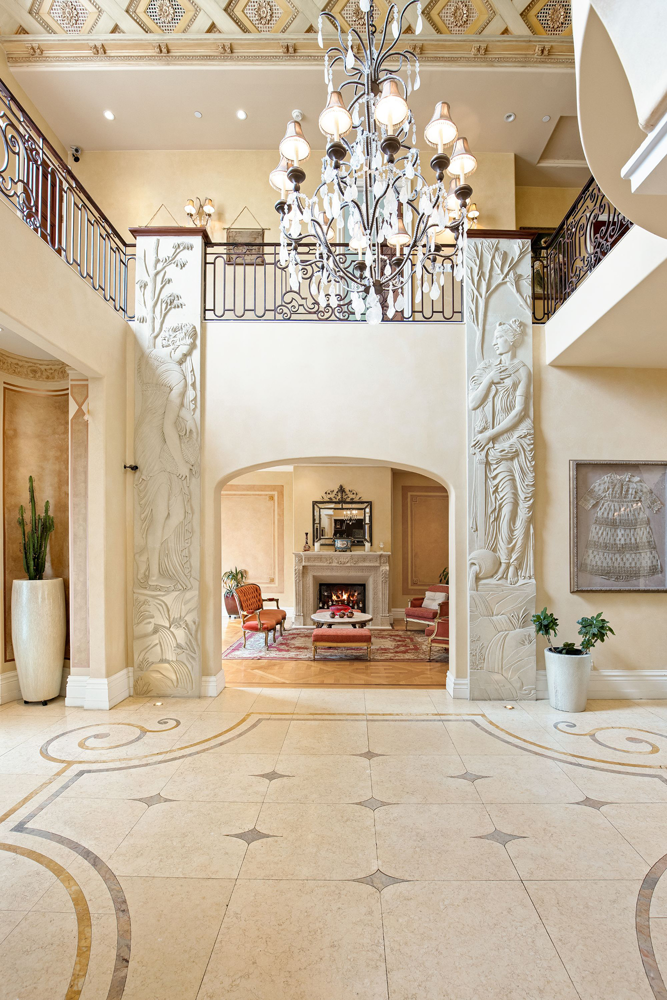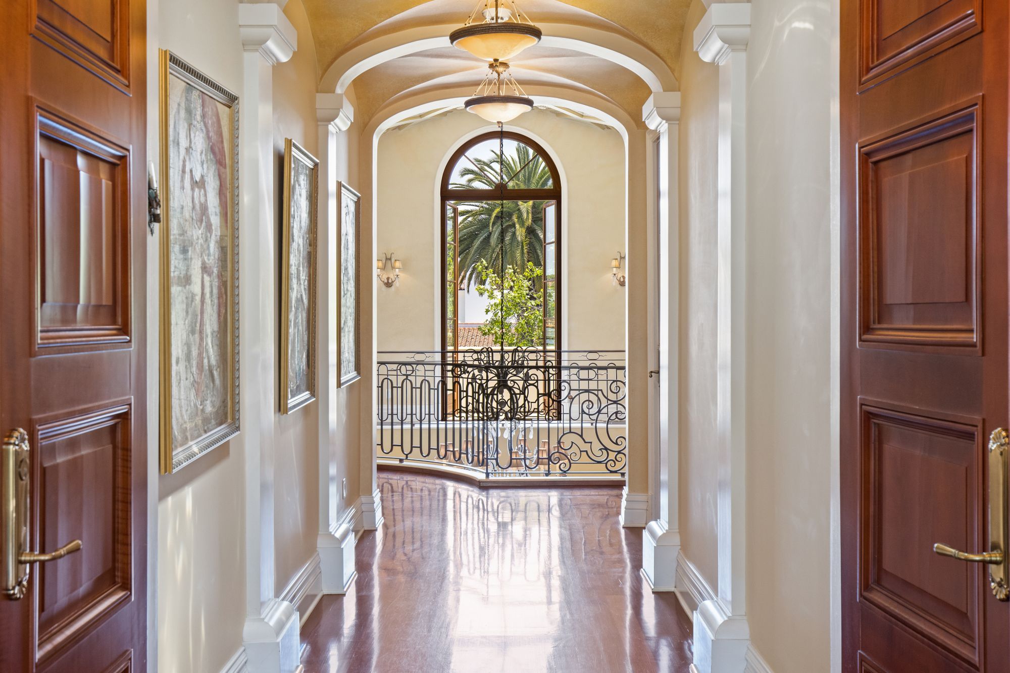 This majestic Mediterranean villa is an exemplary designer home with unparalleled elegance, grandeur, privacy, & craftsmanship in Brentwood’s most prominent neighborhood directly facing the Brentwood Country Club & minutes from the Brentwood Country Mart. Designed by famed French architect Robert Salice, this 10900-SF residence w/ luxurious entertainment features is set behind iron-wrought gates, & lush hedging. Entering a French Mahogany door, a stunning foyer sets the tone for its scale & extravagance w/ soaring coffered ceilings, gilded embellishments & grand archways; sensational double height sandstone murals hand-carved in China flank the living room entrance & adorn the formal dining room. Voluminous living & family rooms served by a lavish curved bar. An exquisite kitchen w/ Italian marble countertop adjoined by a breakfast room. Solid cherrywood doors throughout open onto outdoor entertaining areas featuring a veranda w/ a fire pit, vast lawn, gazebo, & heated saltwater pool w/ virtuoso tile-works. 2nd floor w/ golf course views features a lavish primary suite w/ a beautiful sitting room, balcony overlooking the pool, & partners’ bathrooms w/ steam showers & tub. A media/game room, wine cellar, library, & elevator complete its 5-star amenities. A one-of-a-kind showpiece that adds prestige to an exclusive community of the most discerning elite.