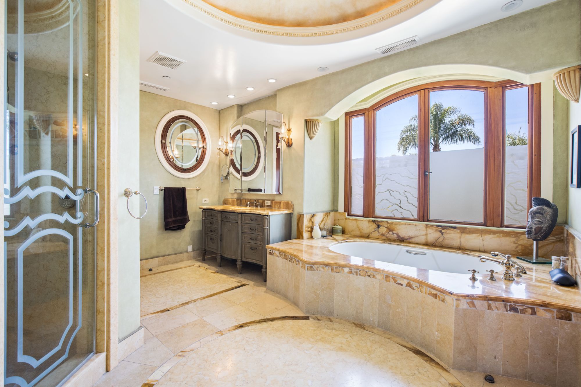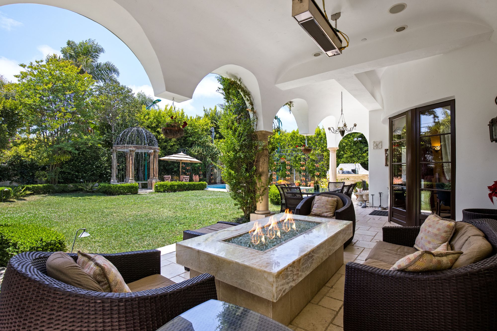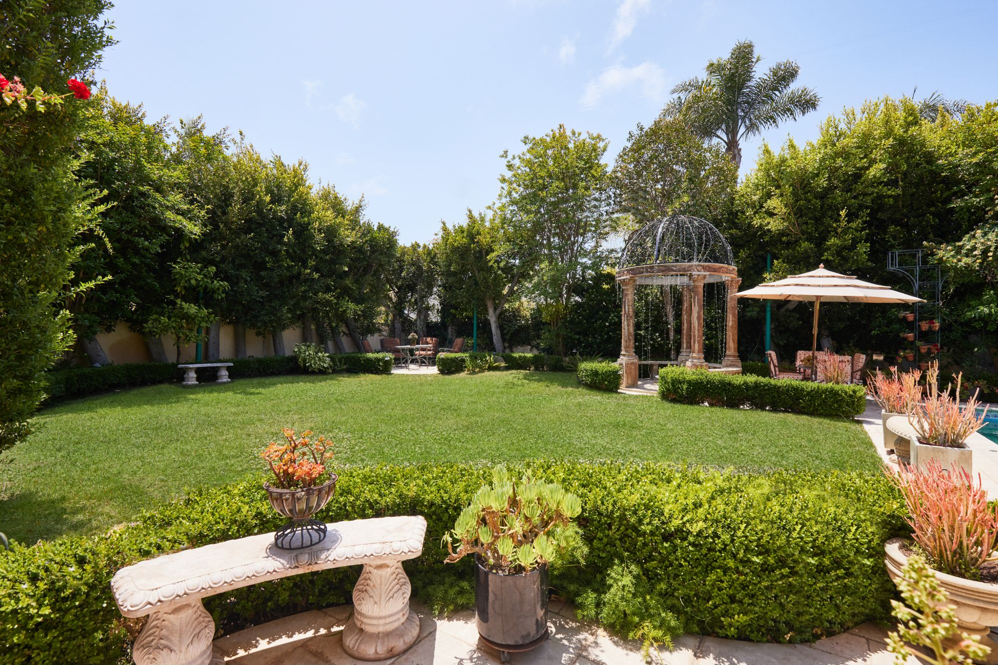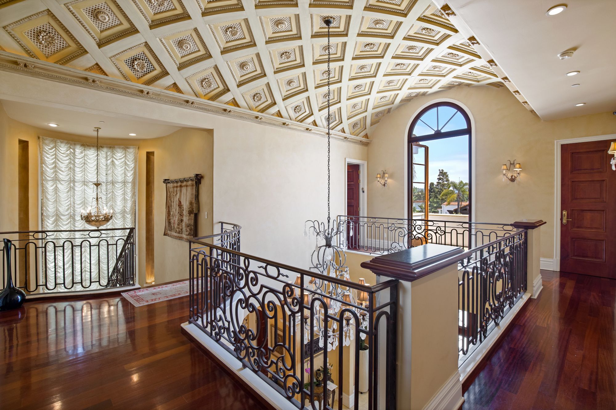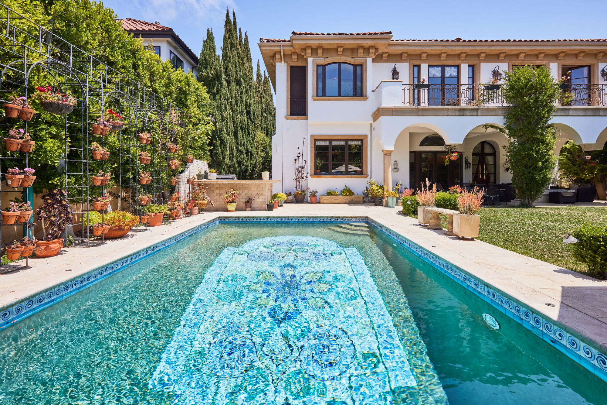 This majestic Mediterranean villa is an exemplary designer home with unparalleled elegance, grandeur, privacy, & craftsmanship in Brentwood’s most prominent neighborhood directly facing the Brentwood Country Club & minutes from the Brentwood Country Mart. Designed by famed French architect Robert Salice, this 10900-SF residence w/ luxurious entertainment features is set behind iron-wrought gates, & lush hedging. Entering a French Mahogany door, a stunning foyer sets the tone for its scale & extravagance w/ soaring coffered ceilings, gilded embellishments & grand archways; sensational double height sandstone murals hand-carved in China flank the living room entrance & adorn the formal dining room. Voluminous living & family rooms served by a lavish curved bar. An exquisite kitchen w/ Italian marble countertop adjoined by a breakfast room. Solid cherrywood doors throughout open onto outdoor entertaining areas featuring a veranda w/ a fire pit, vast lawn, gazebo, & heated saltwater pool w/ virtuoso tile-works. 2nd floor w/ golf course views features a lavish primary suite w/ a beautiful sitting room, balcony overlooking the pool, & partners’ bathrooms w/ steam showers & tub. A media/game room, wine cellar, library, & elevator complete its 5-star amenities. A one-of-a-kind showpiece that adds prestige to an exclusive community of the most discerning elite.