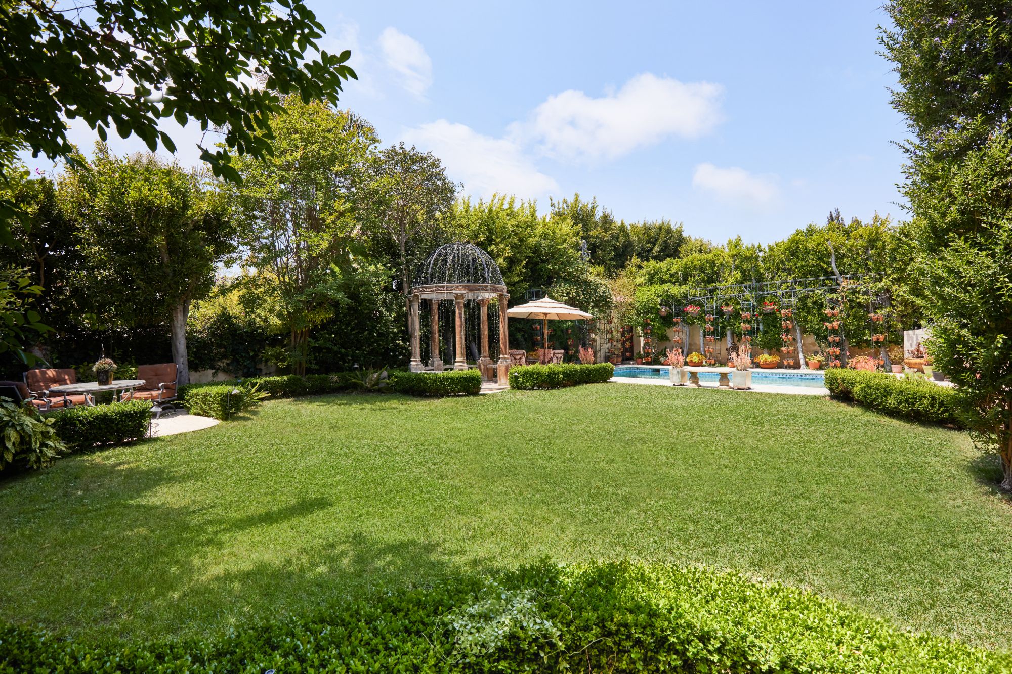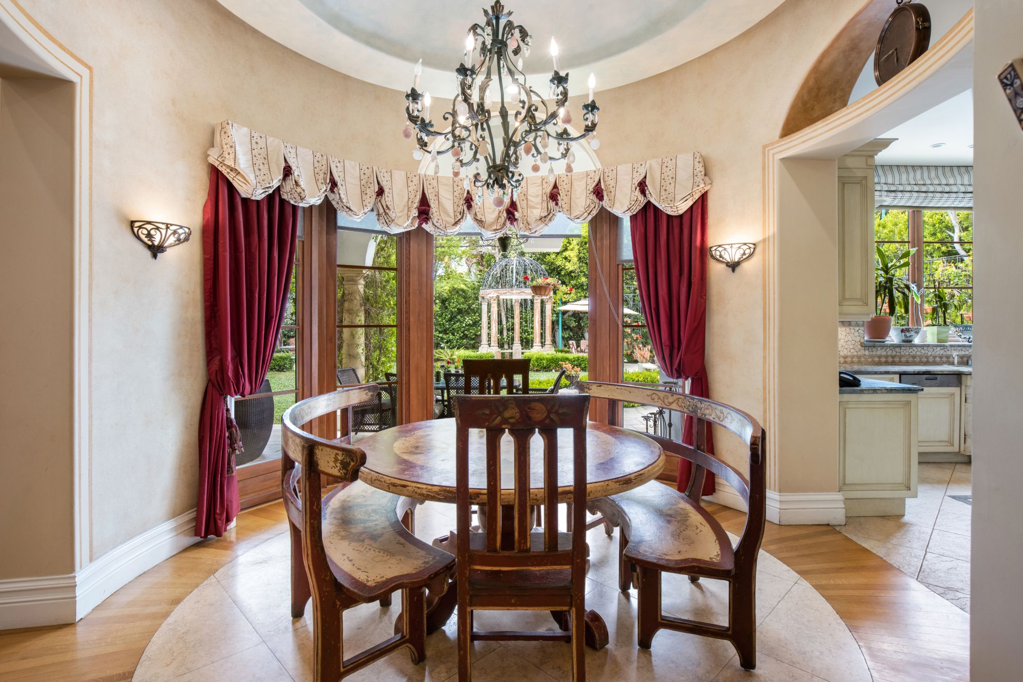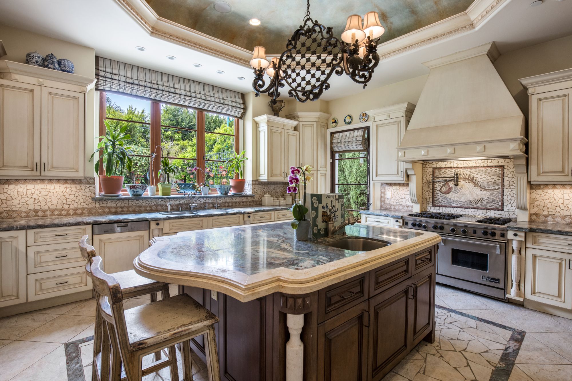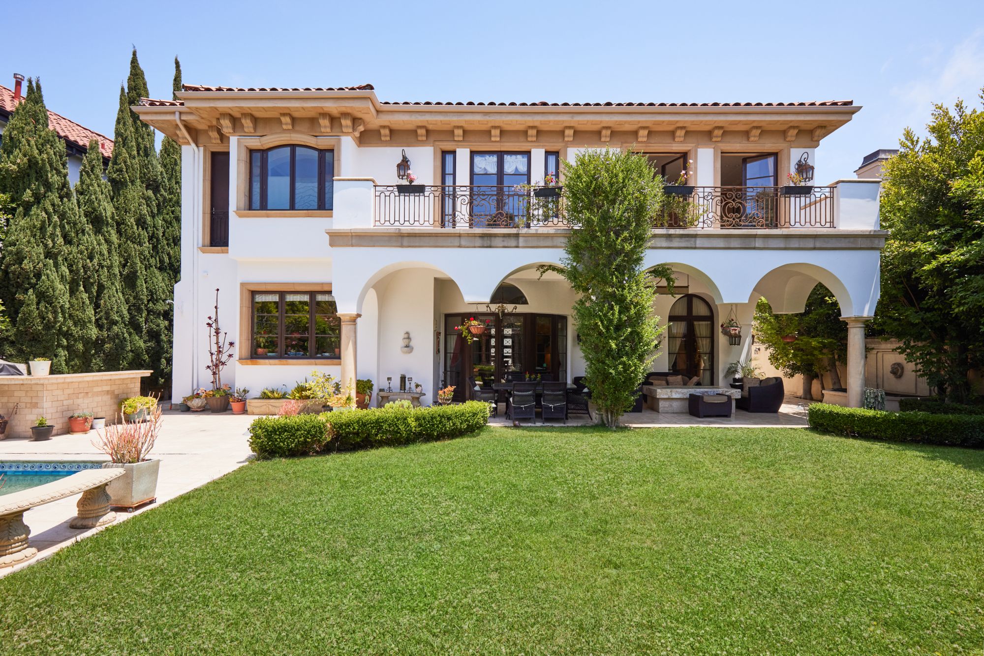 This majestic Mediterranean villa is an exemplary designer home with unparalleled elegance, grandeur, privacy, & craftsmanship in Brentwood’s most prominent neighborhood directly facing the Brentwood Country Club & minutes from the Brentwood Country Mart. Designed by famed French architect Robert Salice, this 10900-SF residence w/ luxurious entertainment features is set behind iron-wrought gates, & lush hedging. Entering a French Mahogany door, a stunning foyer sets the tone for its scale & extravagance w/ soaring coffered ceilings, gilded embellishments & grand archways; sensational double height sandstone murals hand-carved in China flank the living room entrance & adorn the formal dining room. Voluminous living & family rooms served by a lavish curved bar. An exquisite kitchen w/ Italian marble countertop adjoined by a breakfast room. Solid cherrywood doors throughout open onto outdoor entertaining areas featuring a veranda w/ a fire pit, vast lawn, gazebo, & heated saltwater pool w/ virtuoso tile-works. 2nd floor w/ golf course views features a lavish primary suite w/ a beautiful sitting room, balcony overlooking the pool, & partners’ bathrooms w/ steam showers & tub. A media/game room, wine cellar, library, & elevator complete its 5-star amenities. A one-of-a-kind showpiece that adds prestige to an exclusive community of the most discerning elite.
