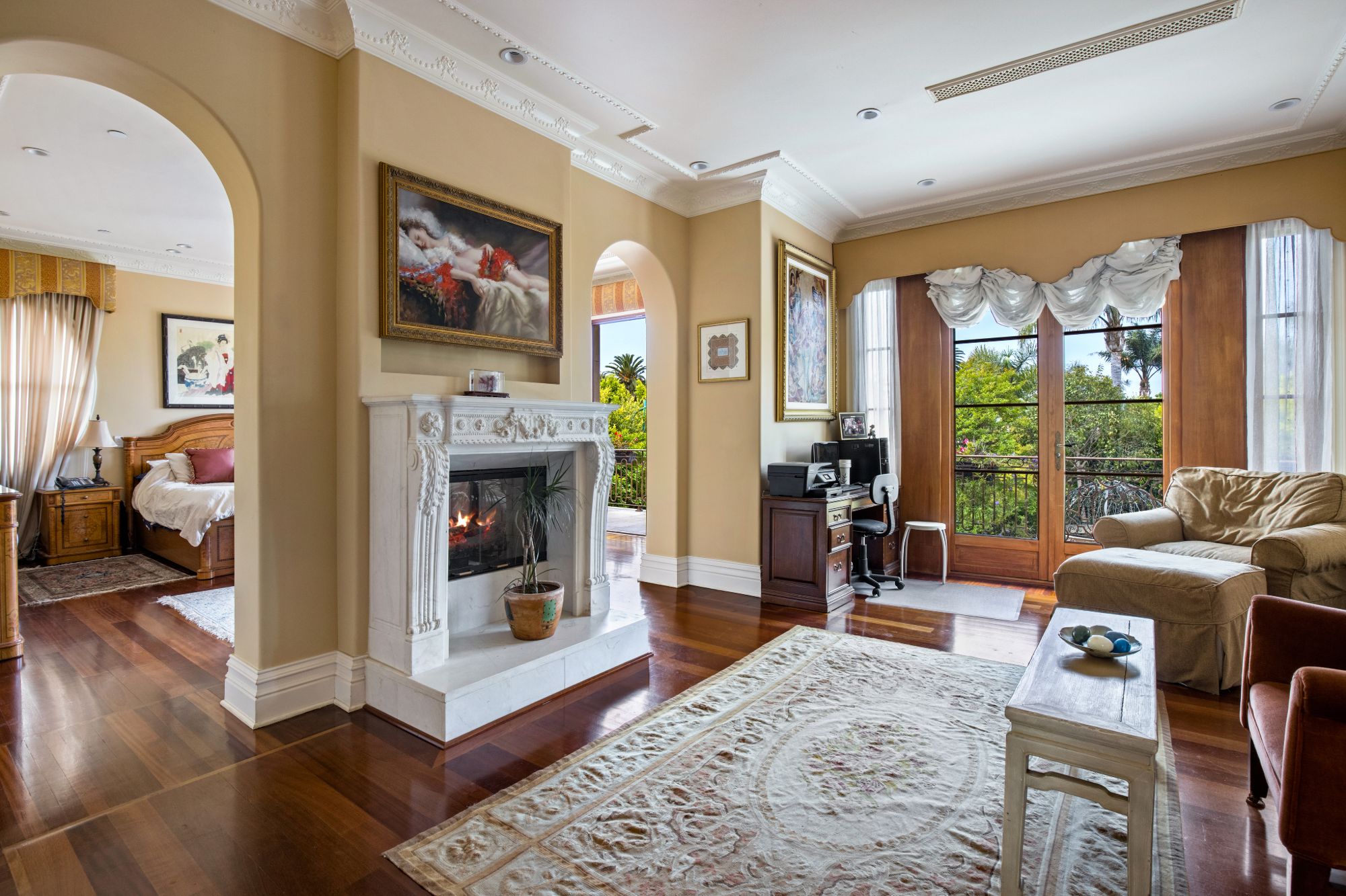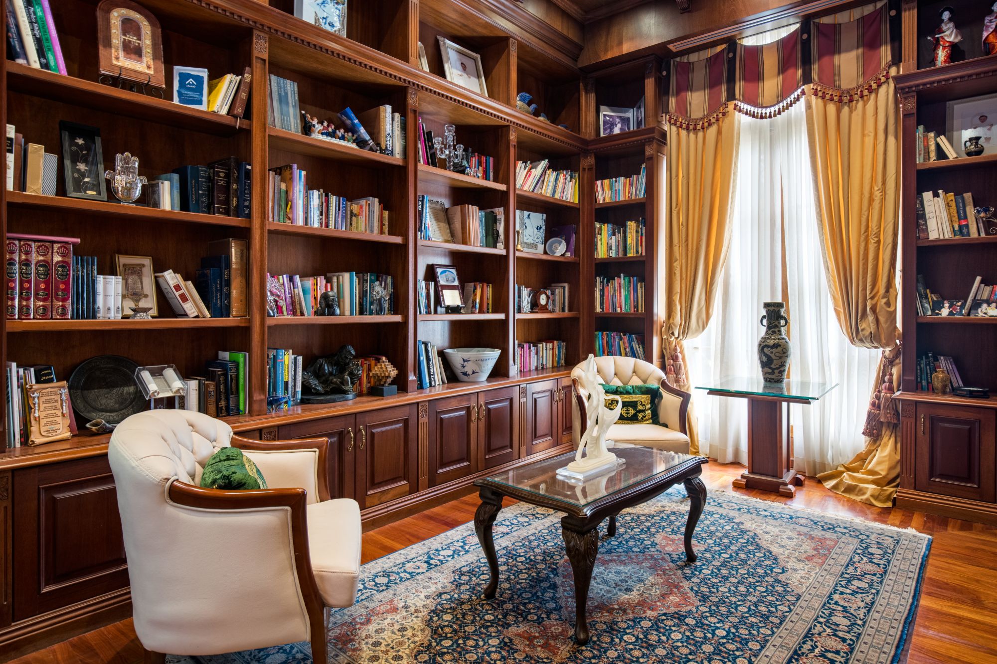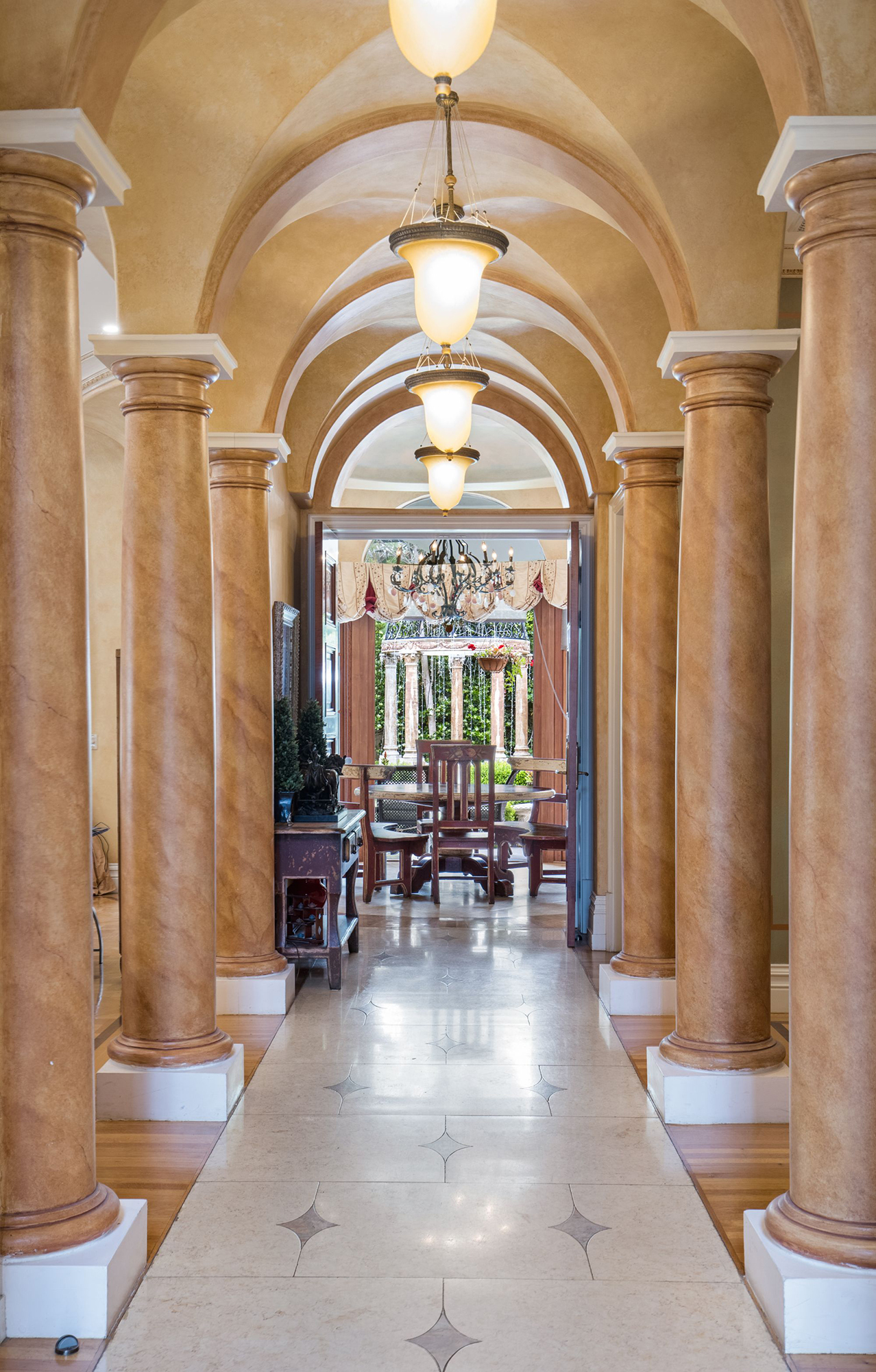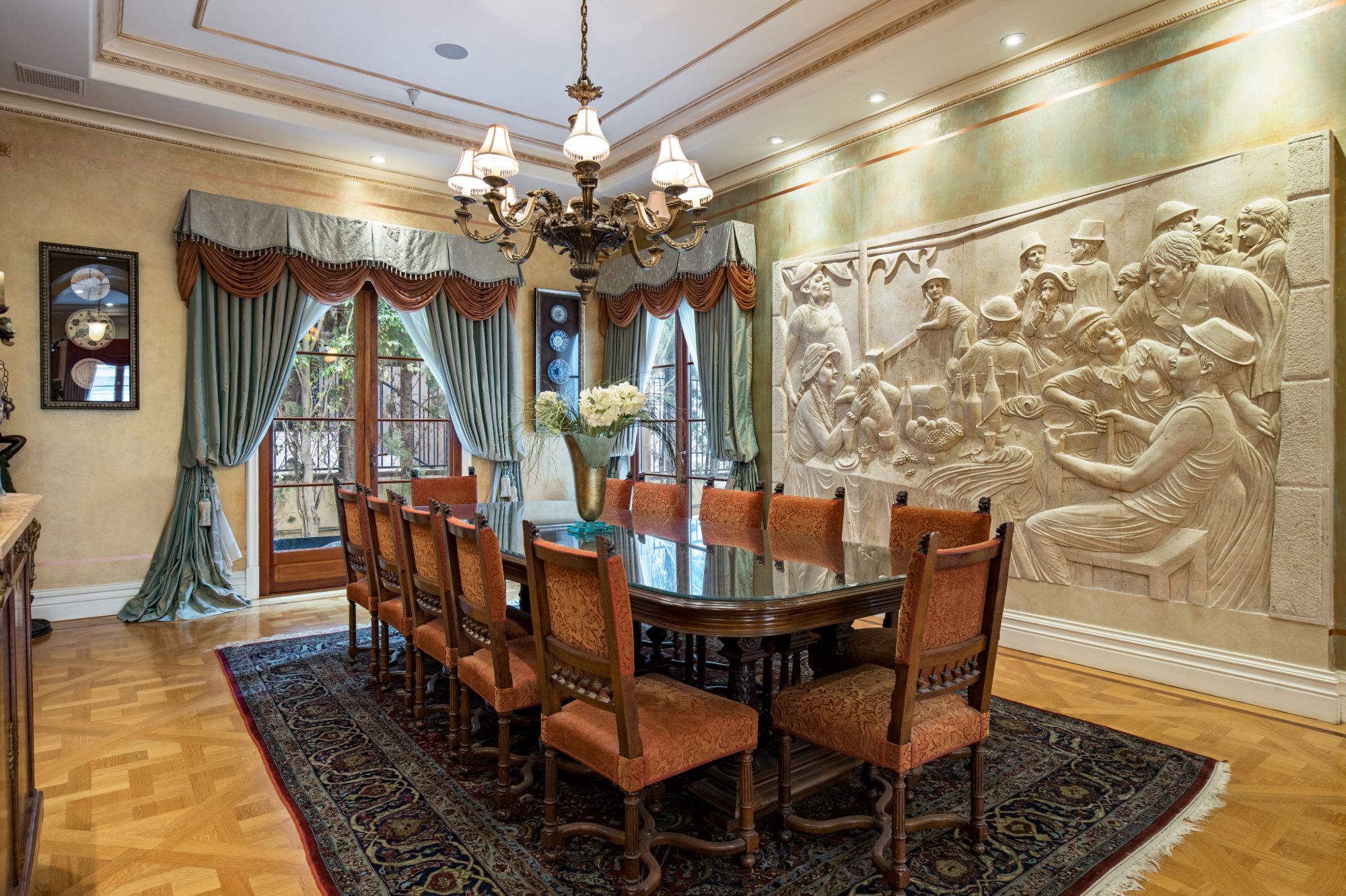 This majestic Mediterranean villa is an exemplary designer home with unparalleled elegance, grandeur, privacy, & craftsmanship in Brentwood’s most prominent neighborhood directly facing the Brentwood Country Club & minutes from the Brentwood Country Mart. Designed by famed French architect Robert Salice, this 10900-SF residence w/ luxurious entertainment features is set behind iron-wrought gates, & lush hedging. Entering a French Mahogany door, a stunning foyer sets the tone for its scale & extravagance w/ soaring coffered ceilings, gilded embellishments & grand archways; sensational double height sandstone murals hand-carved in China flank the living room entrance & adorn the formal dining room. Voluminous living & family rooms served by a lavish curved bar. An exquisite kitchen w/ Italian marble countertop adjoined by a breakfast room. Solid cherrywood doors throughout open onto outdoor entertaining areas featuring a veranda w/ a fire pit, vast lawn, gazebo, & heated saltwater pool w/ virtuoso tile-works. 2nd floor w/ golf course views features a lavish primary suite w/ a beautiful sitting room, balcony overlooking the pool, & partners’ bathrooms w/ steam showers & tub. A media/game room, wine cellar, library, & elevator complete its 5-star amenities. A one-of-a-kind showpiece that adds prestige to an exclusive community of the most discerning elite.