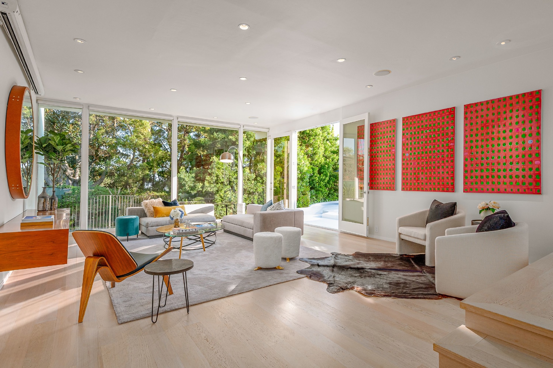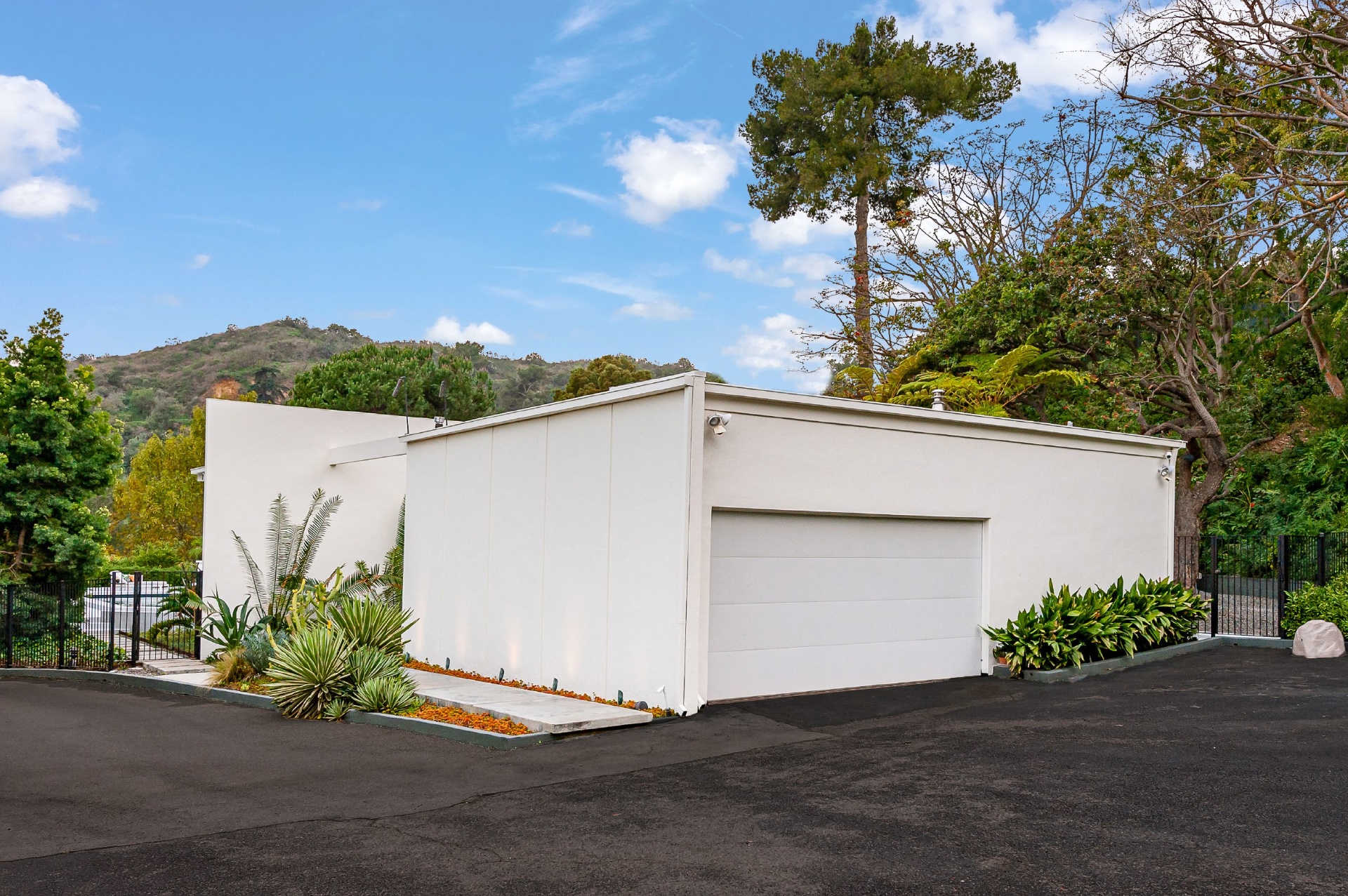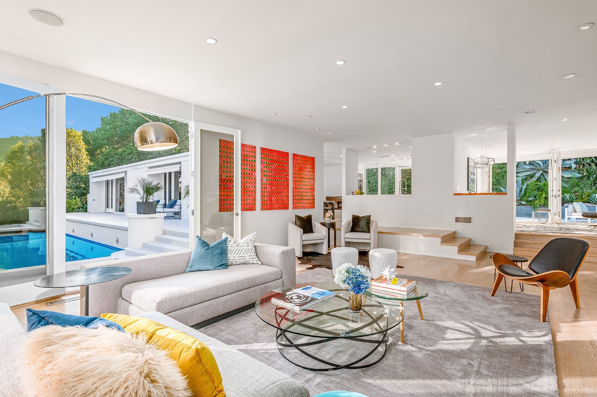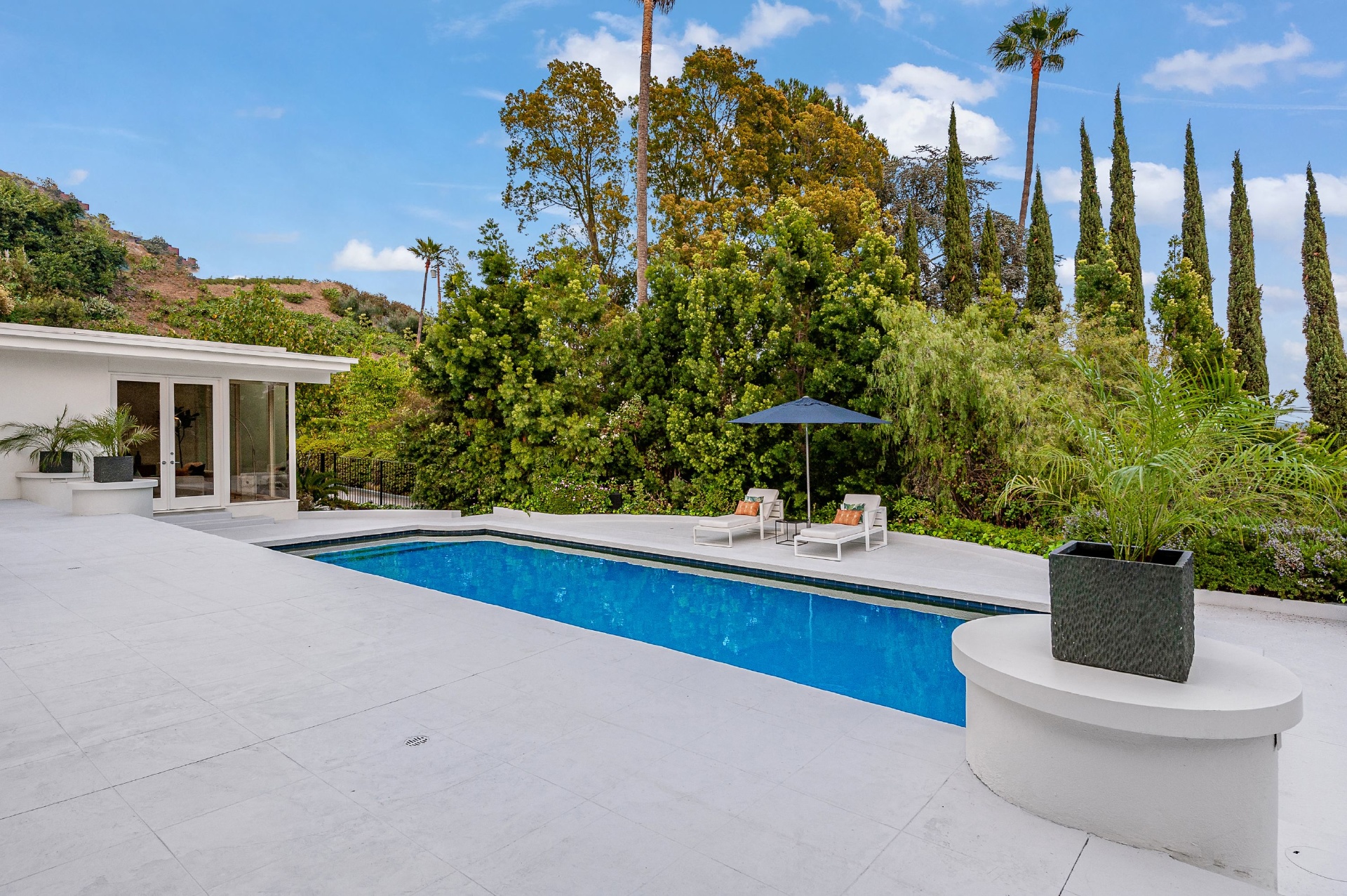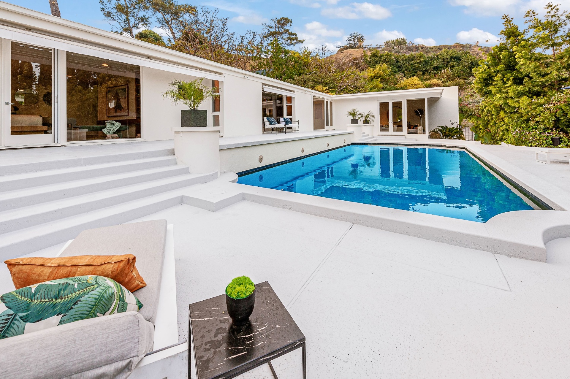 This swanky Mid-Century modern estate is set in Outpost Estates at the end of a quiet cul-du-sac. A short drive from Hollywood & just off of Mulholland Dr. for easy freeway access & nearby hiking trails at Runyon Canyon. Enter the long private & gated driveway to a 10-car motor court & 2-car garage. A double height entry opens to guest bedroom, lounge area & living room w/floor to ceiling walls of glass & French doors that open to a lush oversized patio & salt water pool. A formal dining room w/fireplace also opens up to the pool. The gourmet chef's kitchen includes top of the line appliances, center-island w/breakfast bar & French doors that lead to a grass filled back yard with BBQ, outdoor dining, and game & lounge areas. A spacious master suite has floor to ceiling windows & French doors that open to the pool. The third bedroom could be used as a gym, home office or additional guest suite. A serene paradise, this is Southern California indoor/outdoor living at its finest.