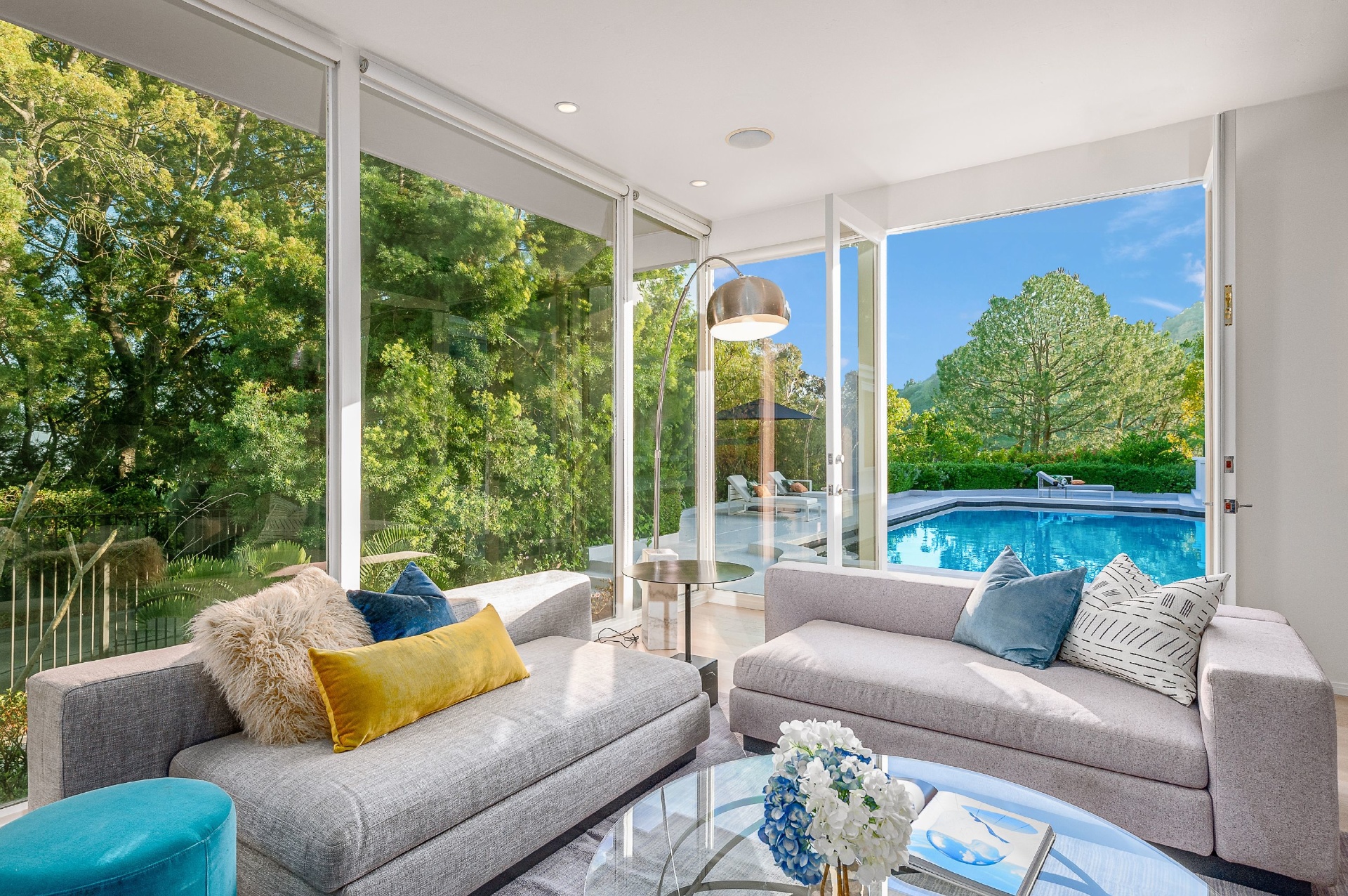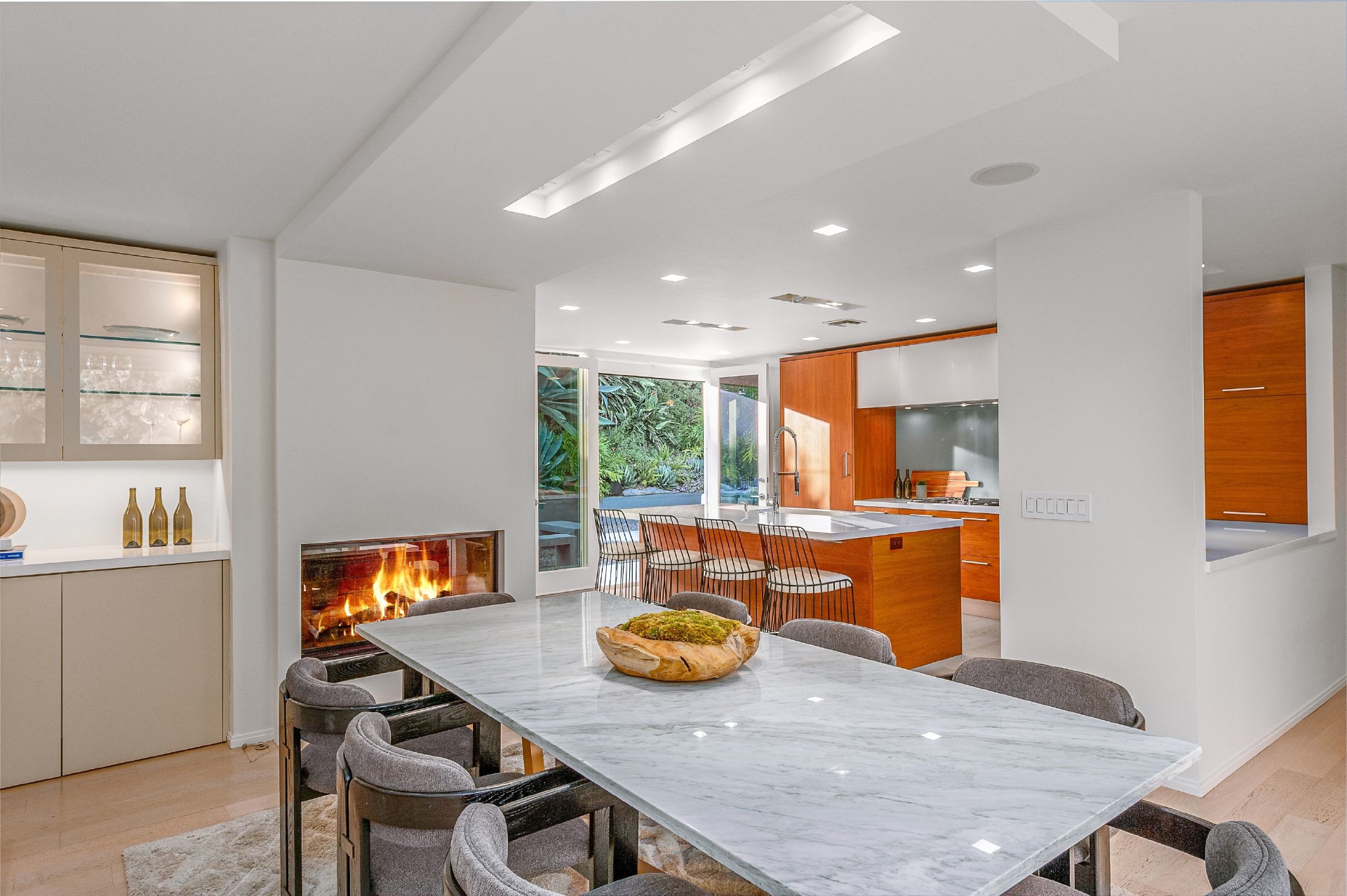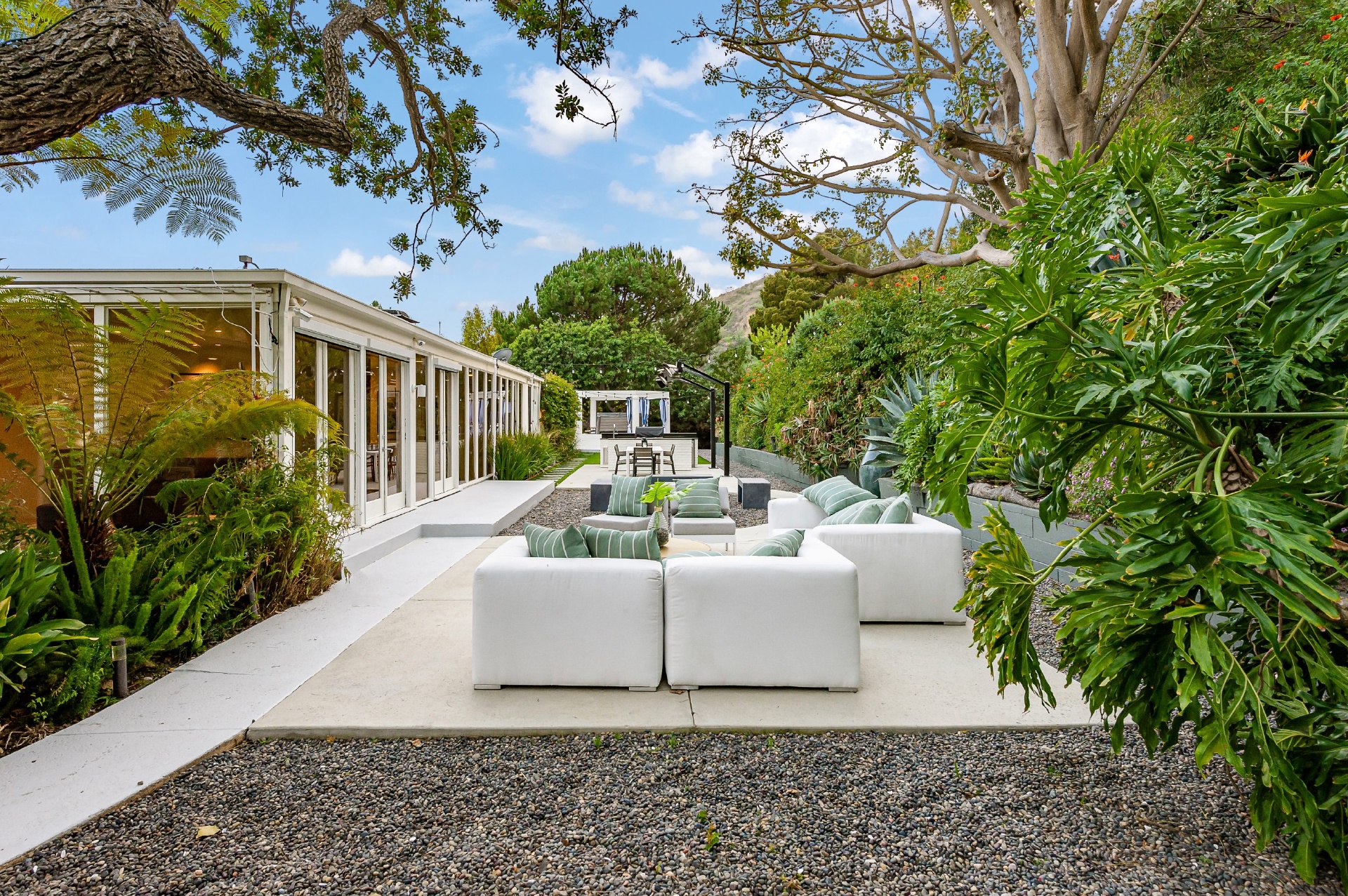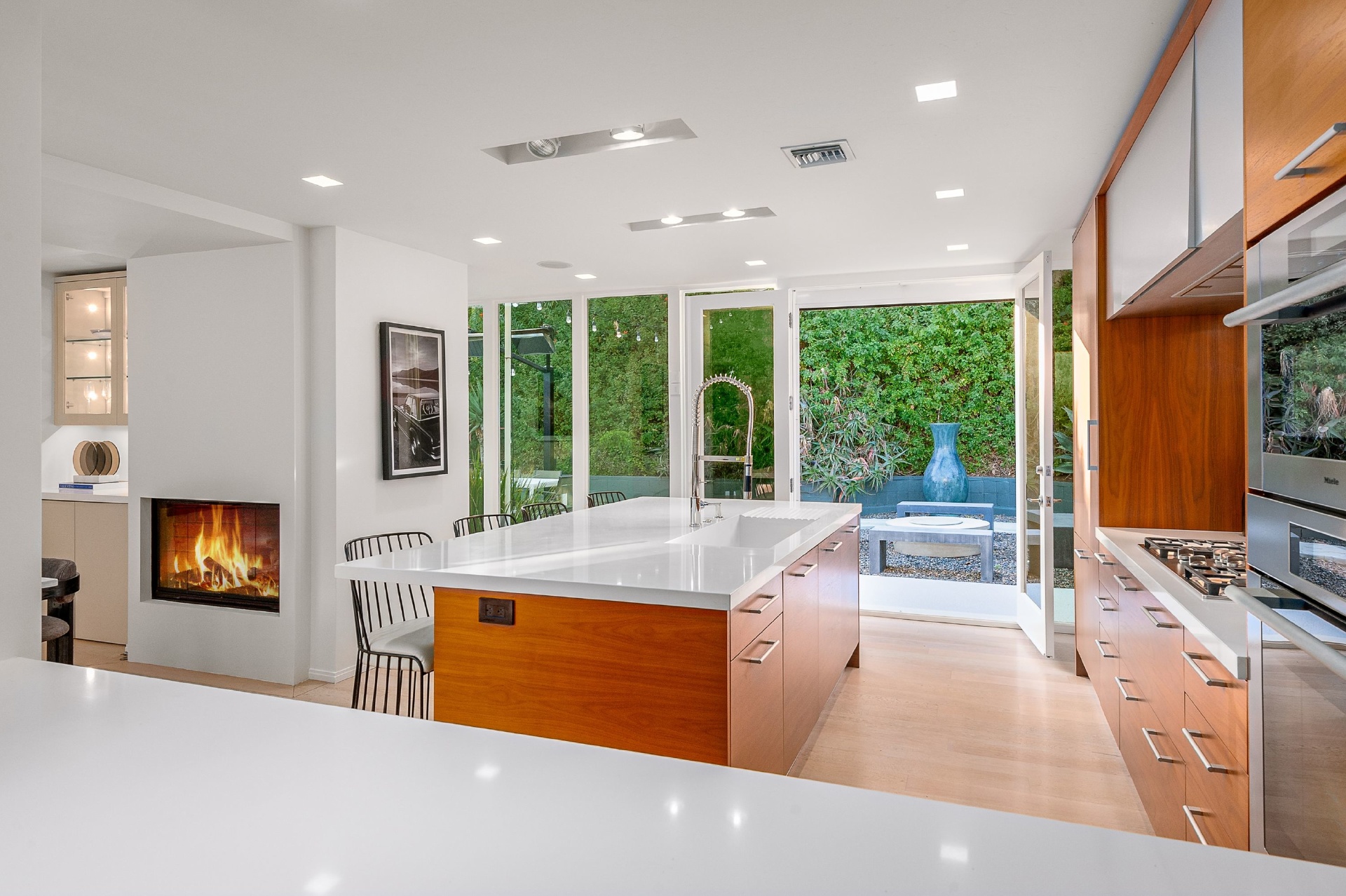 This swanky Mid-Century modern estate is set in Outpost Estates at the end of a quiet cul-du-sac. A short drive from Hollywood & just off of Mulholland Dr. for easy freeway access & nearby hiking trails at Runyon Canyon. Enter the long private & gated driveway to a 10-car motor court & 2-car garage. A double height entry opens to guest bedroom, lounge area & living room w/floor to ceiling walls of glass & French doors that open to a lush oversized patio & salt water pool. A formal dining room w/fireplace also opens up to the pool. The gourmet chef's kitchen includes top of the line appliances, center-island w/breakfast bar & French doors that lead to a grass filled back yard with BBQ, outdoor dining, and game & lounge areas. A spacious master suite has floor to ceiling windows & French doors that open to the pool. The third bedroom could be used as a gym, home office or additional guest suite. A serene paradise, this is Southern California indoor/outdoor living at its finest.