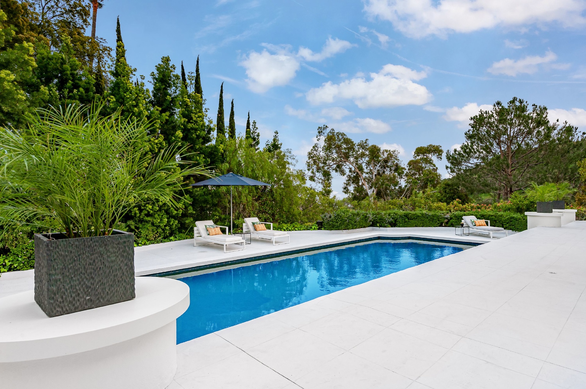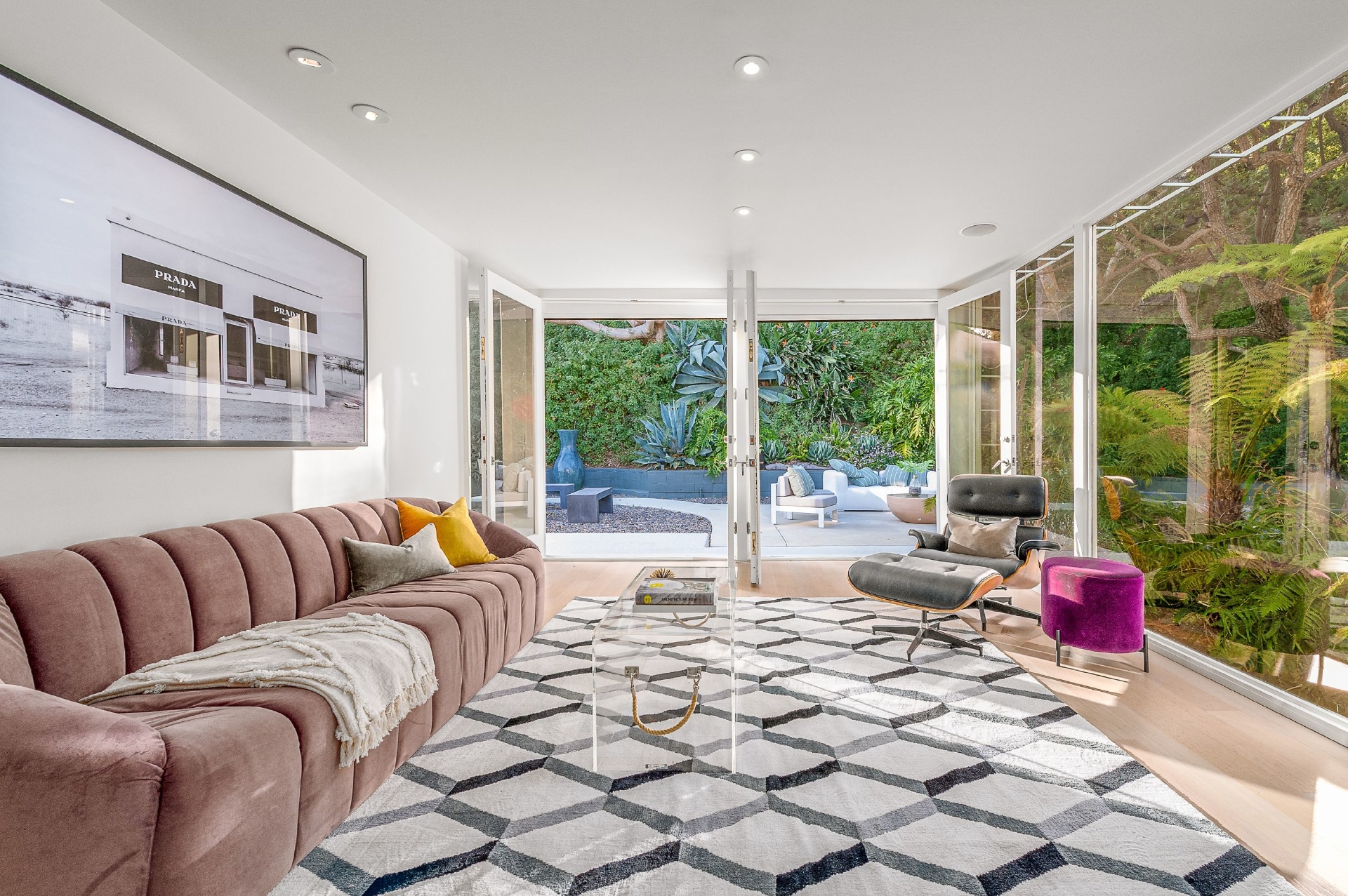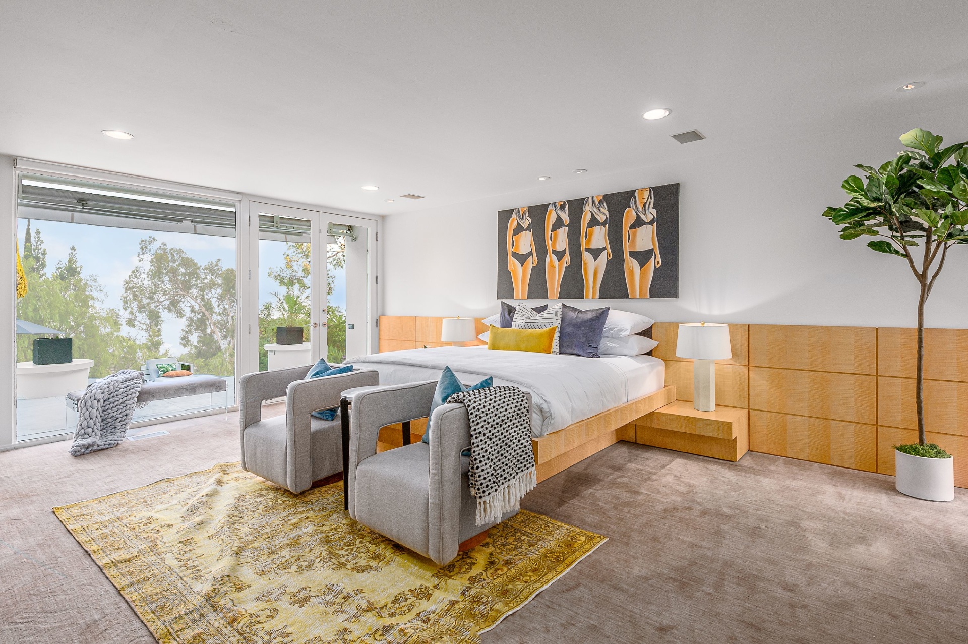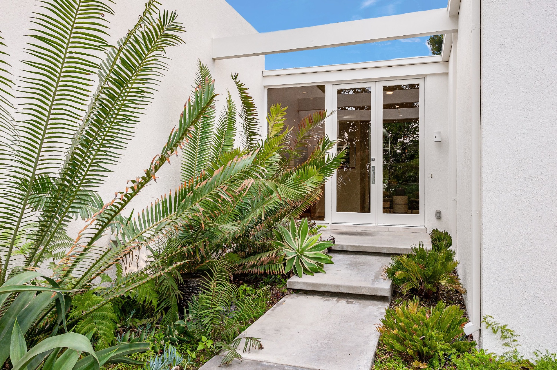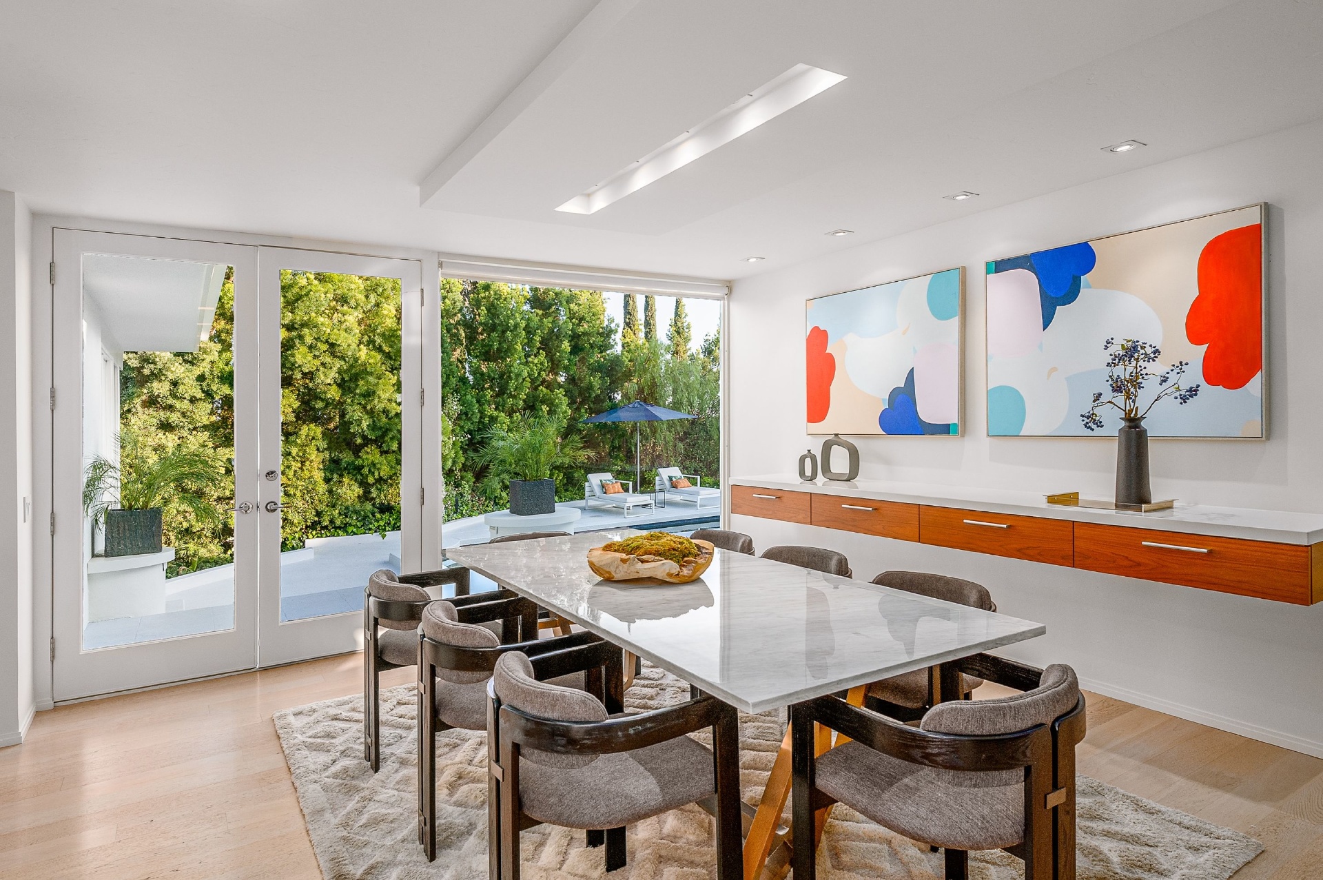 This swanky Mid-Century modern estate is set in Outpost Estates at the end of a quiet cul-du-sac. A short drive from Hollywood & just off of Mulholland Dr. for easy freeway access & nearby hiking trails at Runyon Canyon. Enter the long private & gated driveway to a 10-car motor court & 2-car garage. A double height entry opens to guest bedroom, lounge area & living room w/floor to ceiling walls of glass & French doors that open to a lush oversized patio & salt water pool. A formal dining room w/fireplace also opens up to the pool. The gourmet chef's kitchen includes top of the line appliances, center-island w/breakfast bar & French doors that lead to a grass filled back yard with BBQ, outdoor dining, and game & lounge areas. A spacious master suite has floor to ceiling windows & French doors that open to the pool. The third bedroom could be used as a gym, home office or additional guest suite. A serene paradise, this is Southern California indoor/outdoor living at its finest.