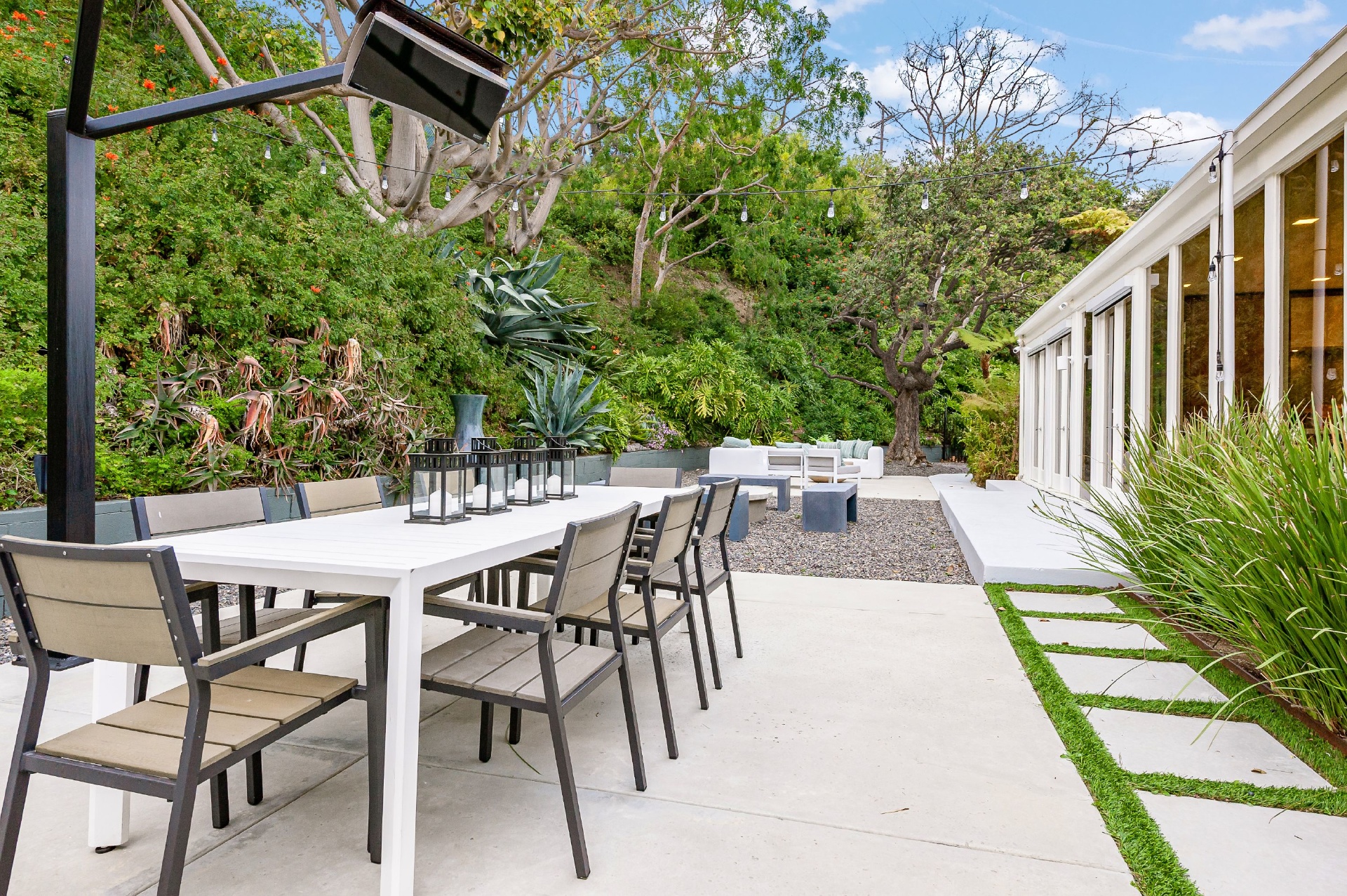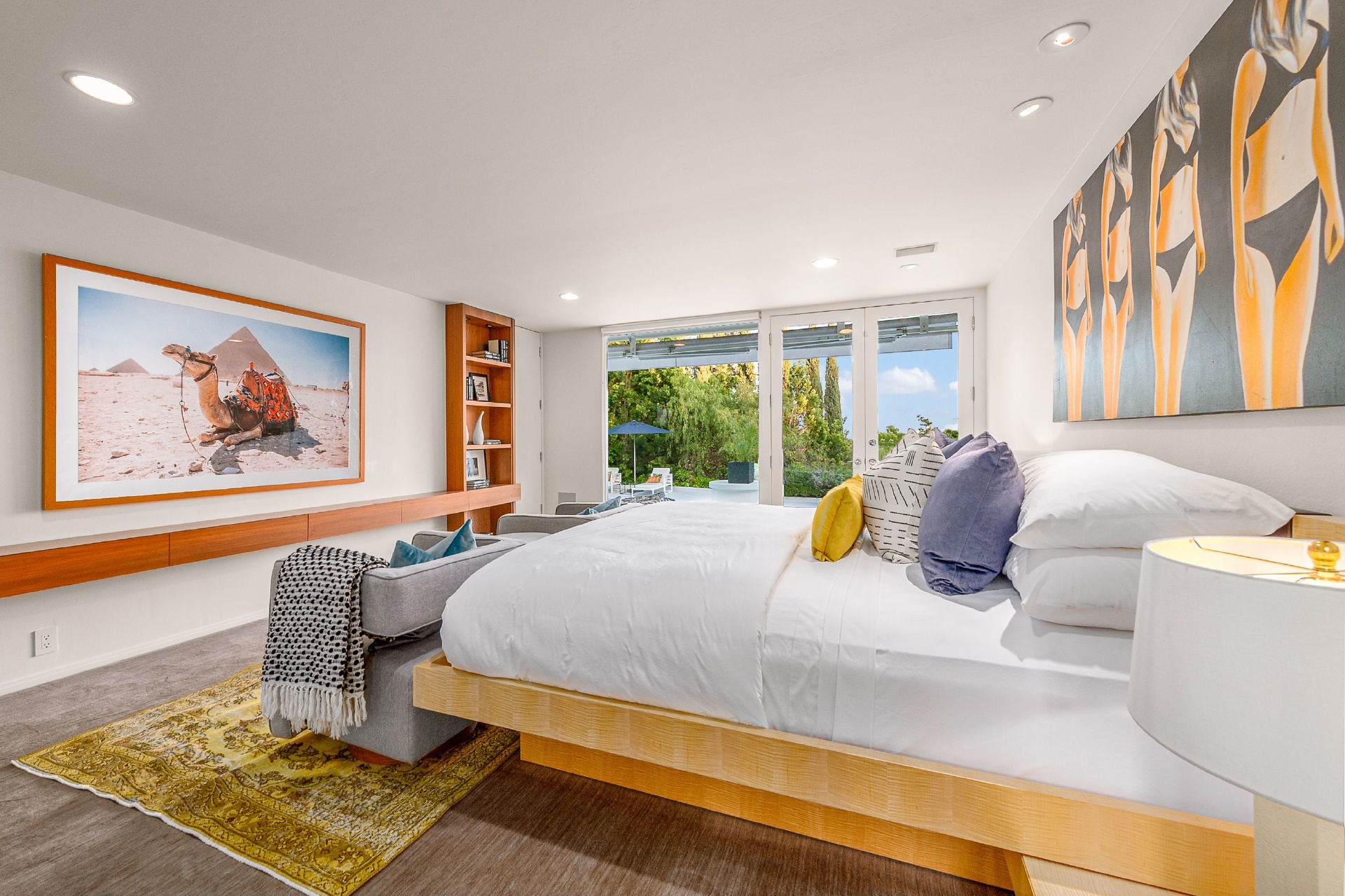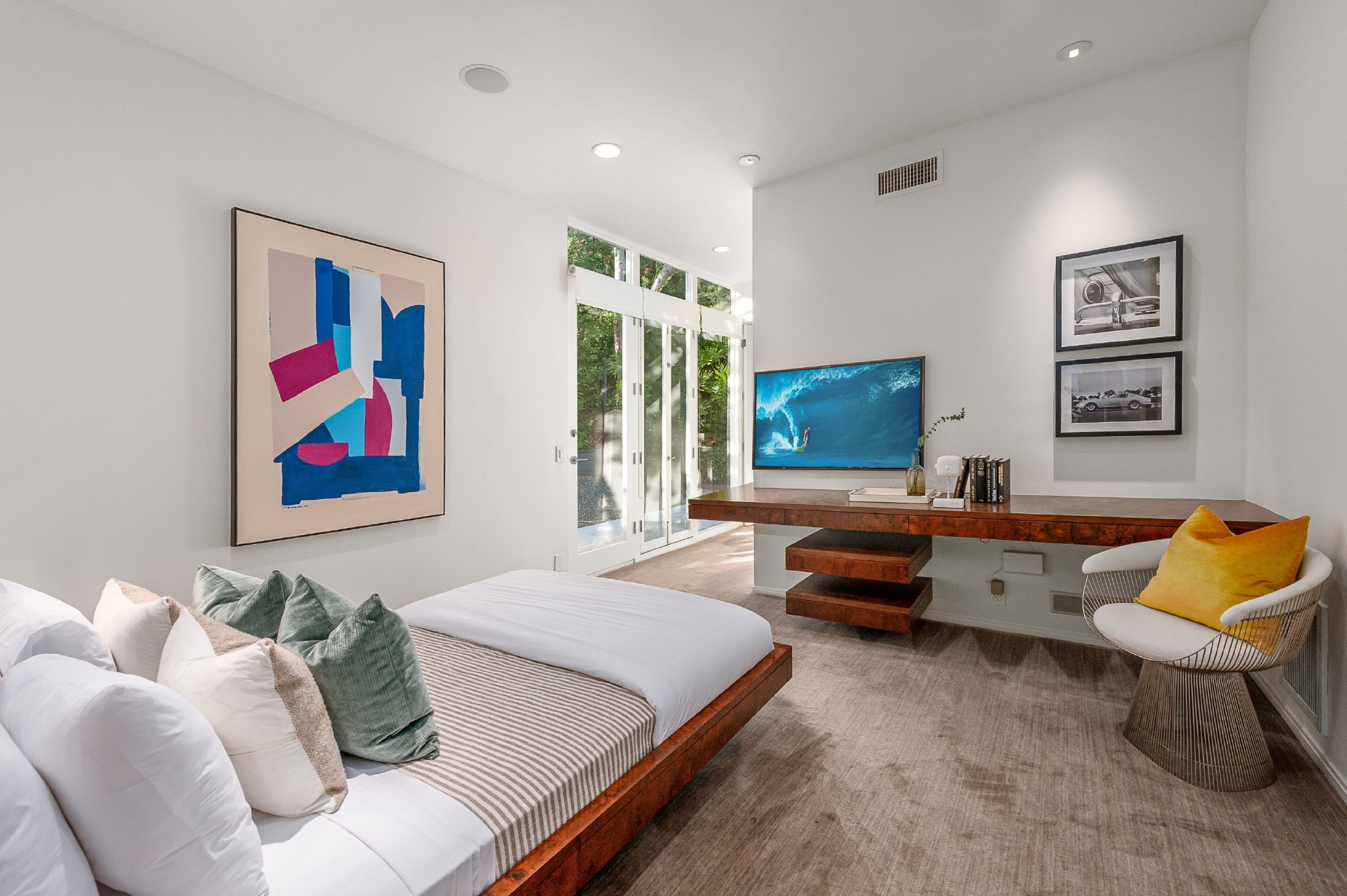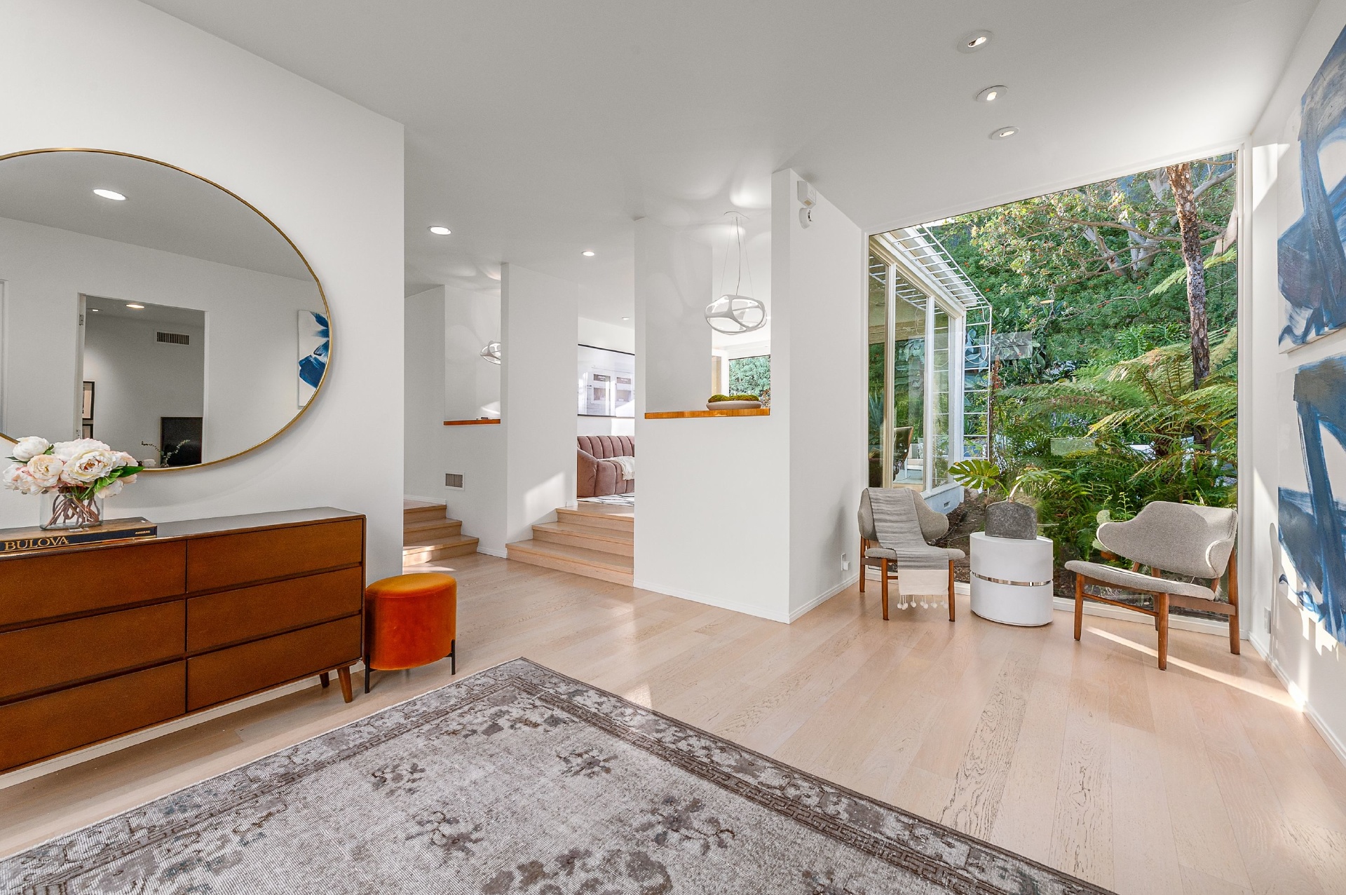 This swanky Mid-Century modern estate is set in Outpost Estates at the end of a quiet cul-du-sac. A short drive from Hollywood & just off of Mulholland Dr. for easy freeway access & nearby hiking trails at Runyon Canyon. Enter the long private & gated driveway to a 10-car motor court & 2-car garage. A double height entry opens to guest bedroom, lounge area & living room w/floor to ceiling walls of glass & French doors that open to a lush oversized patio & salt water pool. A formal dining room w/fireplace also opens up to the pool. The gourmet chef's kitchen includes top of the line appliances, center-island w/breakfast bar & French doors that lead to a grass filled back yard with BBQ, outdoor dining, and game & lounge areas. A spacious master suite has floor to ceiling windows & French doors that open to the pool. The third bedroom could be used as a gym, home office or additional guest suite. A serene paradise, this is Southern California indoor/outdoor living at its finest.