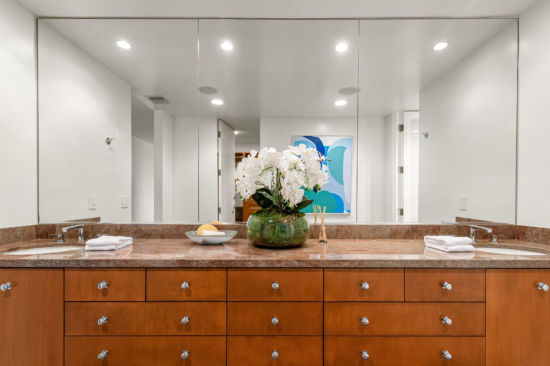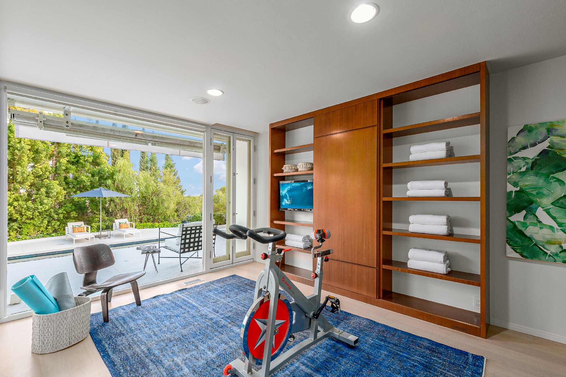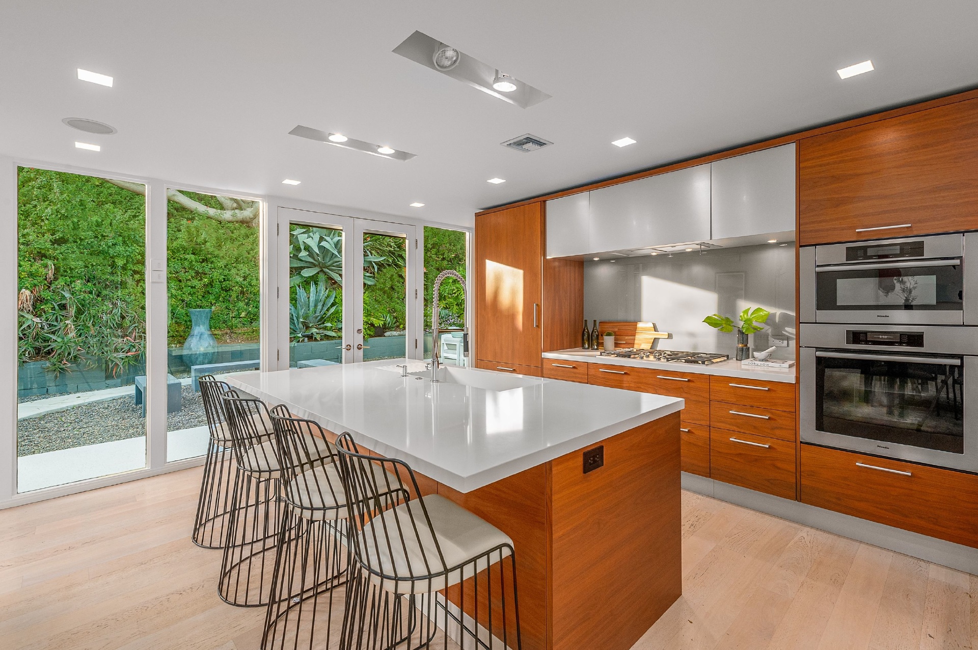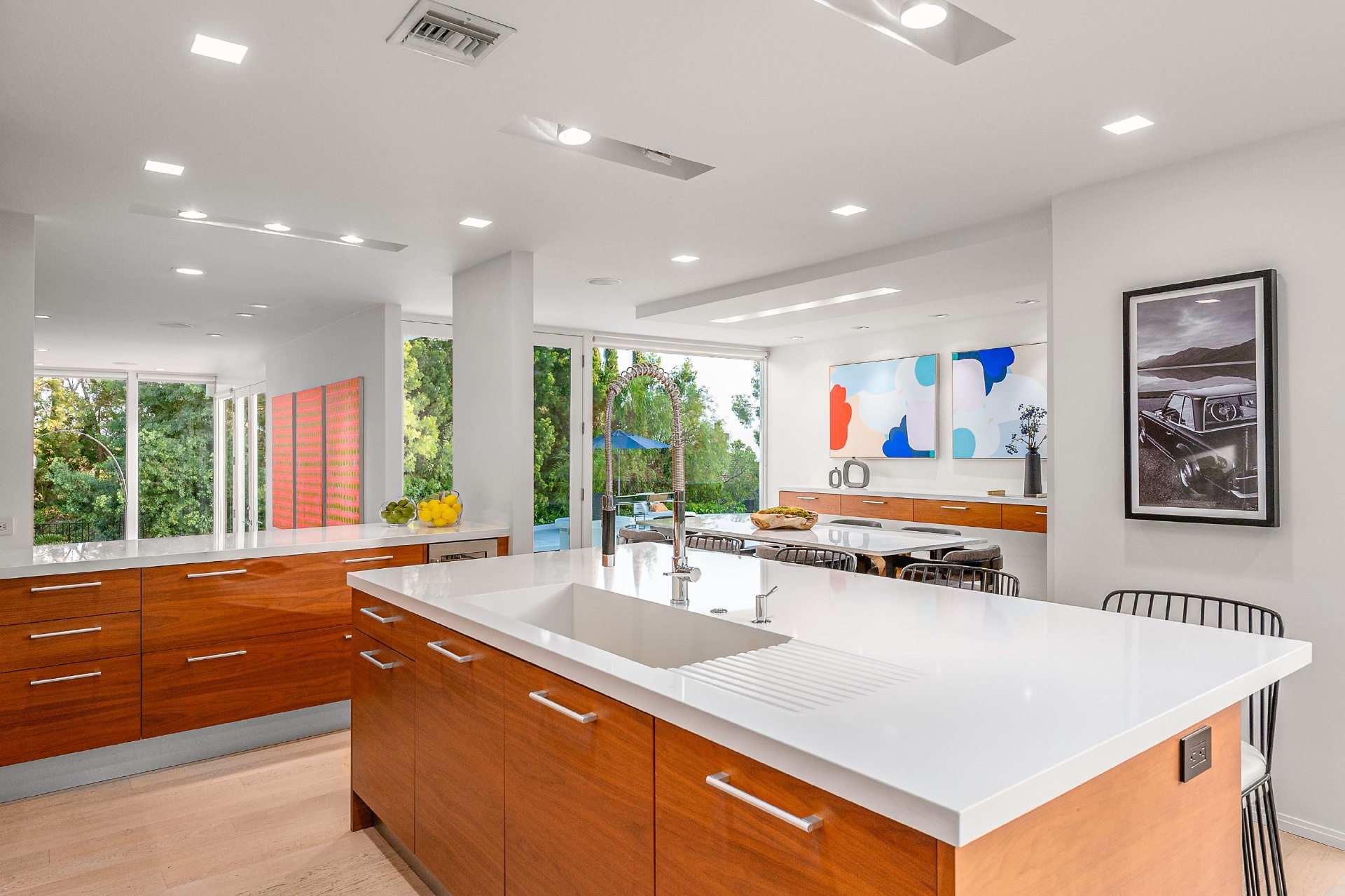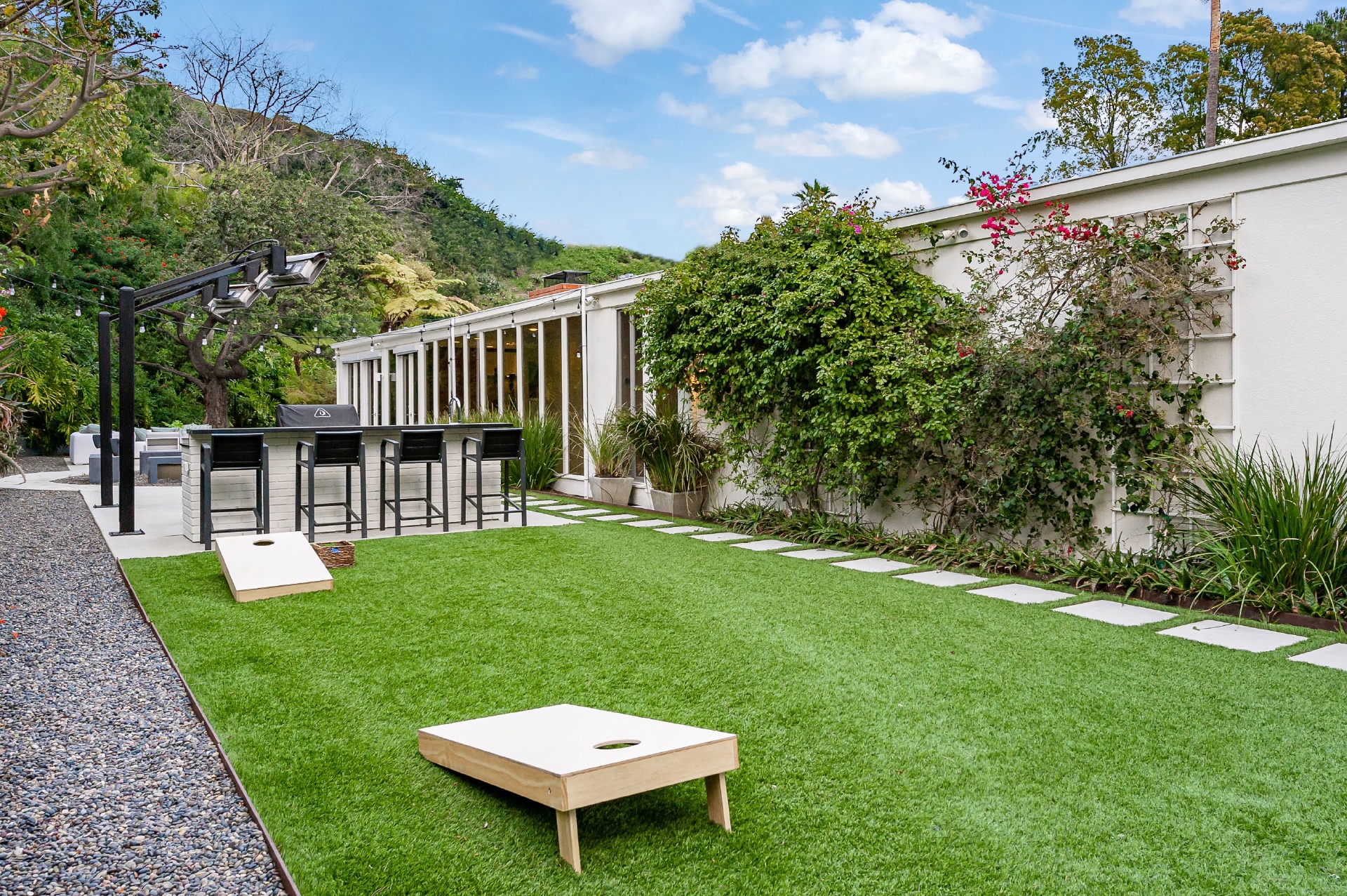 This swanky Mid-Century modern estate is set in Outpost Estates at the end of a quiet cul-du-sac. A short drive from Hollywood & just off of Mulholland Dr. for easy freeway access & nearby hiking trails at Runyon Canyon. Enter the long private & gated driveway to a 10-car motor court & 2-car garage. A double height entry opens to guest bedroom, lounge area & living room w/floor to ceiling walls of glass & French doors that open to a lush oversized patio & salt water pool. A formal dining room w/fireplace also opens up to the pool. The gourmet chef's kitchen includes top of the line appliances, center-island w/breakfast bar & French doors that lead to a grass filled back yard with BBQ, outdoor dining, and game & lounge areas. A spacious master suite has floor to ceiling windows & French doors that open to the pool. The third bedroom could be used as a gym, home office or additional guest suite. A serene paradise, this is Southern California indoor/outdoor living at its finest.