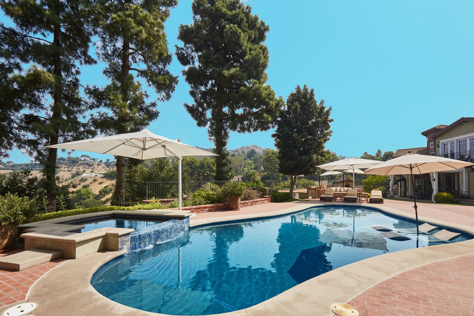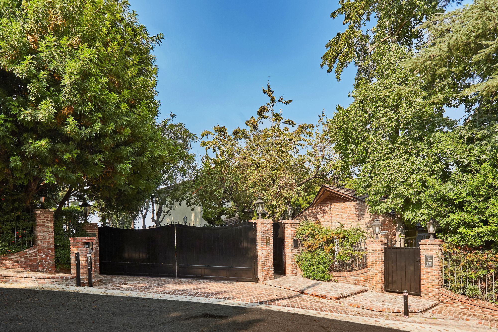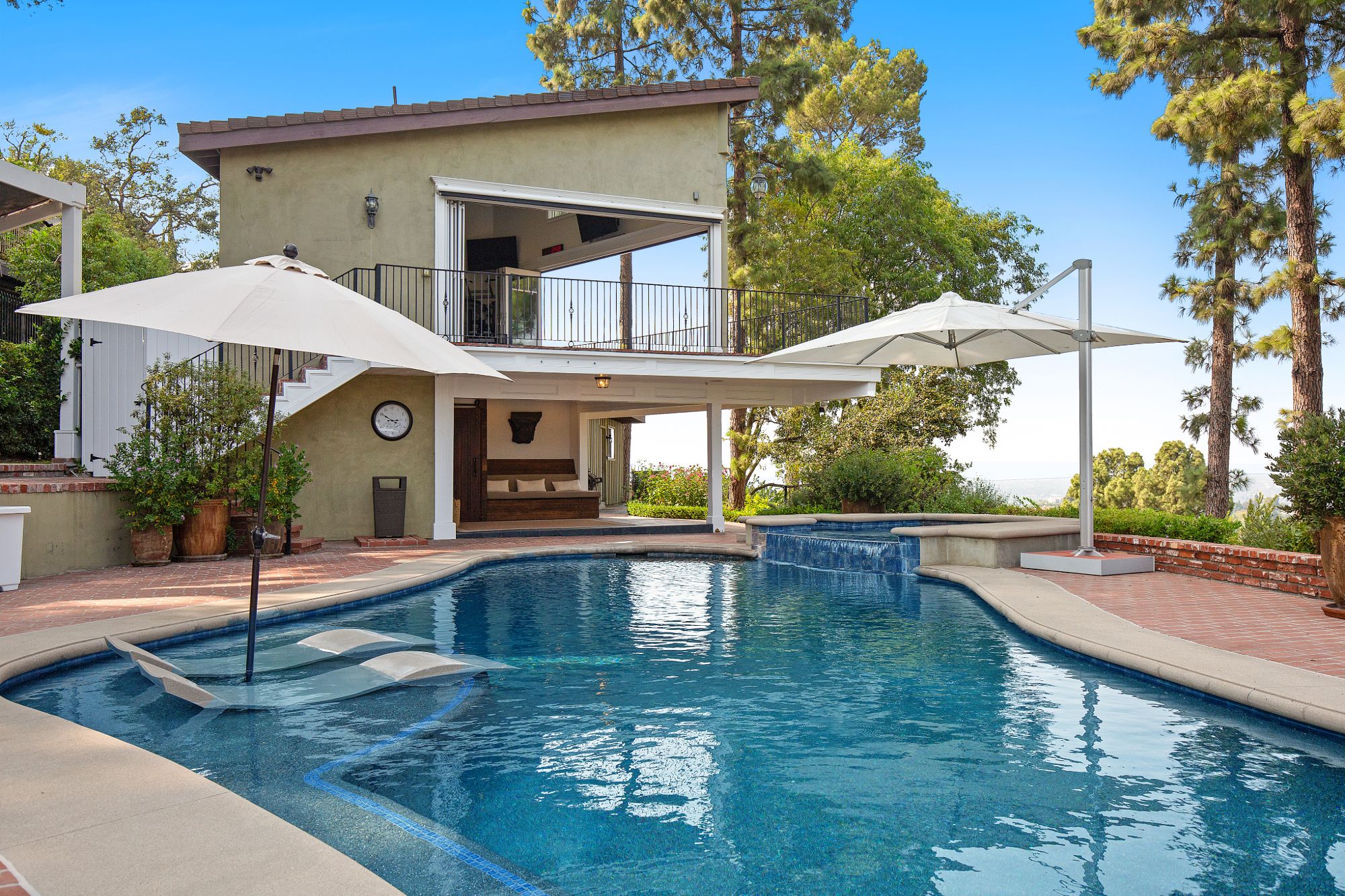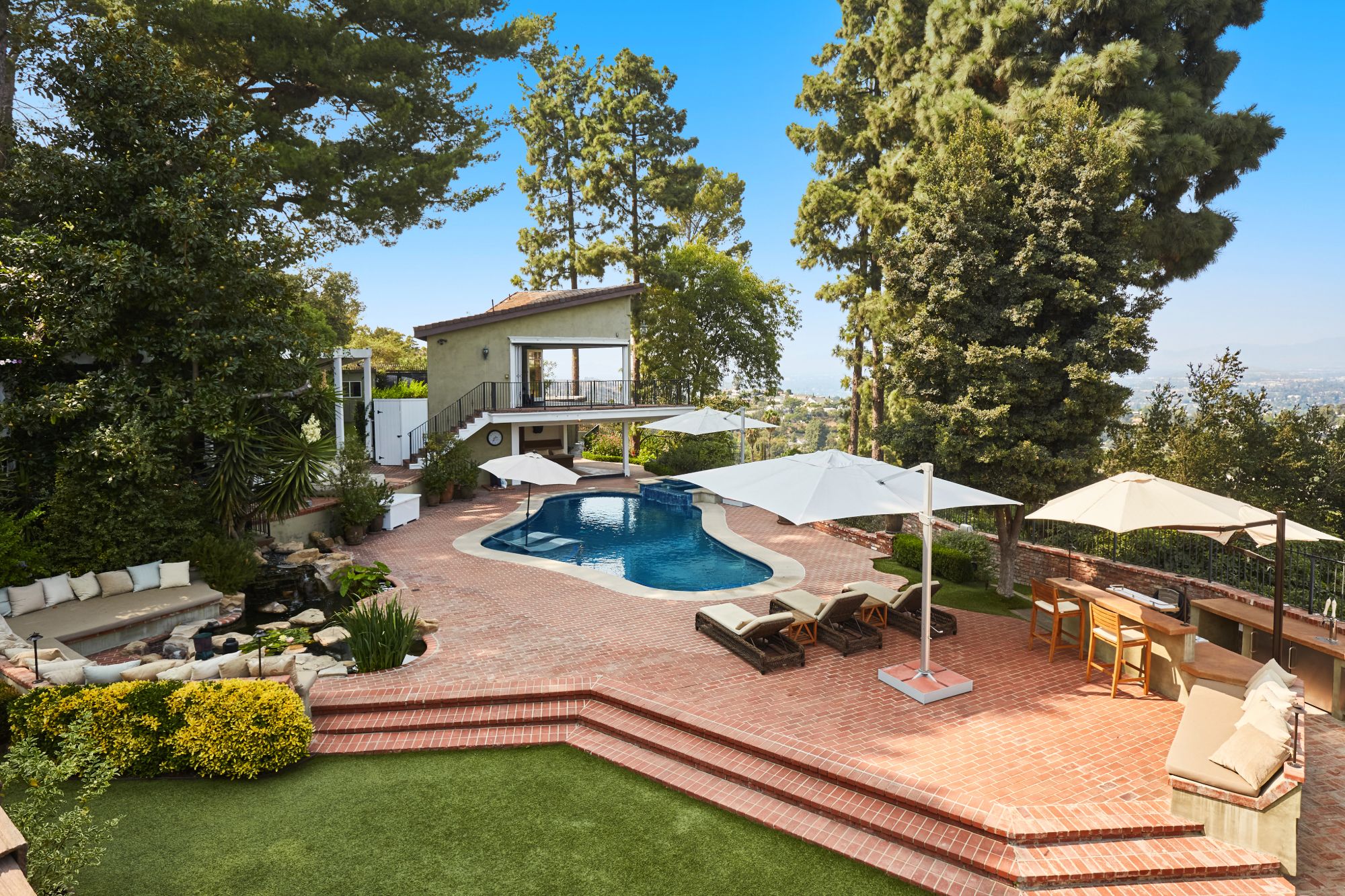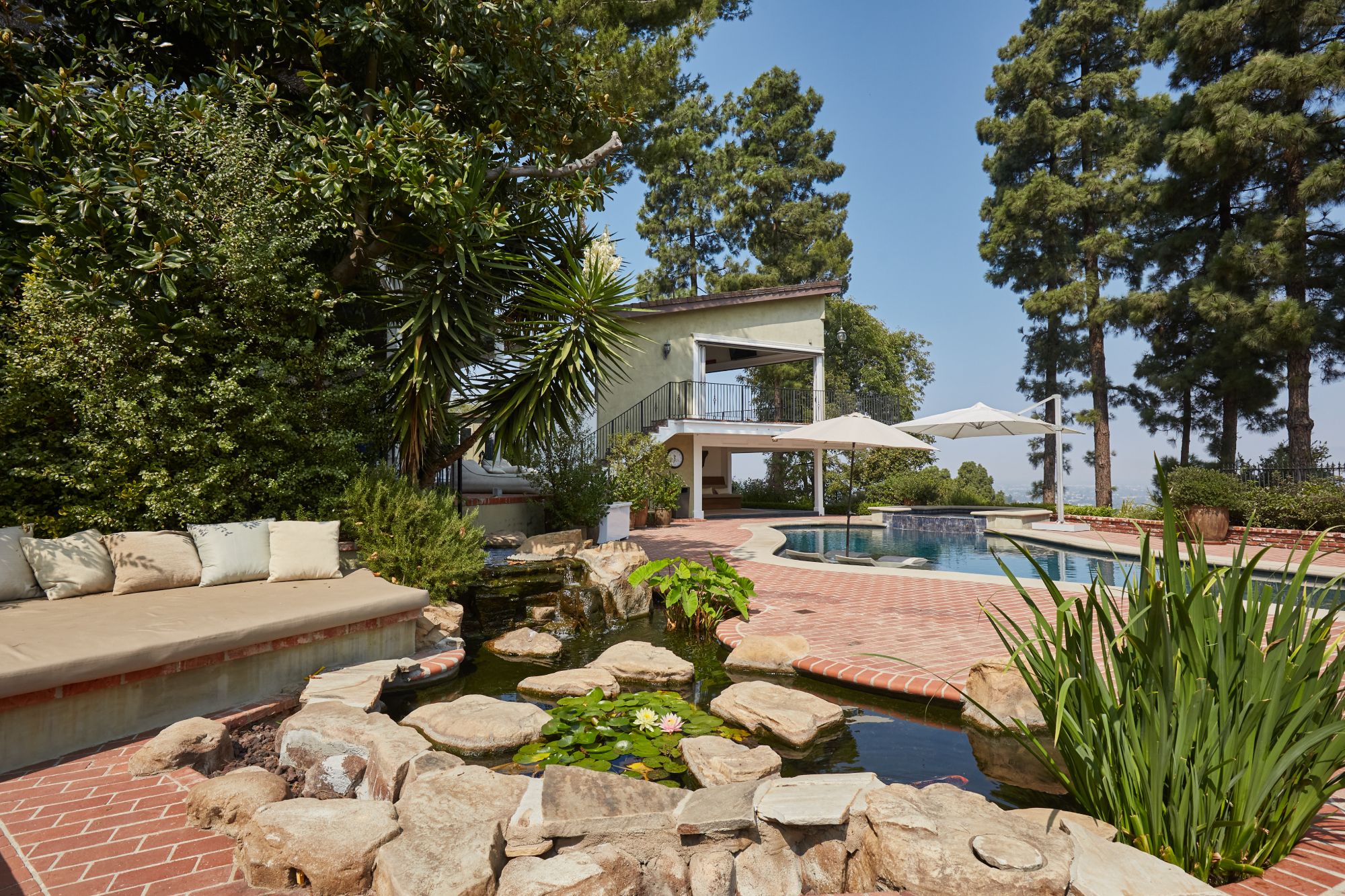 Stunning private, gated estate set on over half an acre of land with expansive city & mountain views. Near the coveted Fryman Estates hiking trails, and just 2 miles from world famous Sunset Strip shopping & dining. This luxurious resort like estate was once home to Hollywood icon Mickey Rooney. The traditional 6 bed, 8 bath main house is complimented by a two-story English brick guesthouse and two-story gym & spa. A dramatic open floor plan ties together the main living spaces including a living room with home theater, formal living area, dining room and kitchen that all open to the outdoors, bringing the inside out. A gourmet chef's kitchen includes Carrera marble counters & top of the line appliances. Luxurious master retreat includes large private terrace with stunning city views, fireplace, walk-in steam shower & spa tub. Grounds feature a pool, spa, massage area, steam room & sauna, full gym, Koi pond, outdoor fire pits, waterfall, outdoor kitchen with full bar & wood-fire pizza oven.