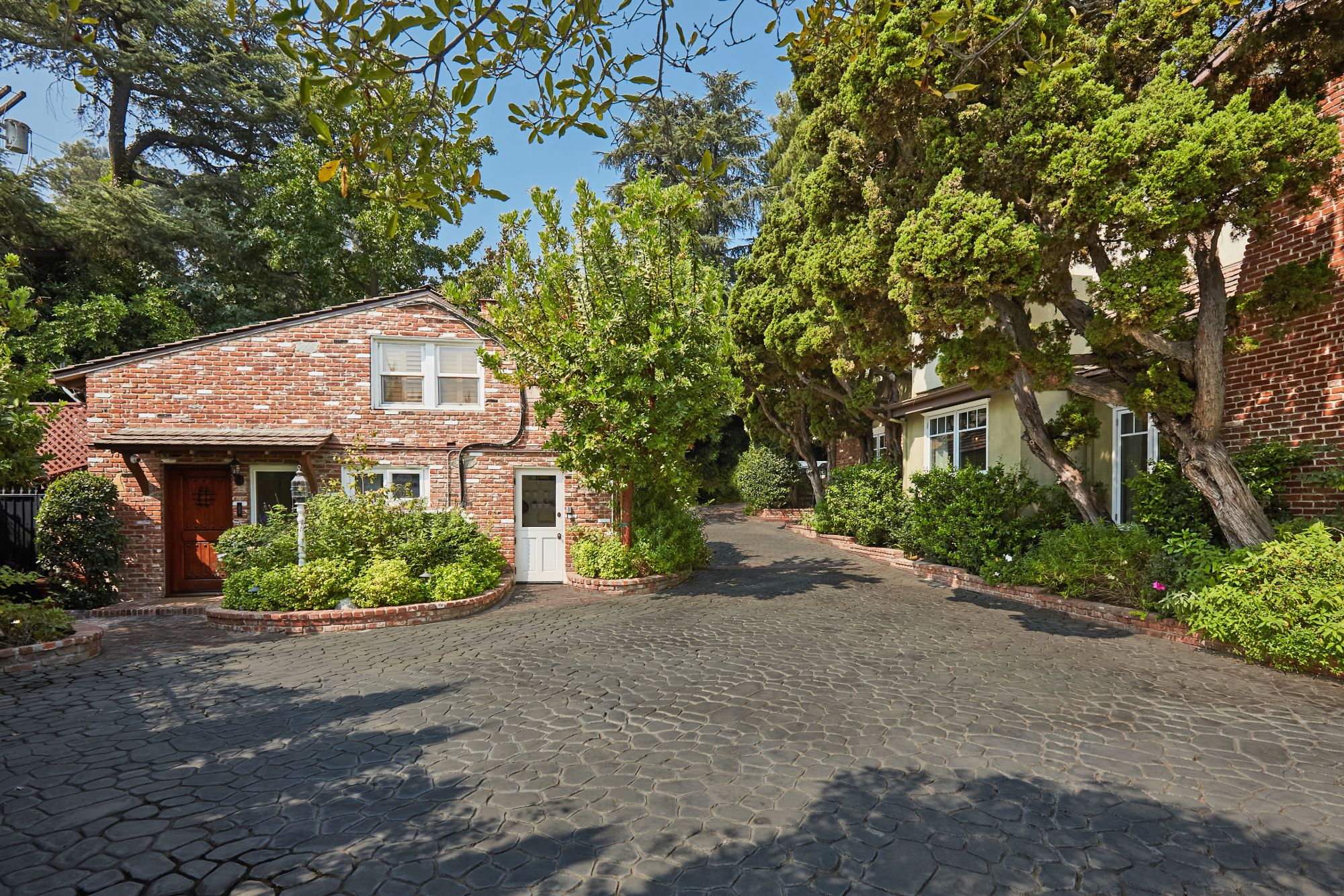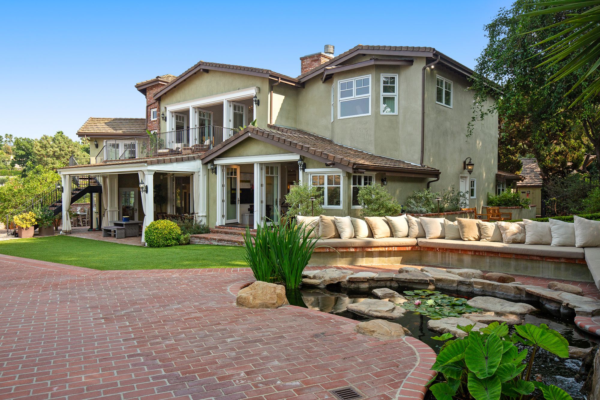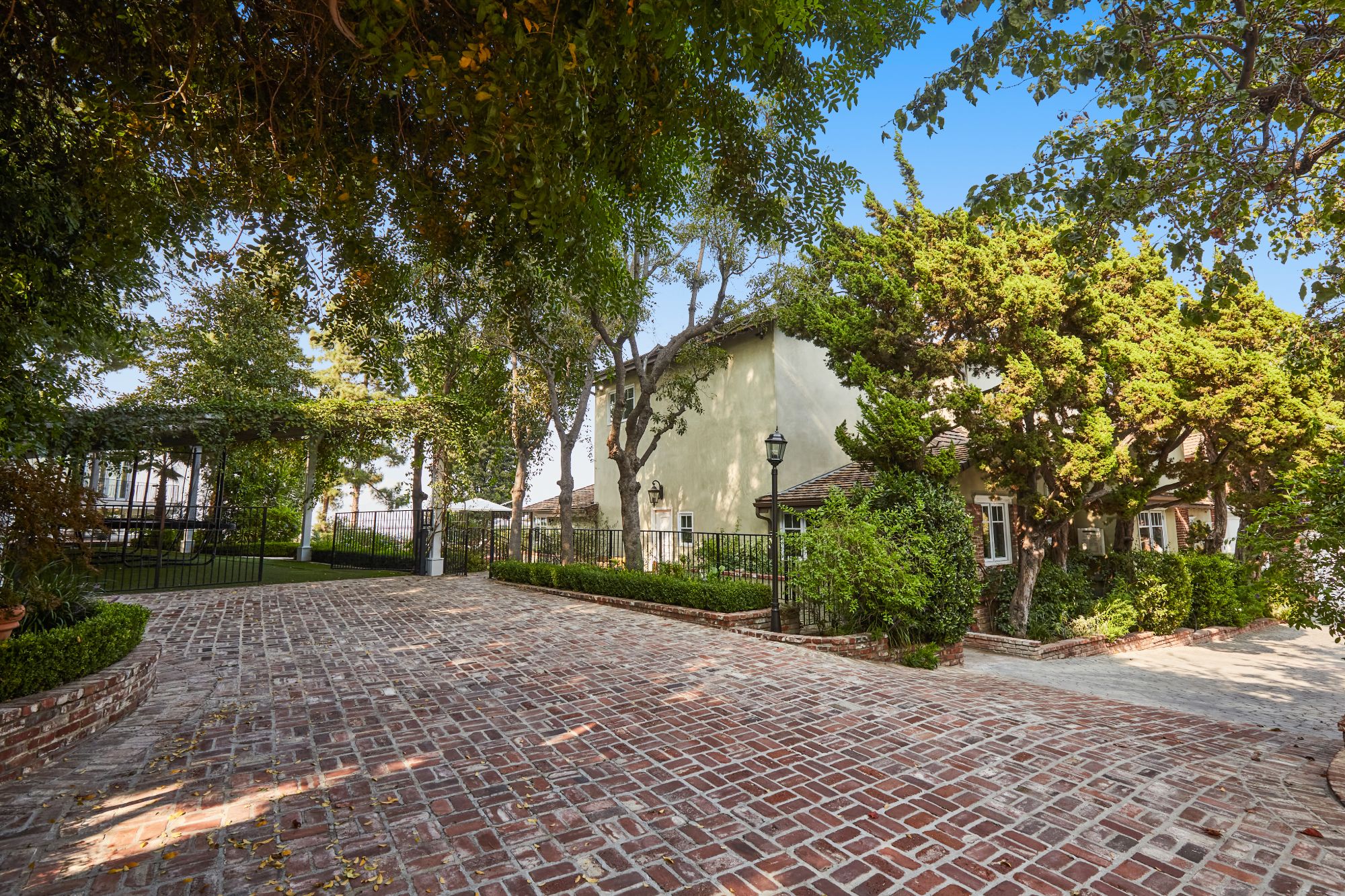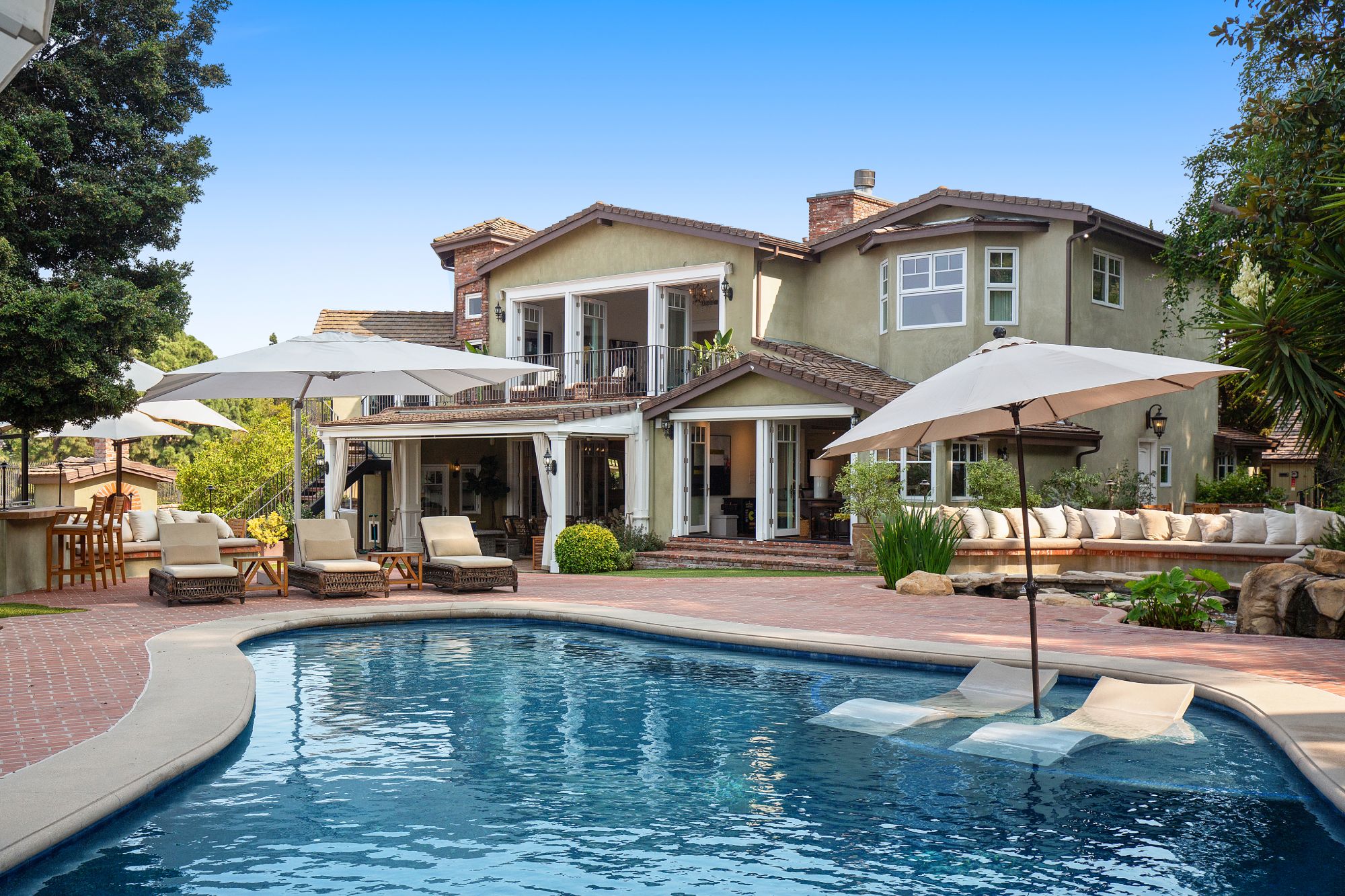 Stunning private, gated estate set on over half an acre of land with expansive city & mountain views. Near the coveted Fryman Estates hiking trails, and just 2 miles from world famous Sunset Strip shopping & dining. This luxurious resort like estate was once home to Hollywood icon Mickey Rooney. The traditional 6 bed, 8 bath main house is complimented by a two-story English brick guesthouse and two-story gym & spa. A dramatic open floor plan ties together the main living spaces including a living room with home theater, formal living area, dining room and kitchen that all open to the outdoors, bringing the inside out. A gourmet chef's kitchen includes Carrera marble counters & top of the line appliances. Luxurious master retreat includes large private terrace with stunning city views, fireplace, walk-in steam shower & spa tub. Grounds feature a pool, spa, massage area, steam room & sauna, full gym, Koi pond, outdoor fire pits, waterfall, outdoor kitchen with full bar & wood-fire pizza oven.