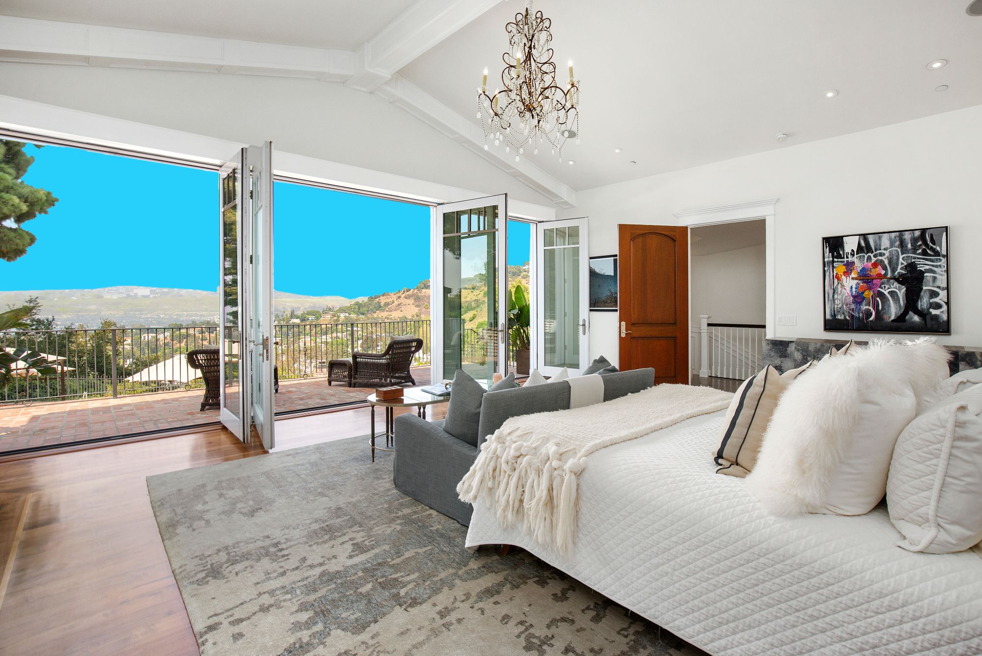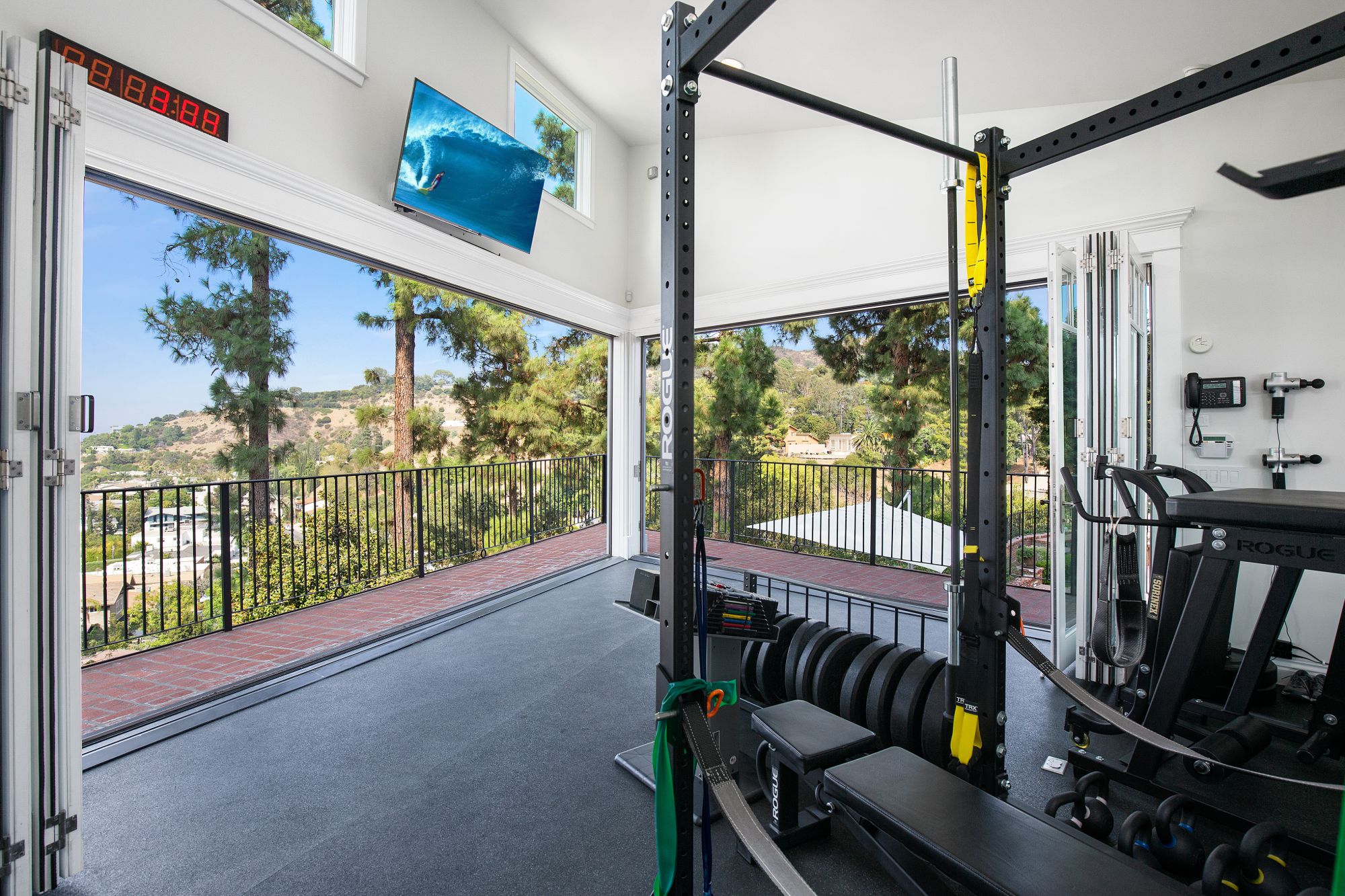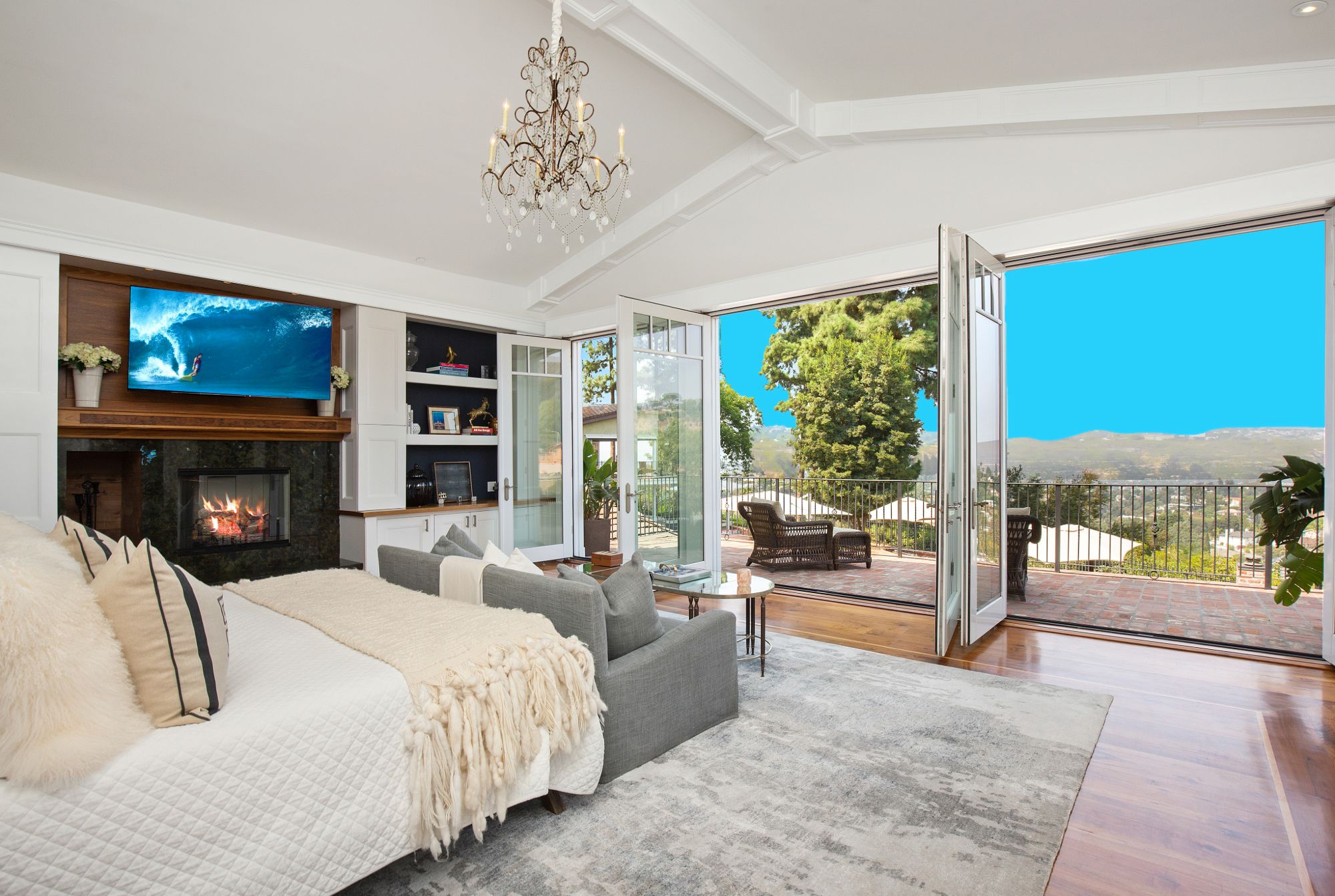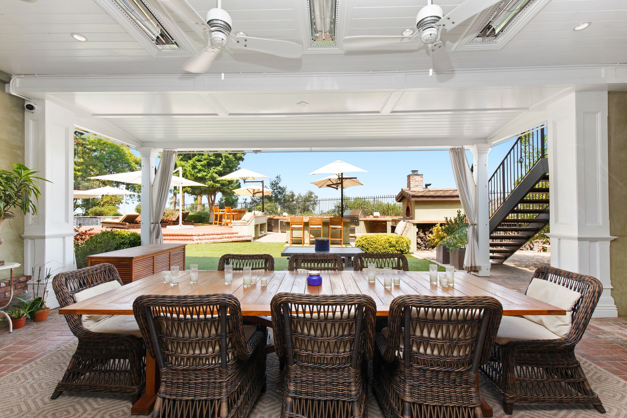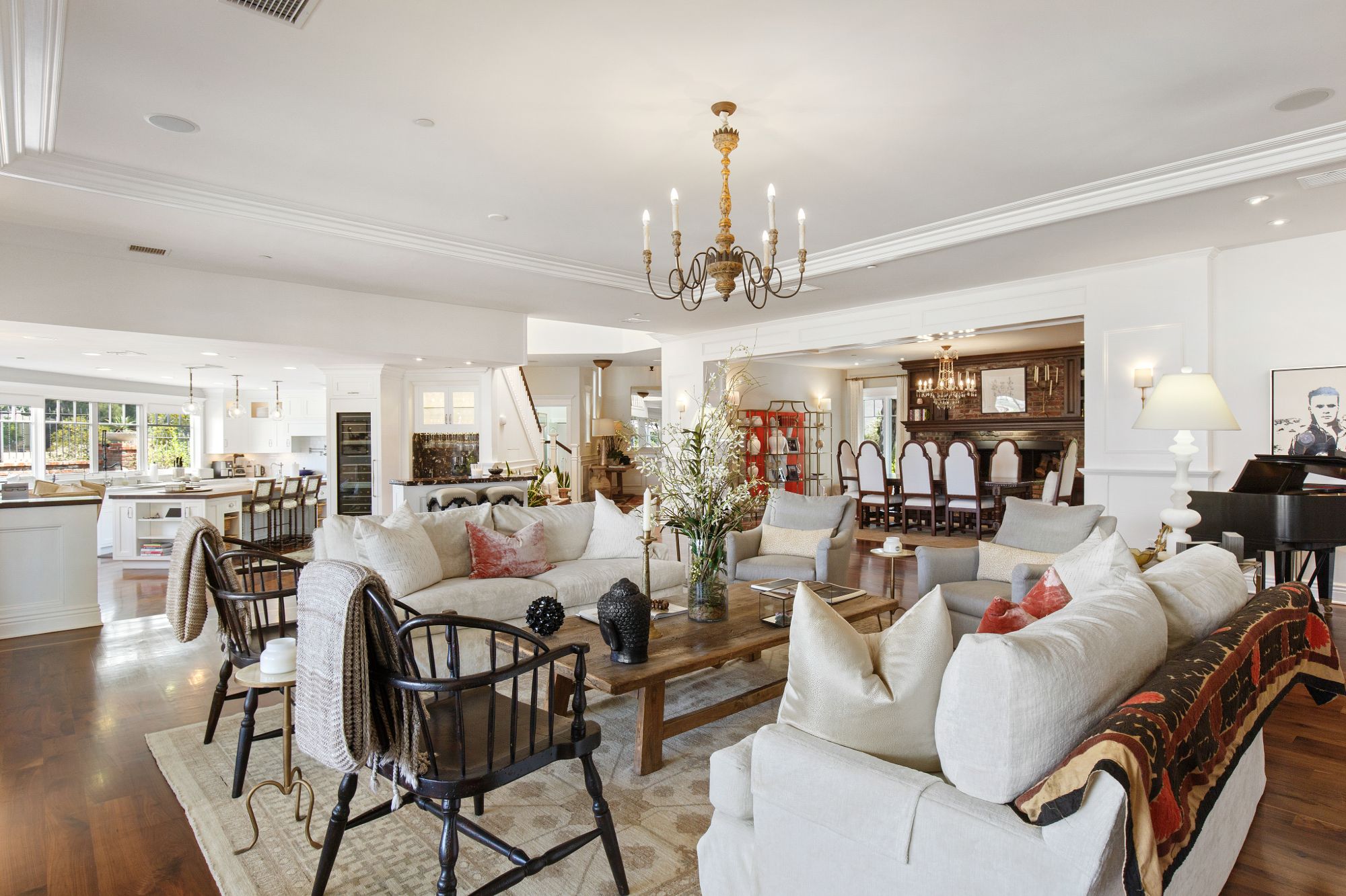 Stunning private, gated estate set on over half an acre of land with expansive city & mountain views. Near the coveted Fryman Estates hiking trails, and just 2 miles from world famous Sunset Strip shopping & dining. This luxurious resort like estate was once home to Hollywood icon Mickey Rooney. The traditional 6 bed, 8 bath main house is complimented by a two-story English brick guesthouse and two-story gym & spa. A dramatic open floor plan ties together the main living spaces including a living room with home theater, formal living area, dining room and kitchen that all open to the outdoors, bringing the inside out. A gourmet chef's kitchen includes Carrera marble counters & top of the line appliances. Luxurious master retreat includes large private terrace with stunning city views, fireplace, walk-in steam shower & spa tub. Grounds feature a pool, spa, massage area, steam room & sauna, full gym, Koi pond, outdoor fire pits, waterfall, outdoor kitchen with full bar & wood-fire pizza oven.