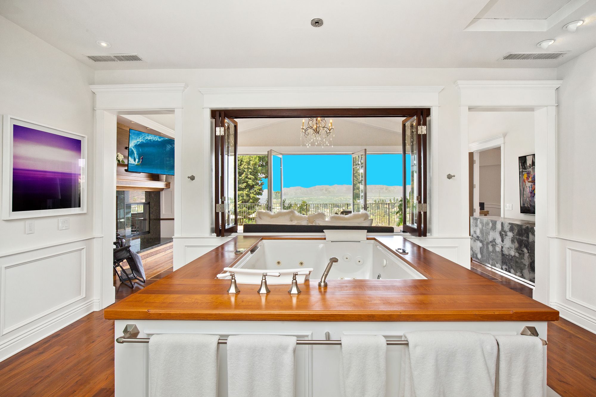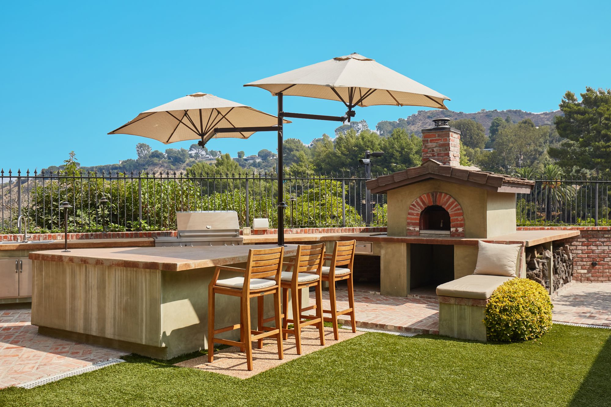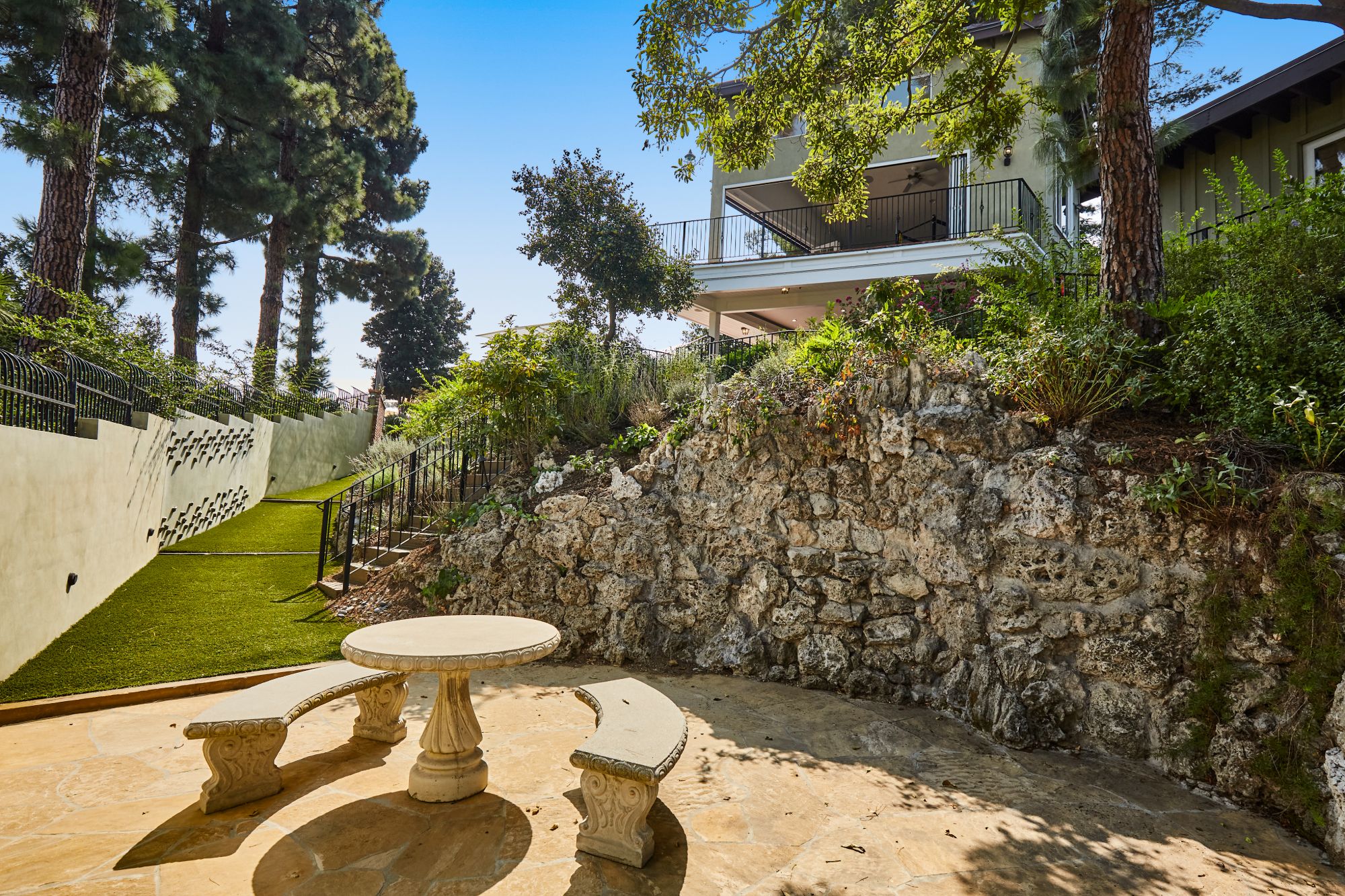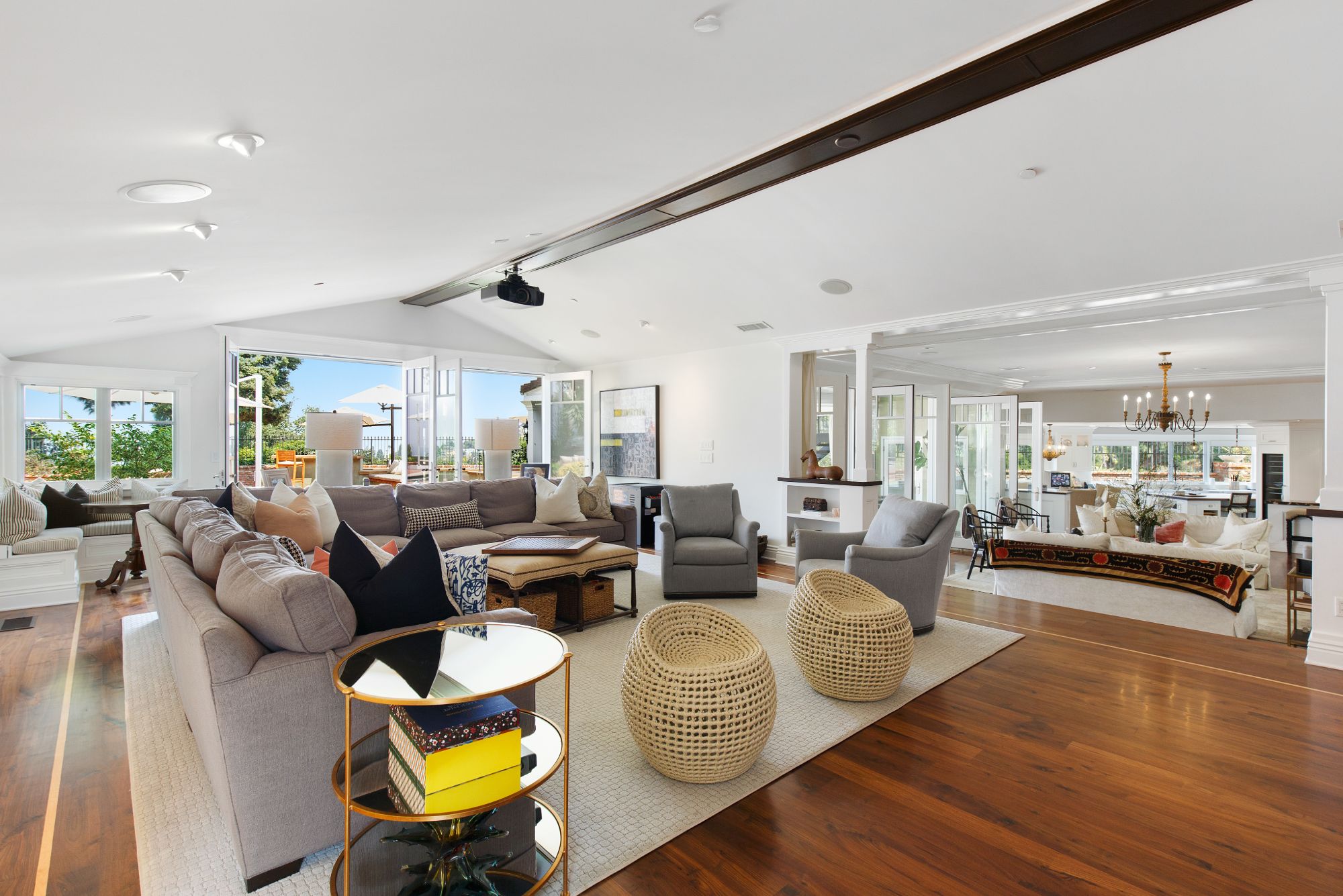 Stunning private, gated estate set on over half an acre of land with expansive city & mountain views. Near the coveted Fryman Estates hiking trails, and just 2 miles from world famous Sunset Strip shopping & dining. This luxurious resort like estate was once home to Hollywood icon Mickey Rooney. The traditional 6 bed, 8 bath main house is complimented by a two-story English brick guesthouse and two-story gym & spa. A dramatic open floor plan ties together the main living spaces including a living room with home theater, formal living area, dining room and kitchen that all open to the outdoors, bringing the inside out. A gourmet chef's kitchen includes Carrera marble counters & top of the line appliances. Luxurious master retreat includes large private terrace with stunning city views, fireplace, walk-in steam shower & spa tub. Grounds feature a pool, spa, massage area, steam room & sauna, full gym, Koi pond, outdoor fire pits, waterfall, outdoor kitchen with full bar & wood-fire pizza oven.
