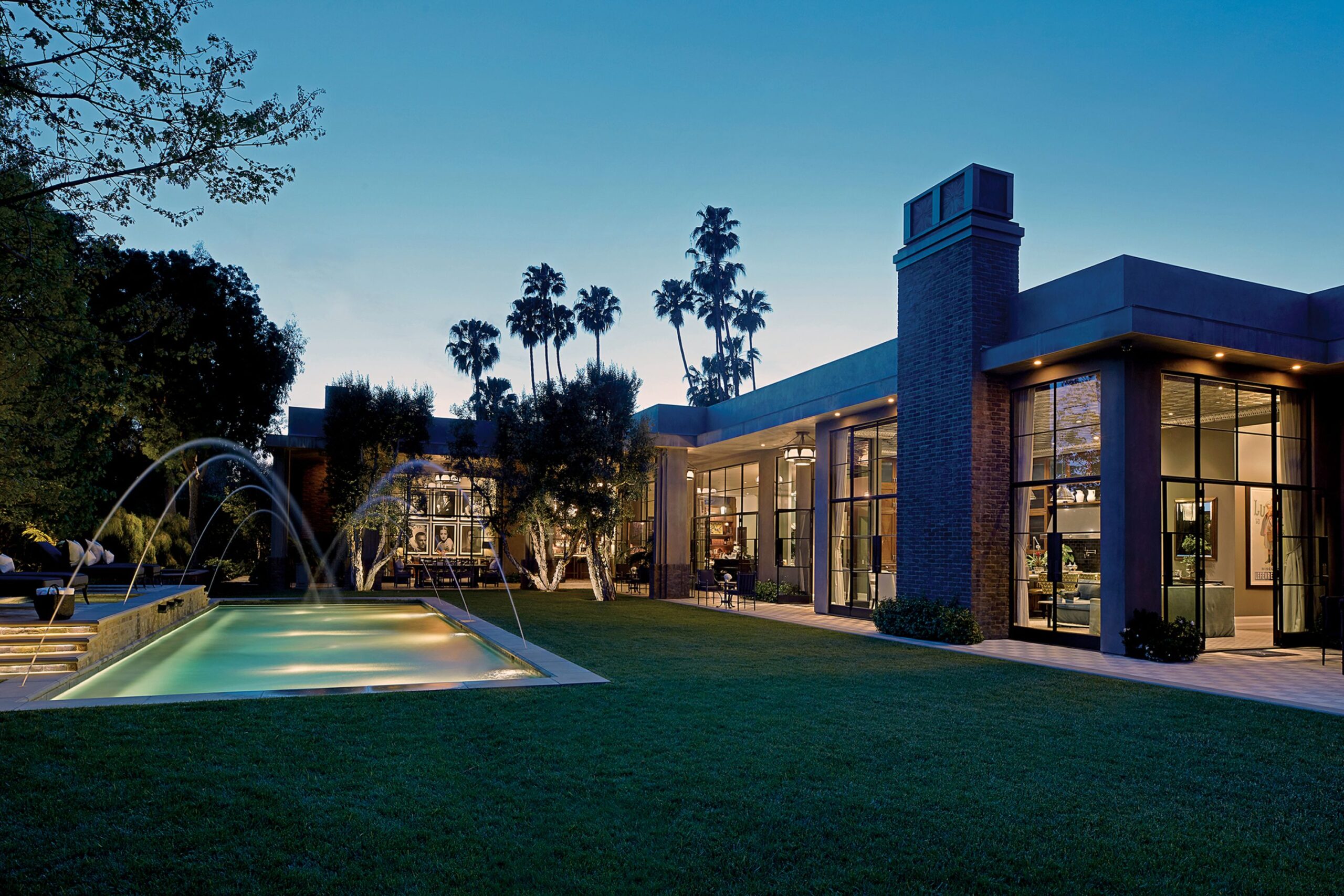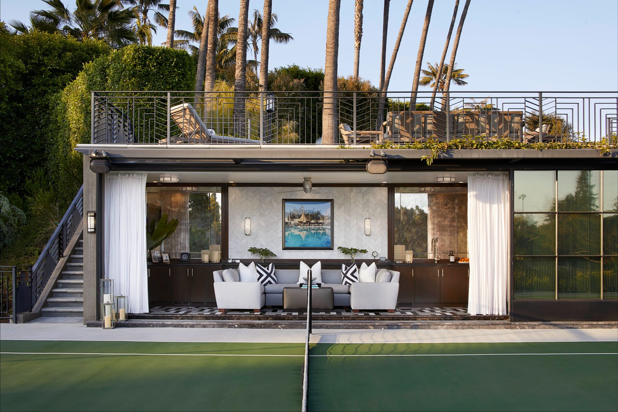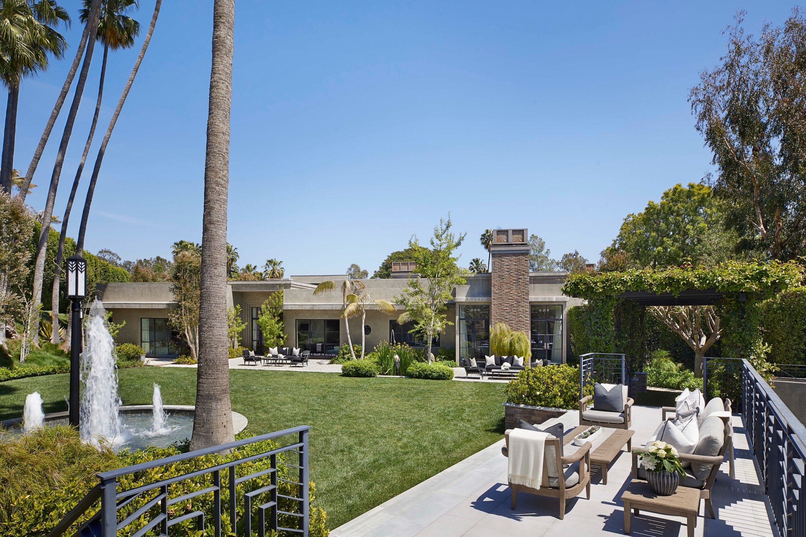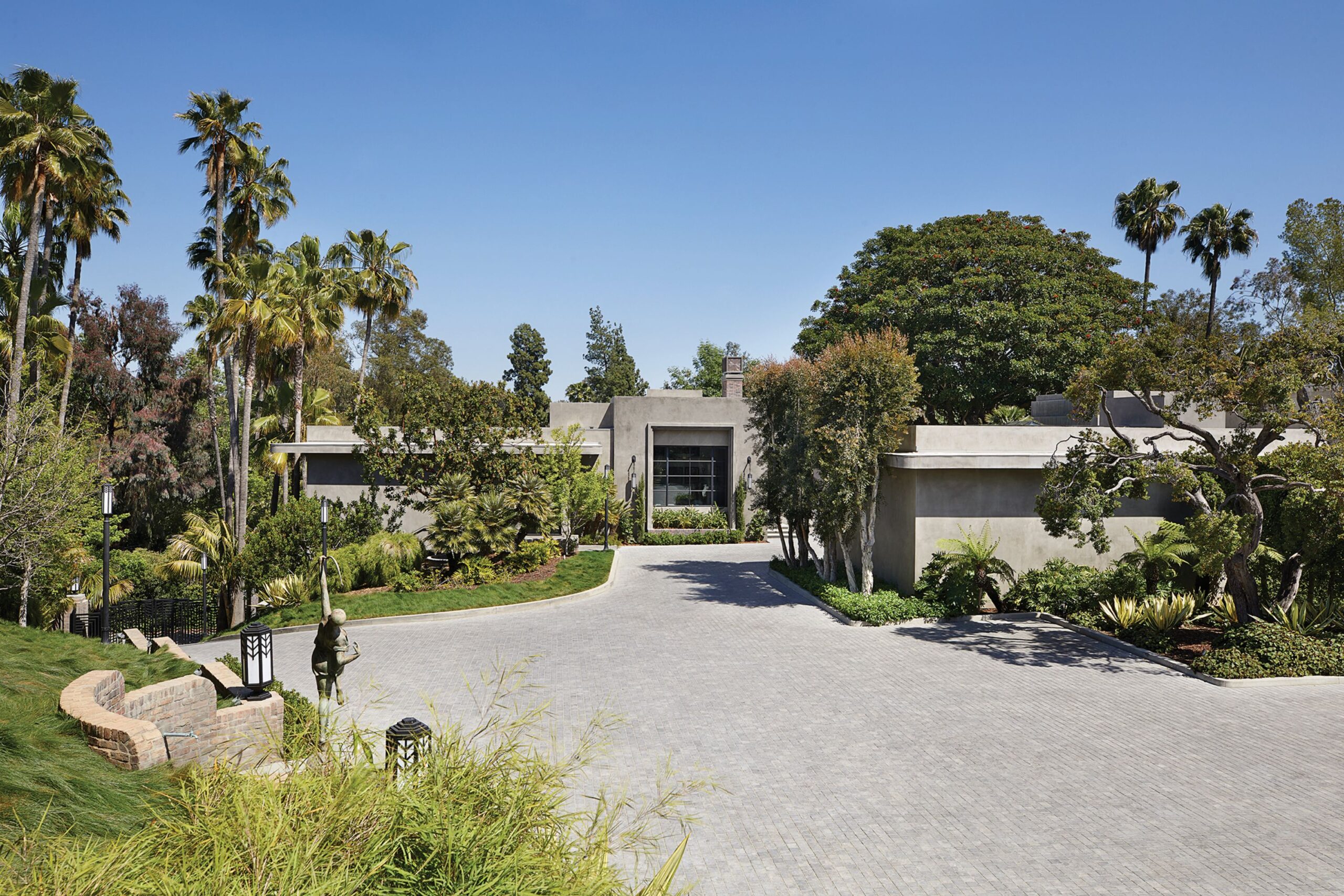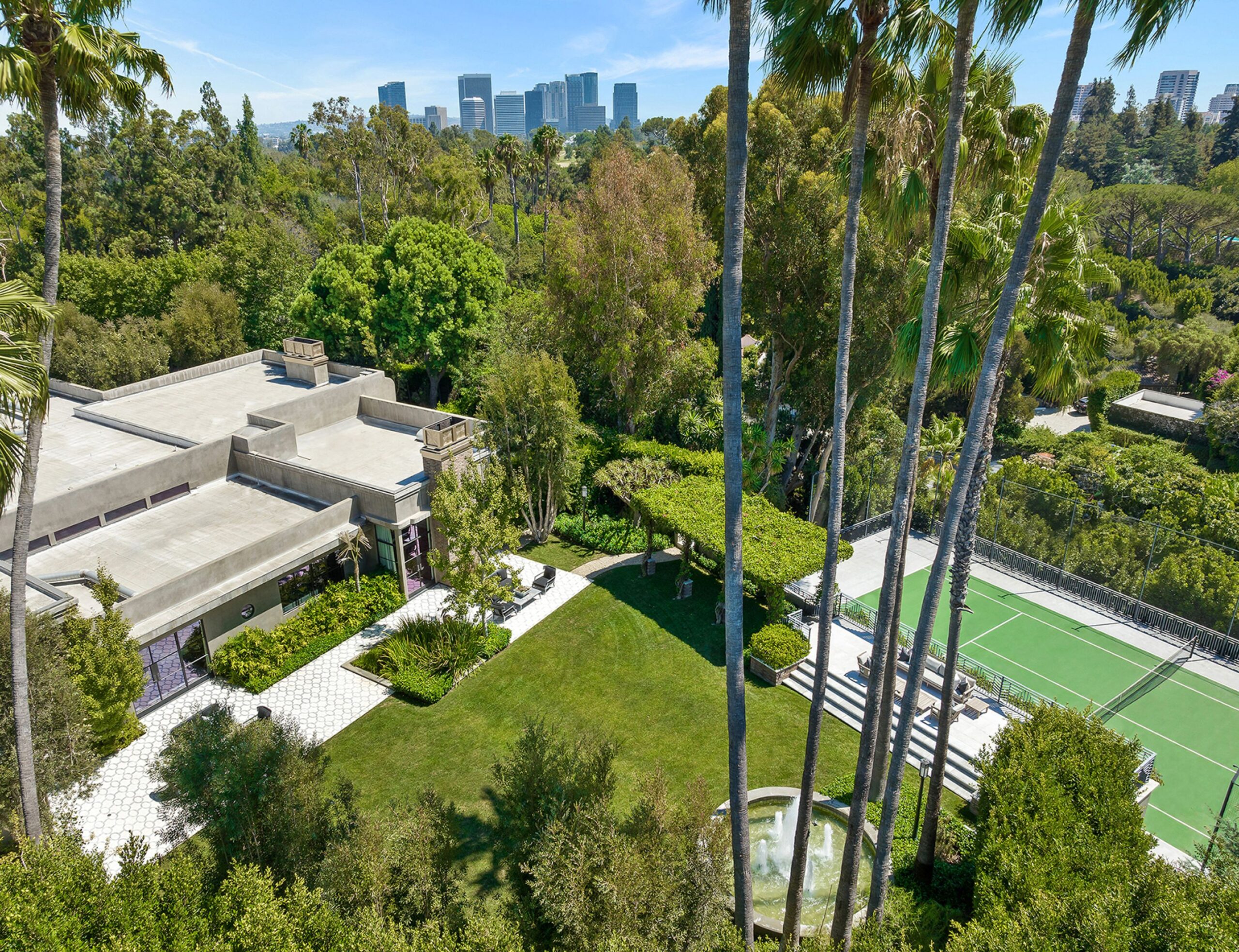 The Reserve is an extraordinary, architecturally significant estate situated on two ultra-private acres in the heart of Holmby Hills. Surrounded by swaying palm trees, lush forestry and immaculate landscaping, this secluded oasis is an exceptional vision of modernist architecture. The Reserve was recently refined by a team of expert designers and international craftsman who have carefully expanded the estate to create two properties that function for modern day living whilst exuding old Hollywood glamour. At 11,000-square feet on a single story, the main house's proportions are palatial. The ceilings are a spectacular 14-feet high, and vast floor-to ceiling windows offer uninterrupted views of the beautifully landscaped gardens, water features and the 50-foot swimming pool. Inside the house there are five spacious bedroom suites including a master wing, as well as a tremendous family kitchen/dining room, wine room, two magnificent living spaces featuring a Hollywood art deco bar and formal lounge for entertaining, a 1920s French regency-style cinema, a tranquil study and a spectacular playroom. The most significant addition to the estate is the three-story guest house. At 10,000-squarefeet, it is as luxurious and imposing as the main house, with five large bedroom suites, seven bathrooms, a kitchen and living area, gymnasium, spa, and a carport. It has been thoughtfully designed so that the lower level can operate as an independent apartment. The front of the property elegantly mirrors the exact style and dimensions of the main house, with majestic pillars and huge floor-to ceiling windows, while the rear of the house is an impressive three-story architectural spectacle, revealed through lush greenery.