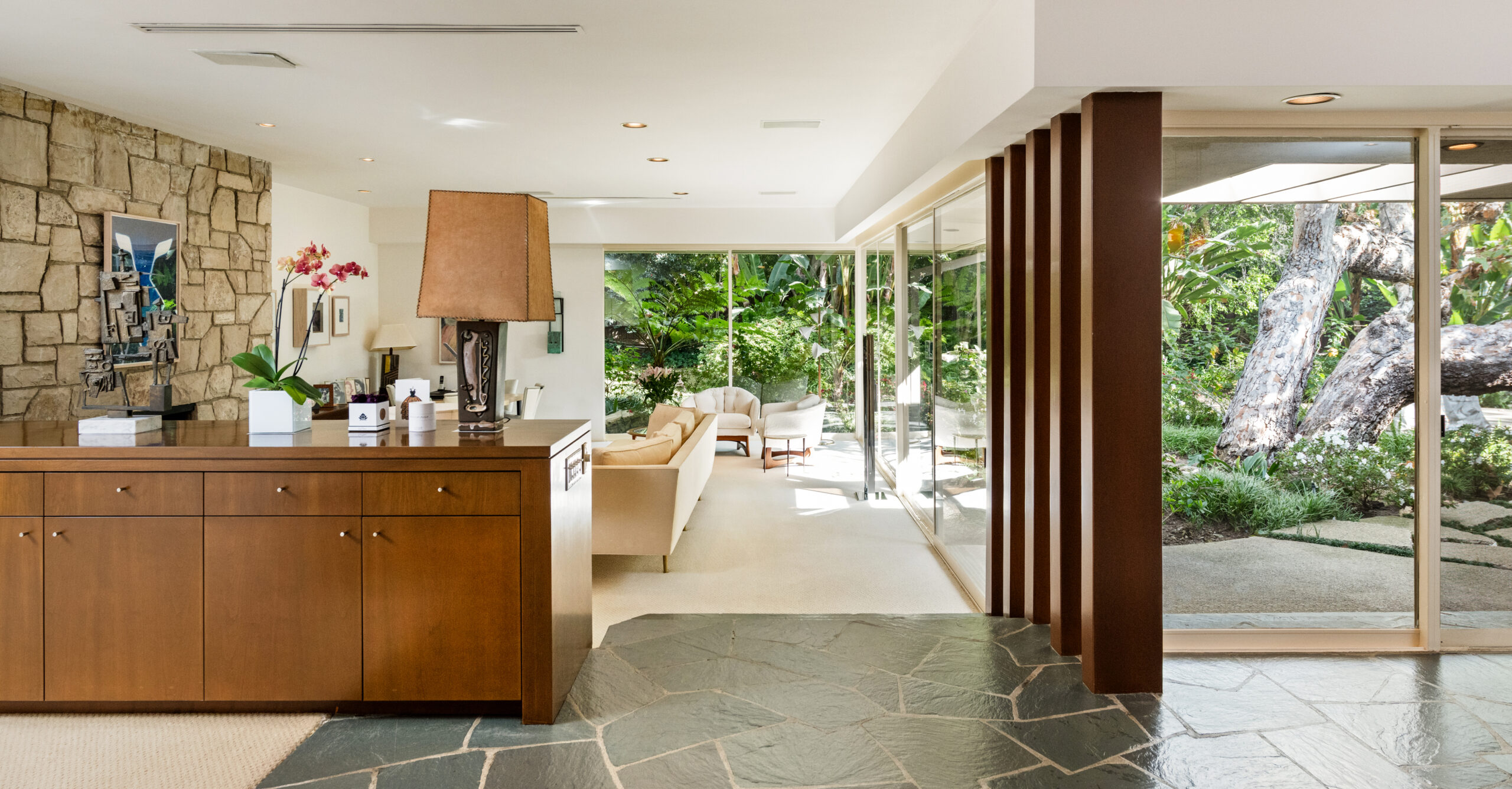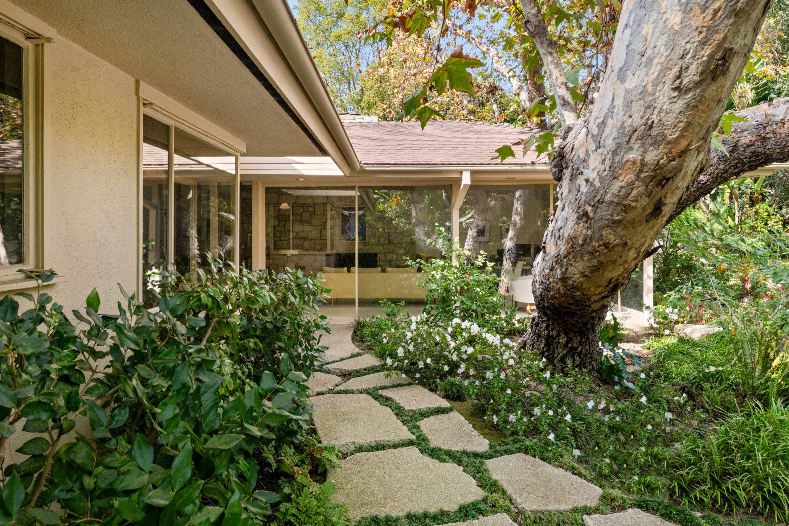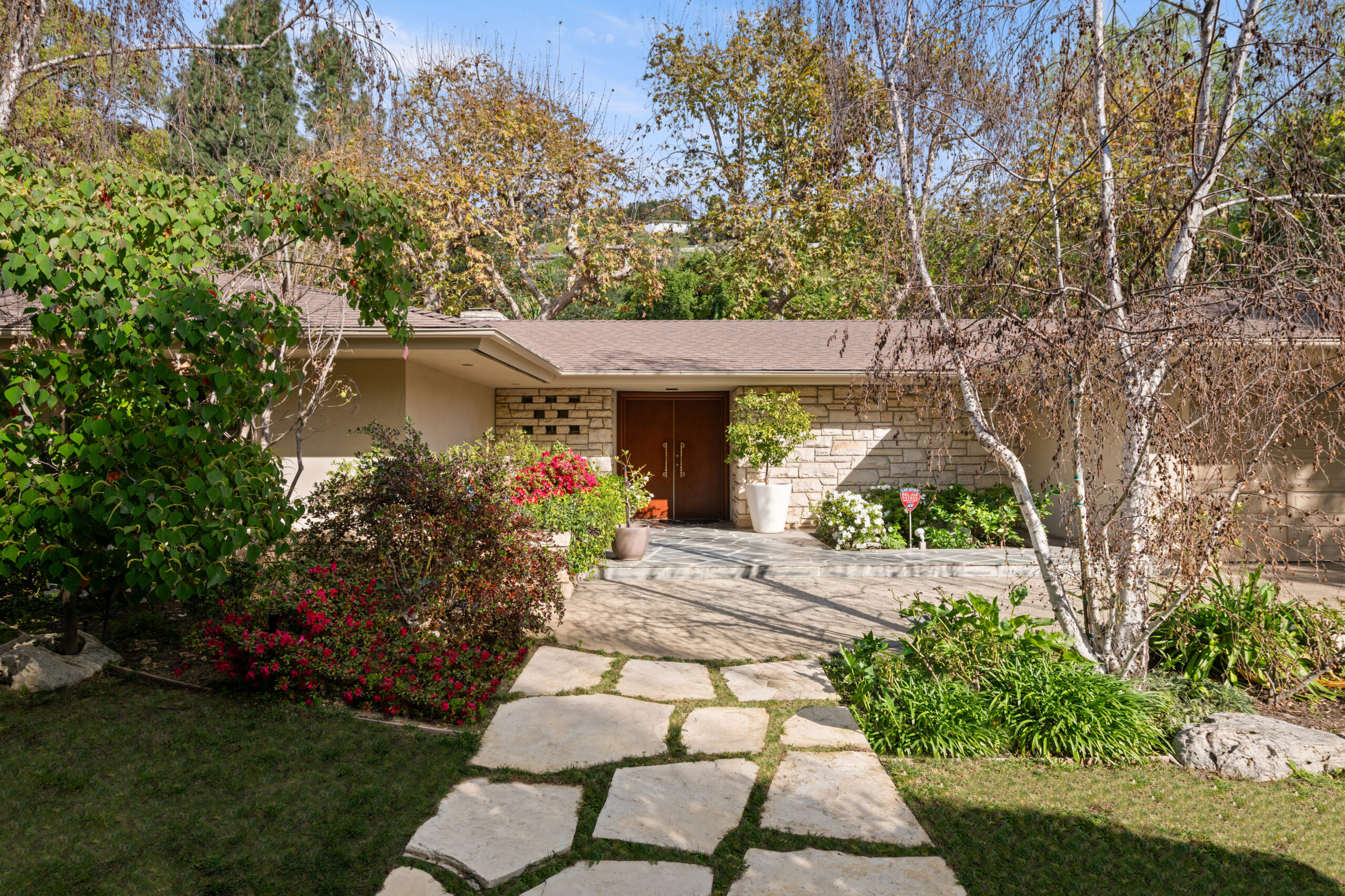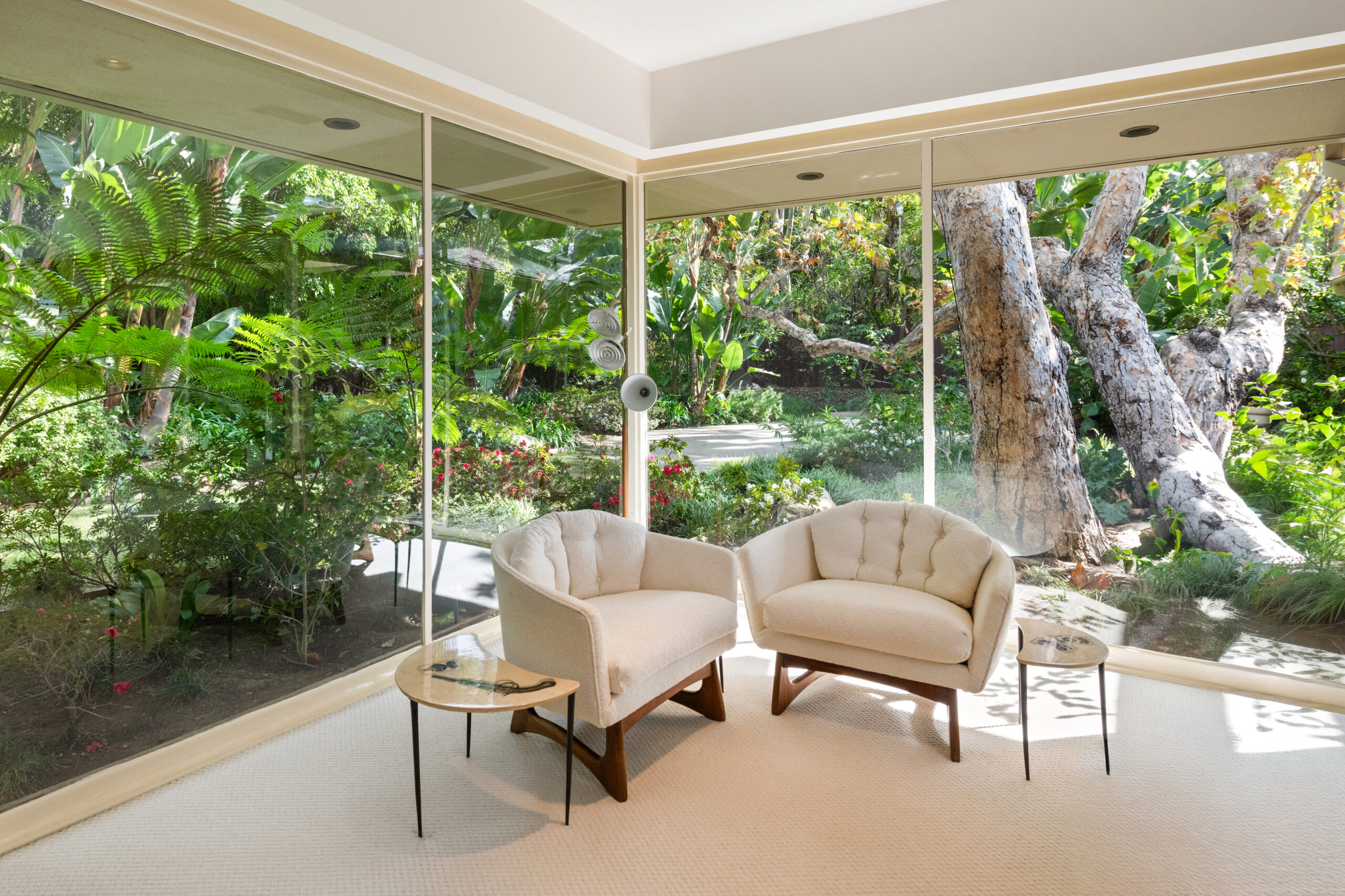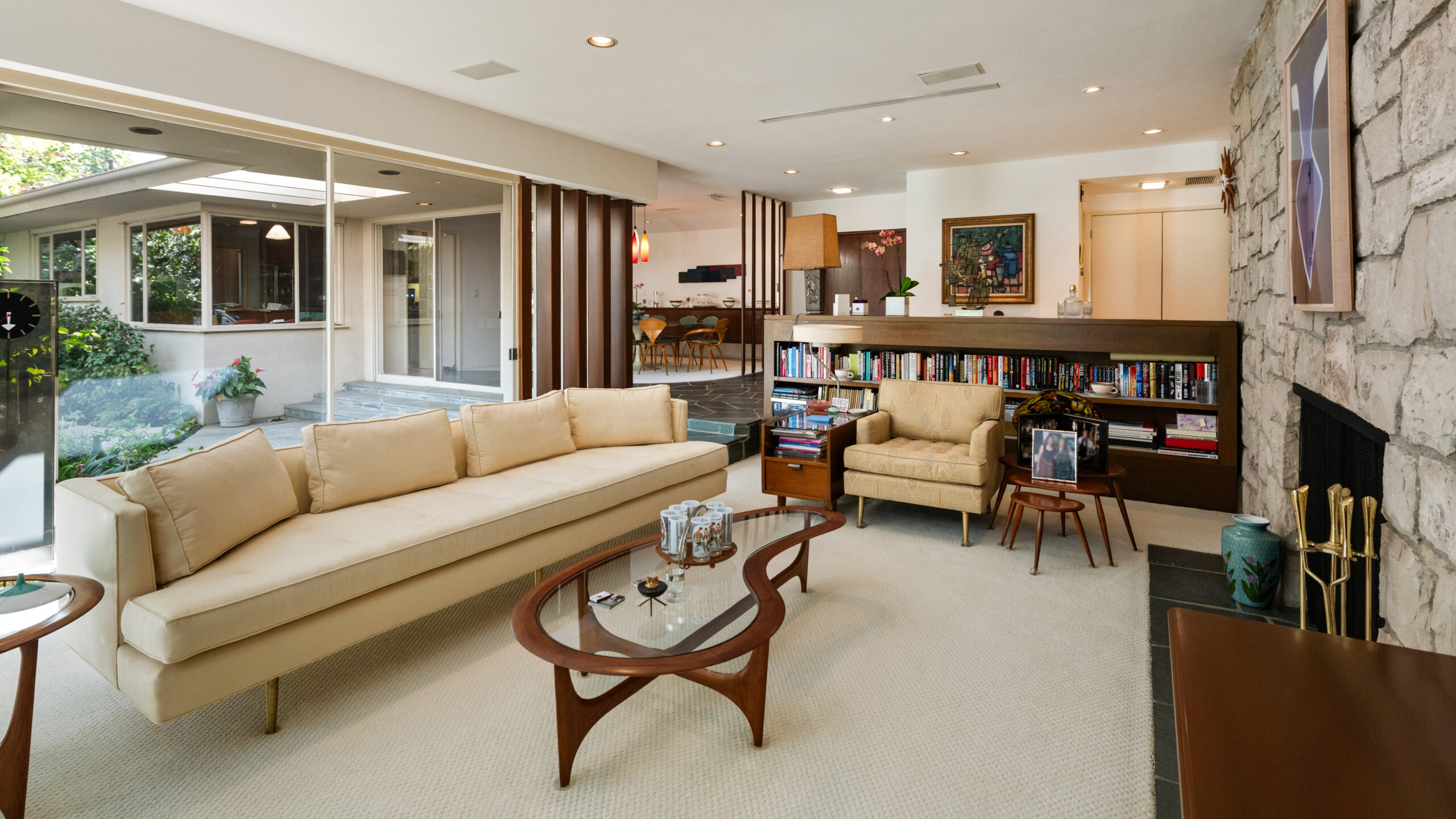 Set on the best street in Beverly Hills, this meticulous Mid-Century home seamlessly blends architecture and nature. Privately set behind mature landscaping, the home embodies classic California living with timeless appeal. Walls of glass line the main living spaces, filling the interiors with natural light and framing serene garden views throughout. A striking stone fireplace anchors the living room, complemented by rich wood accents, custom built-ins, and clean mid-century lines preserved with care. The living and dining areas flow effortlessly to multiple patios and a lush, private backyard, ideal for indoor-outdoor living and entertaining. A glass-wrapped sitting area offers a tranquil retreat overlooking the grounds, while the bedrooms enjoy peaceful garden outlooks and exceptional privacy. The expansive backyard, surrounded by mature trees, feels like a secluded oasis with room to relax, entertain, or reimagine. A rare offering on an oversized lot in Beverly Hills, this is a beautifully maintained Mid-Century classic. Elegant, private, and timeless.
