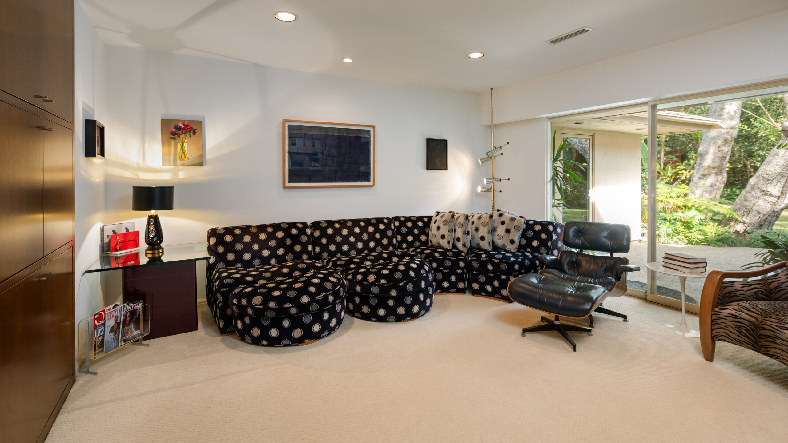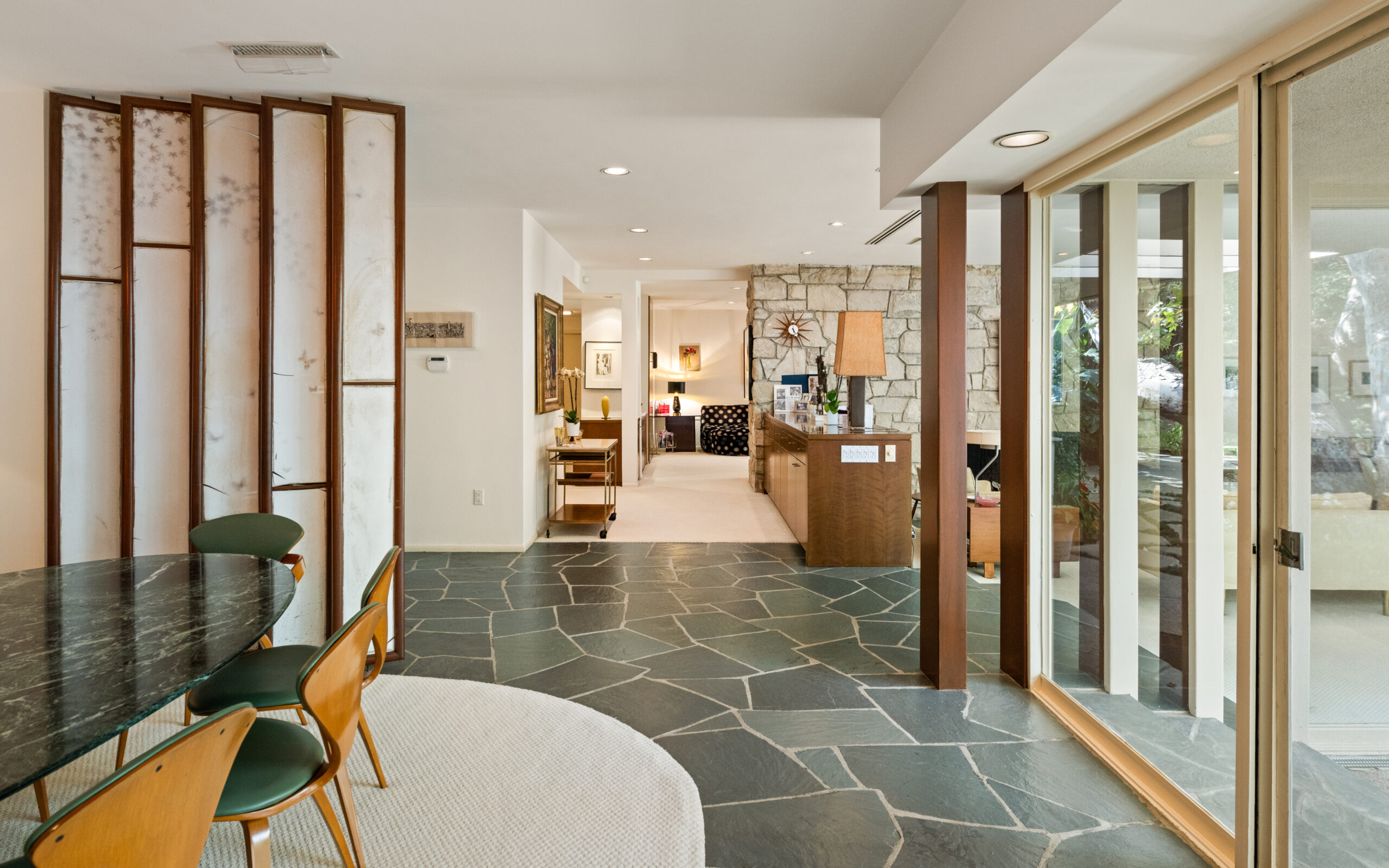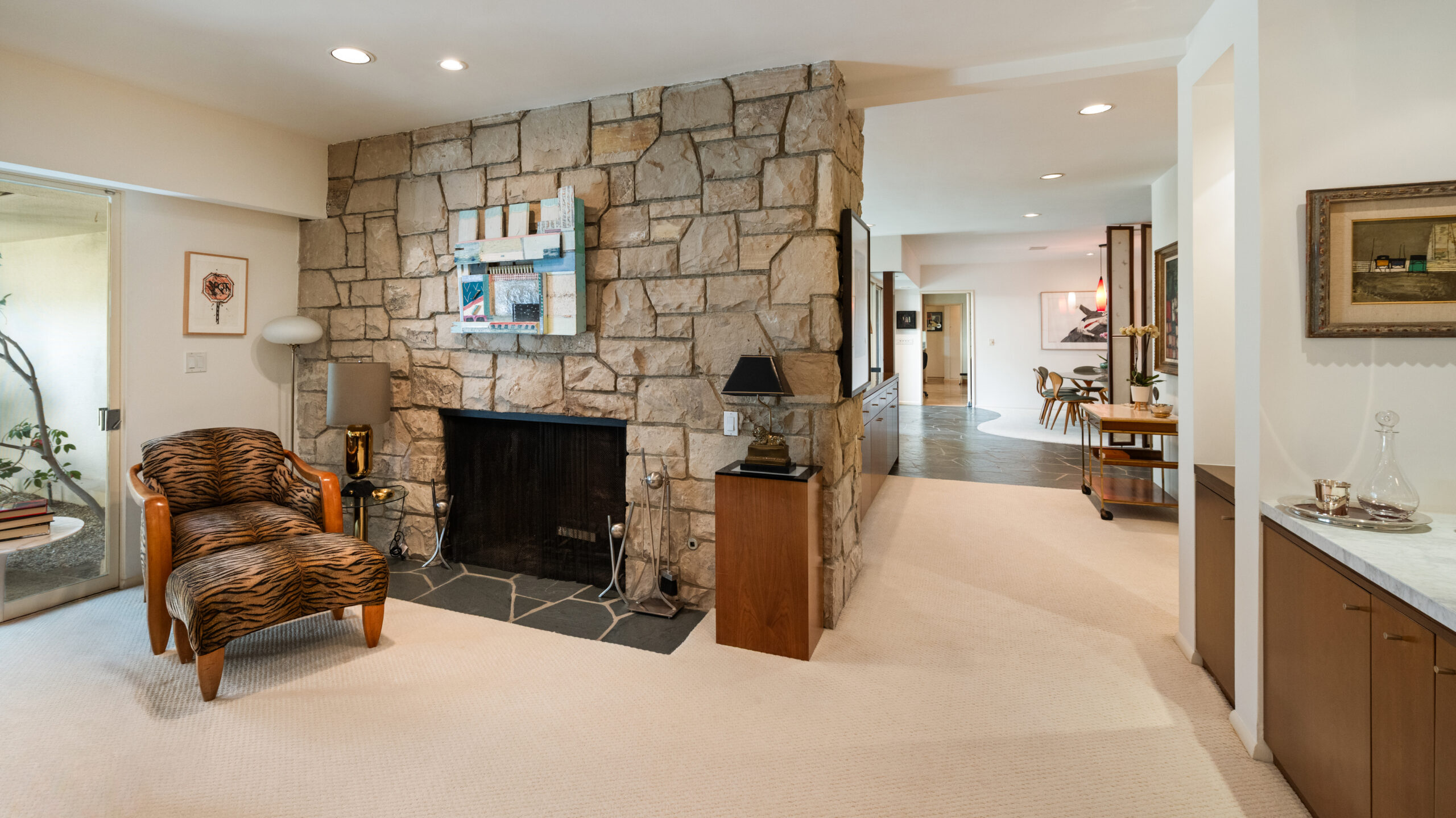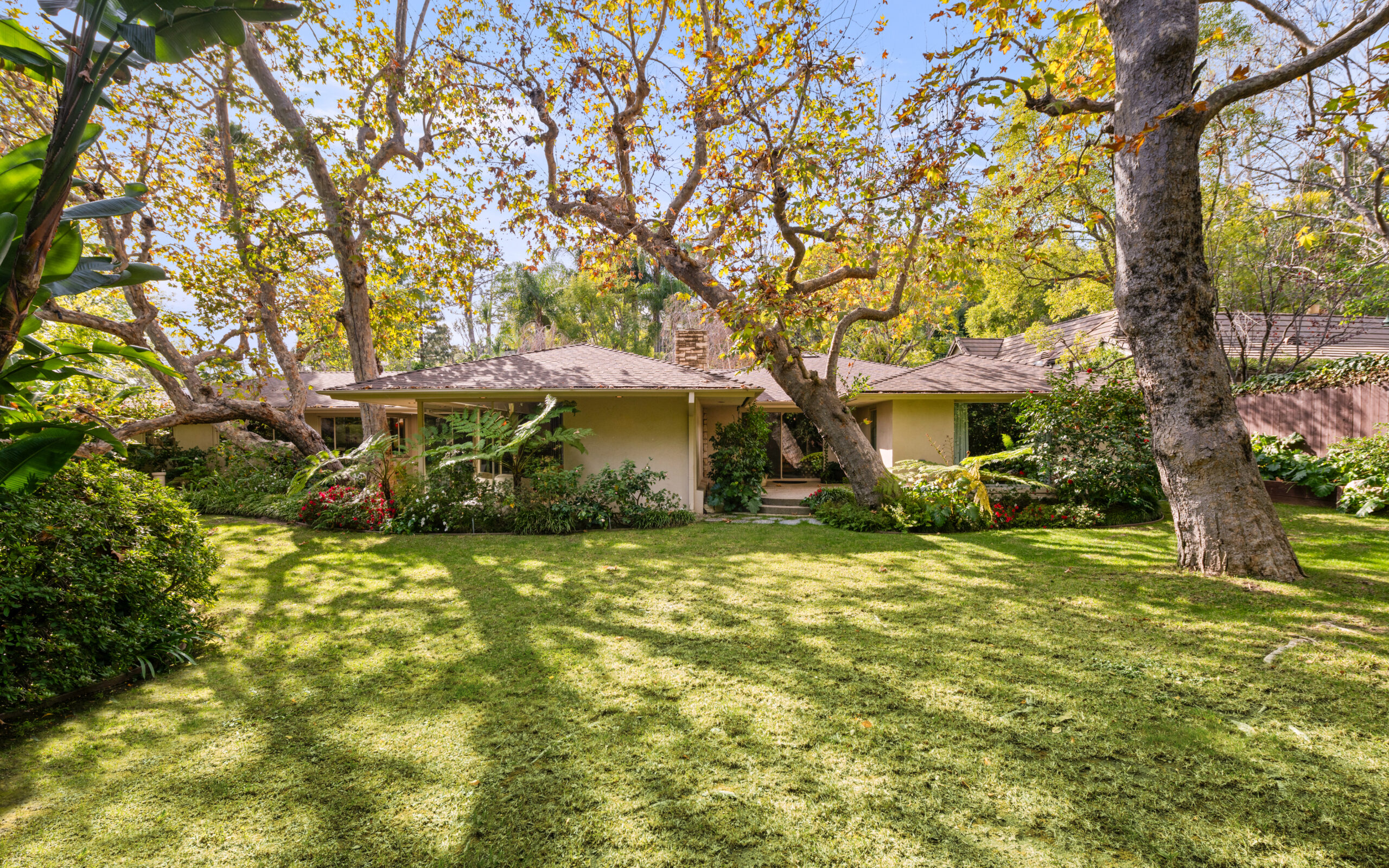 Set on the best street in Beverly Hills, this meticulous Mid-Century home seamlessly blends architecture and nature. Privately set behind mature landscaping, the home embodies classic California living with timeless appeal. Walls of glass line the main living spaces, filling the interiors with natural light and framing serene garden views throughout. A striking stone fireplace anchors the living room, complemented by rich wood accents, custom built-ins, and clean mid-century lines preserved with care. The living and dining areas flow effortlessly to multiple patios and a lush, private backyard, ideal for indoor-outdoor living and entertaining. A glass-wrapped sitting area offers a tranquil retreat overlooking the grounds, while the bedrooms enjoy peaceful garden outlooks and exceptional privacy. The expansive backyard, surrounded by mature trees, feels like a secluded oasis with room to relax, entertain, or reimagine. A rare offering on an oversized lot in Beverly Hills, this is a beautifully maintained Mid-Century classic. Elegant, private, and timeless.