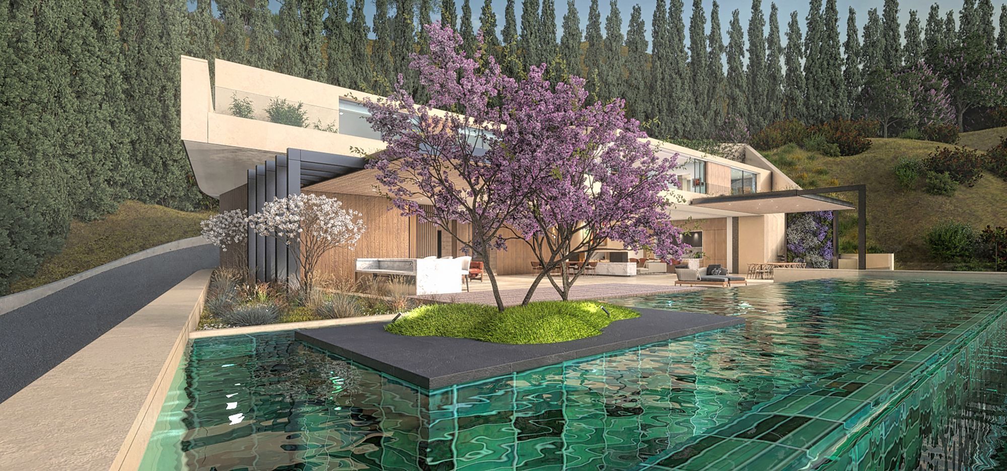 Carefully sited within the prestigious Sunset Doheny Estates neighborhood on a 1.5 acre promontory. The Doheny Crest residence is situated along a fully-gated, 575 foot long private street and has direct access from both Doheny Drive through Doheny Estates and Sunset Plaza - private, secure, gated (Sunset Plaza neighborhood). Ready to build, permits approved 12,500 SF estate, a combination of dynamic volumes tempered with warm material palette of finely detailed stone, timber and rendered finishes. The exterior terrace is edged by a 70' infinity pool and includes a large covered dining area, multiple garden spaces. Carefully crafted floorplan capturing both views and privacy. The unique security of this property offers attributes very rarely seen. Comprised of two separate developable parcels, the neighborhood's most private home is perfectly aligned to a spectacular Century City view and features sweeping vistas from the Sunset Strip to the ocean.