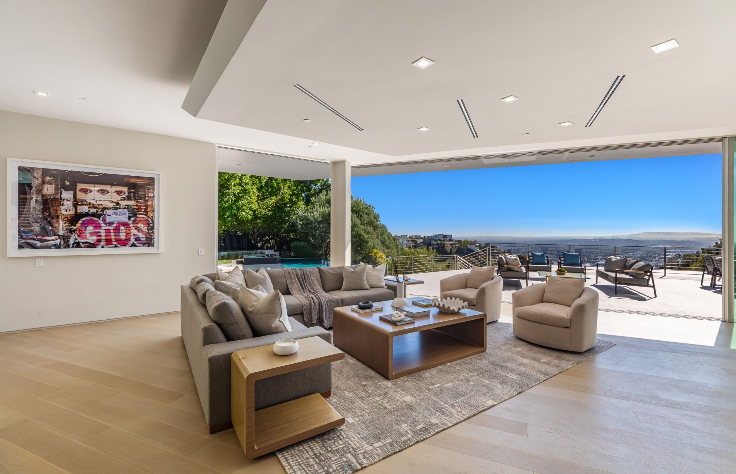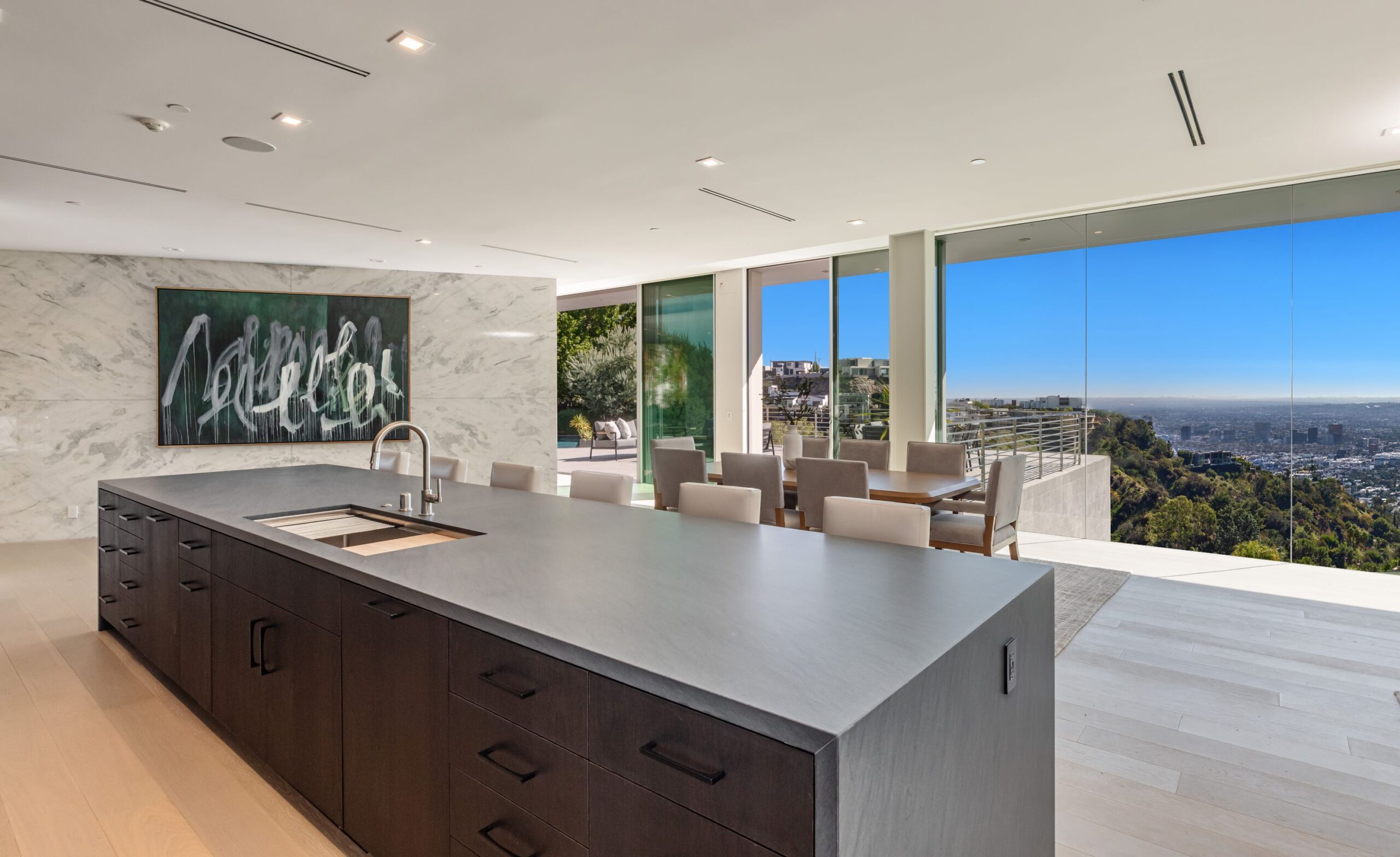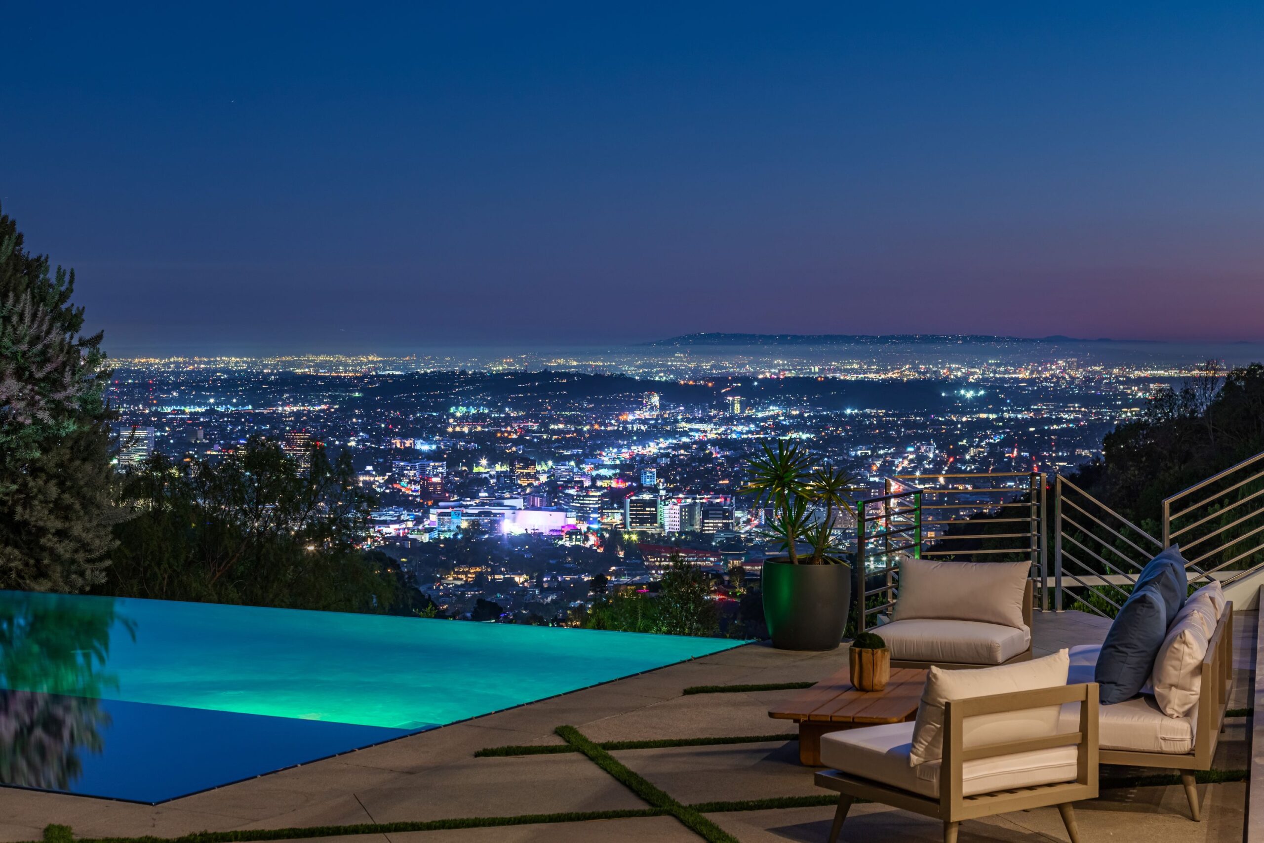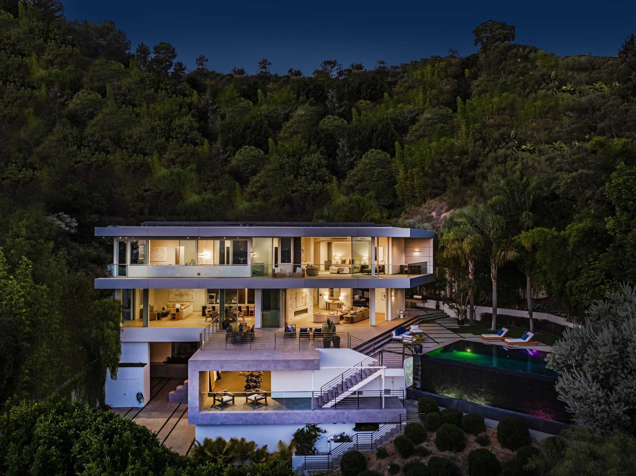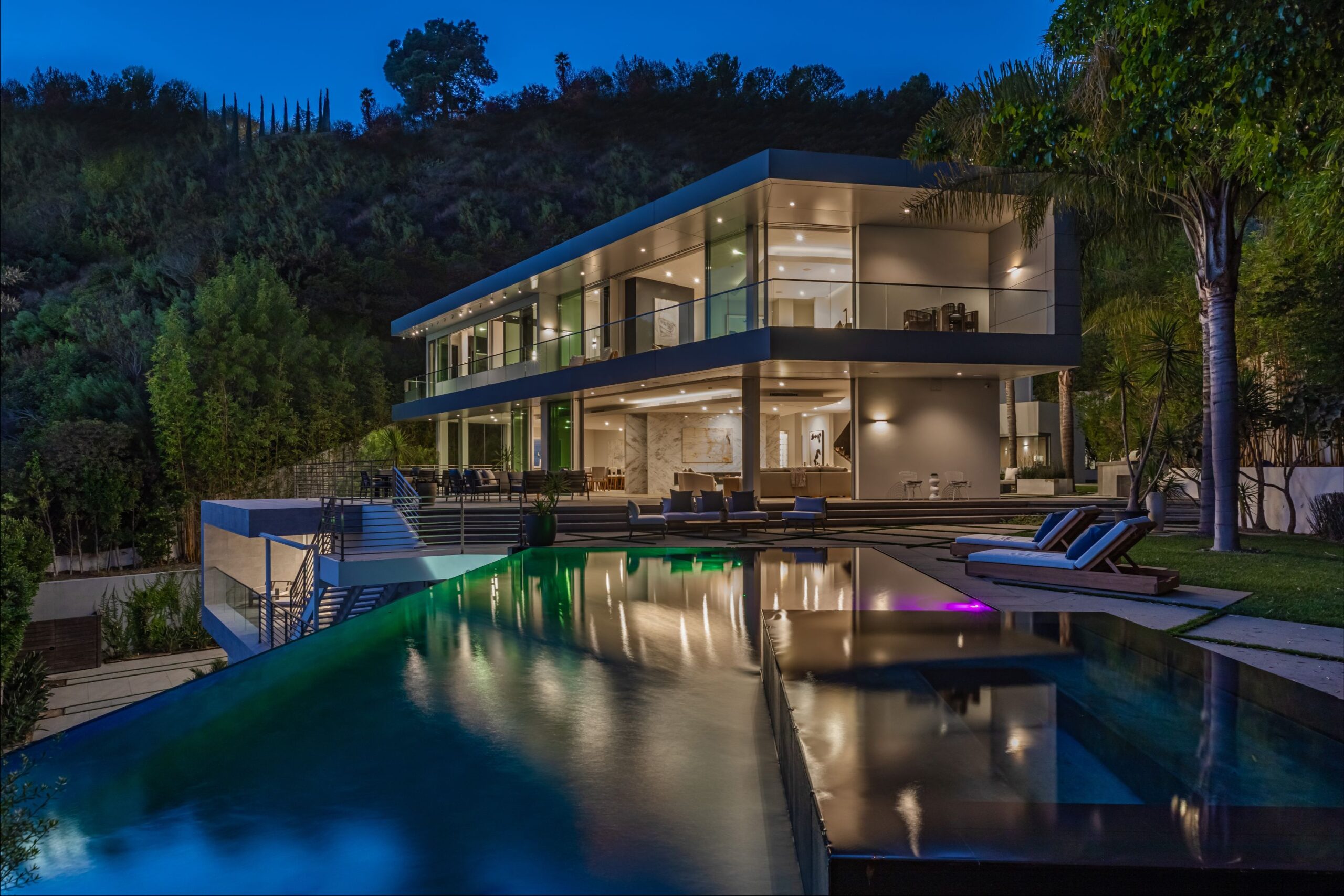 Perched at the top of Rising Glen, tucked away behind a private gate, sits this reimagined architectural estate. Spanning approximately 9,400 square feet, the 6-bedroom, 9-bathroom home blurs the line between indoor and outdoor living. Designed for entertaining on every scale, it features floor-to-ceiling glass walls that frame sweeping views from downtown to the ocean, filling each space with natural light. The open layout flows effortlessly to expansive terraces, outdoor dining areas, fireplaces, and an infinity-edge pool - creating a striking backdrop for gatherings. No detail has been overlooked - from the Poliform kitchen with Miele appliances to the elevator, gym, private theater, and temperature-controlled wine area. Every finish reflects thoughtful design, beautiful craftsmanship, and top-of-the-line construction throughout. With a 3-car garage, generous motor court parking, and total privacy just minutes from the heart of the city, this is a true modern sanctuary in the hills.