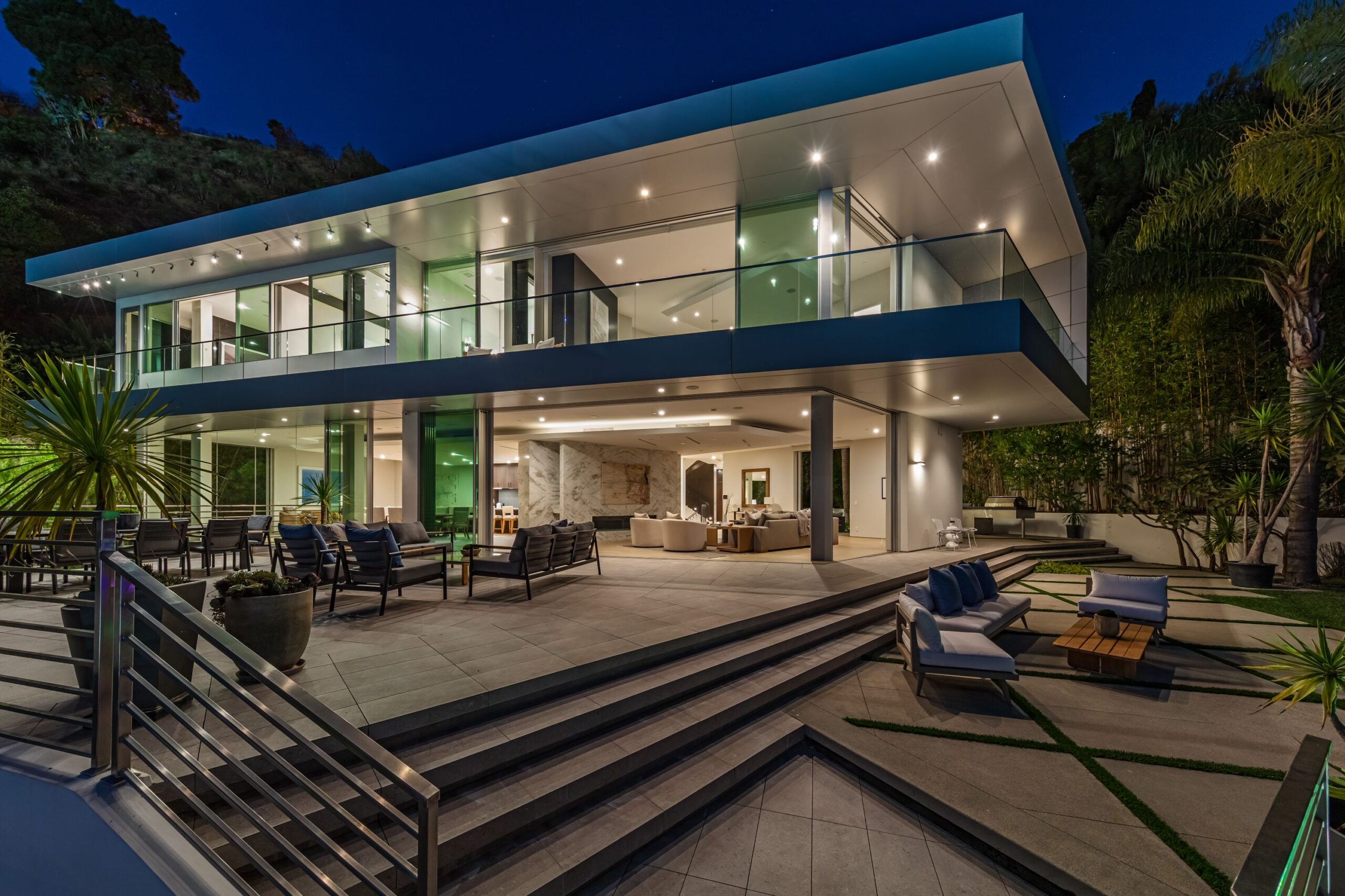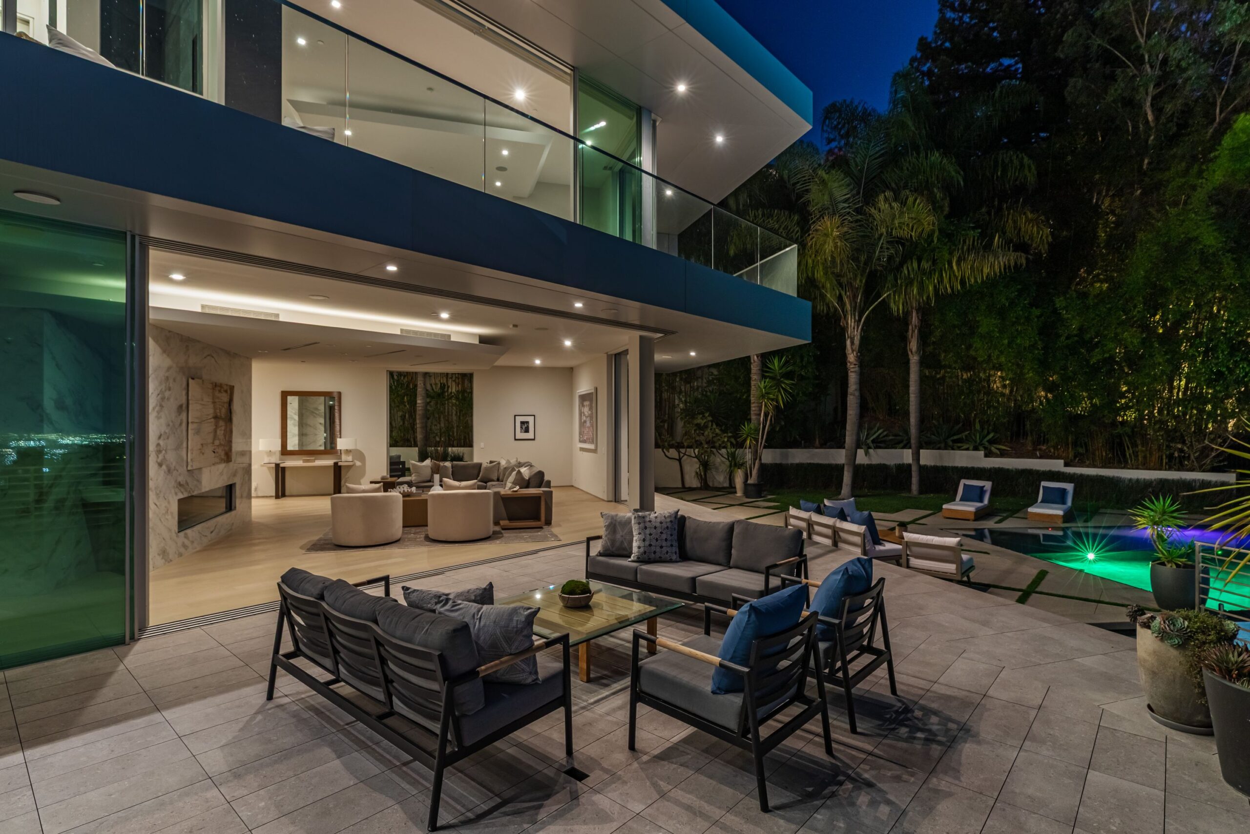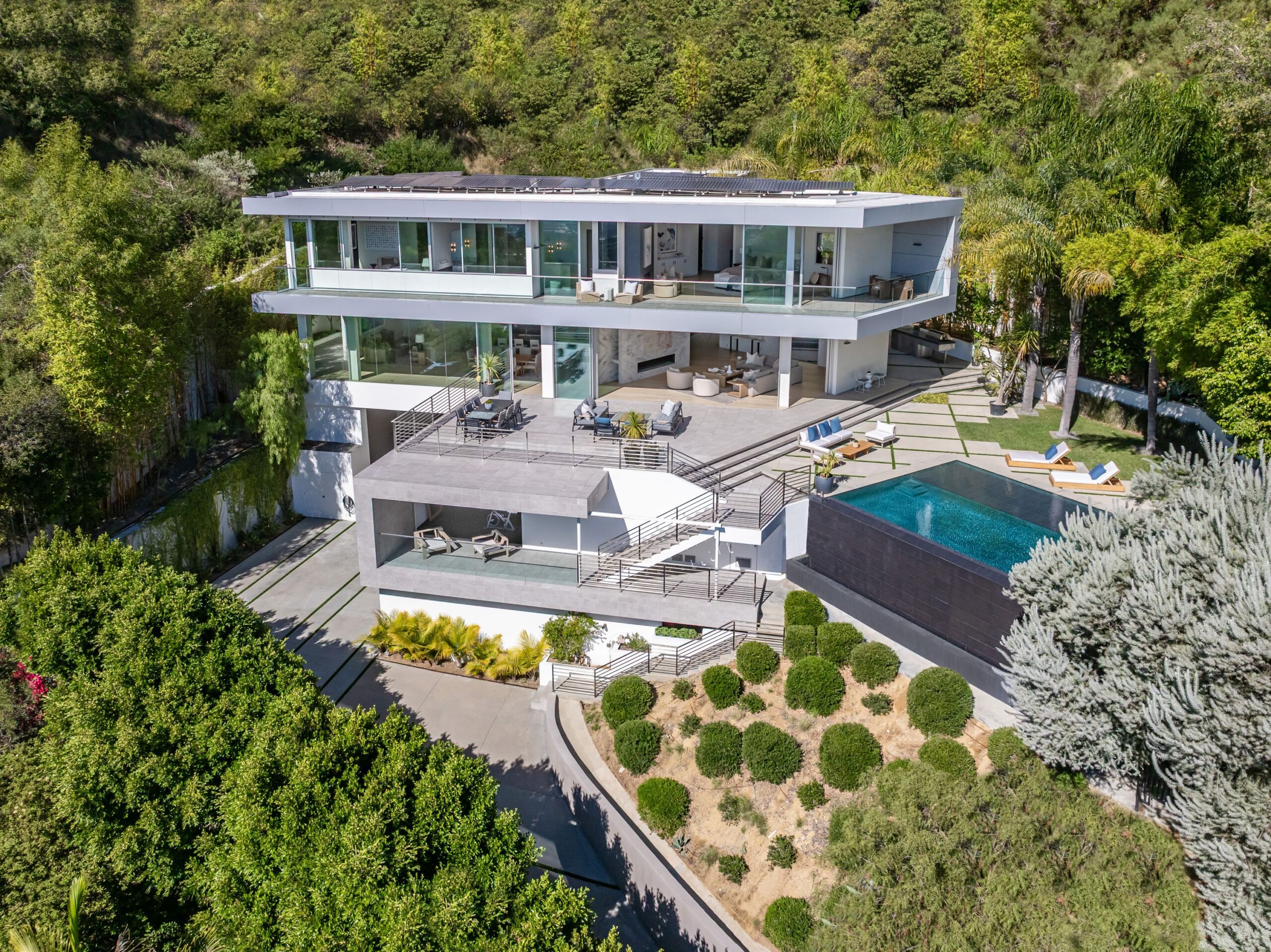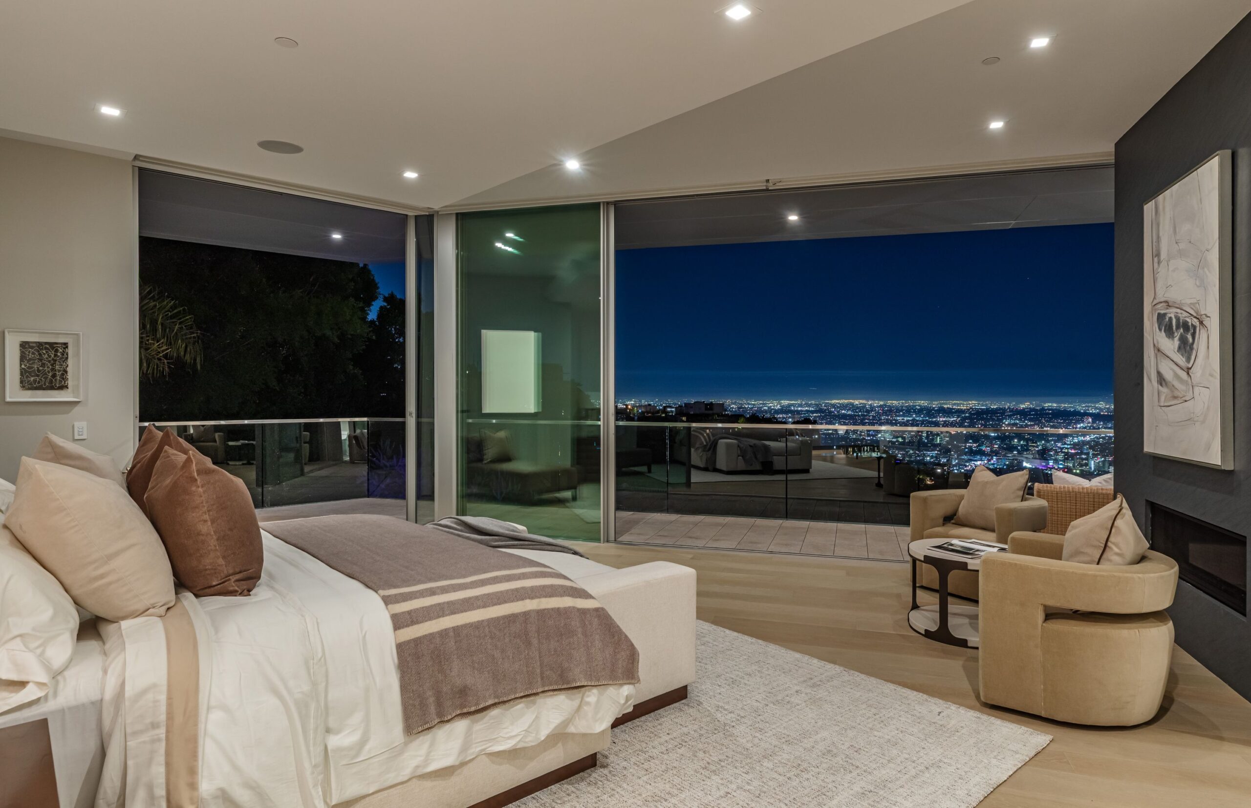 Perched at the top of Rising Glen, tucked away behind a private gate, sits this reimagined architectural estate. Spanning approximately 9,400 square feet, the 6-bedroom, 9-bathroom home blurs the line between indoor and outdoor living. Designed for entertaining on every scale, it features floor-to-ceiling glass walls that frame sweeping views from downtown to the ocean, filling each space with natural light. The open layout flows effortlessly to expansive terraces, outdoor dining areas, fireplaces, and an infinity-edge pool - creating a striking backdrop for gatherings. No detail has been overlooked - from the Poliform kitchen with Miele appliances to the elevator, gym, private theater, and temperature-controlled wine area. Every finish reflects thoughtful design, beautiful craftsmanship, and top-of-the-line construction throughout. With a 3-car garage, generous motor court parking, and total privacy just minutes from the heart of the city, this is a true modern sanctuary in the hills.