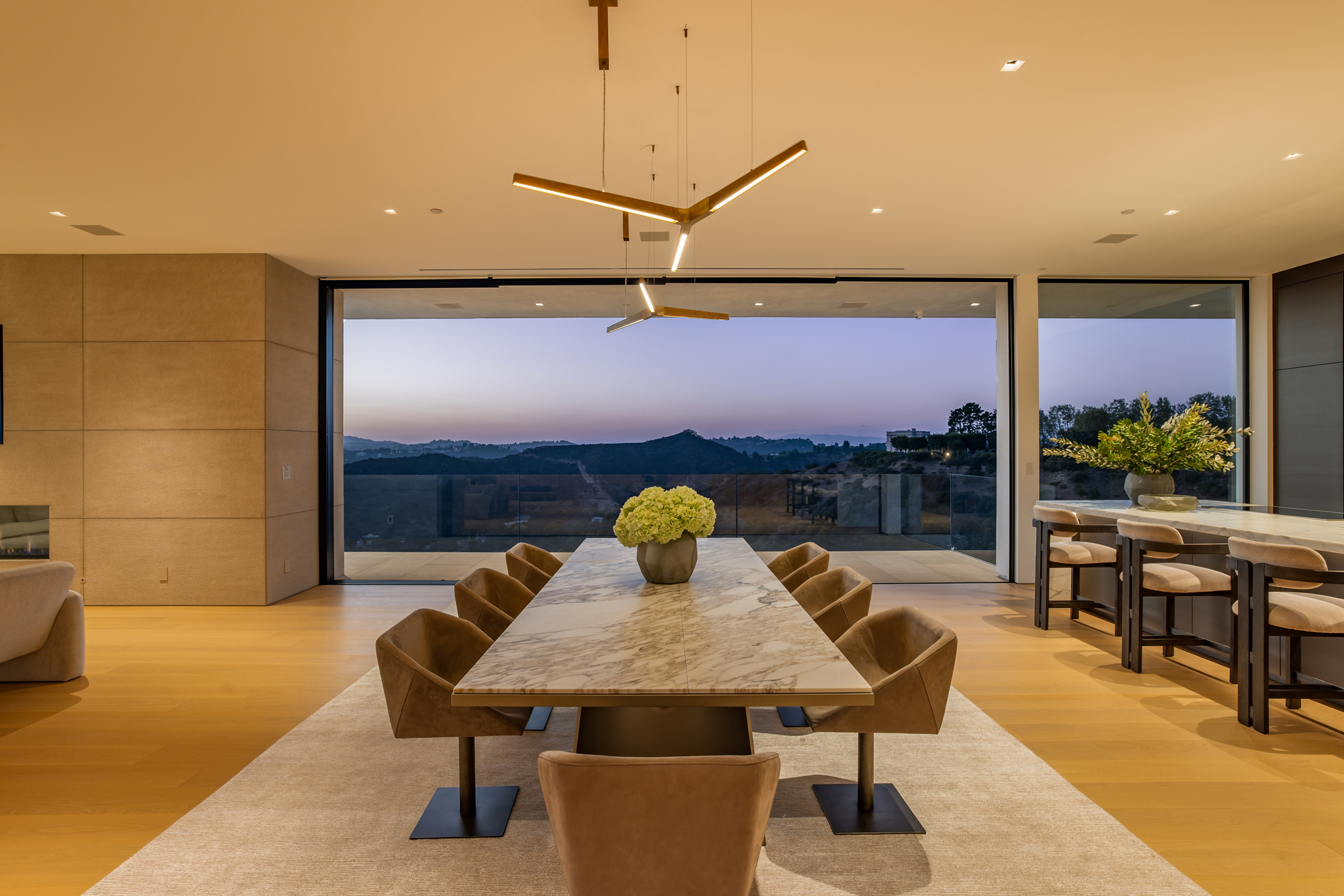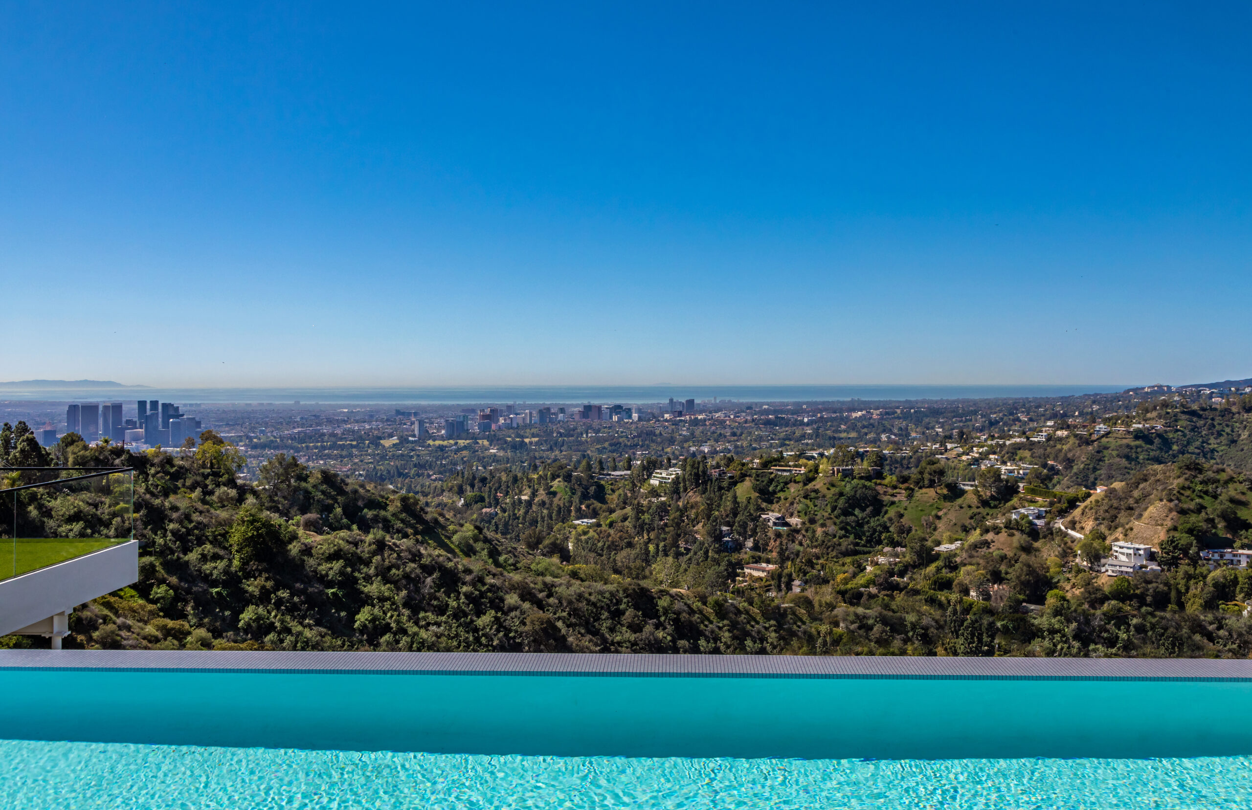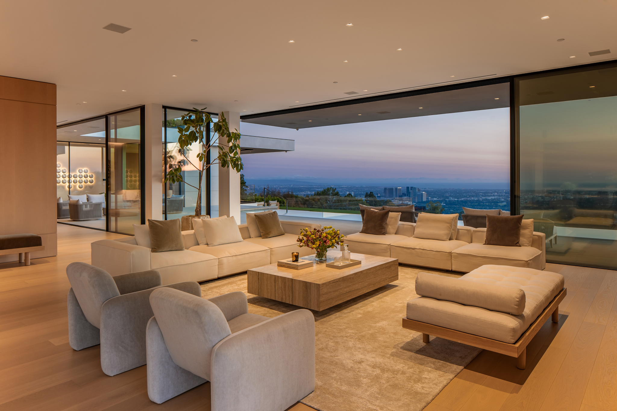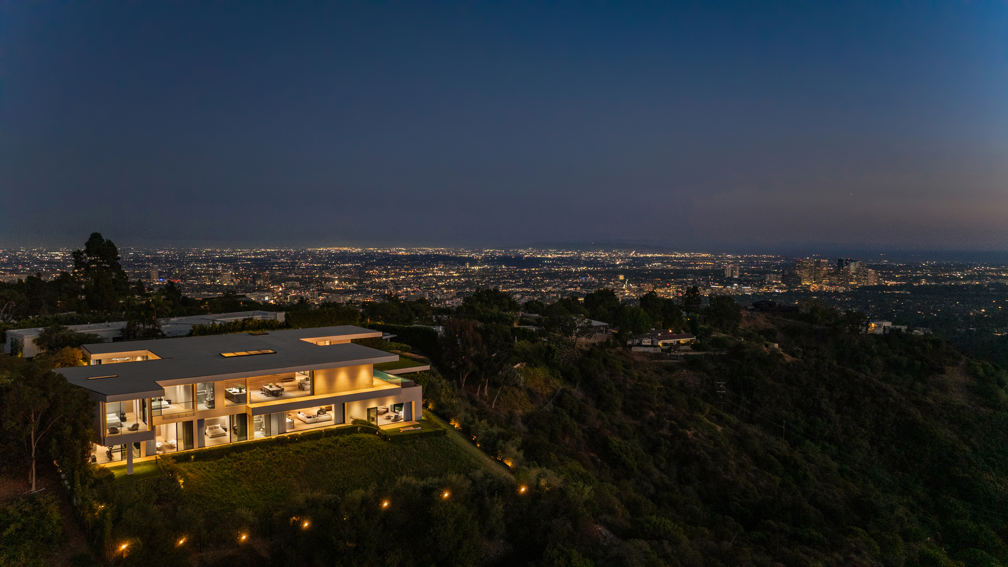 The View Estate is a serene architectural masterpiece sitting on the premier lot in the ultra-exclusive Trousdale Estates enclave. It offers unobstructed jetliner canyon, city, and ocean views from every room. This new construction showcases unparalleled fit and finishes, imported stonework, floor-to-ceiling glass walls, custom furniture, and soaring ceilings. Designed by world-renowned architect Paul McClean with interiors designed by LA based Bespoke interior design firm GD Studio. Greeted by a 100-year-old olive tree, pass through the gates to discover dramatic water features and a zero-edge waterfall leading to a 10+ car garage with turntable. Inside, tranquil formal living and dining rooms with warm European oak paneling and a marble fireplace open to a breathtaking backyard oasis—complete with multiple fire features, flat lush lawns, and an infinity pool/spa that spills seamlessly into the skyline. There are two world class gourmet kitchen's that are outfitted with Calacatta Borghini marble and Miele appliances. The main Kitchen is the perfect gathering space and the Chef's kitchen is clearly Michelin star. Two expansive primary suites feature fireplaces, spa-like bathrooms, and dual closets. Take the elevator down to a day-lit entertainment lounge bathed in natural light, featuring a bar, wine room, world-class spa with infrared sauna and private massage room, and a state-of-the-art fitness center curated by Technogym. World class cinema with Candy Wall with additional lounge areas complete the experience. An estate of this scale, craftsmanship, and architectural pedigree can never be built again in Trousdale—a true private sanctuary that masterfully blends design, luxury, and tranquility.