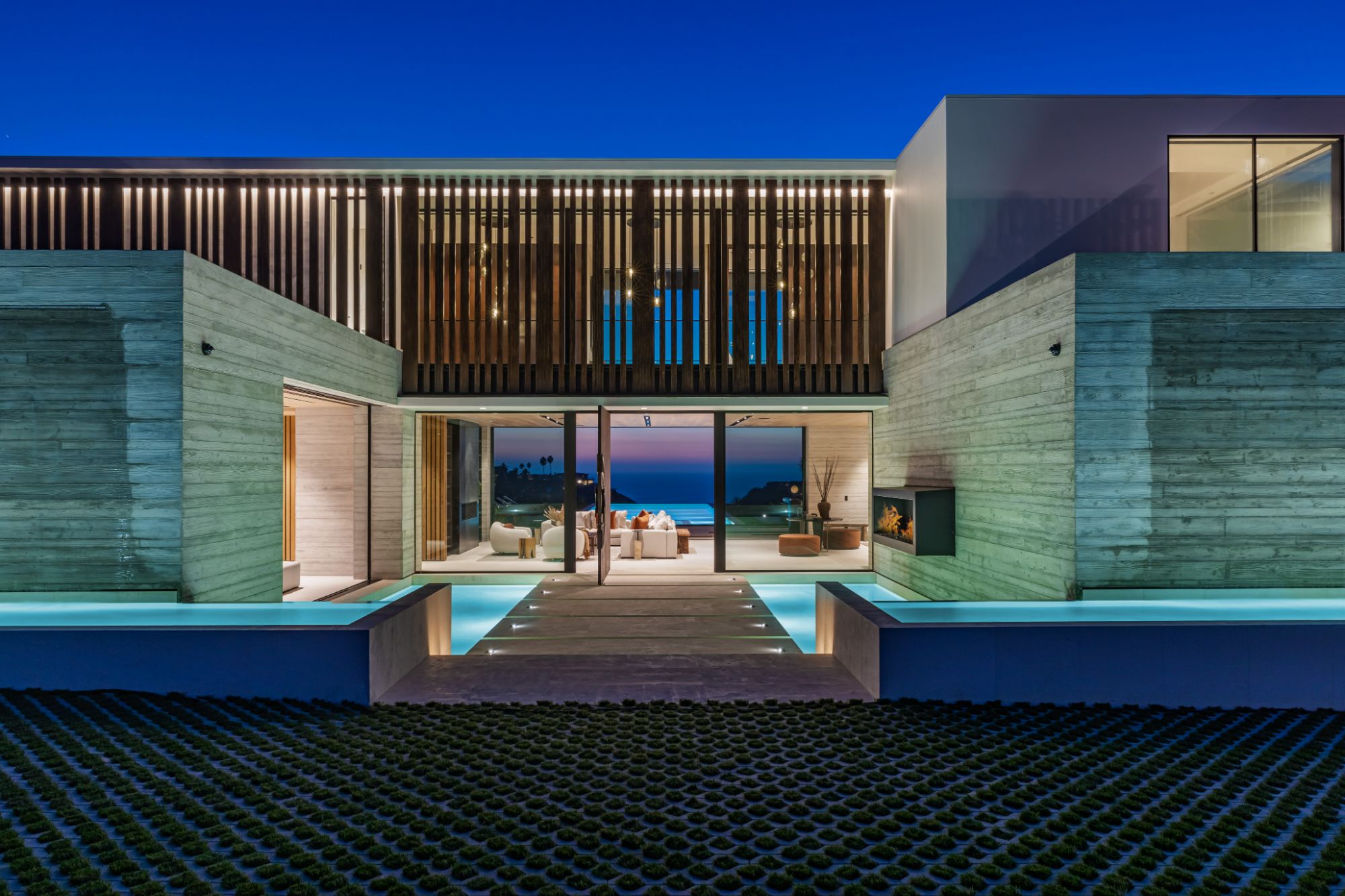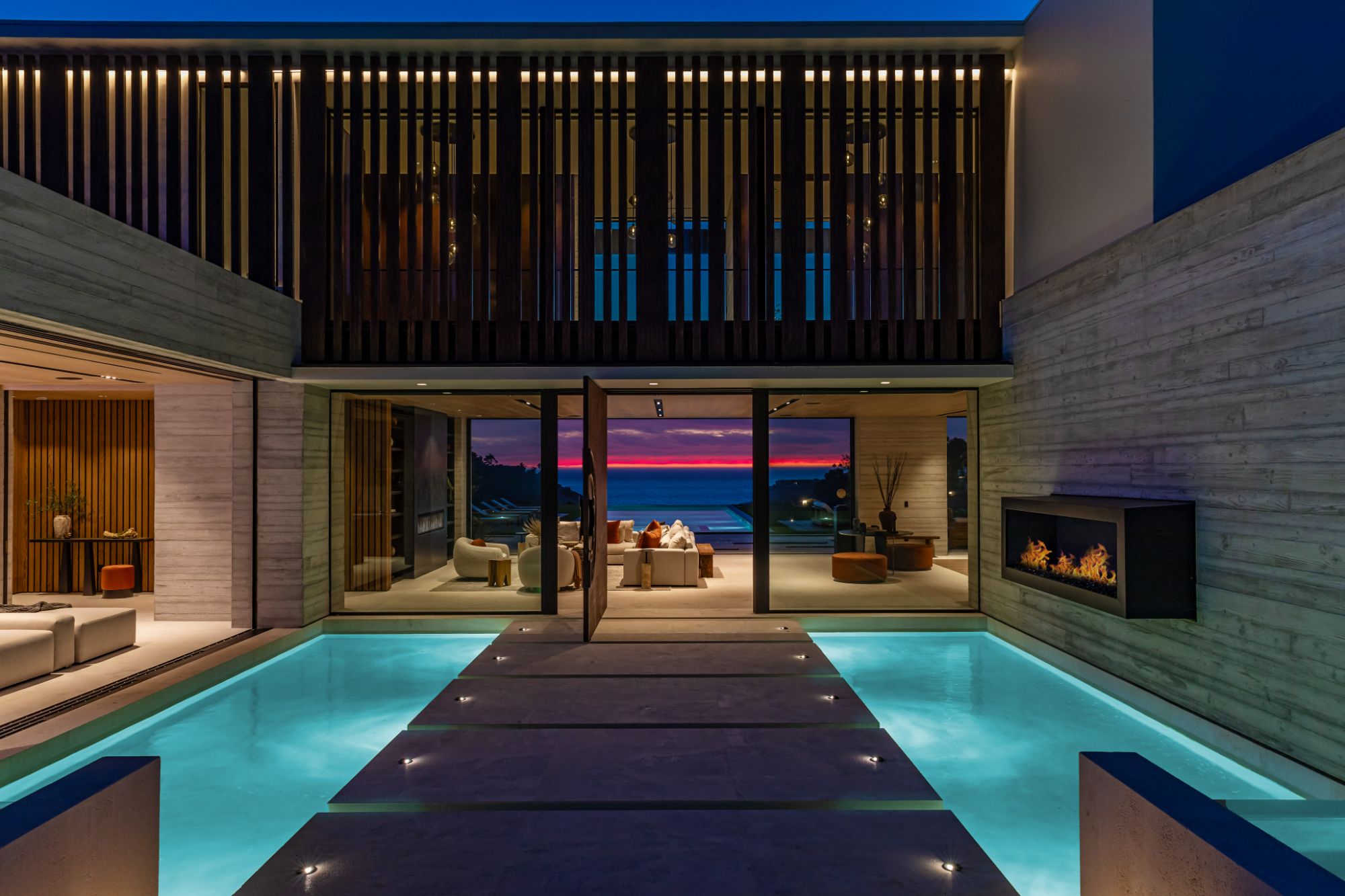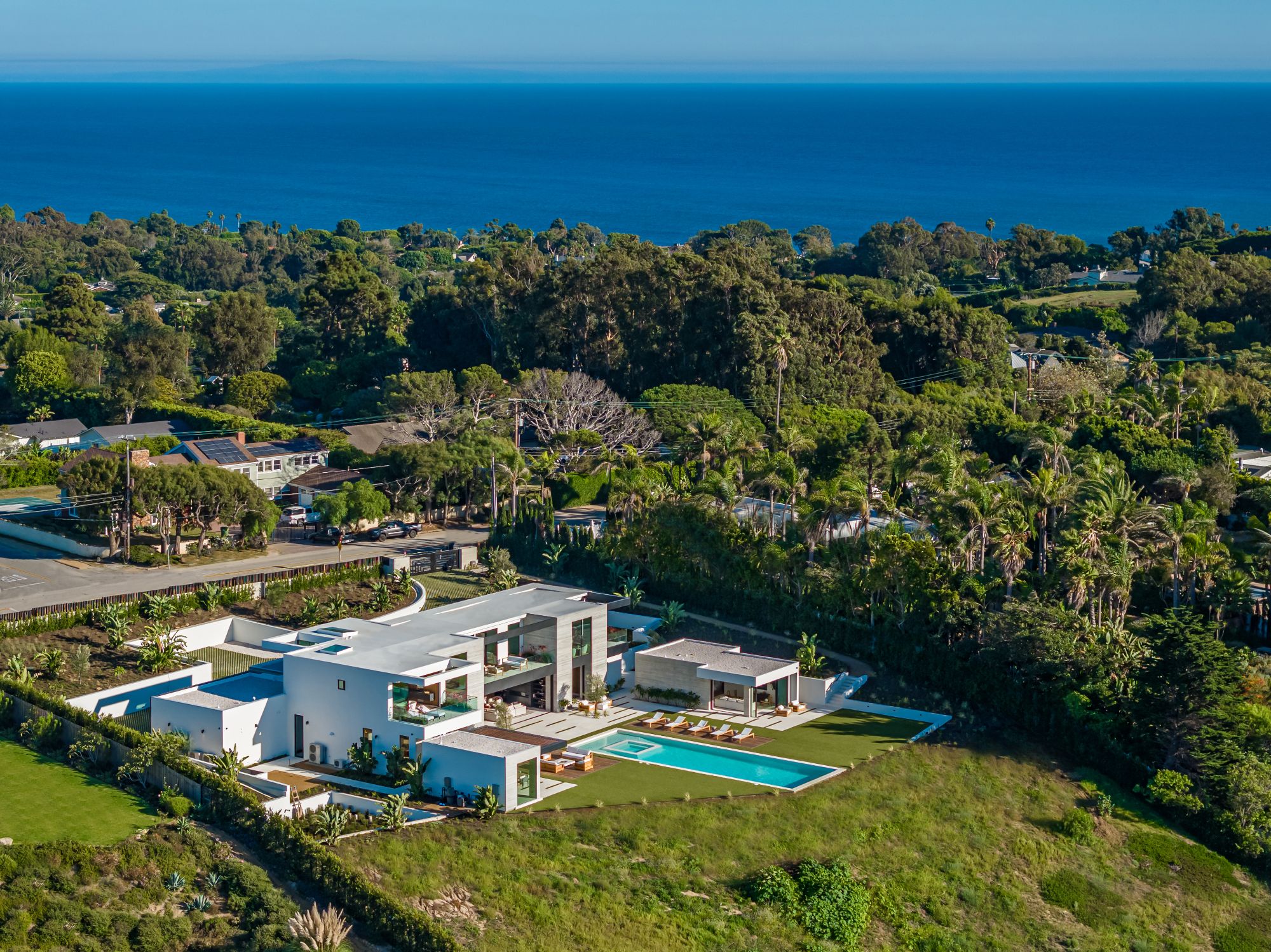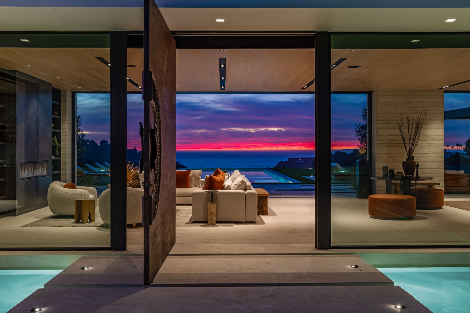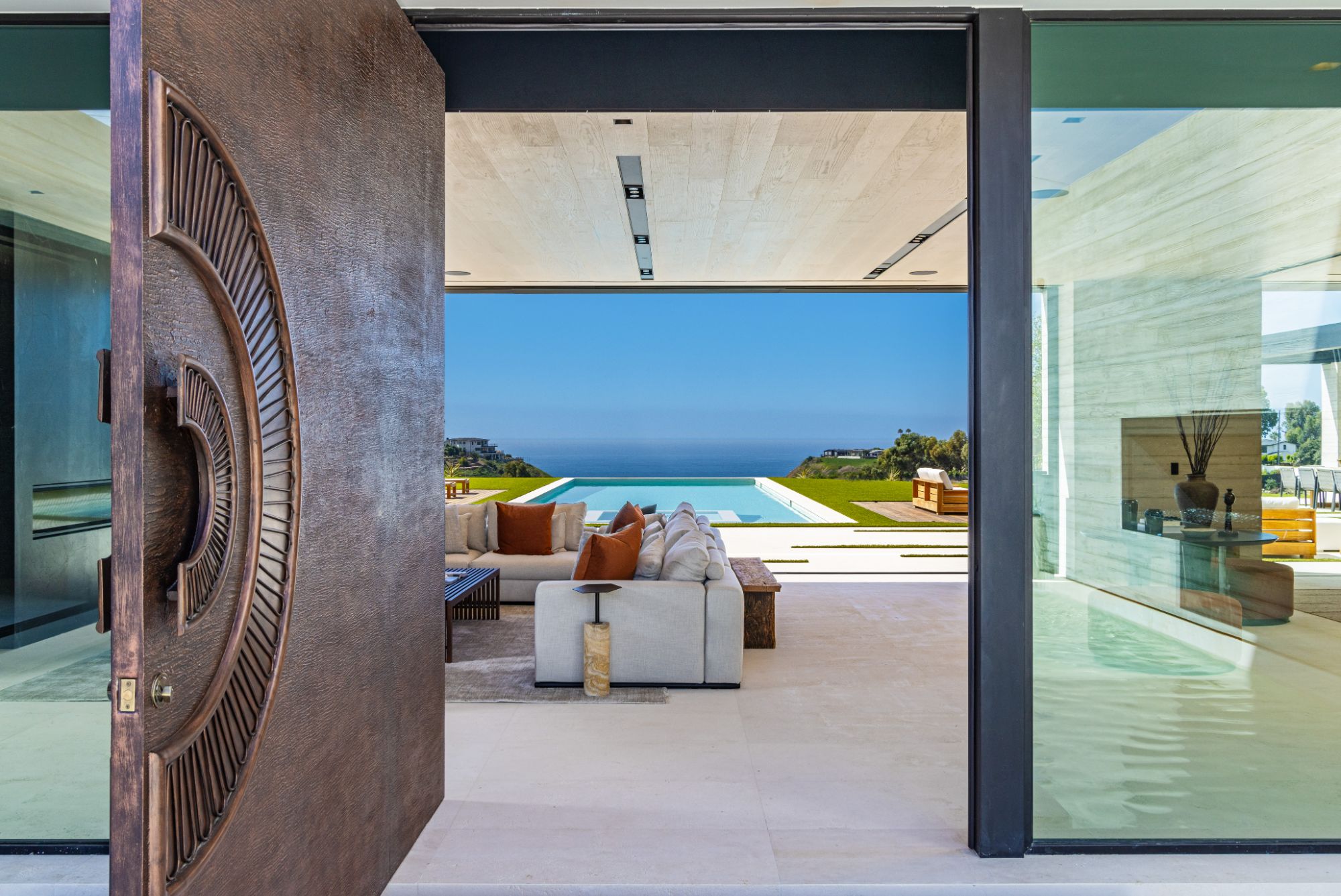 Introducing TerraLume, Malibu's newest iconic estate nestled within the ultra-exclusive Point Dume enclave. Spanning 2.25 acres of pristine grounds with commanding panoramic ocean views, this 8,500 sq ft, 6-bedroom, 8-bathroom masterwork offers the pinnacle of architectural sophistication and resort-style living. A harmonious fusion of contemporary design and materials, TerraLume features board-formed concrete walls, curated stone finishes, and floor-to-ceiling disappearing glass doors that seamlessly blend indoor and outdoor living. Highlighting Malibu's legendary sunsets at every turn. Enter through a tranquil lagoon to a grand 8x10 custom copper pivot door, leading into a dramatic double-height entry and voluminous open spaces. Every detail has been hand-selected for its artistry: handmade chandeliers, handcrafted wood louvers, etched copper walls, and a bespoke Italian kitchen. The floating staircase ascends to a private upper level featuring an opulent primary suite with two fireplaces, a spa-inspired bath retreat with hand-carved marble vanities, a sculptural stone soaking tub, and a steam shower framing unforgettable ocean vistas. Outdoor amenities rival world-class resorts: a covered outdoor kitchen and bar, 70-foot pool and spa, detached guesthouse, fitness studio with sauna, and gated motor court with parking for up to 20 vehicles. Enjoy private access to Little Dume Beach through the coveted Riviera III beach key.