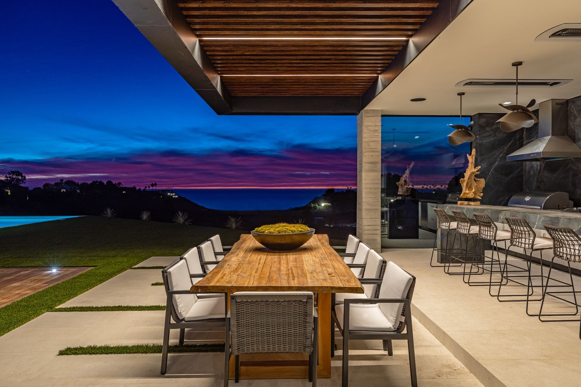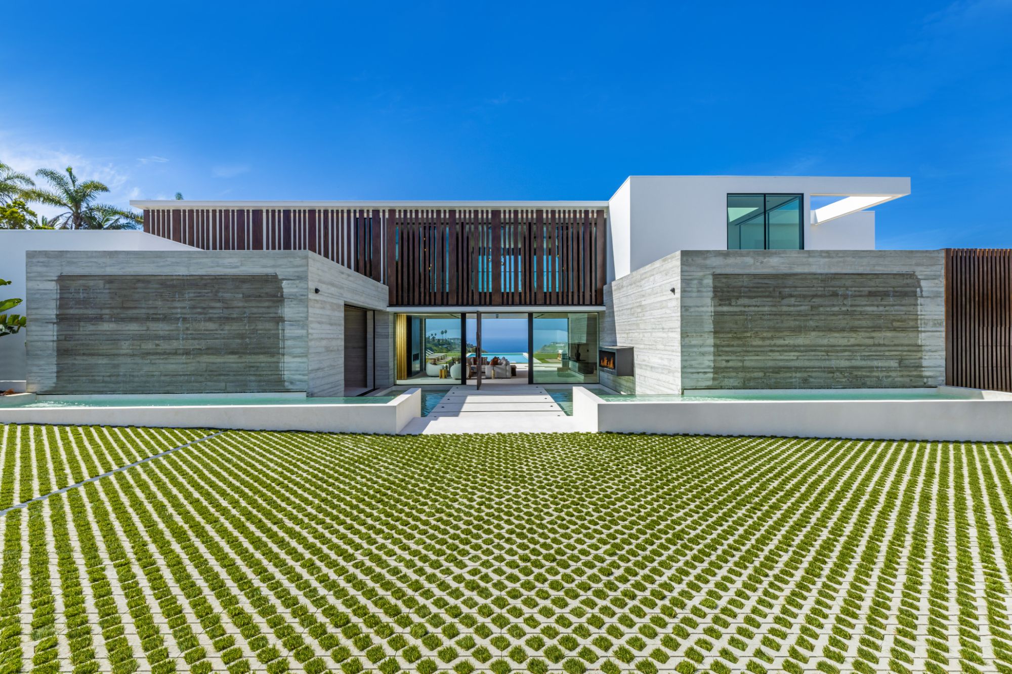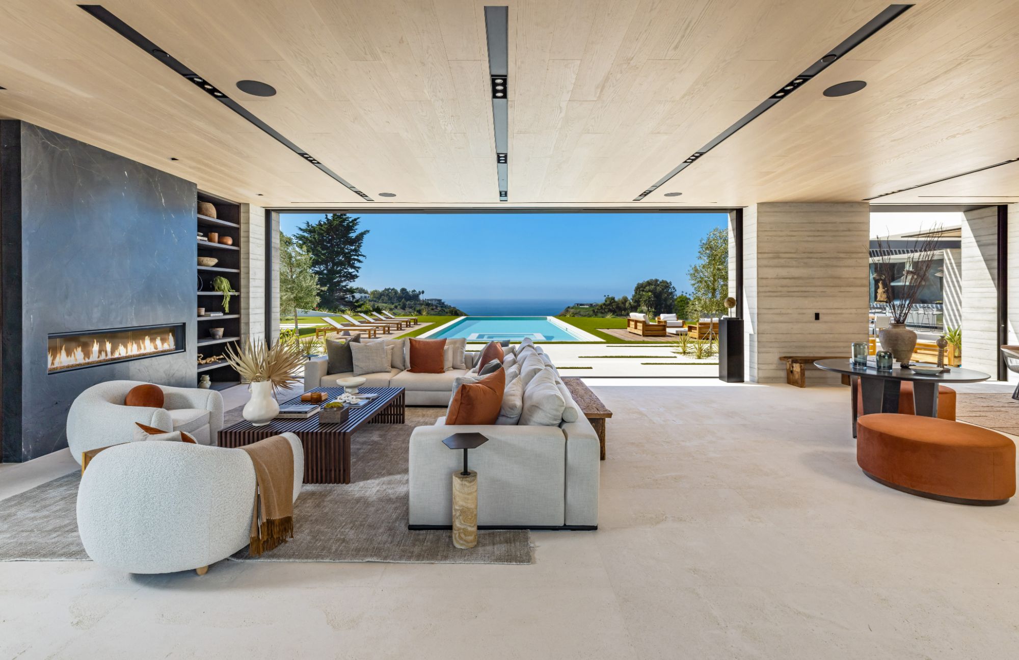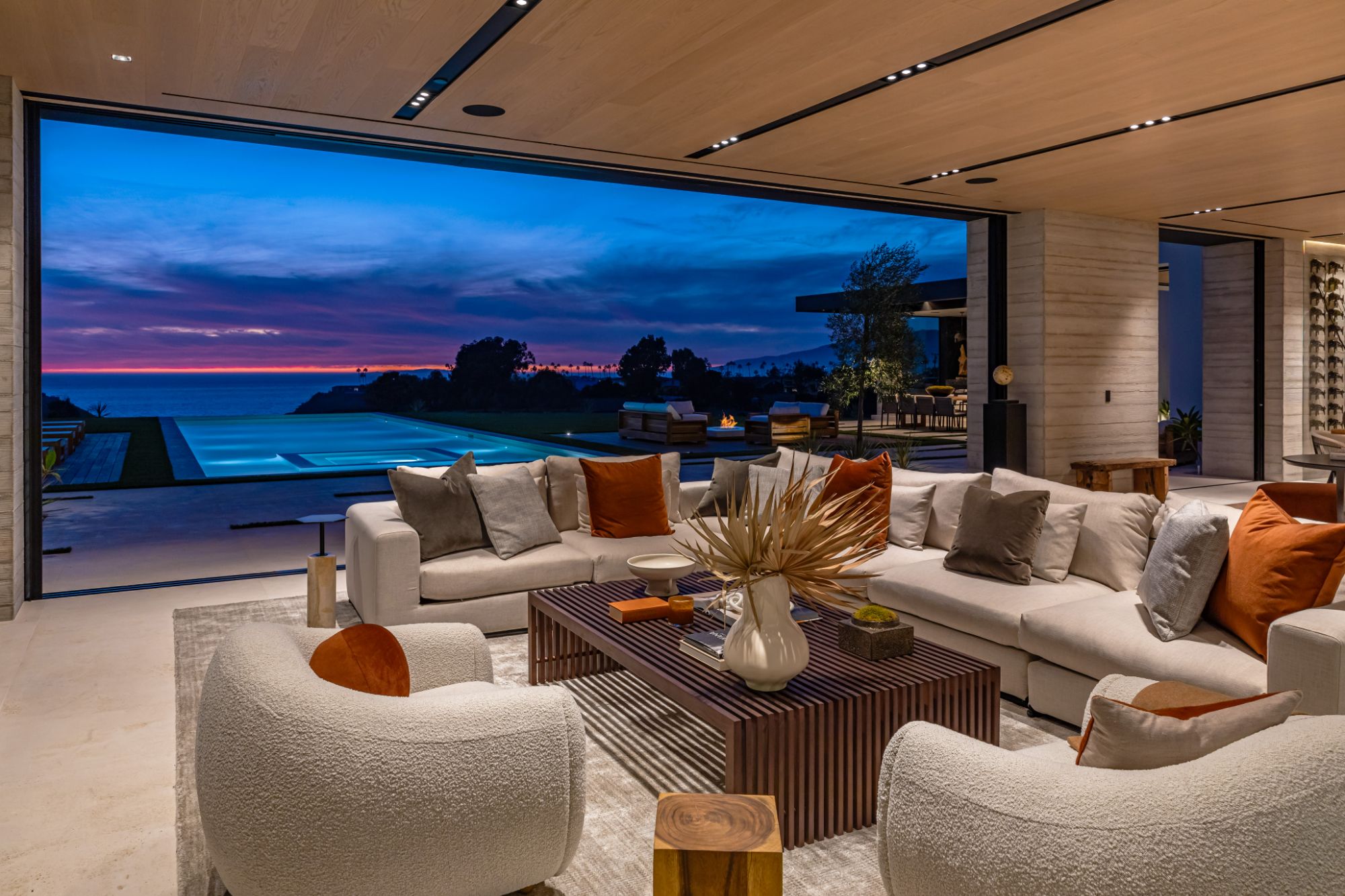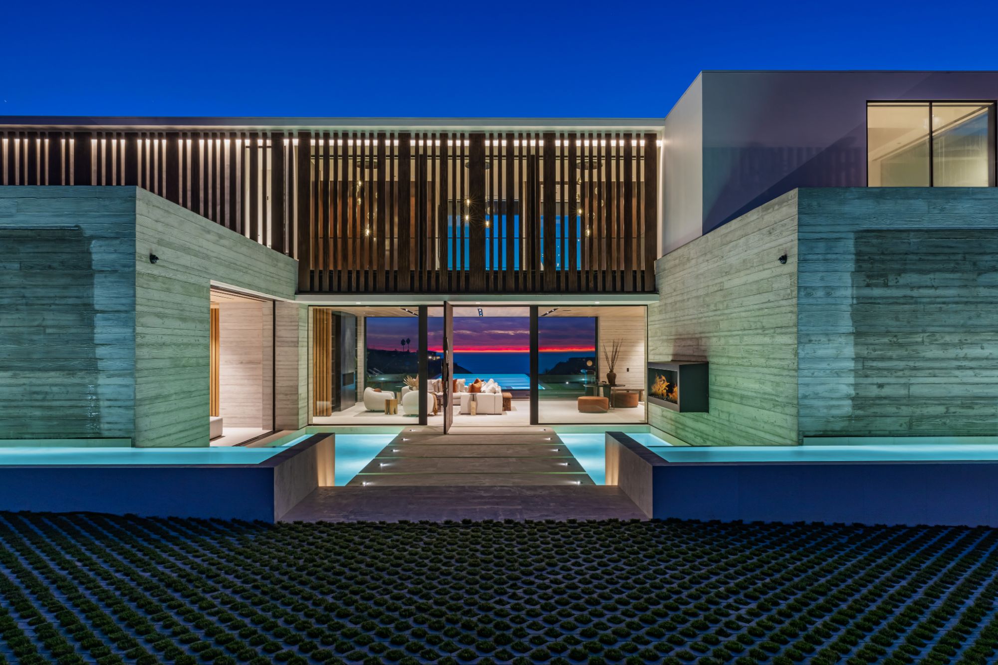 Introducing TerraLume, Malibu's newest iconic estate nestled within the ultra-exclusive Point Dume enclave. Spanning 2.25 acres of pristine grounds with commanding panoramic ocean views, this 8,500 sq ft, 6-bedroom, 8-bathroom masterwork offers the pinnacle of architectural sophistication and resort-style living. A harmonious fusion of contemporary design and materials, TerraLume features board-formed concrete walls, curated stone finishes, and floor-to-ceiling disappearing glass doors that seamlessly blend indoor and outdoor living. Highlighting Malibu's legendary sunsets at every turn. Enter through a tranquil lagoon to a grand 8x10 custom copper pivot door, leading into a dramatic double-height entry and voluminous open spaces. Every detail has been hand-selected for its artistry: handmade chandeliers, handcrafted wood louvers, etched copper walls, and a bespoke Italian kitchen. The floating staircase ascends to a private upper level featuring an opulent primary suite with two fireplaces, a spa-inspired bath retreat with hand-carved marble vanities, a sculptural stone soaking tub, and a steam shower framing unforgettable ocean vistas. Outdoor amenities rival world-class resorts: a covered outdoor kitchen and bar, 70-foot pool and spa, detached guesthouse, fitness studio with sauna, and gated motor court with parking for up to 20 vehicles. Enjoy private access to Little Dume Beach through the coveted Riviera III beach key.