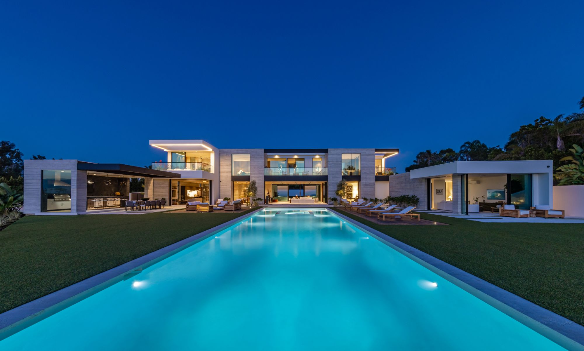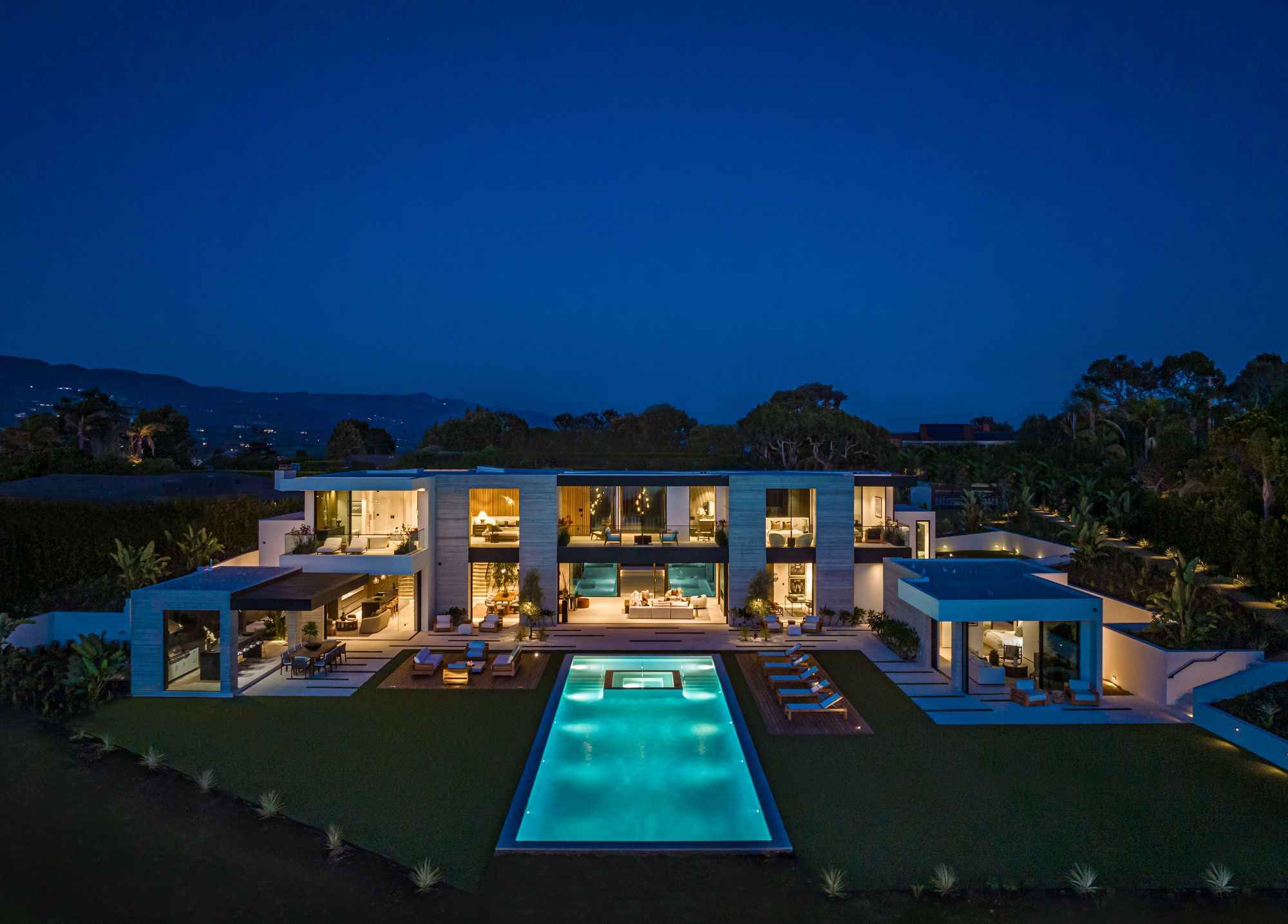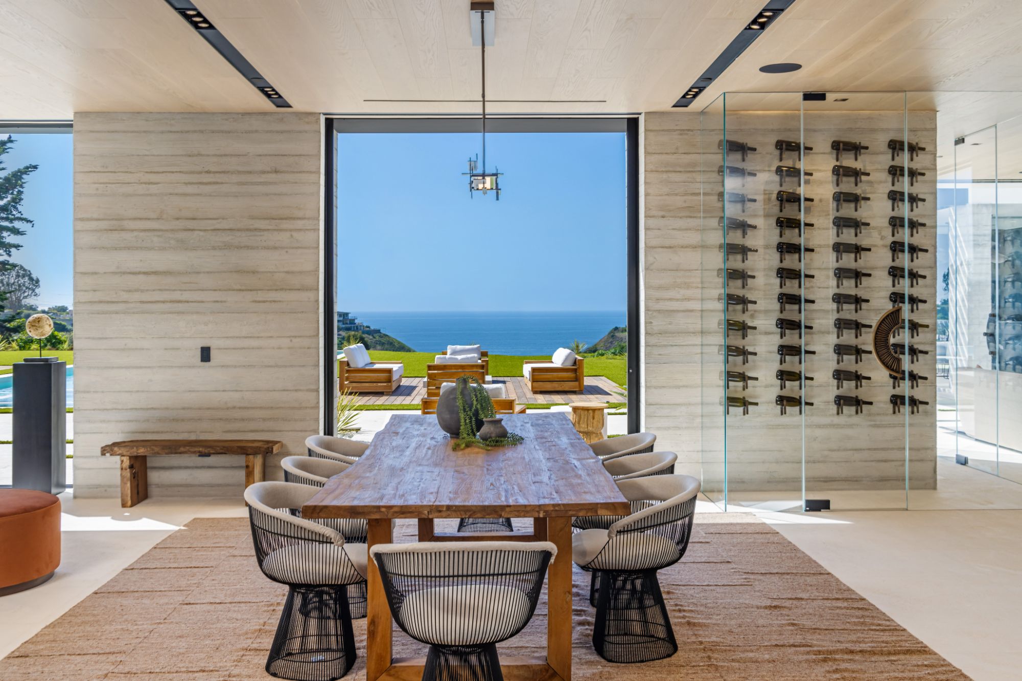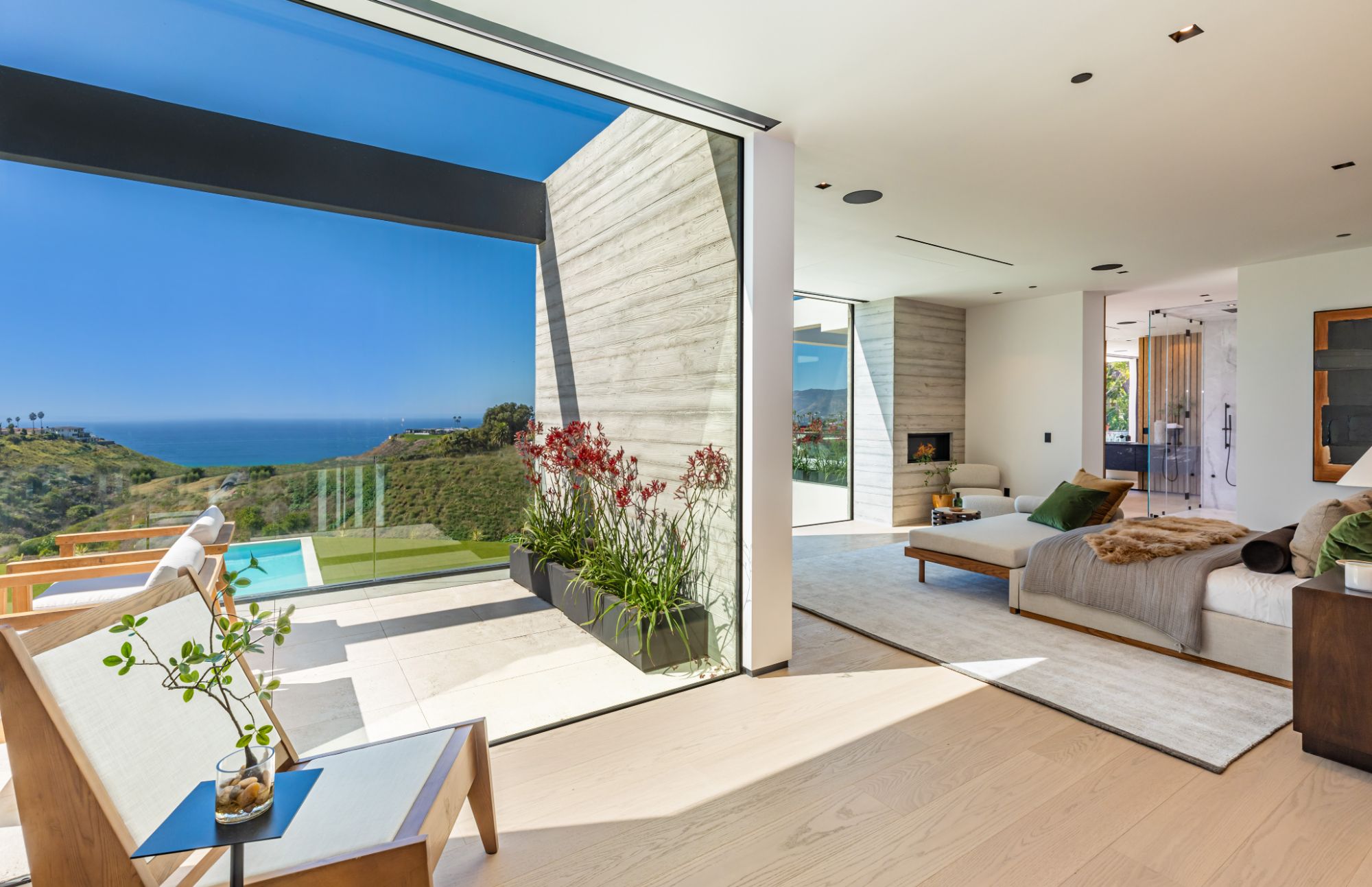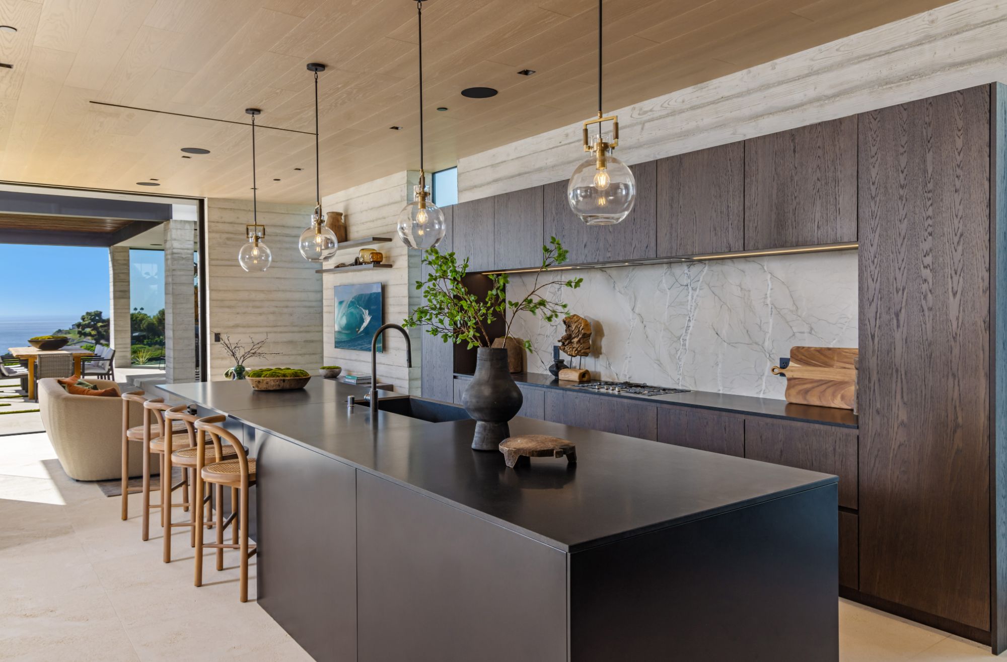 Introducing TerraLume, Malibu's newest iconic estate nestled within the ultra-exclusive Point Dume enclave. Spanning 2.25 acres of pristine grounds with commanding panoramic ocean views, this 8,500 sq ft, 6-bedroom, 8-bathroom masterwork offers the pinnacle of architectural sophistication and resort-style living. A harmonious fusion of contemporary design and materials, TerraLume features board-formed concrete walls, curated stone finishes, and floor-to-ceiling disappearing glass doors that seamlessly blend indoor and outdoor living. Highlighting Malibu's legendary sunsets at every turn. Enter through a tranquil lagoon to a grand 8x10 custom copper pivot door, leading into a dramatic double-height entry and voluminous open spaces. Every detail has been hand-selected for its artistry: handmade chandeliers, handcrafted wood louvers, etched copper walls, and a bespoke Italian kitchen. The floating staircase ascends to a private upper level featuring an opulent primary suite with two fireplaces, a spa-inspired bath retreat with hand-carved marble vanities, a sculptural stone soaking tub, and a steam shower framing unforgettable ocean vistas. Outdoor amenities rival world-class resorts: a covered outdoor kitchen and bar, 70-foot pool and spa, detached guesthouse, fitness studio with sauna, and gated motor court with parking for up to 20 vehicles. Enjoy private access to Little Dume Beach through the coveted Riviera III beach key.