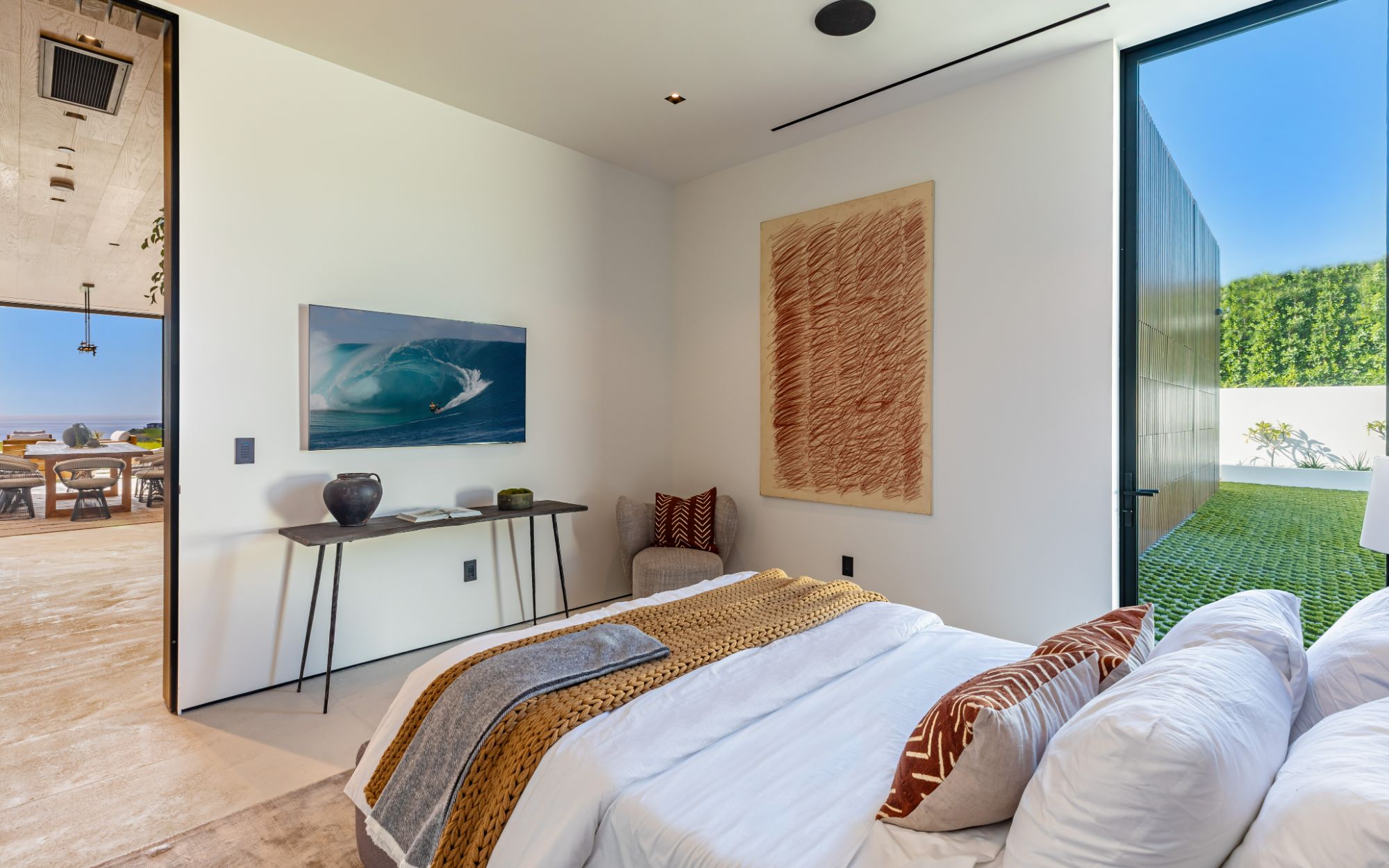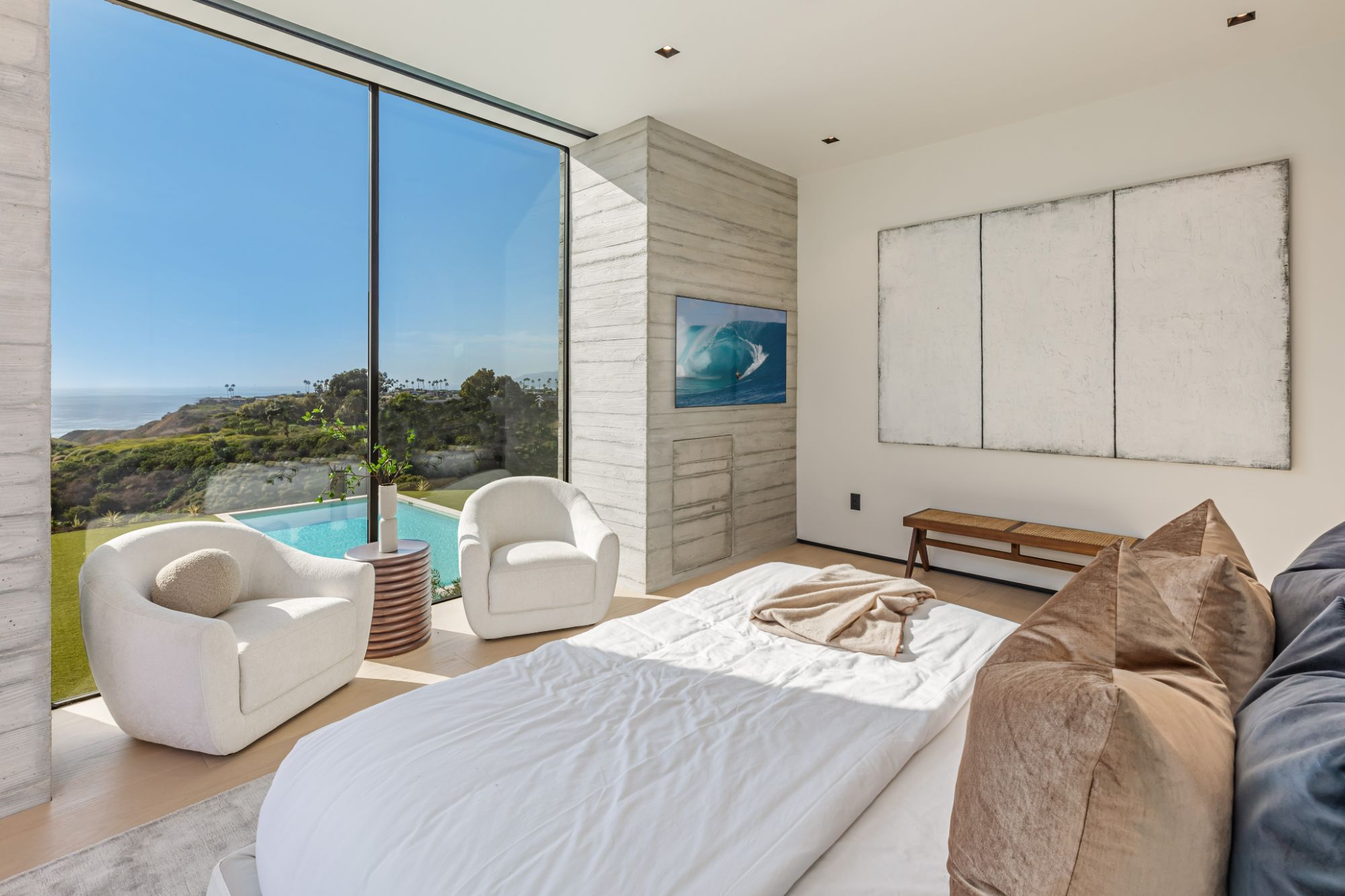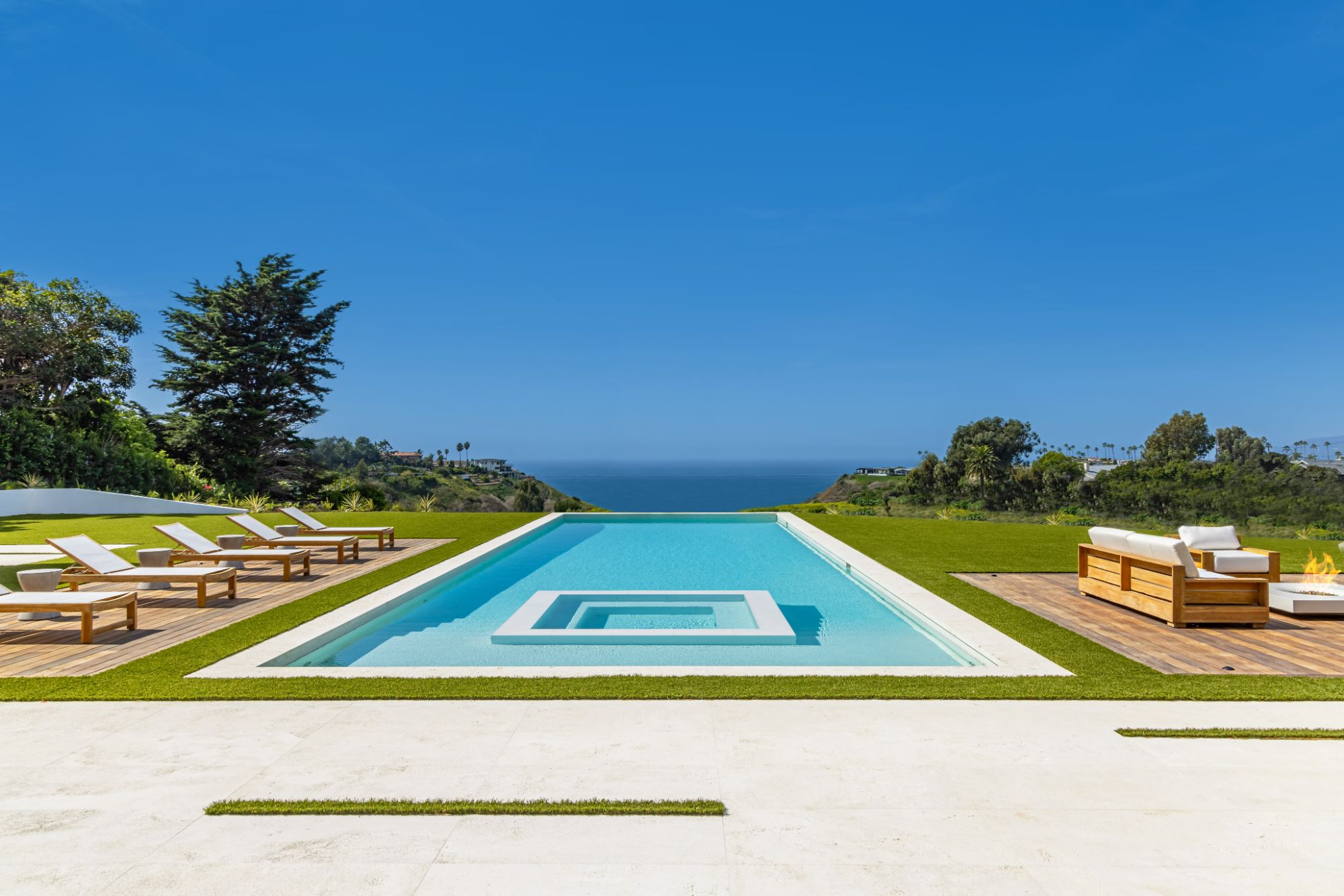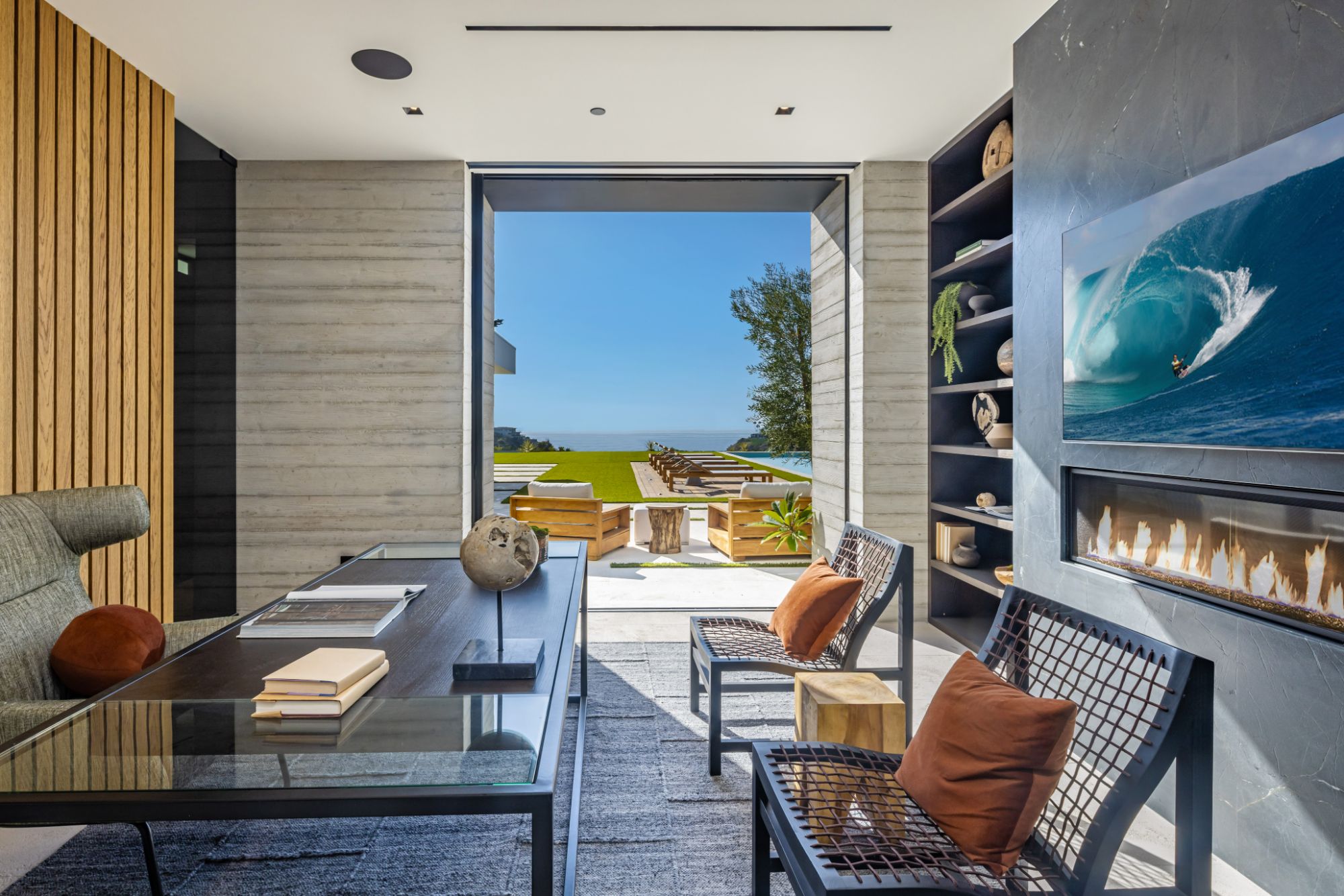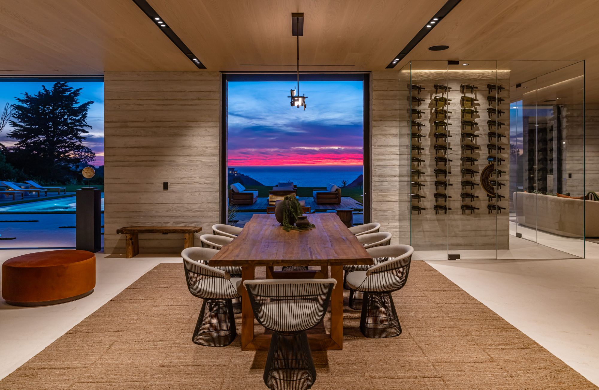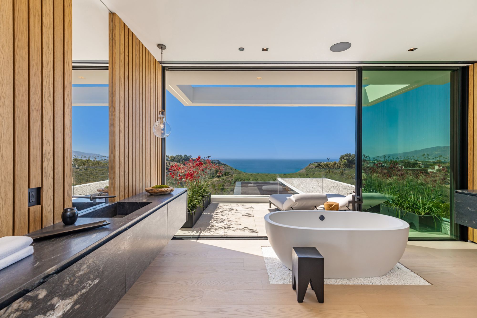 Introducing TerraLume, Malibu's newest iconic estate nestled within the ultra-exclusive Point Dume enclave. Spanning 2.25 acres of pristine grounds with commanding panoramic ocean views, this 8,500 sq ft, 6-bedroom, 8-bathroom masterwork offers the pinnacle of architectural sophistication and resort-style living. A harmonious fusion of contemporary design and materials, TerraLume features board-formed concrete walls, curated stone finishes, and floor-to-ceiling disappearing glass doors that seamlessly blend indoor and outdoor living. Highlighting Malibu's legendary sunsets at every turn. Enter through a tranquil lagoon to a grand 8x10 custom copper pivot door, leading into a dramatic double-height entry and voluminous open spaces. Every detail has been hand-selected for its artistry: handmade chandeliers, handcrafted wood louvers, etched copper walls, and a bespoke Italian kitchen. The floating staircase ascends to a private upper level featuring an opulent primary suite with two fireplaces, a spa-inspired bath retreat with hand-carved marble vanities, a sculptural stone soaking tub, and a steam shower framing unforgettable ocean vistas. Outdoor amenities rival world-class resorts: a covered outdoor kitchen and bar, 70-foot pool and spa, detached guesthouse, fitness studio with sauna, and gated motor court with parking for up to 20 vehicles. Enjoy private access to Little Dume Beach through the coveted Riviera III beach key.