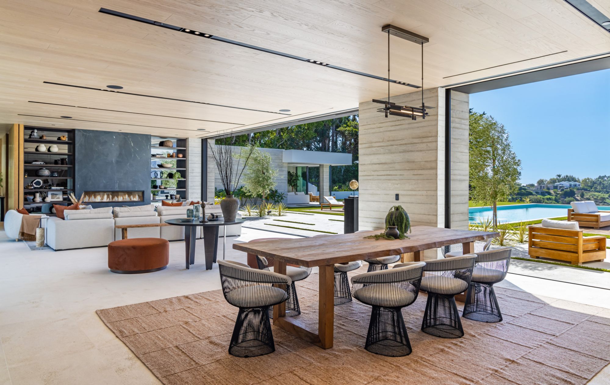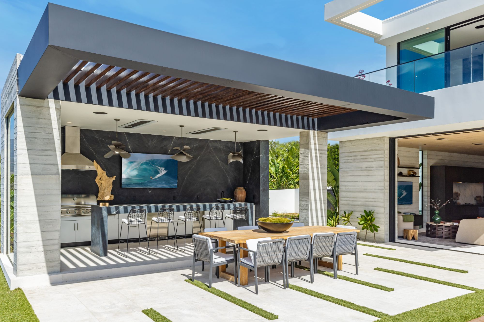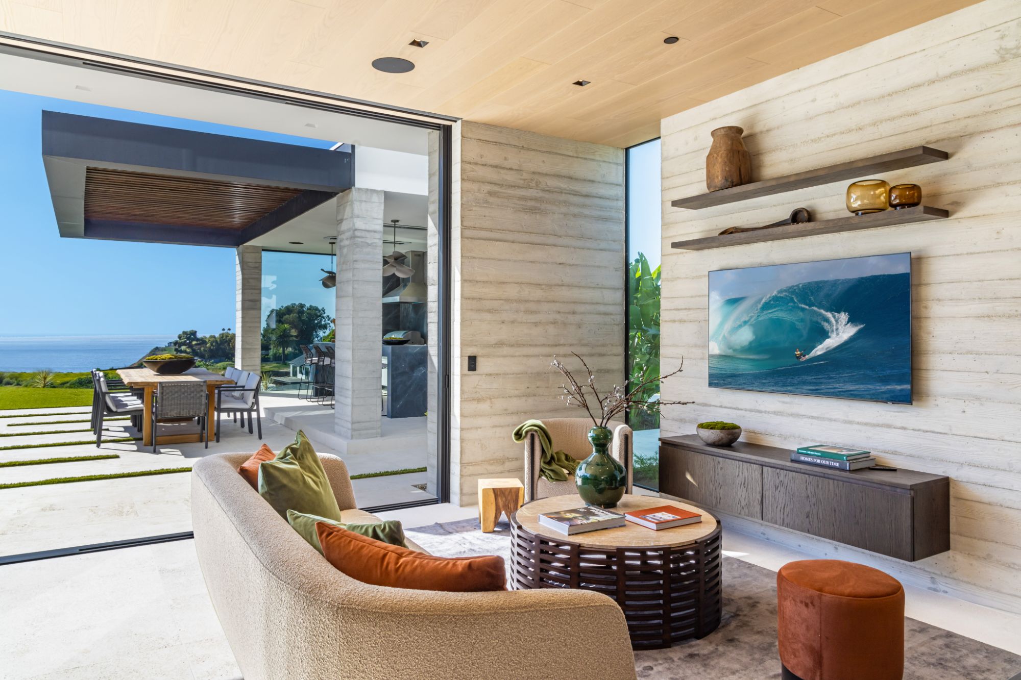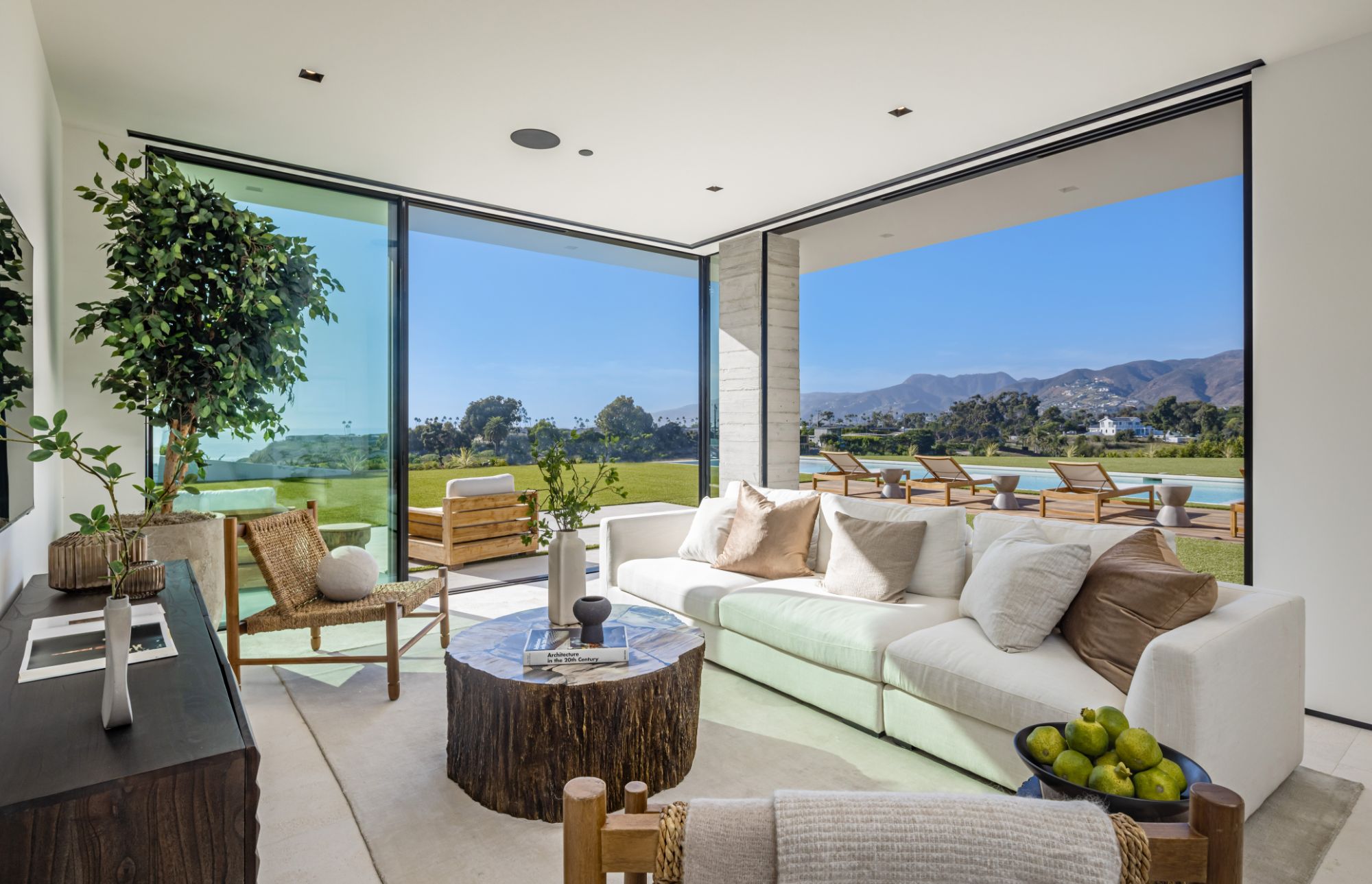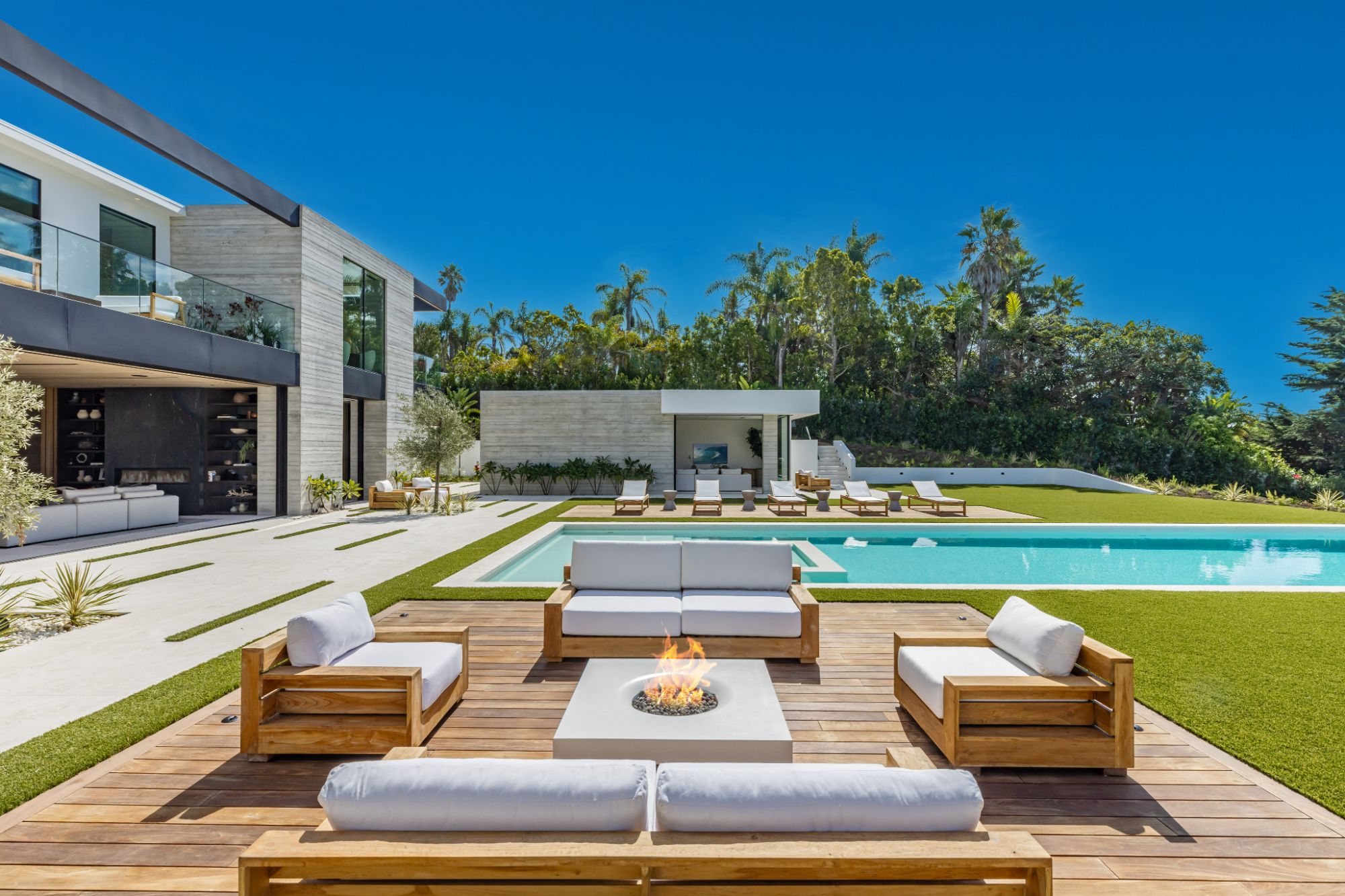 Introducing TerraLume, Malibu's newest iconic estate nestled within the ultra-exclusive Point Dume enclave. Spanning 2.25 acres of pristine grounds with commanding panoramic ocean views, this 8,500 sq ft, 6-bedroom, 8-bathroom masterwork offers the pinnacle of architectural sophistication and resort-style living. A harmonious fusion of contemporary design and materials, TerraLume features board-formed concrete walls, curated stone finishes, and floor-to-ceiling disappearing glass doors that seamlessly blend indoor and outdoor living. Highlighting Malibu's legendary sunsets at every turn. Enter through a tranquil lagoon to a grand 8x10 custom copper pivot door, leading into a dramatic double-height entry and voluminous open spaces. Every detail has been hand-selected for its artistry: handmade chandeliers, handcrafted wood louvers, etched copper walls, and a bespoke Italian kitchen. The floating staircase ascends to a private upper level featuring an opulent primary suite with two fireplaces, a spa-inspired bath retreat with hand-carved marble vanities, a sculptural stone soaking tub, and a steam shower framing unforgettable ocean vistas. Outdoor amenities rival world-class resorts: a covered outdoor kitchen and bar, 70-foot pool and spa, detached guesthouse, fitness studio with sauna, and gated motor court with parking for up to 20 vehicles. Enjoy private access to Little Dume Beach through the coveted Riviera III beach key.