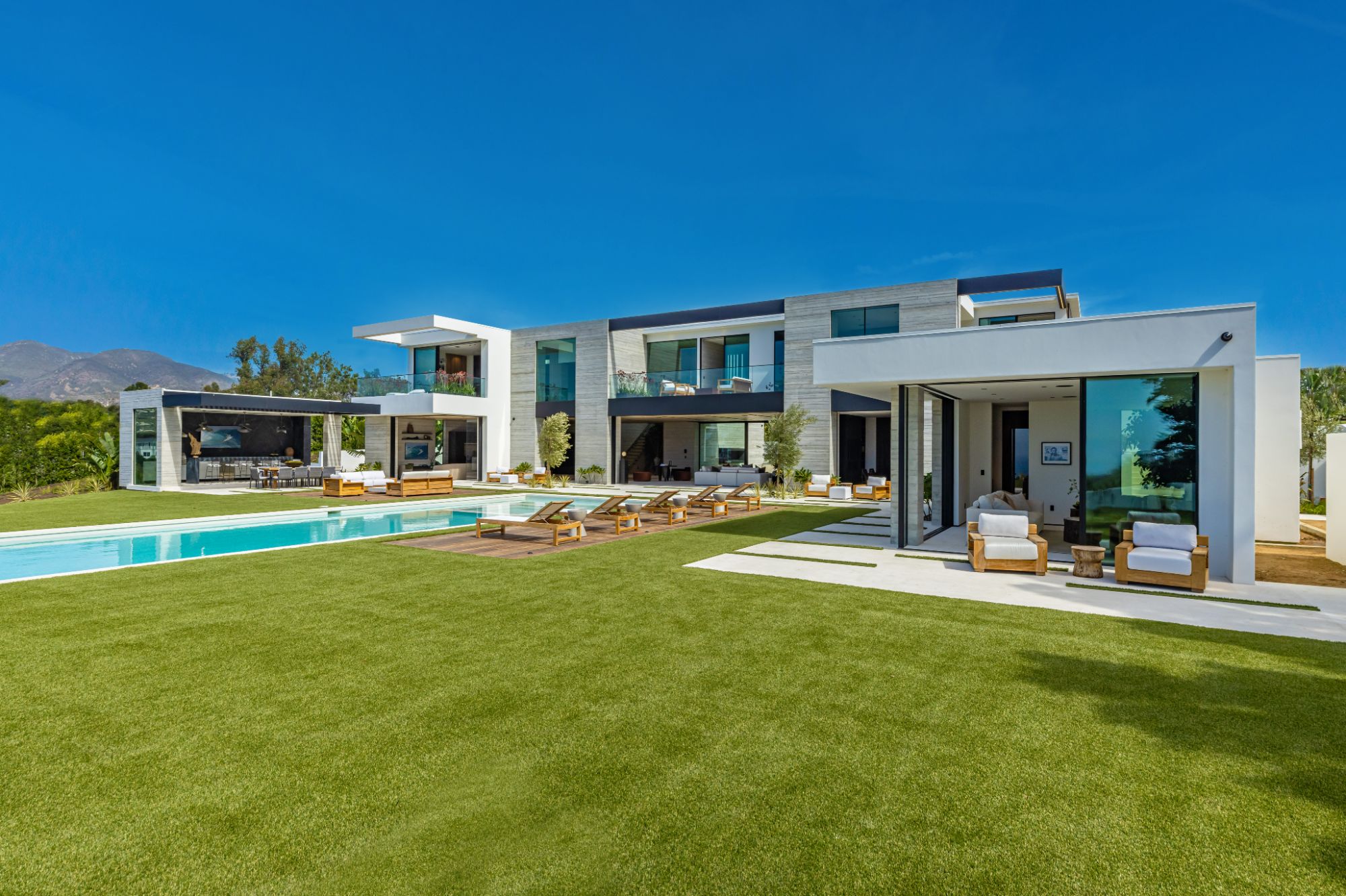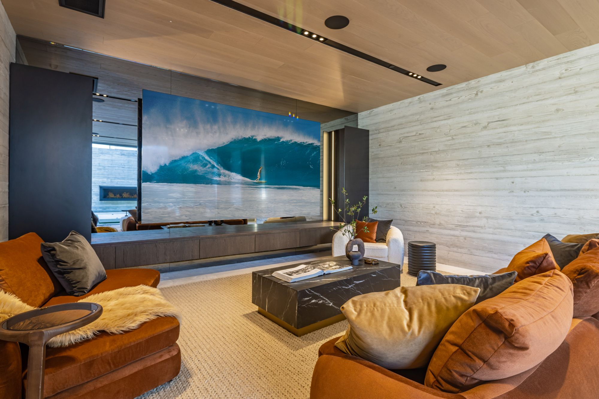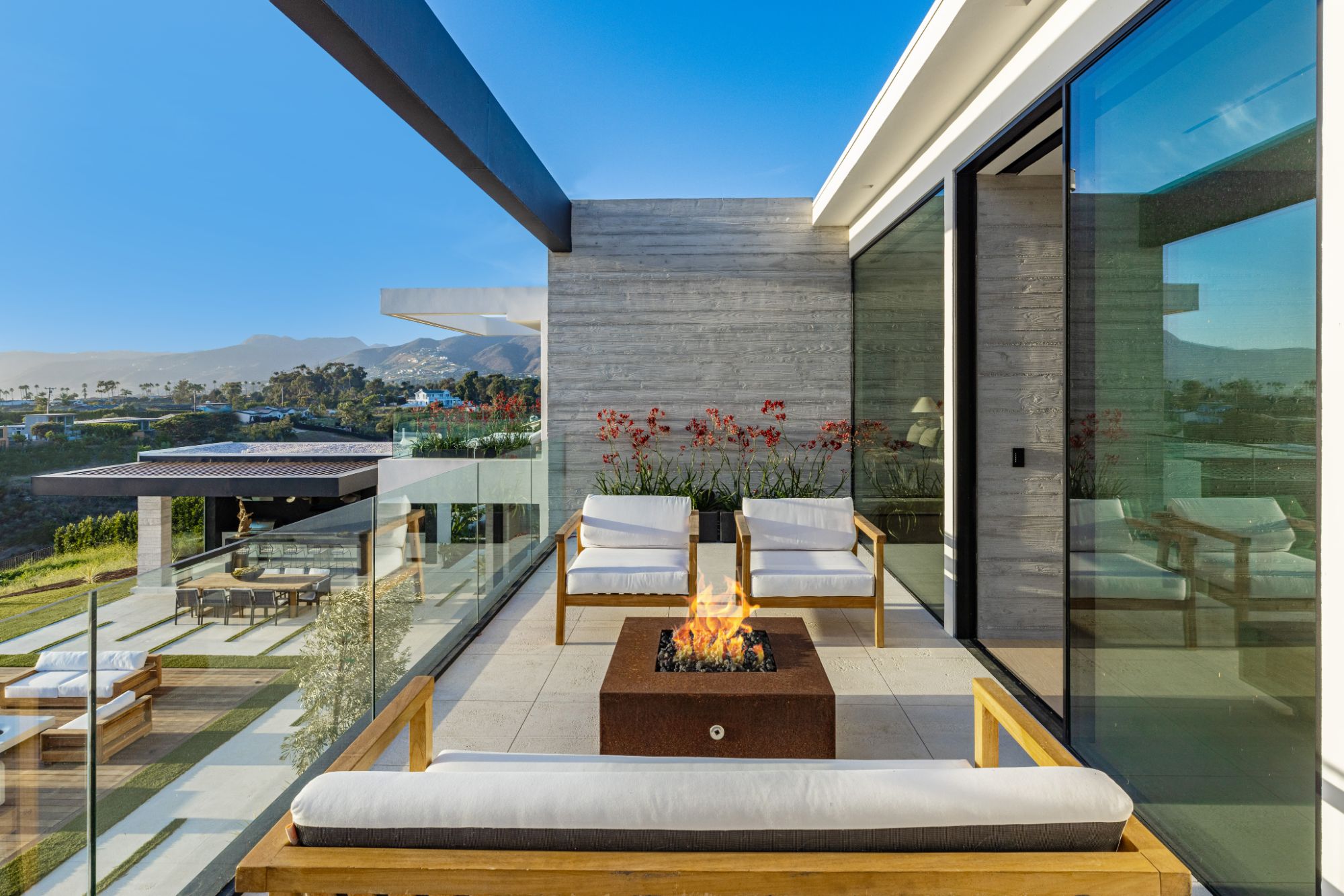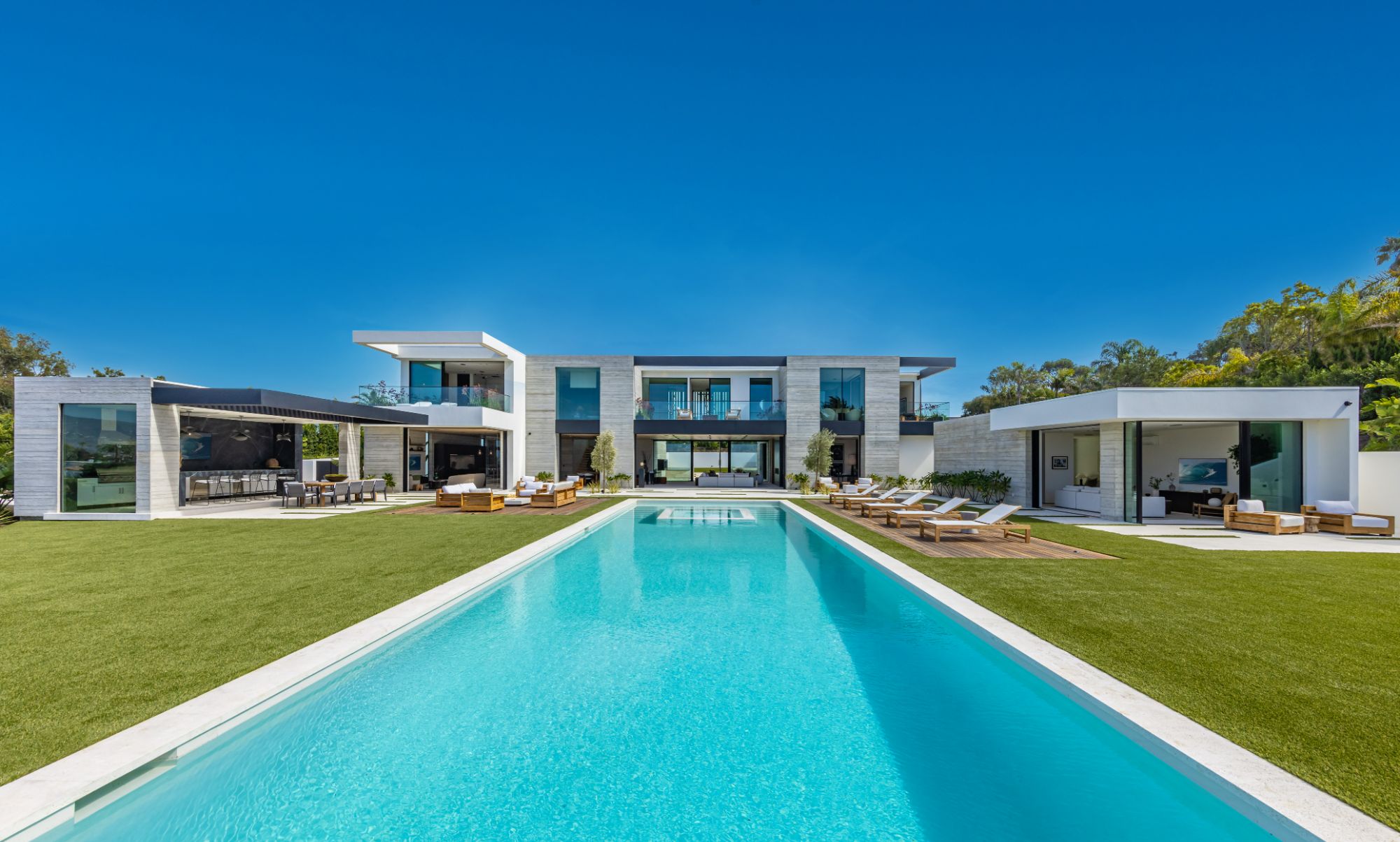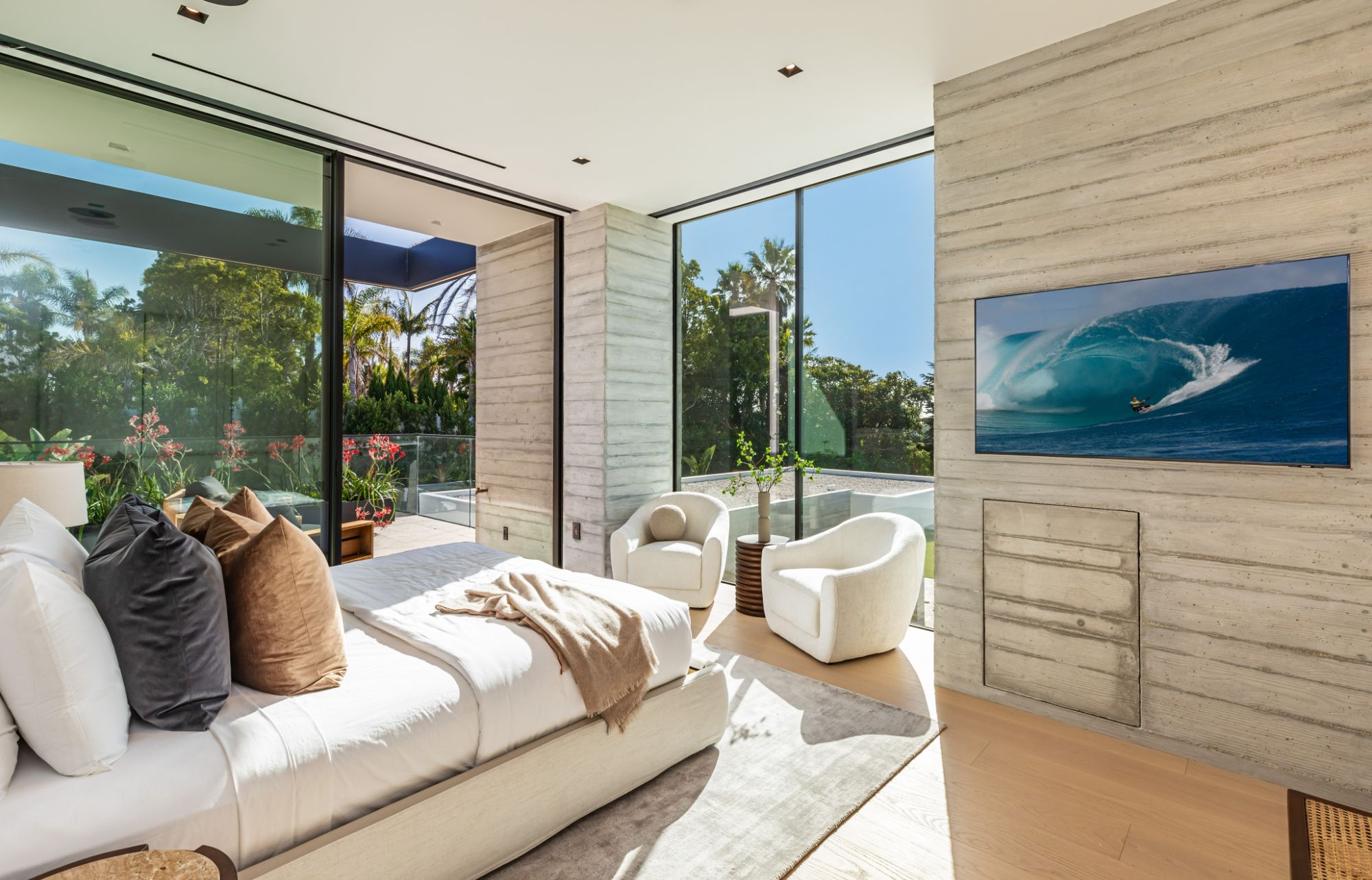 Introducing TerraLume, Malibu's newest iconic estate nestled within the ultra-exclusive Point Dume enclave. Spanning 2.25 acres of pristine grounds with commanding panoramic ocean views, this 8,500 sq ft, 6-bedroom, 8-bathroom masterwork offers the pinnacle of architectural sophistication and resort-style living. A harmonious fusion of contemporary design and materials, TerraLume features board-formed concrete walls, curated stone finishes, and floor-to-ceiling disappearing glass doors that seamlessly blend indoor and outdoor living. Highlighting Malibu's legendary sunsets at every turn. Enter through a tranquil lagoon to a grand 8x10 custom copper pivot door, leading into a dramatic double-height entry and voluminous open spaces. Every detail has been hand-selected for its artistry: handmade chandeliers, handcrafted wood louvers, etched copper walls, and a bespoke Italian kitchen. The floating staircase ascends to a private upper level featuring an opulent primary suite with two fireplaces, a spa-inspired bath retreat with hand-carved marble vanities, a sculptural stone soaking tub, and a steam shower framing unforgettable ocean vistas. Outdoor amenities rival world-class resorts: a covered outdoor kitchen and bar, 70-foot pool and spa, detached guesthouse, fitness studio with sauna, and gated motor court with parking for up to 20 vehicles. Enjoy private access to Little Dume Beach through the coveted Riviera III beach key.