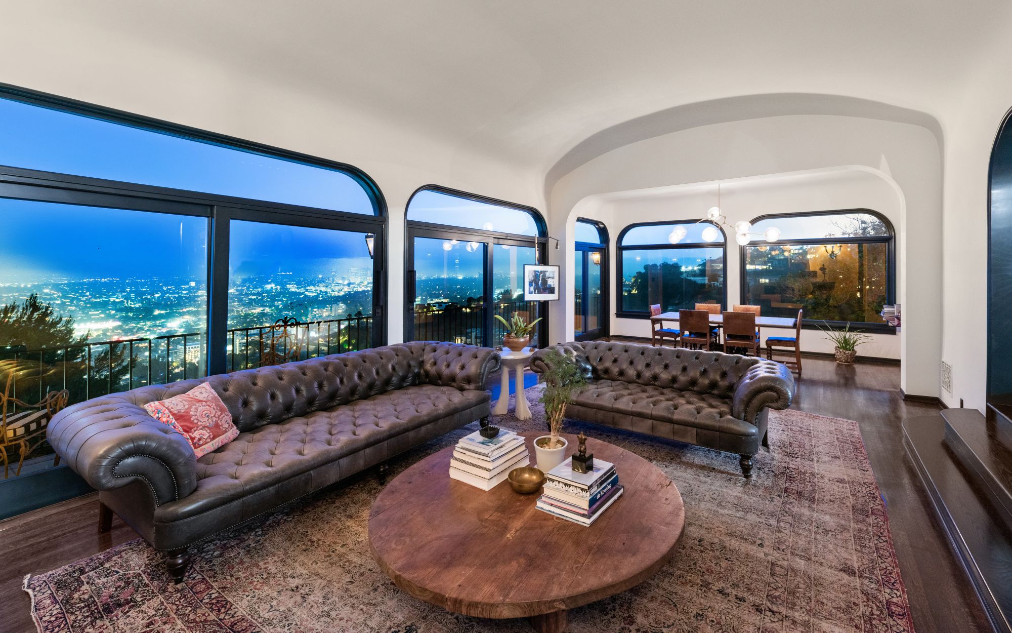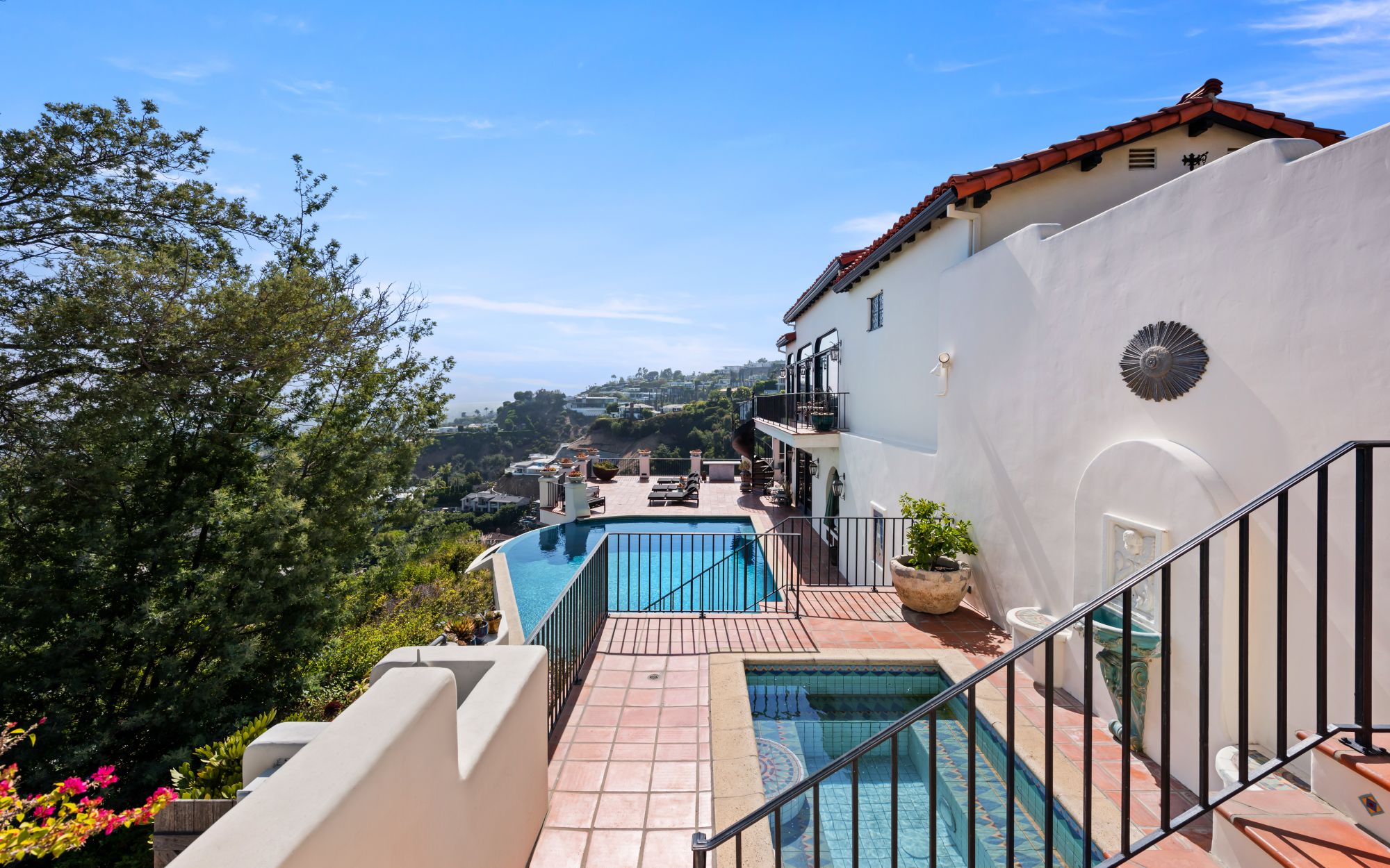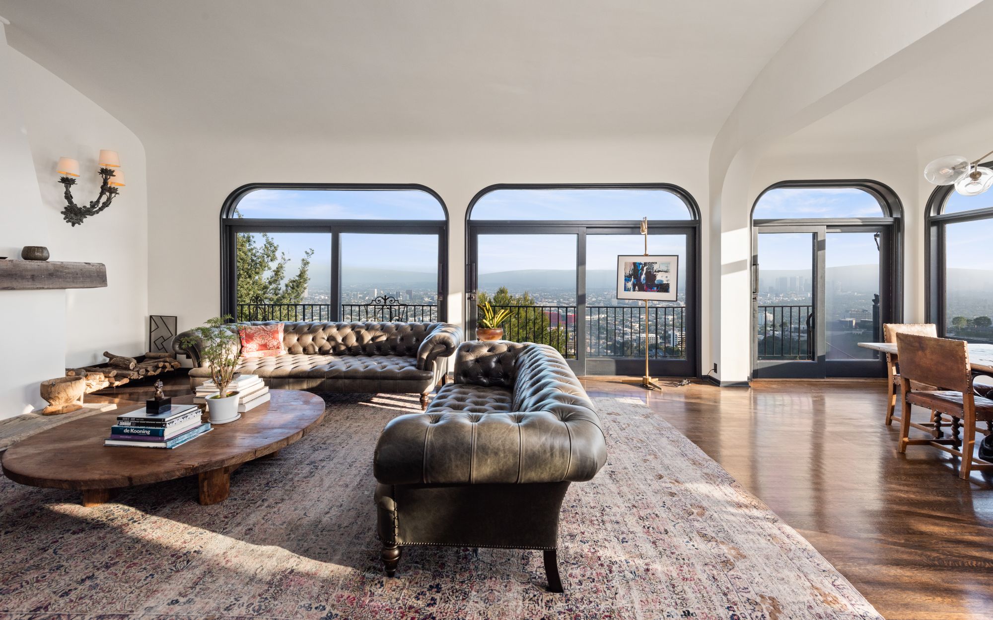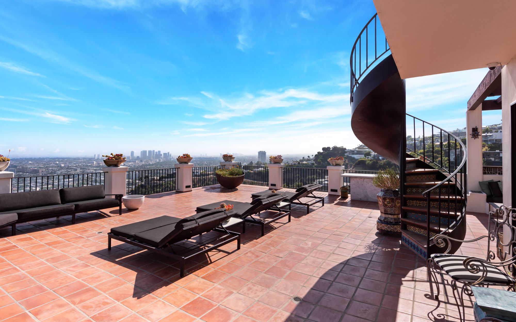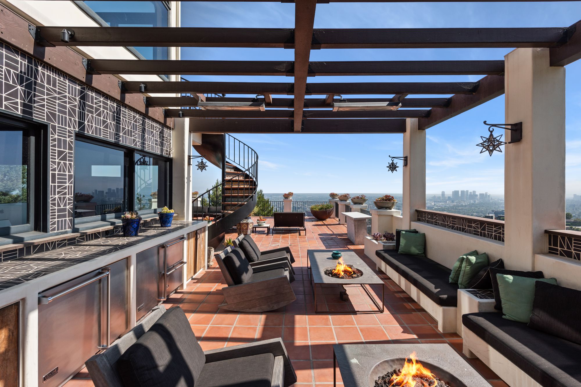 Stunning Spanish contemporary villa hovering over the Sunset Strip with drop-dead panoramic city & ocean views from every room. Interiors by Commune, this 3-story private estate hosts an open floor plan with a step-down living room w/a fireplace, gourmet kitchen, studio, exquisite bathrooms & massive entertainment room that spans the entire length of the home. Two-story spiral staircase w/ skylight leads to bedrooms, including a large private primary suite overlooking the lights of LA. Perched on the hills with explosive views, the enormous wrap-around tile deck features an infinity pool, spa, and covered entertaining area. "Welcome to Hollywood" the most iconic street in the world.