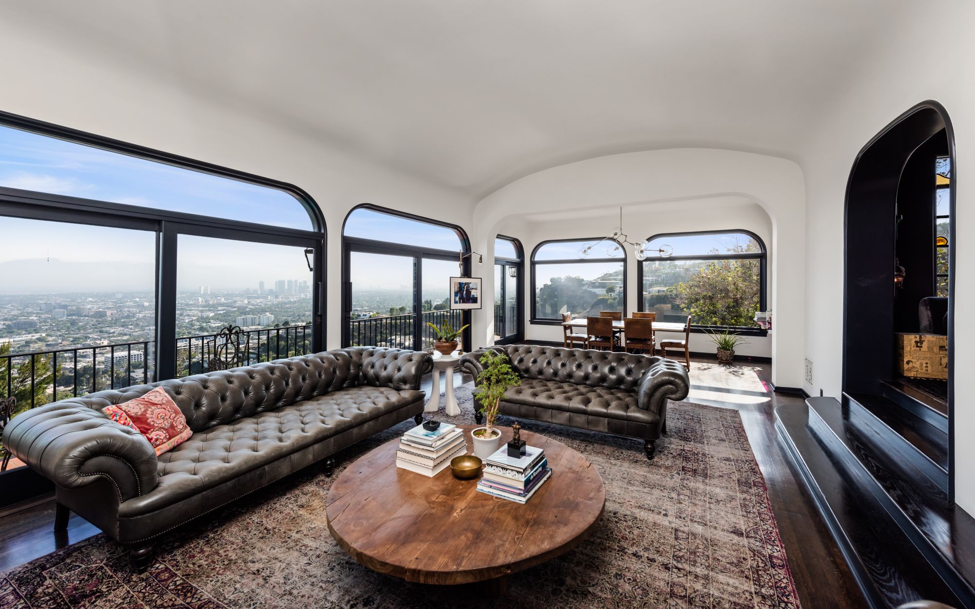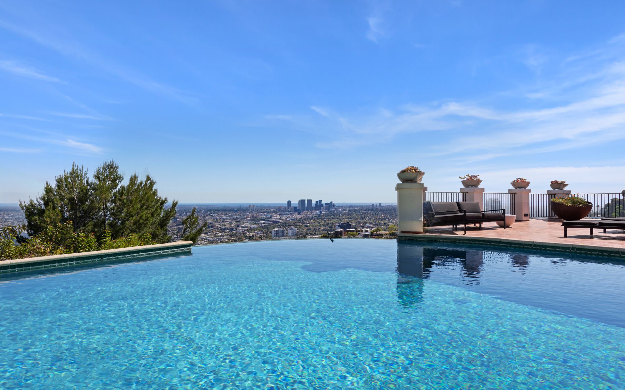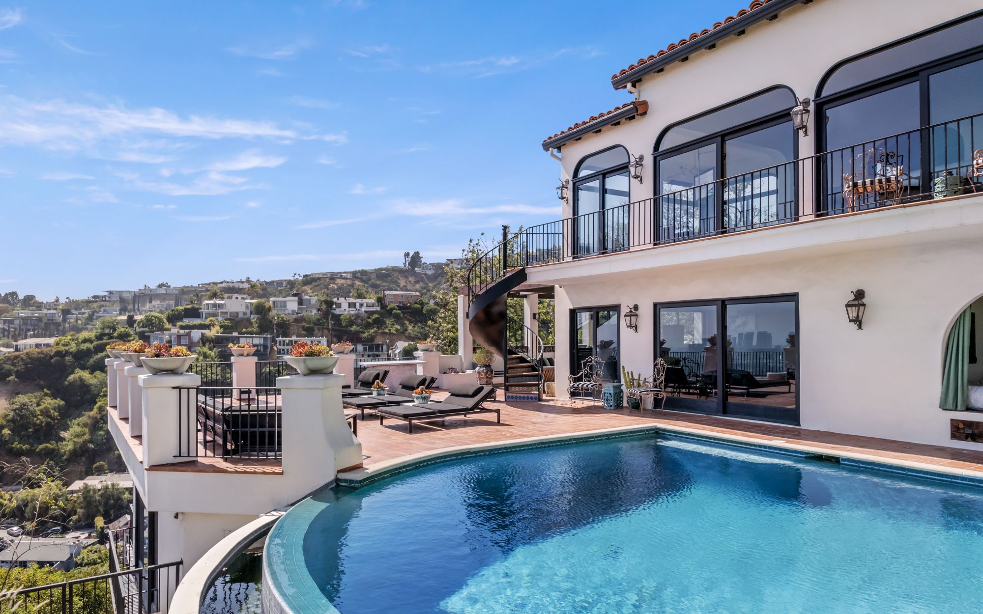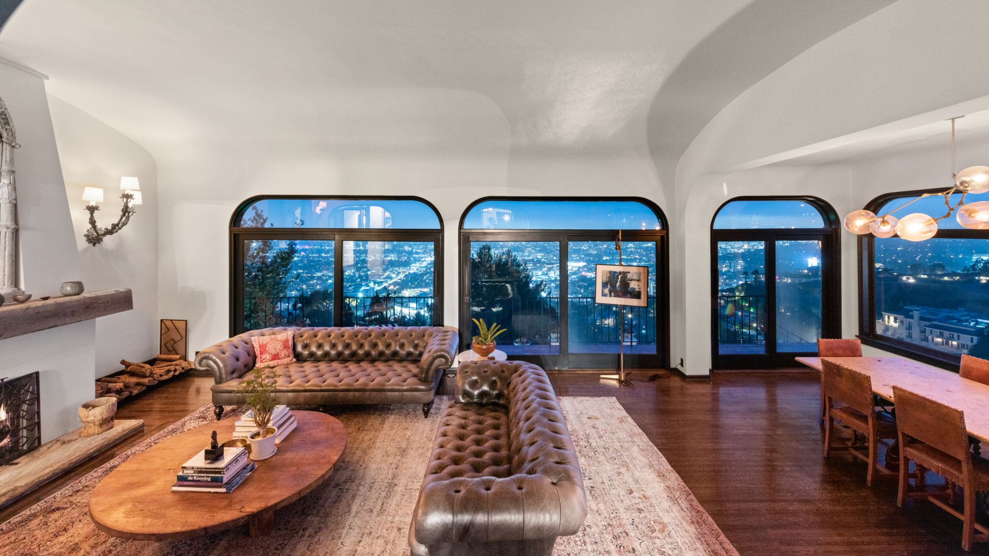Stunning Spanish contemporary villa hovering over the Sunset Strip with drop-dead panoramic city & ocean views from every room. Interiors by Commune, this 3-story private estate hosts an open floor plan with a step-down living room w/a fireplace, gourmet kitchen, studio, exquisite bathrooms & massive entertainment room that spans the entire length of the home. Two-story spiral staircase w/ skylight leads to bedrooms, including a large private primary suite overlooking the lights of LA. Perched on the hills with explosive views, the enormous wrap-around tile deck features an infinity pool, spa, and covered entertaining area. "Welcome to Hollywood" the most iconic street in the world.