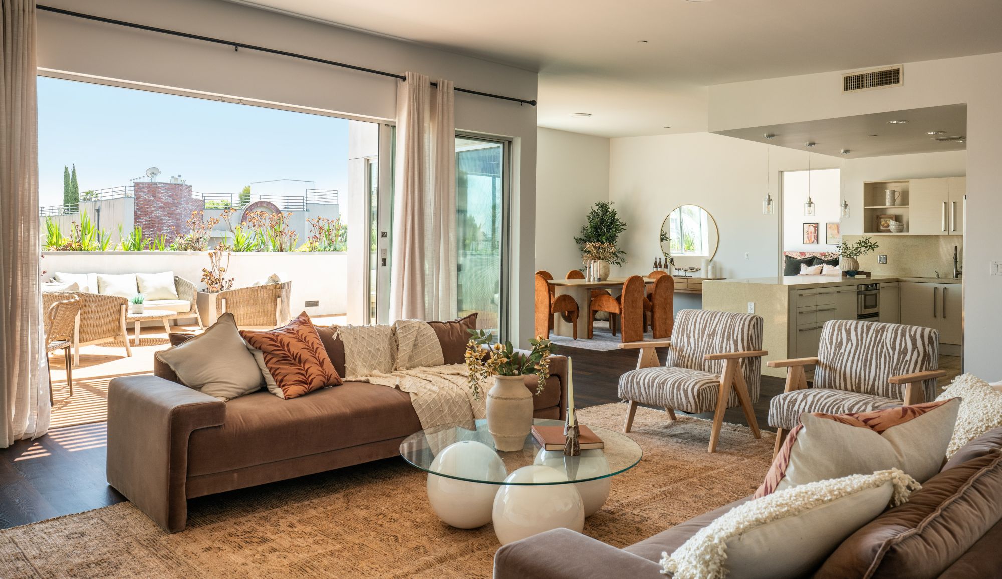 Perched on the top floor of this iconic architectural gem designed by Zoltan Pali, FAIA. This sophisticated Penthouse conveys urban elegance and the coveted California lifestyle with an open concept floor plan, soaring ceilings, sleek wood floors and expansive walls of glass that open seamlessly onto a sprawling patio. Framed by lush meticulously designed landscaping, the patio offers stunning hilltop views, perfect for both relaxation and entertaining. The chef-inspired kitchen, complete with a breakfast bar, is ideal for hosting gatherings or enjoying casual meals. Two generously sized master suites each feature their own private patios, luxurious en-suite bathrooms, and walk-in closets, providing a perfect blend of comfort and privacy. Additional amenities include side-by-side parking, a private storage room, and in-unit laundry for ultimate convenience. Located steps from Melrose Place in the vibrant heart of West Hollywood, this Penthouse is a rare opportunity to experience elevated living in LA's most desirable neighborhood.
